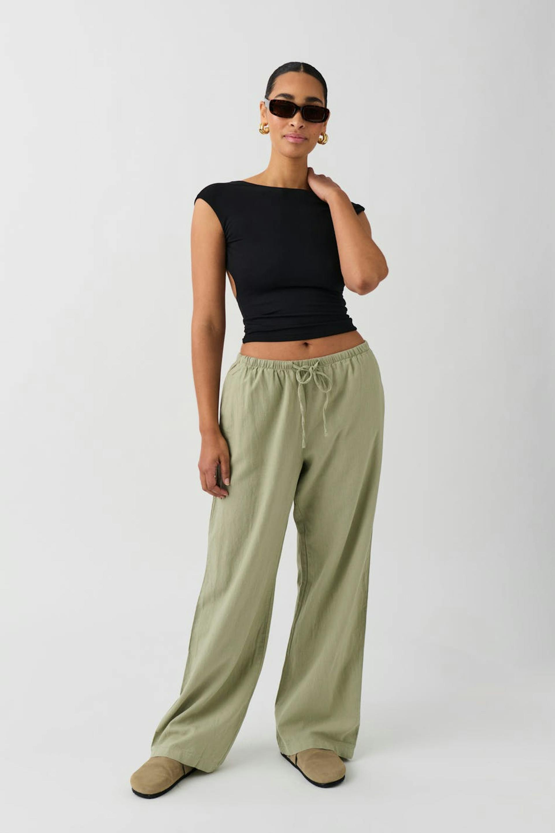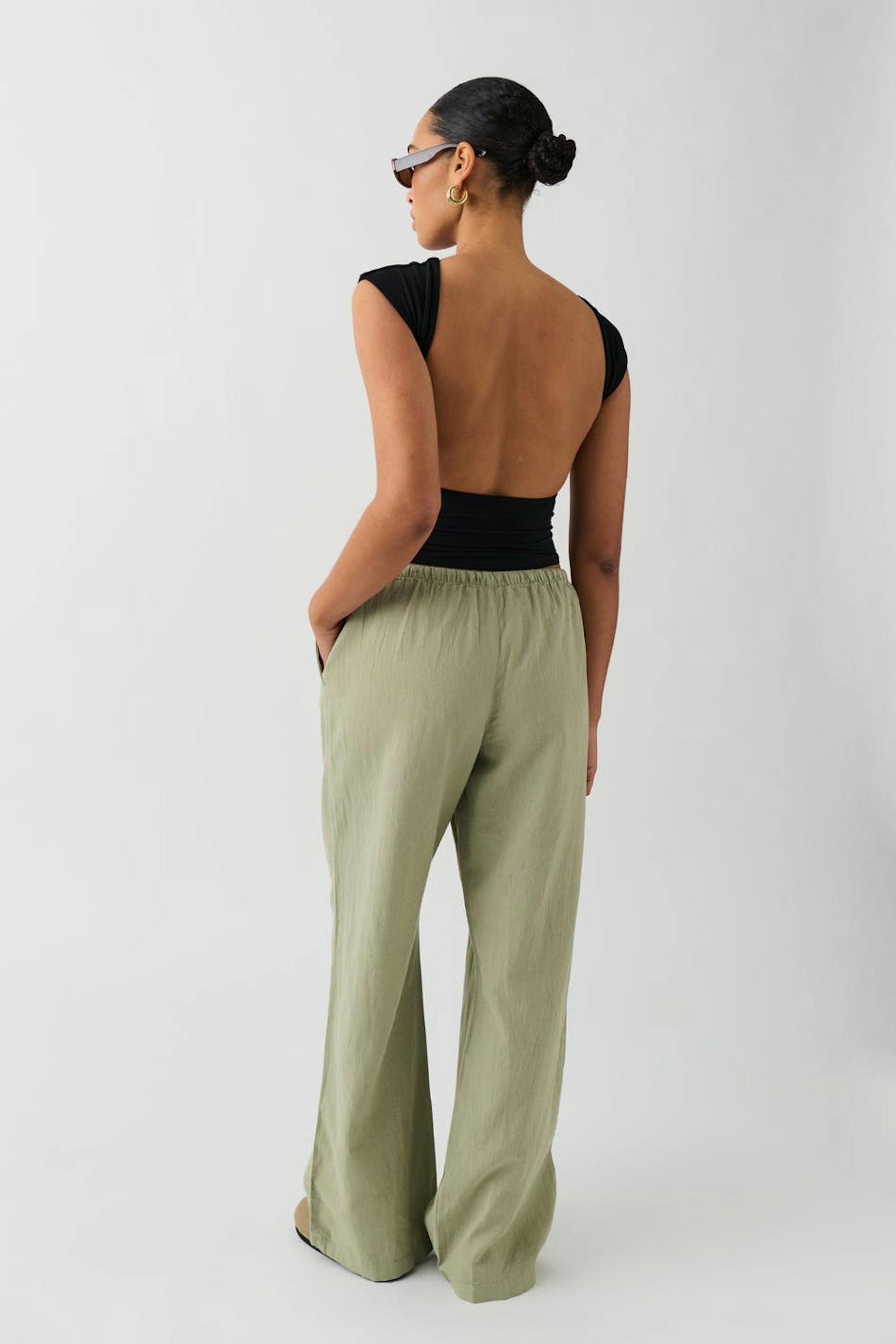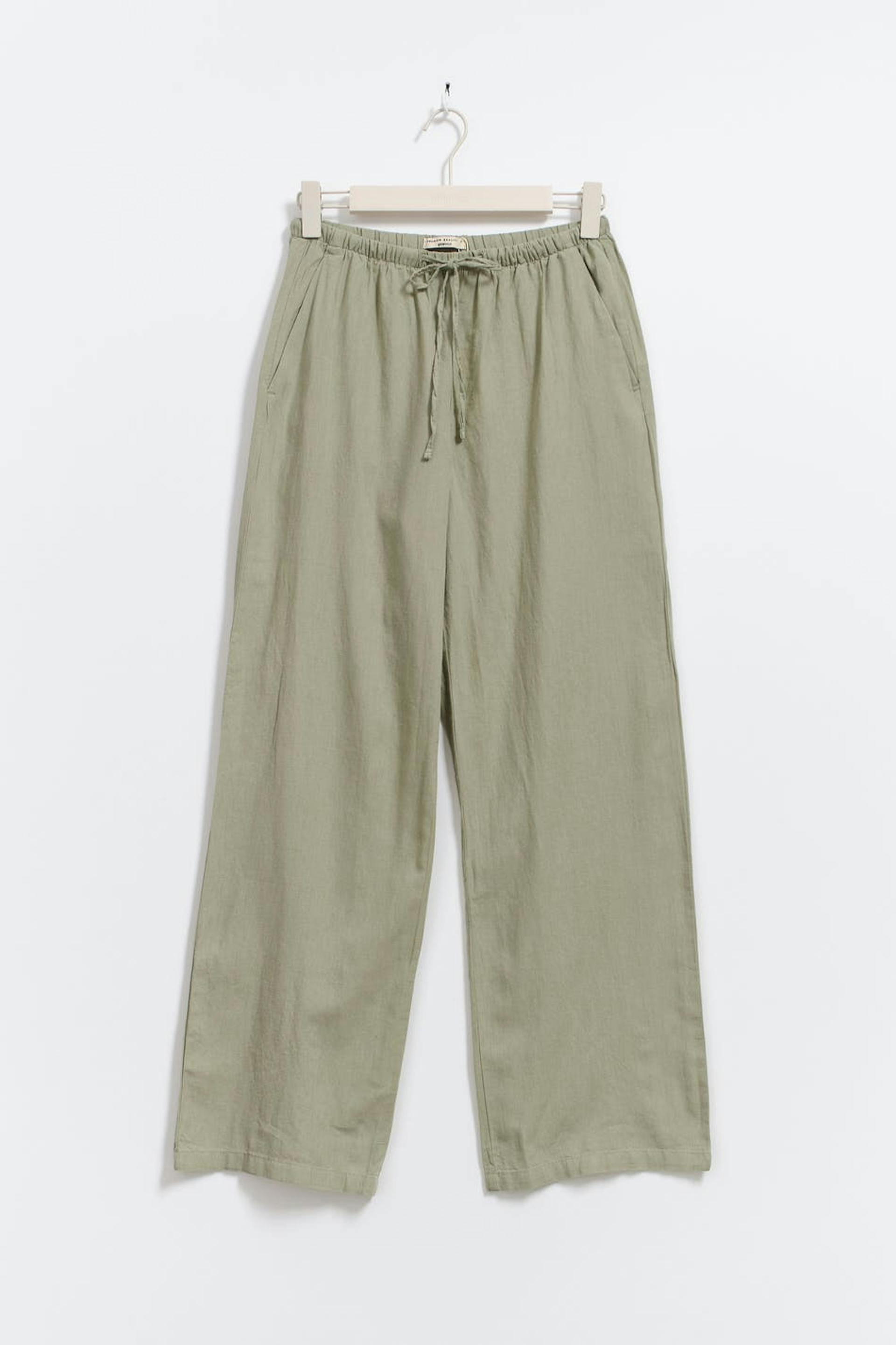 Linen trousers with wide legs. The linen trousers are green and have mid waist. They have side pockets and elastic at the waist with self-tie drawstring at the front.