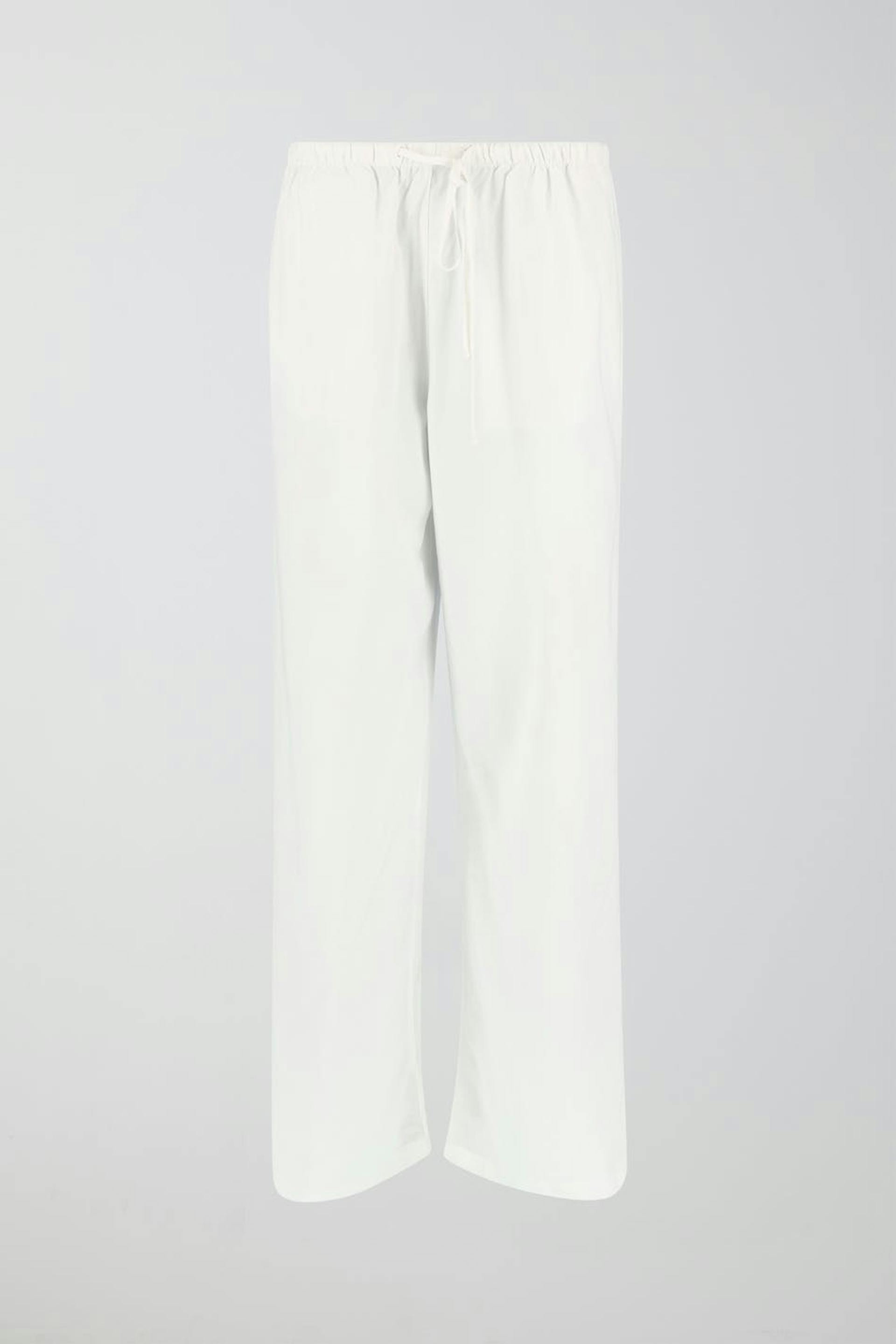 Trousers in linen-blend with wide trouser legs. The trousers are white and have mid high waist. They have side pockets and slim waistband with elastic and drawstring.