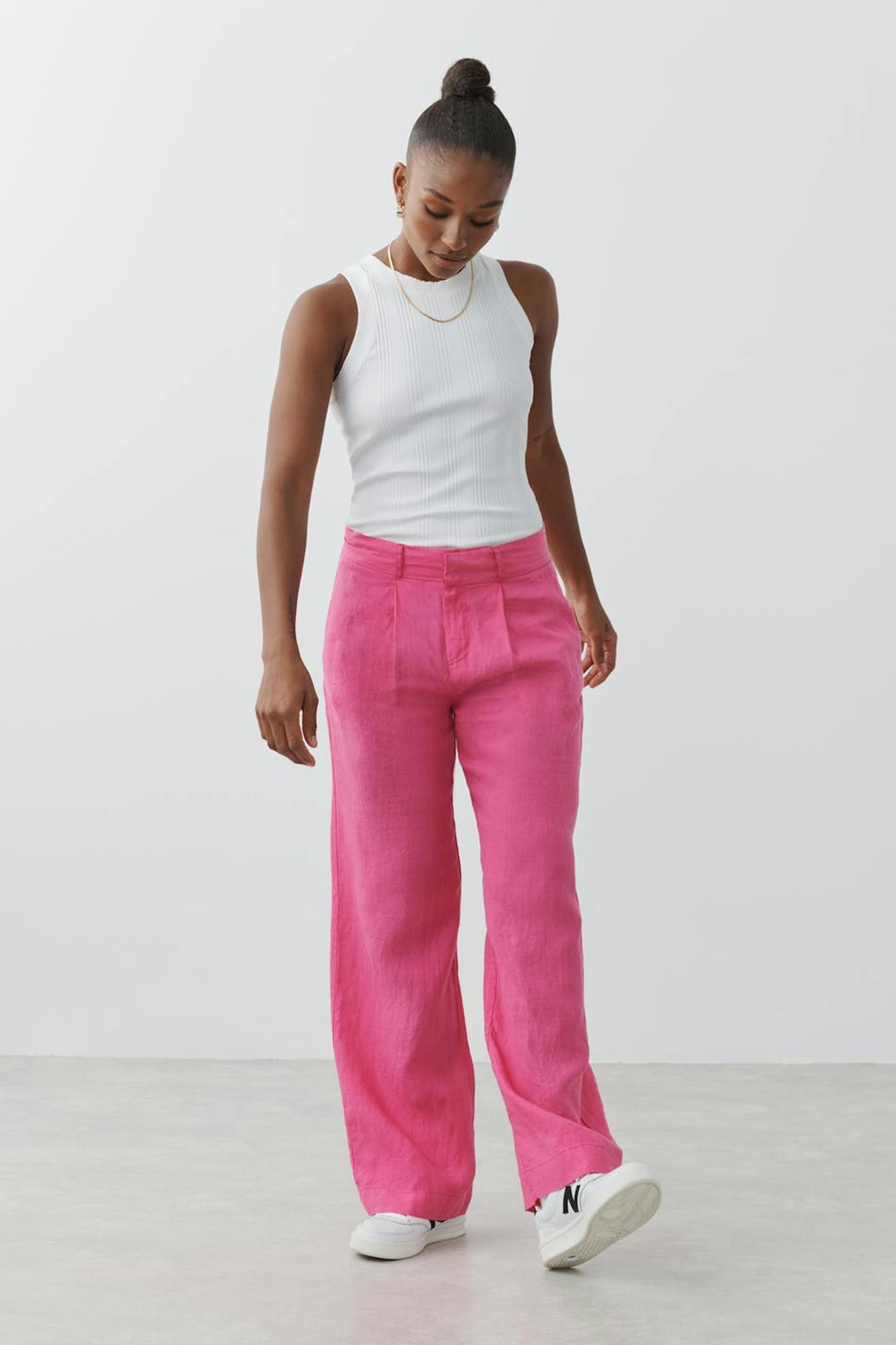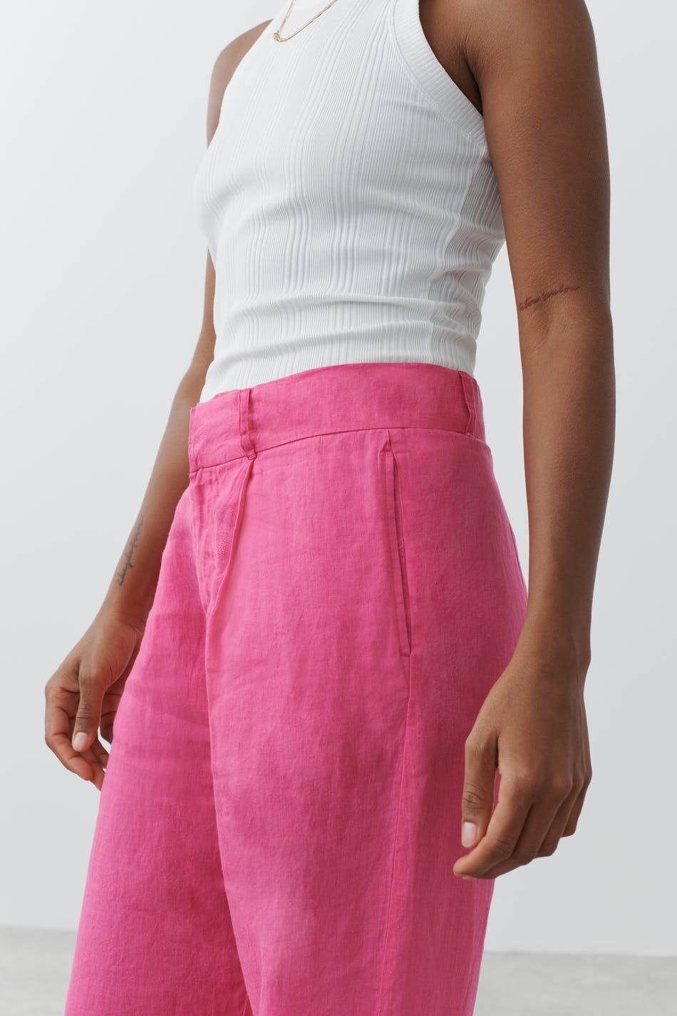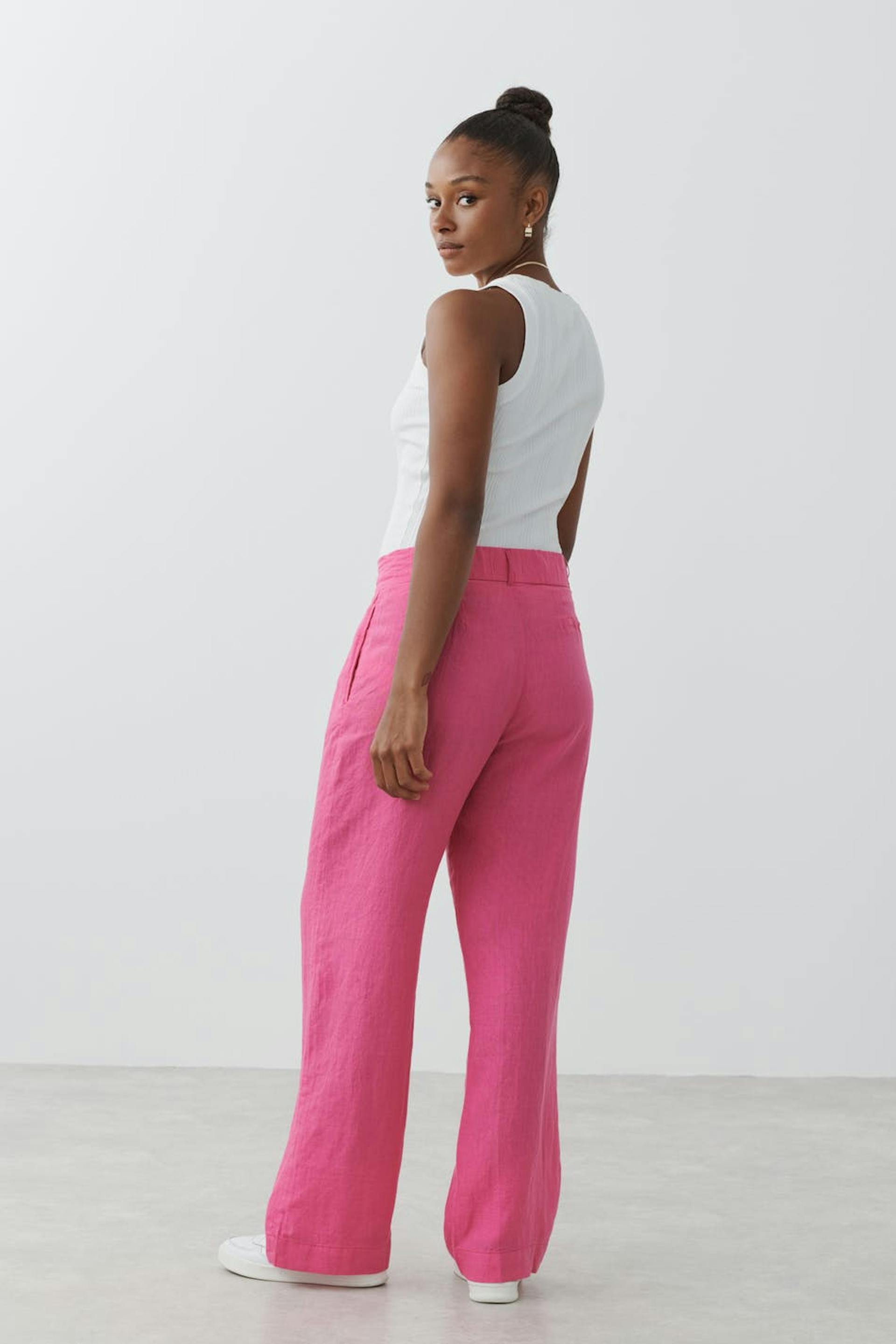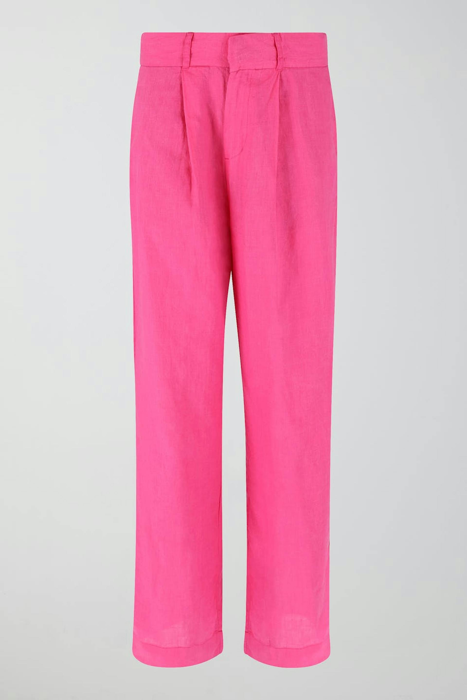 Linen trousers with loose-fitting style. The linen trousers are pink and have pleats at the front. They have straight legs, elastic at the back of the waist, belt loops, side pockets and a welt pocket at the back.