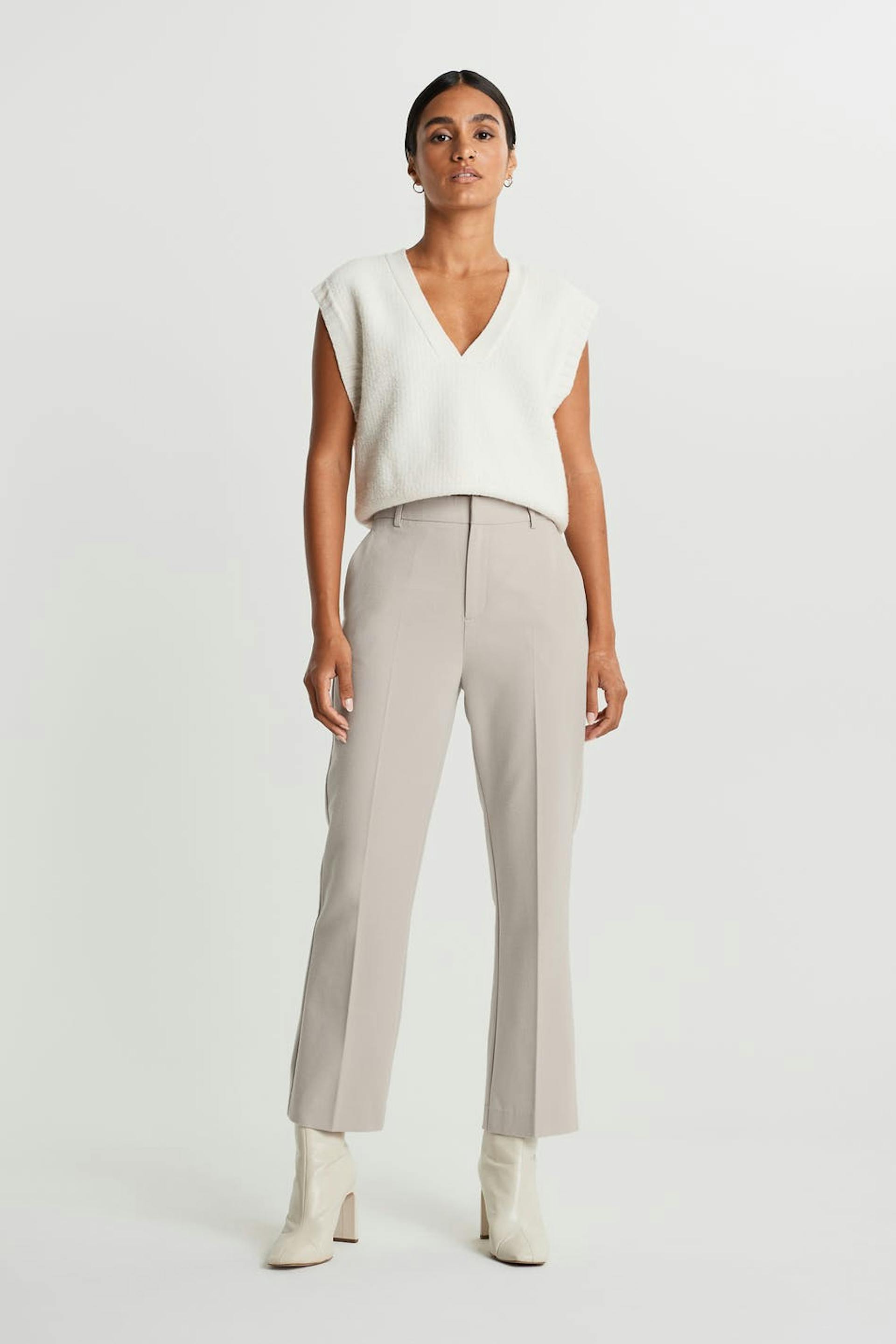 Trousers with creases. The trousers are beige.