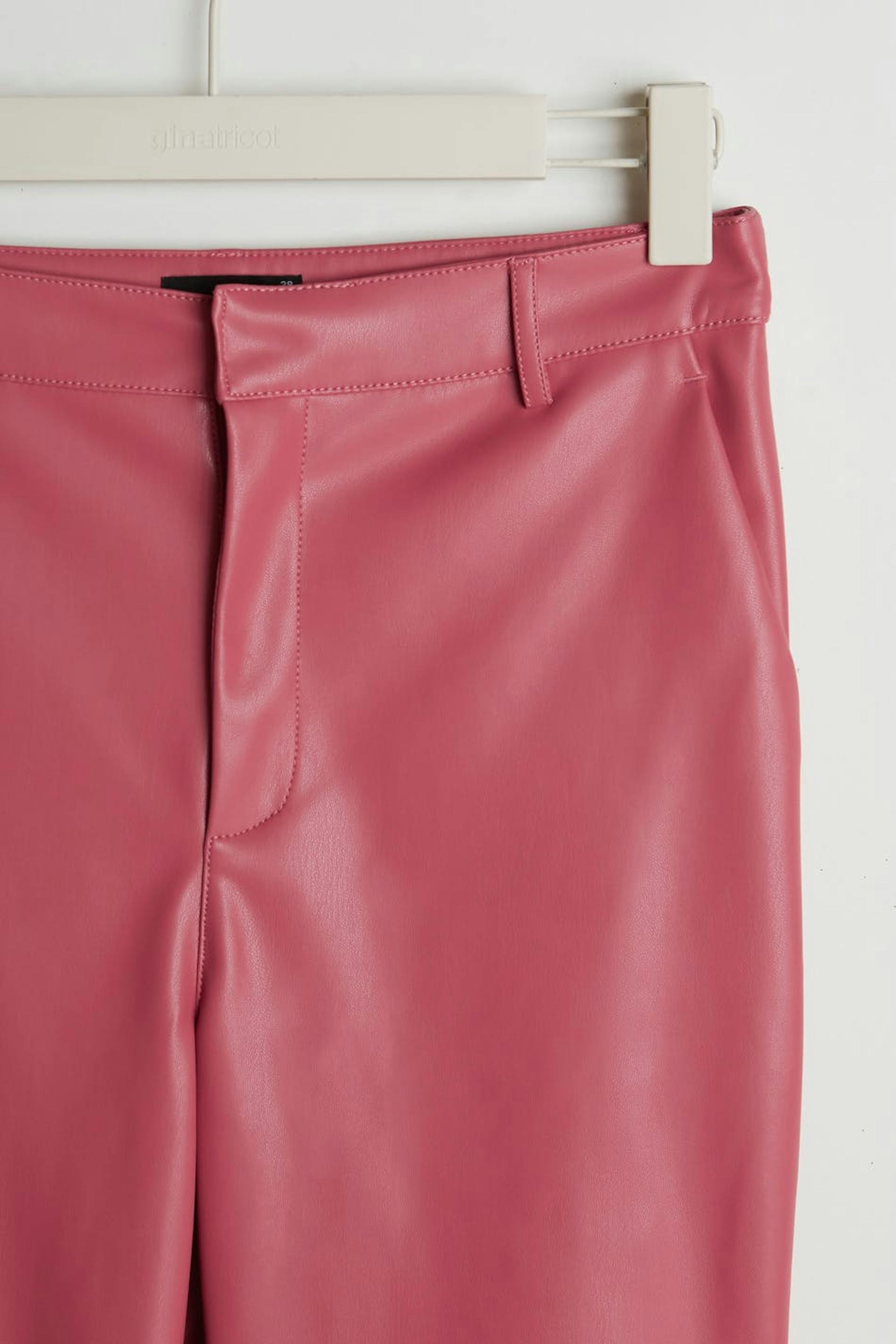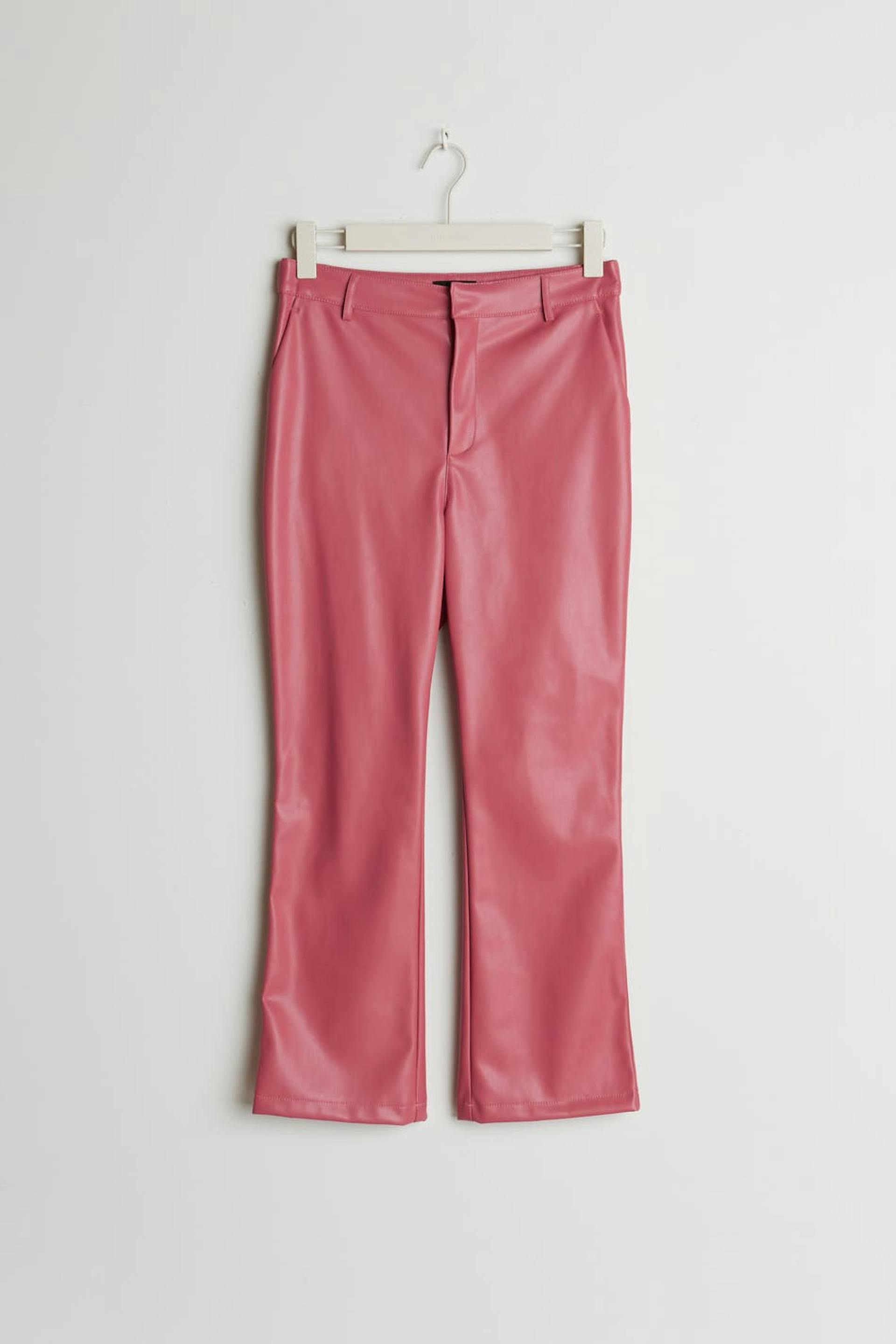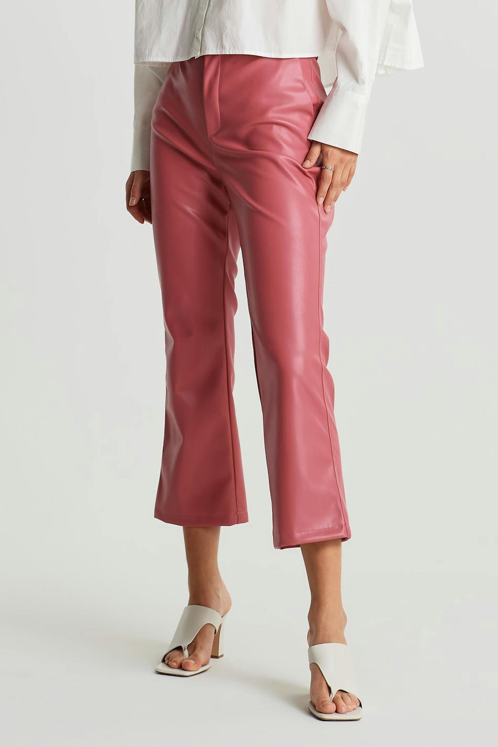 Straight trousers with slightly flared trouser legs. The trousers are pink and cropped and have pockets on the sides. They are made of PU.
