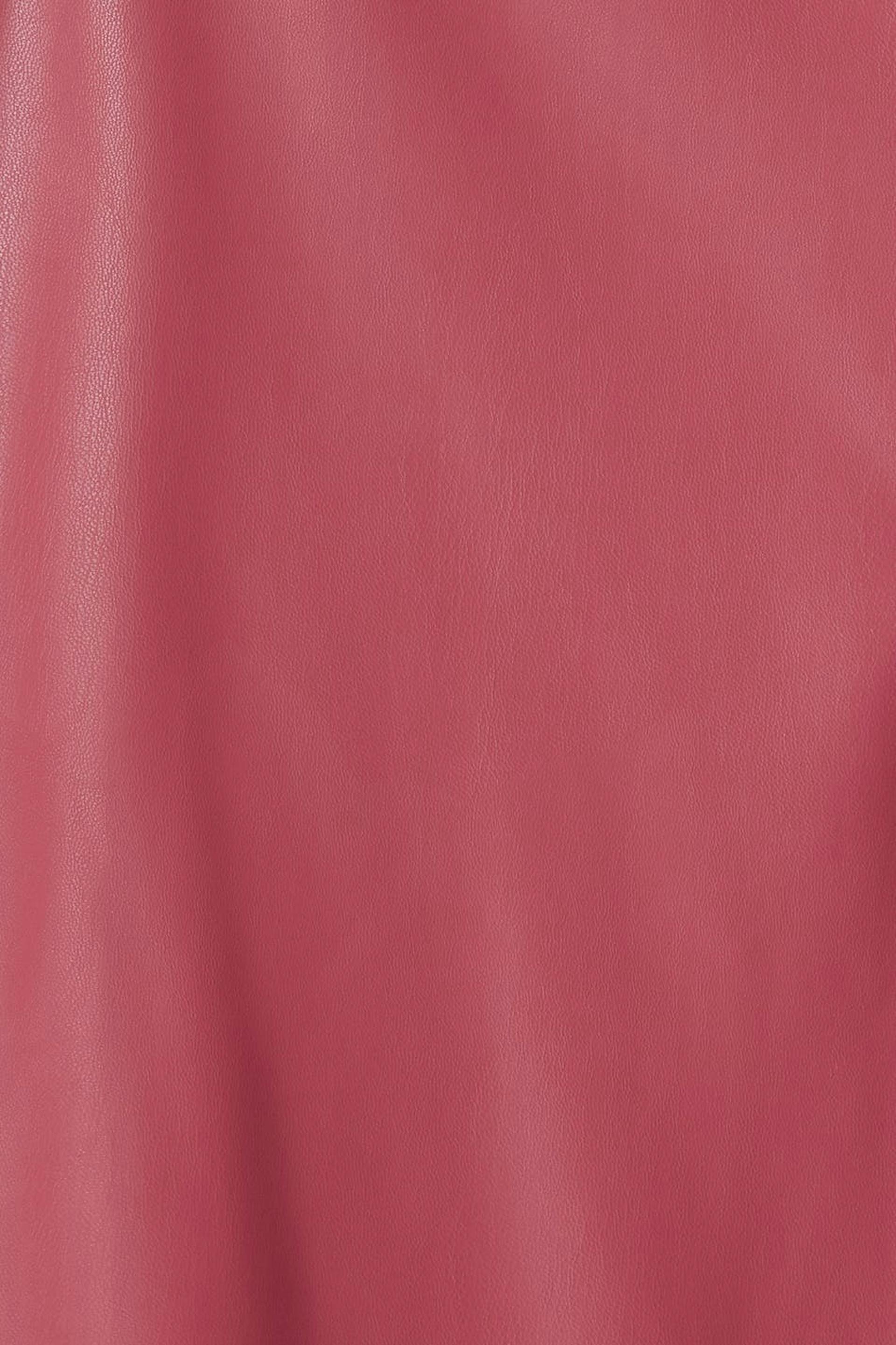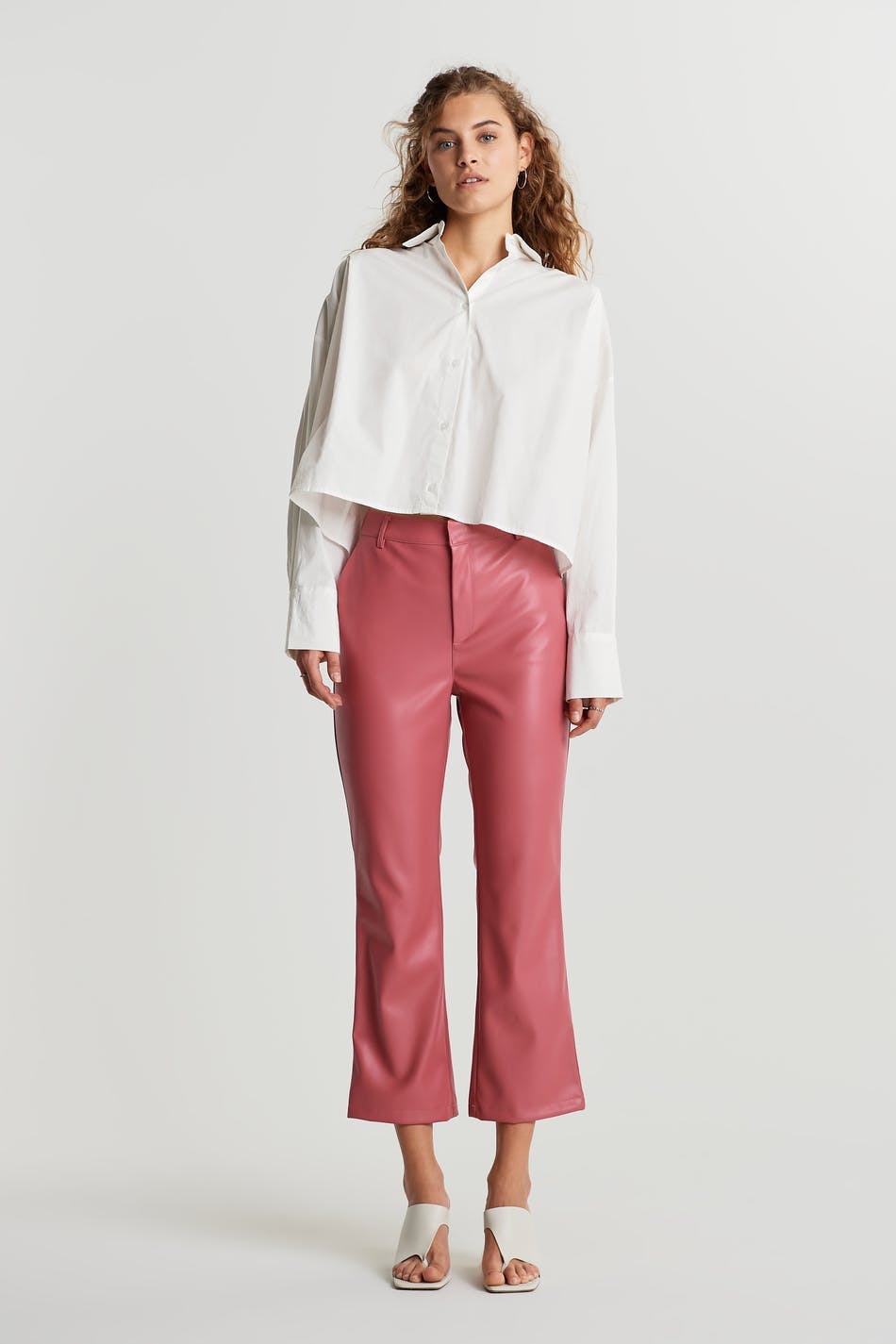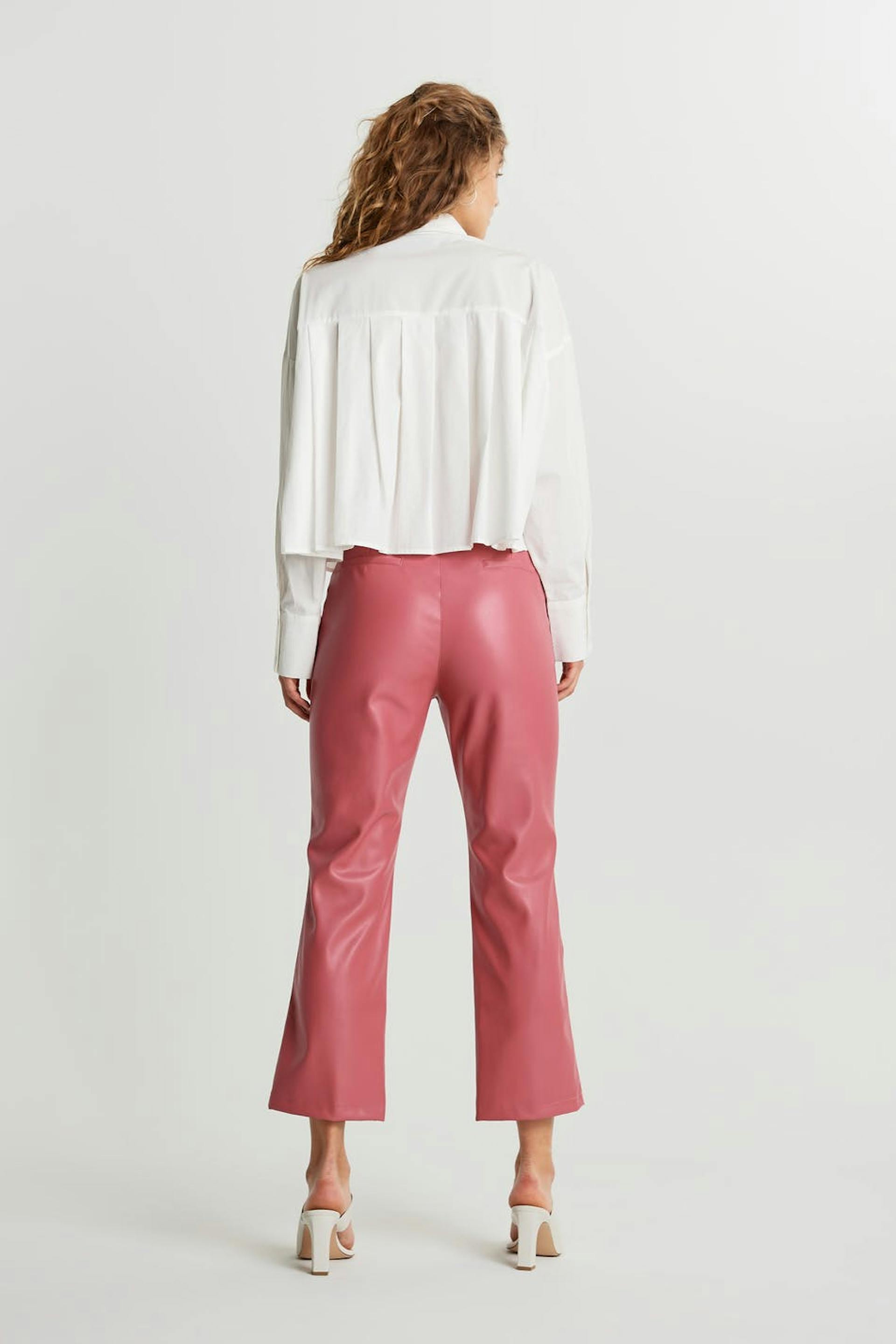 Straight trousers with slightly flared trouser legs. The trousers are pink and cropped and have pockets on the sides. They are made of PU.