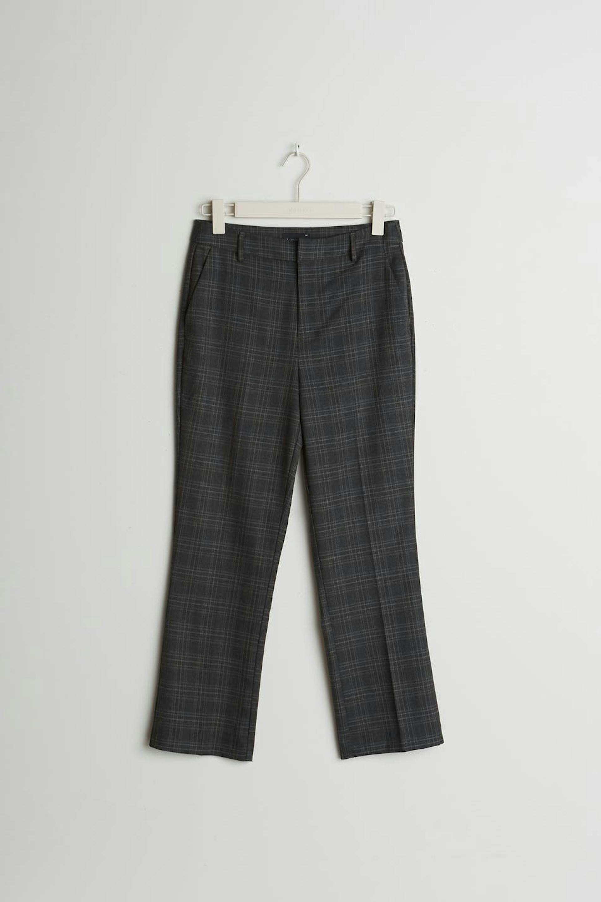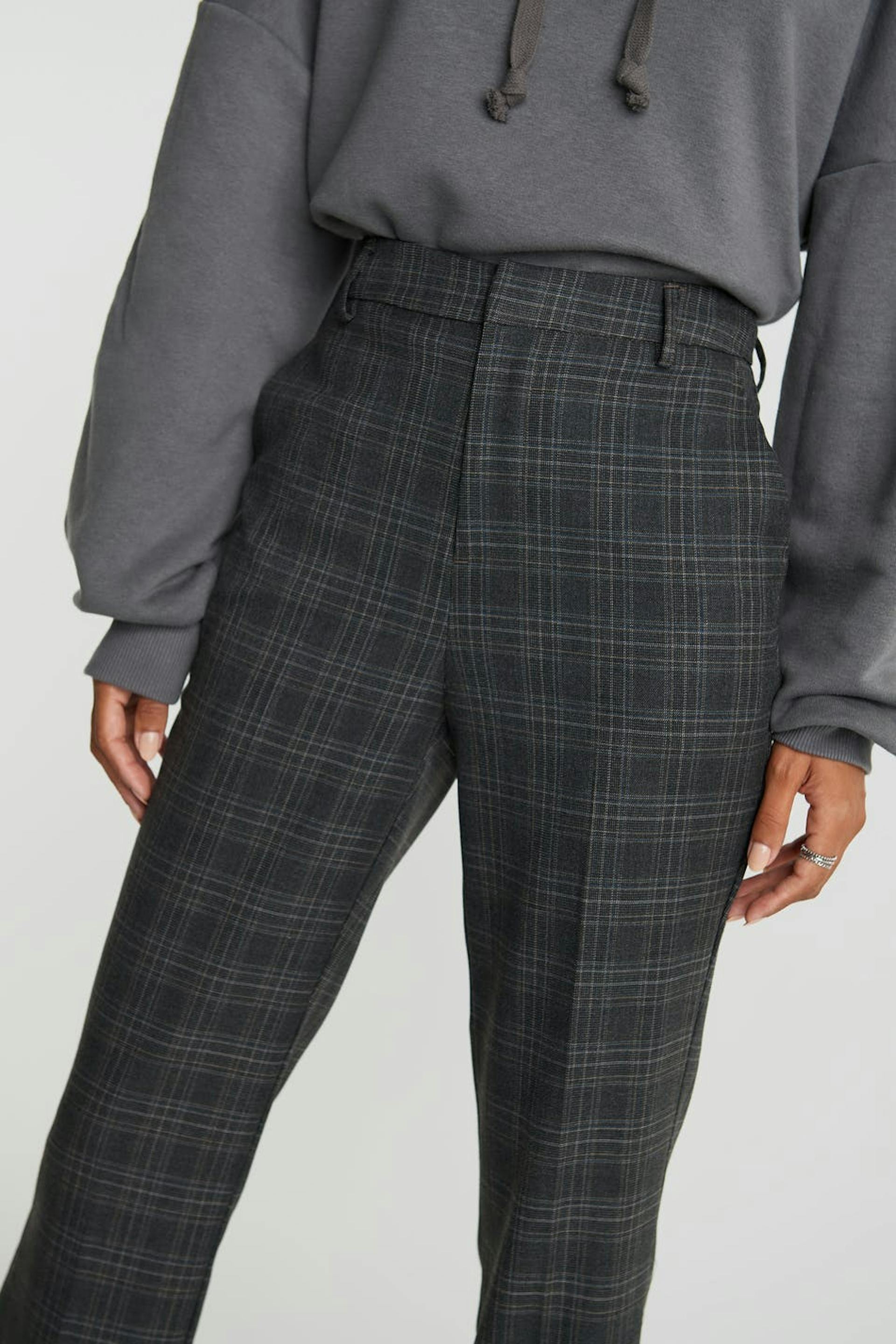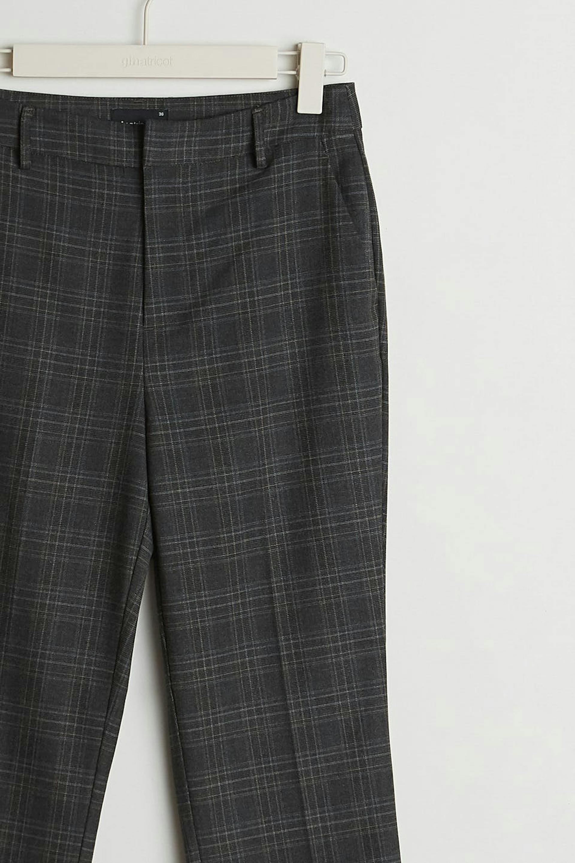 Chequered trousers with pockets on the sides. The trousers are grey and straight and have creases.