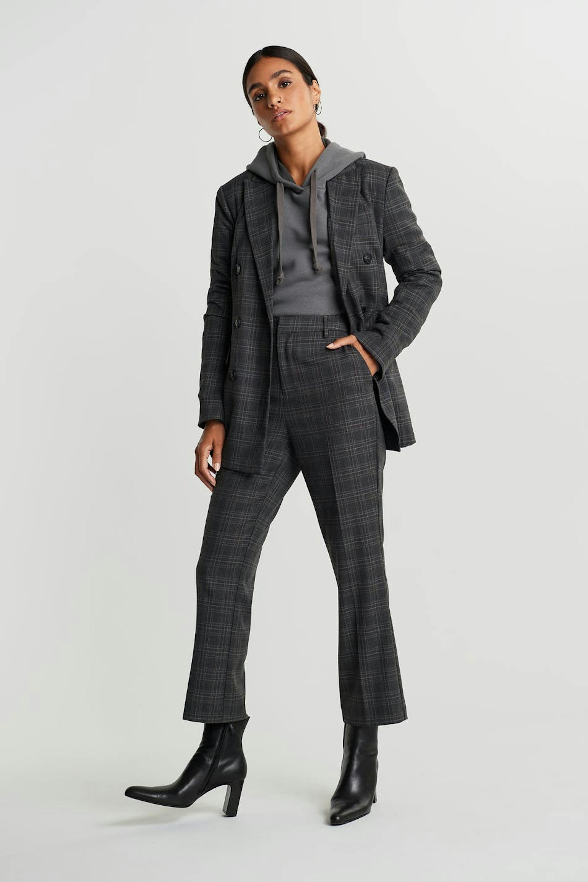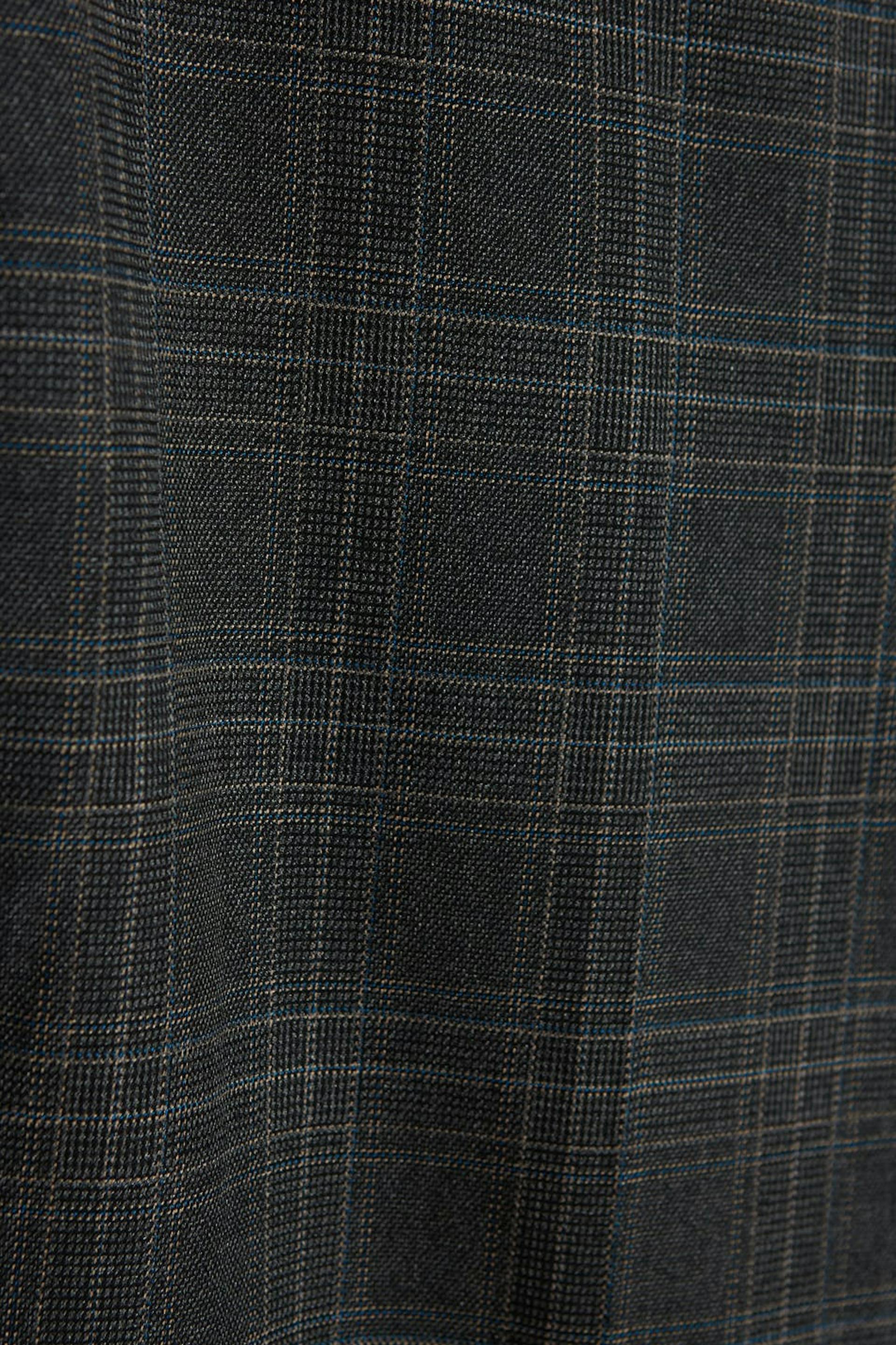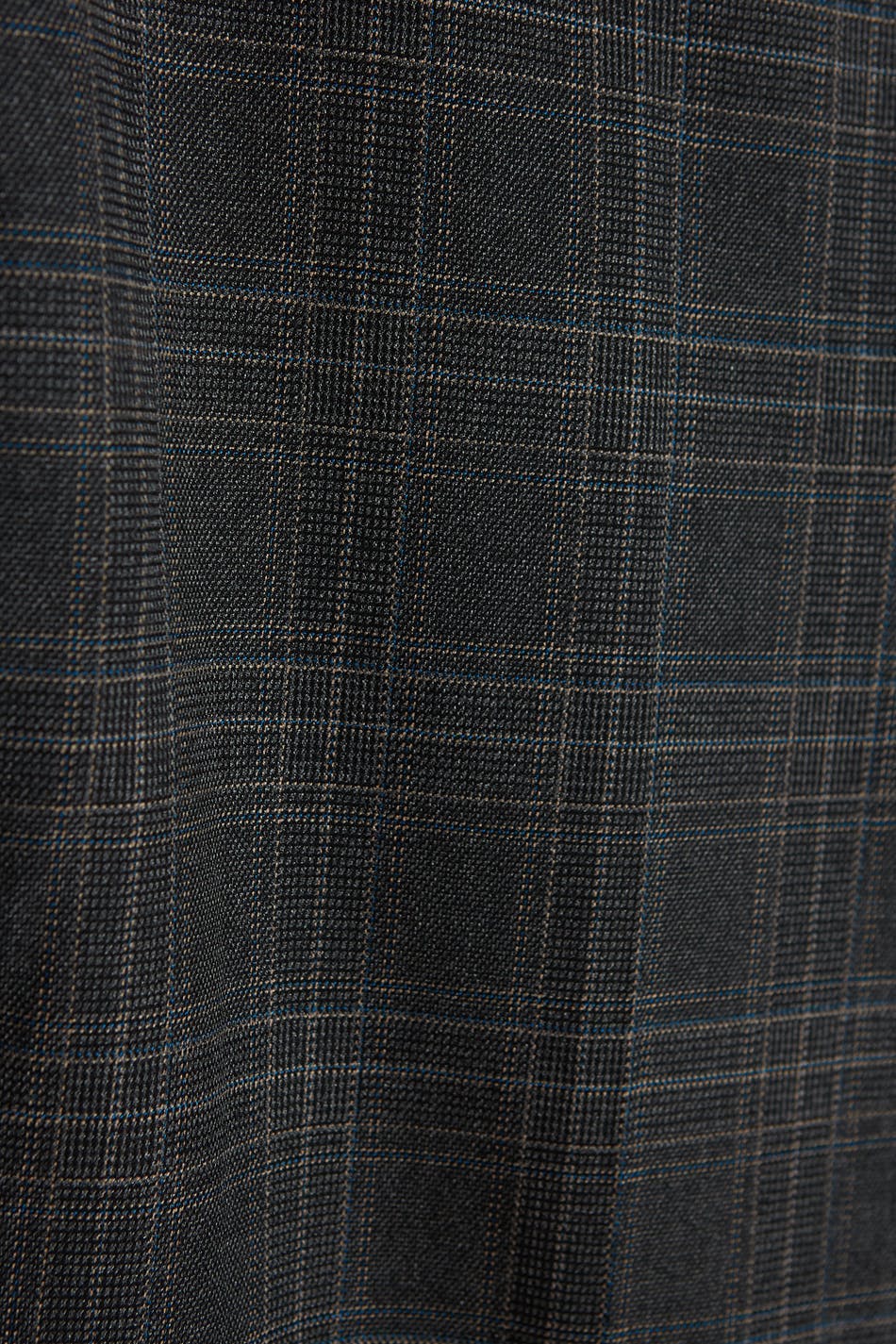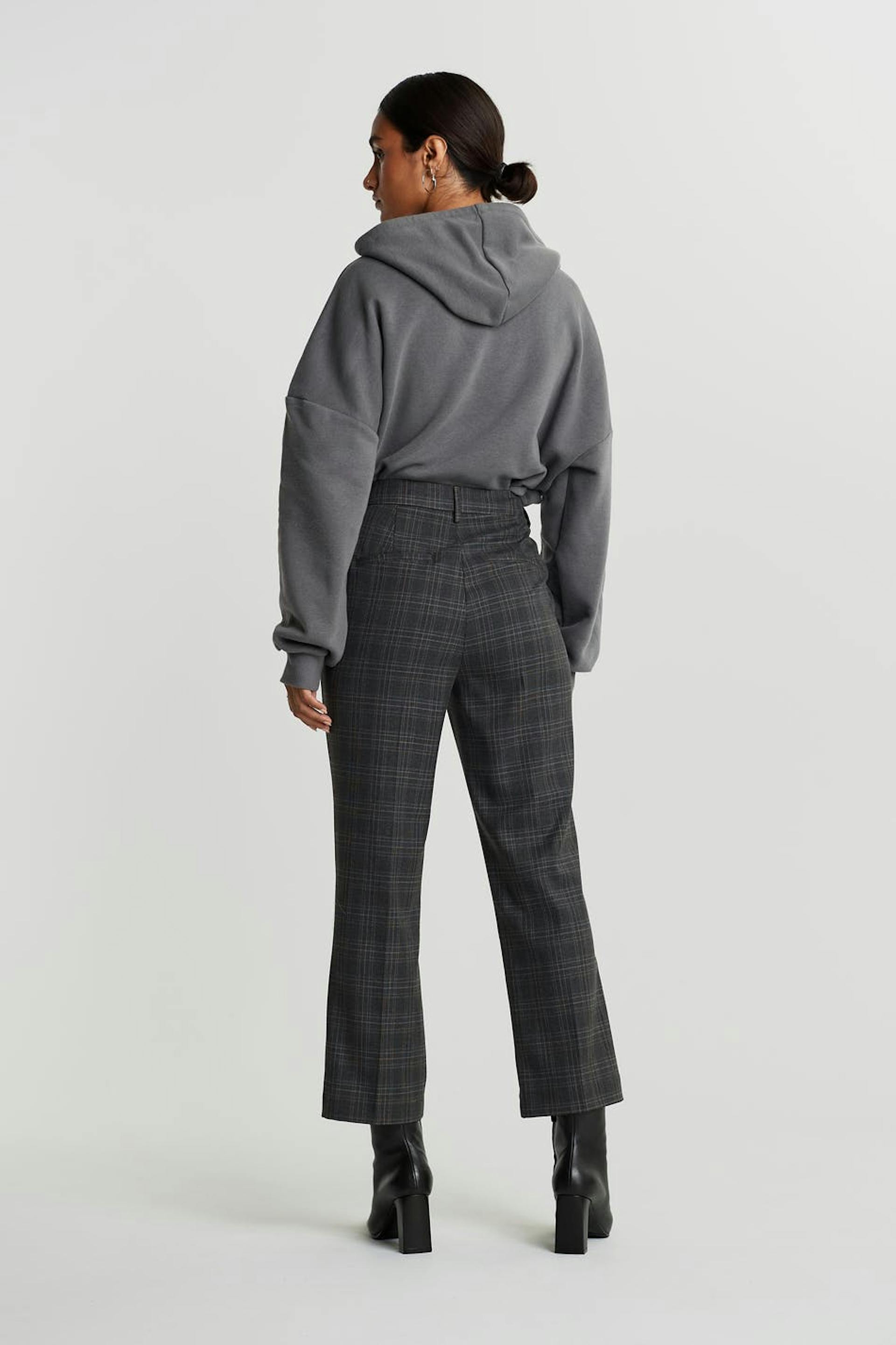Chequered trousers with pockets on the sides. The trousers are grey and straight and have creases.