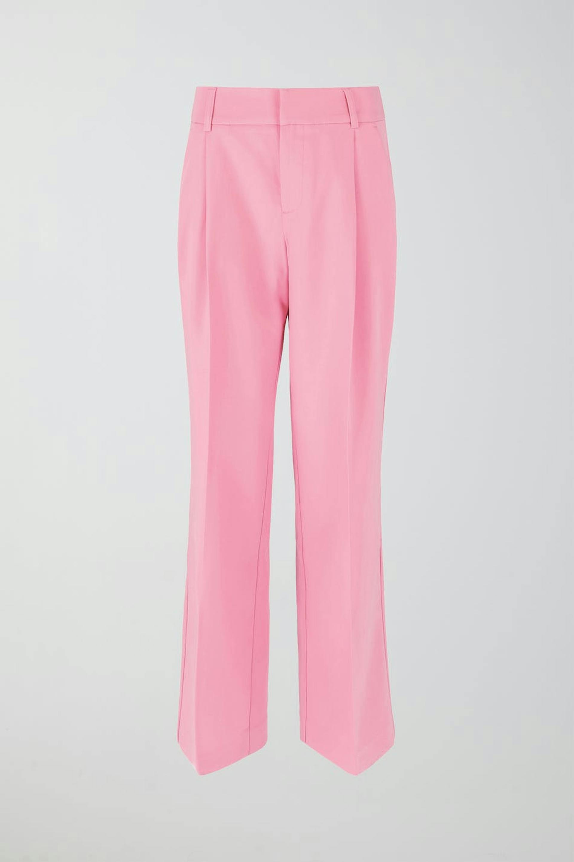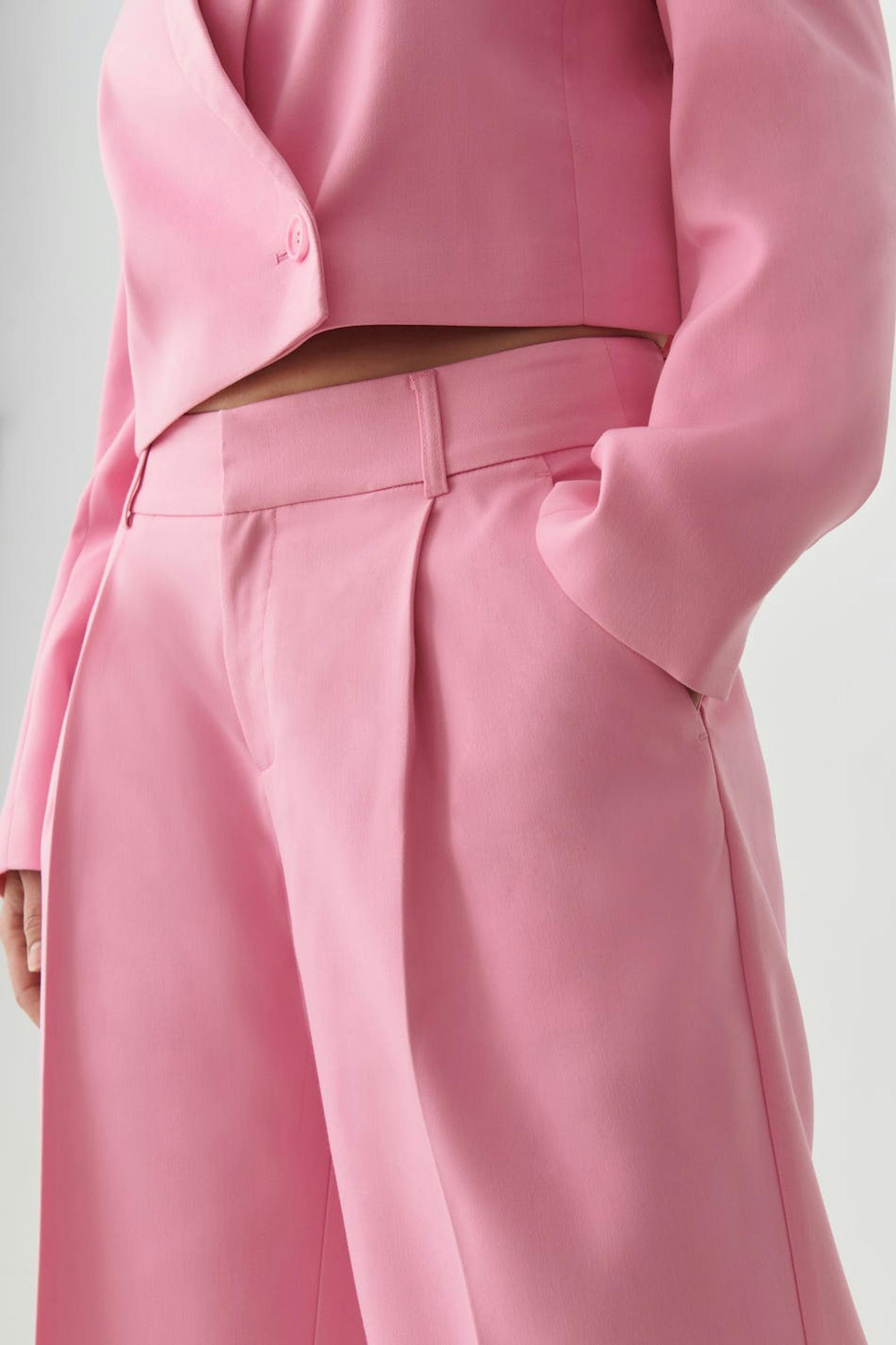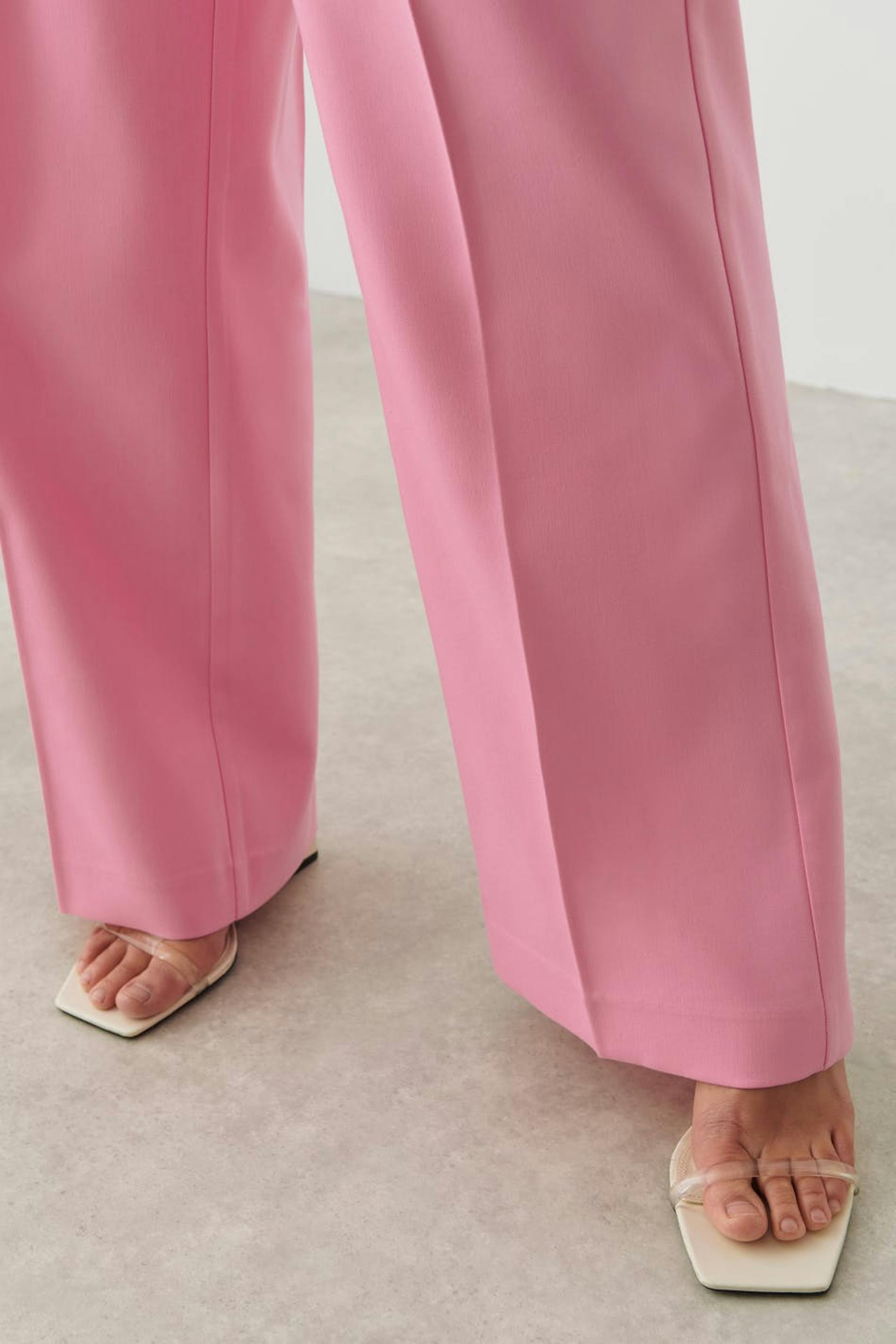 Low-waisted suit trousers with pleats in front. The trousers are pink and have straight legs. They have side pockets, welt pockets at the back, belt loops, zip fly and hook-and-eye closure.