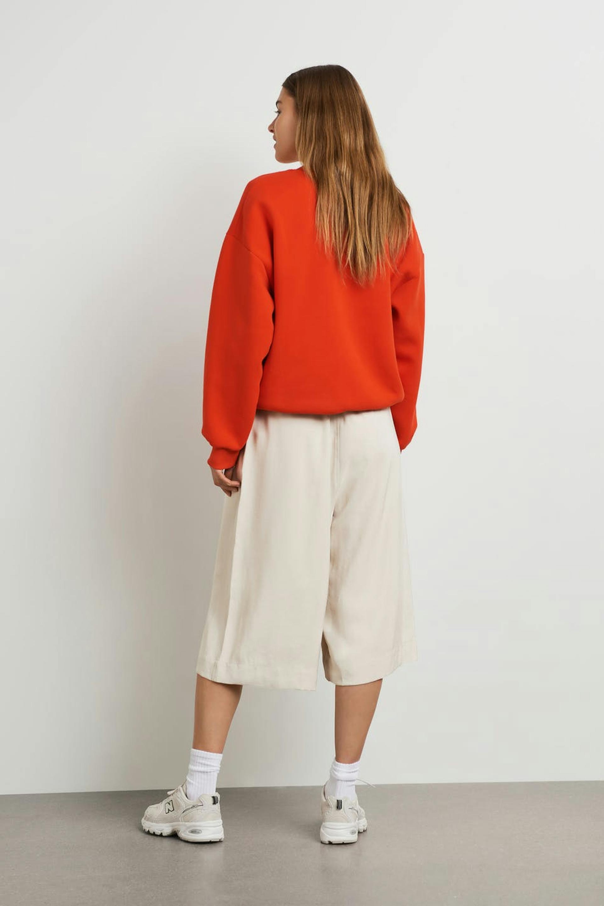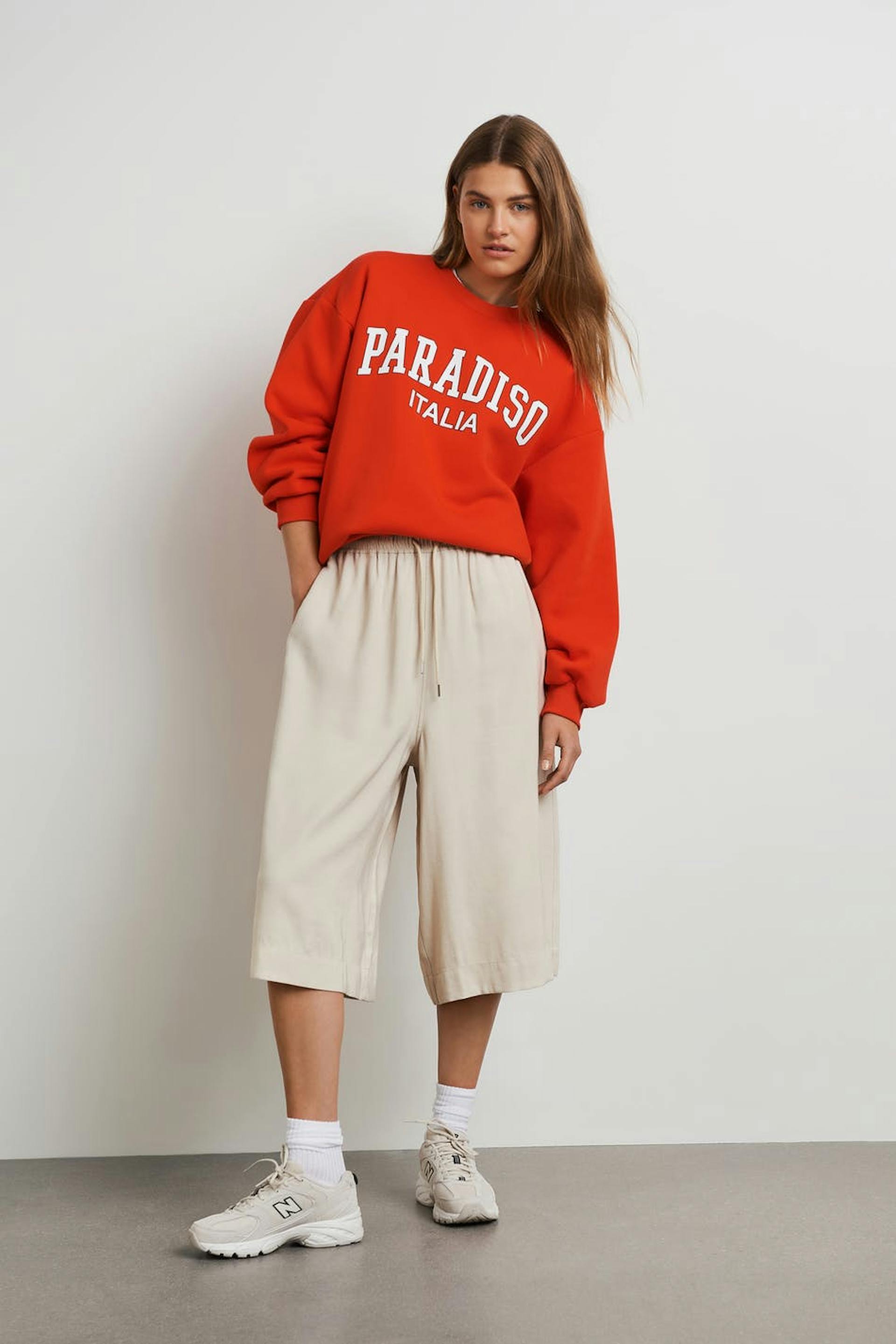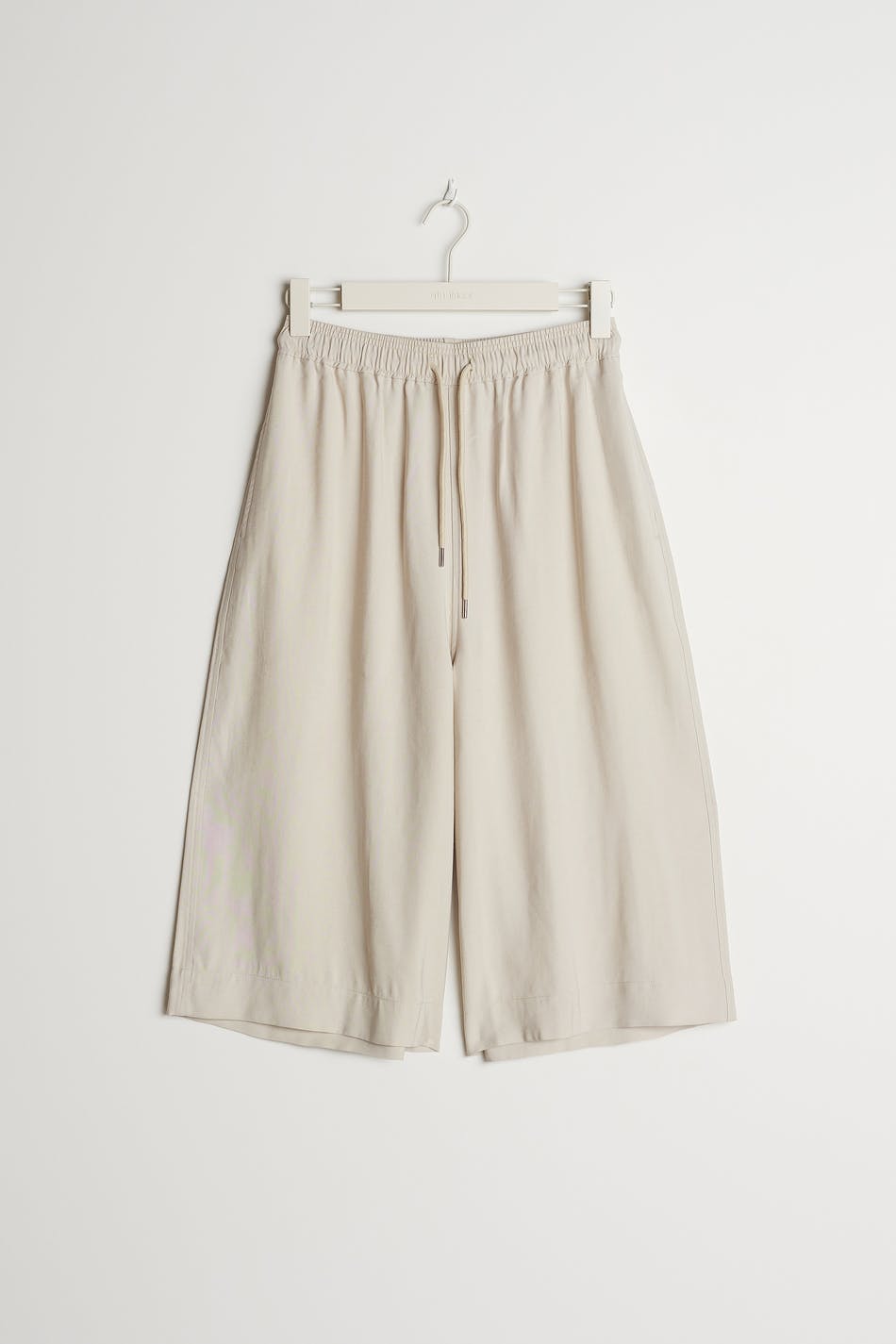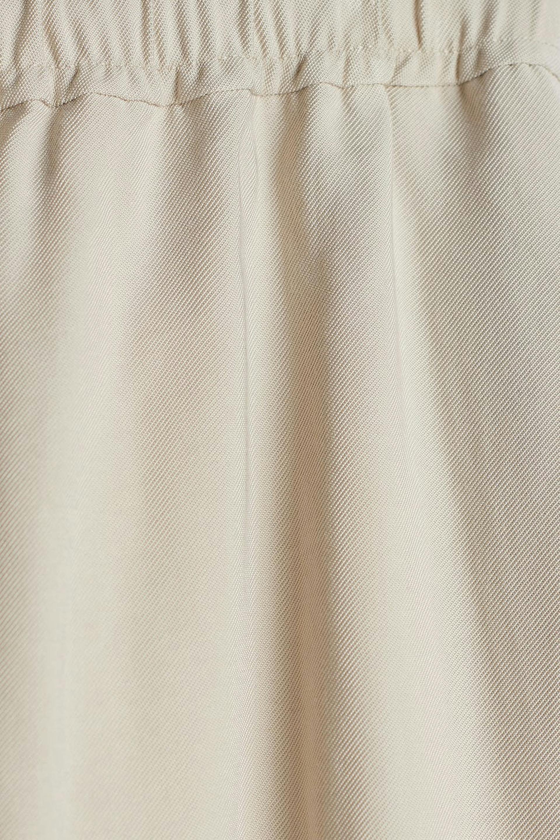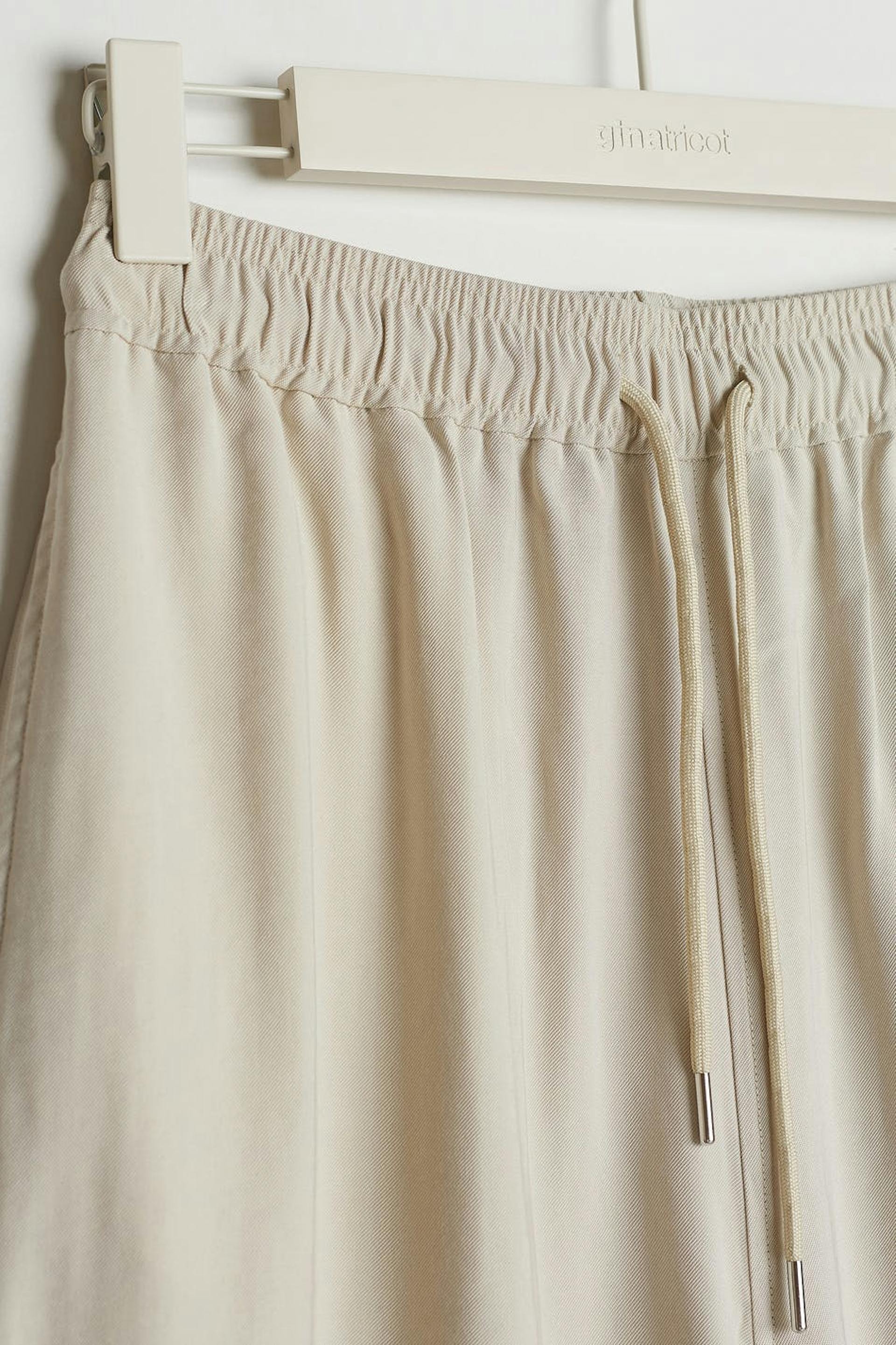Calf-length trousers with a casual fit. The trousers are wide and have pockets on the sides. They have a waist in elastic with a drawstring.