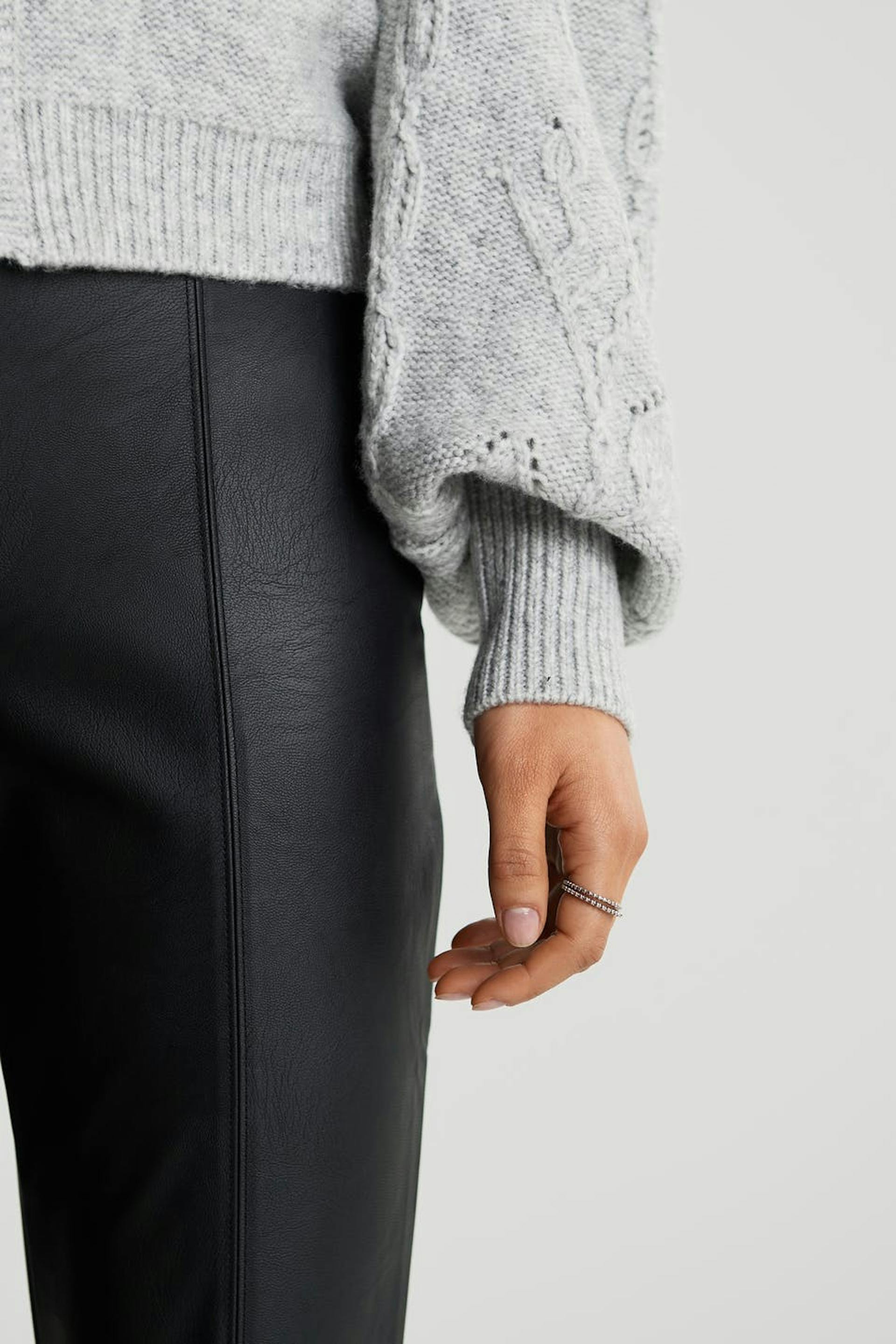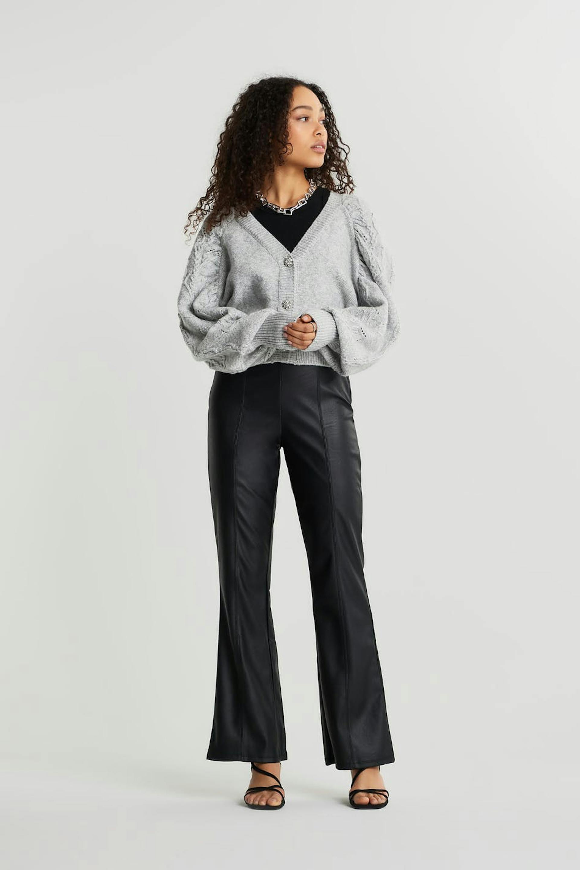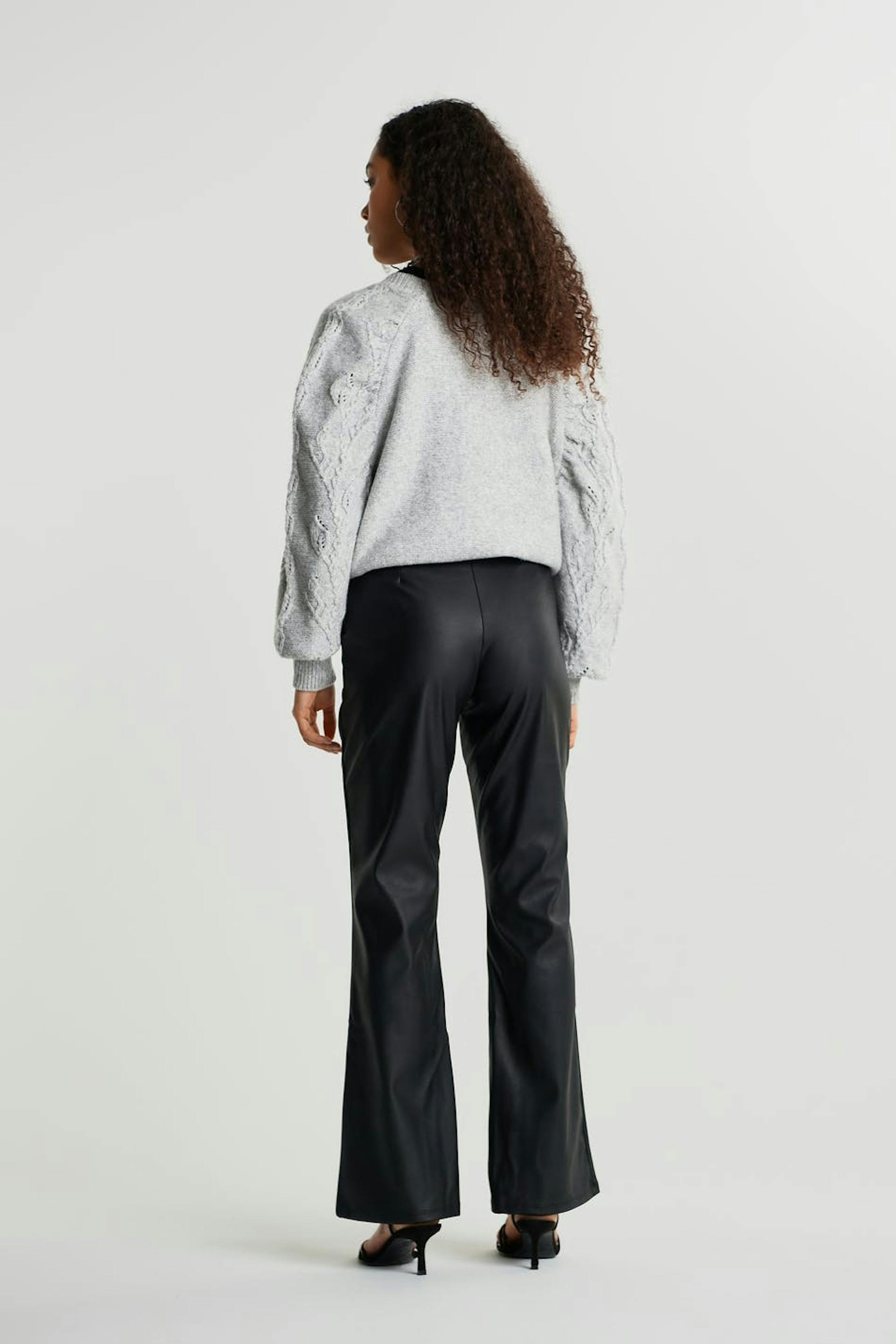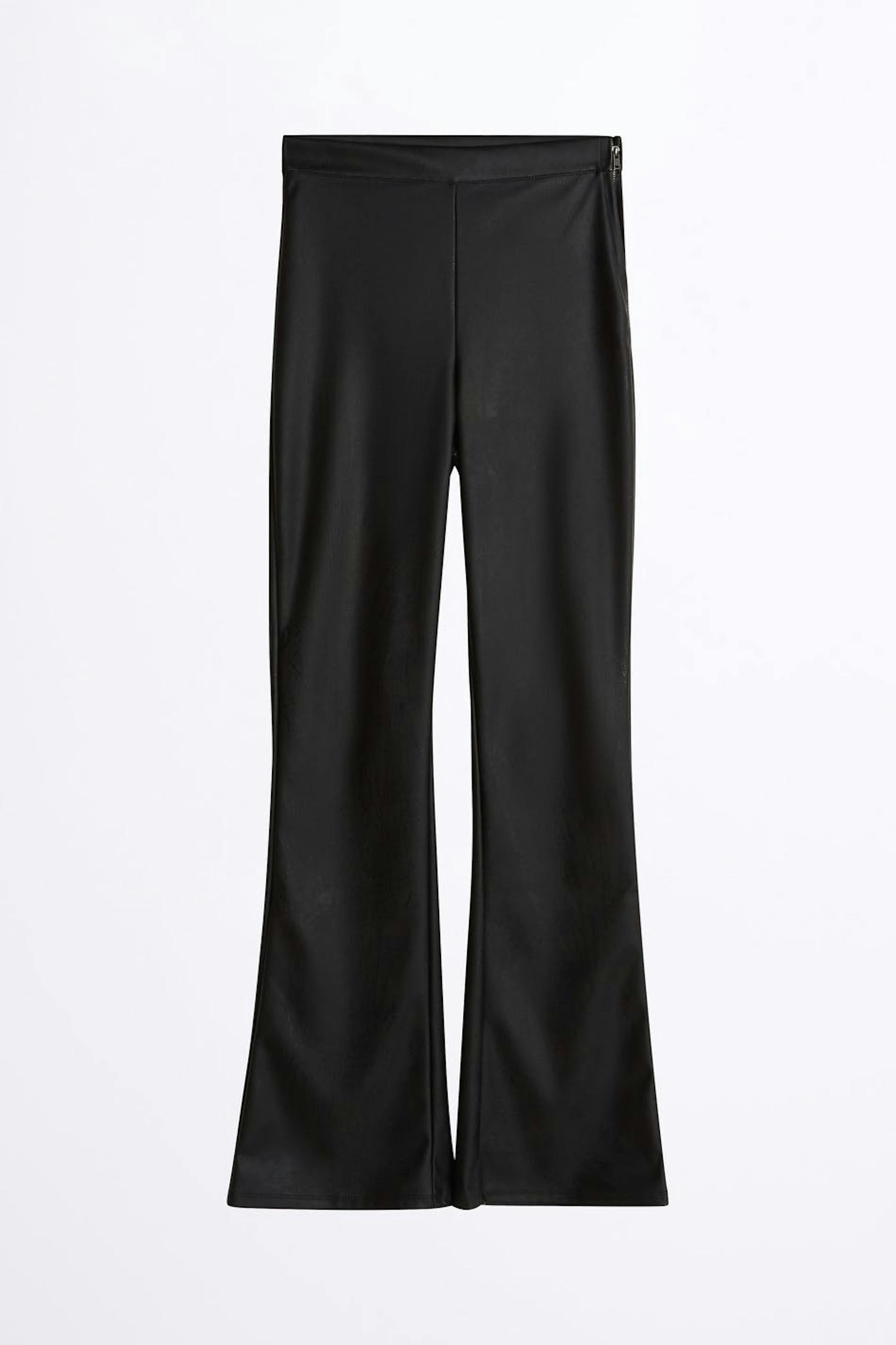 Trousers with a fitted fit. The trousers are black and have a high waist. They are made of PU and have flared legs and a zipper at the side.