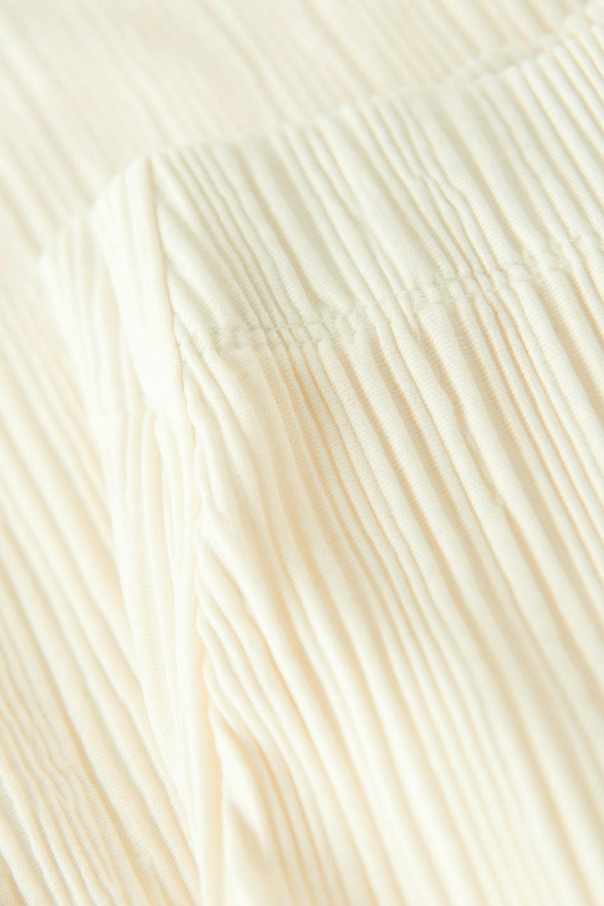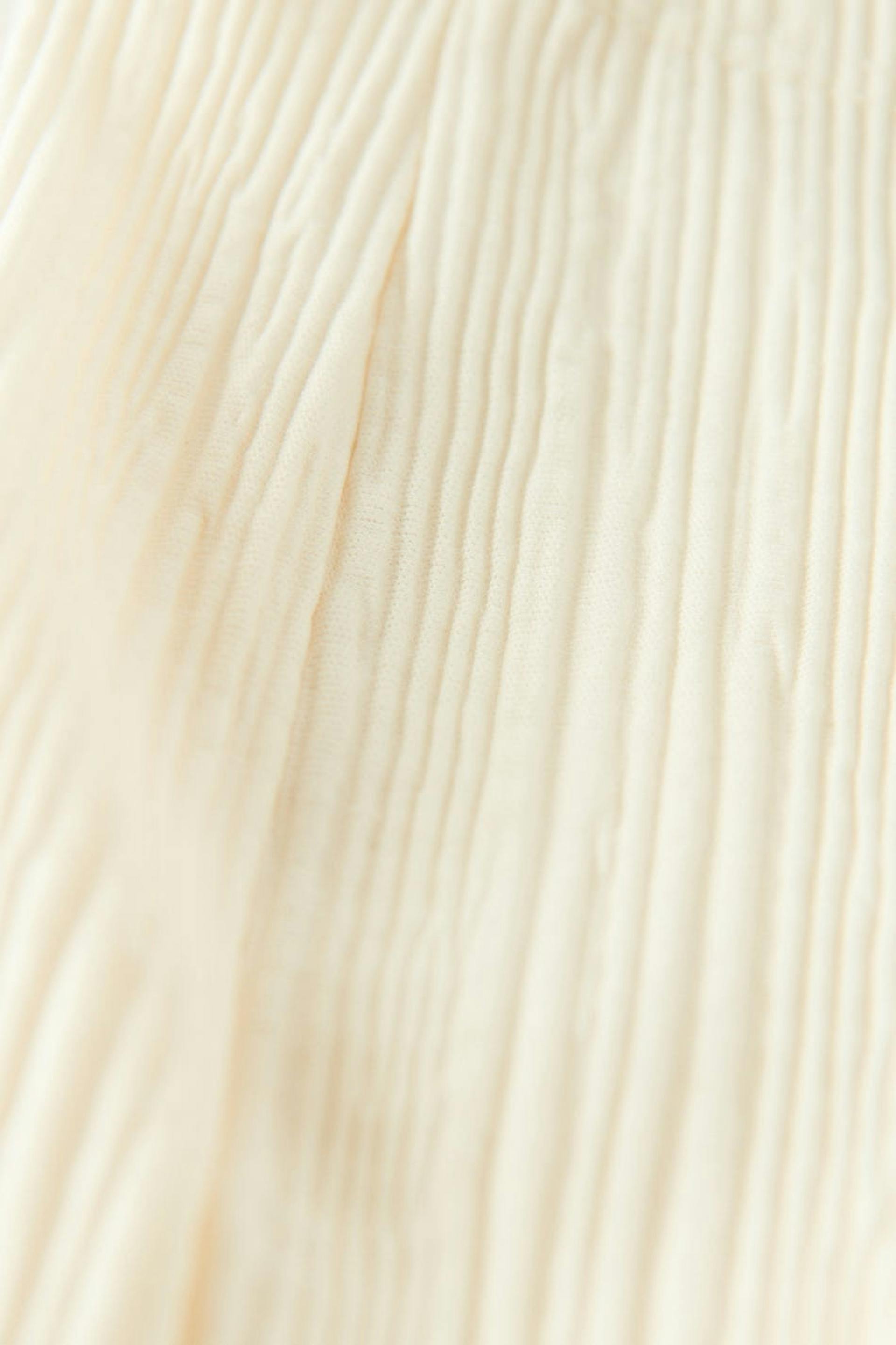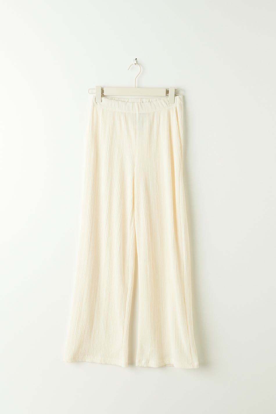 Pleated trousers in jersey with high elasticized waist. The trousers are white and have wide legs with shorter length. Perfect for those who are 160 cm (5 ft 3 in.) or shorter.
