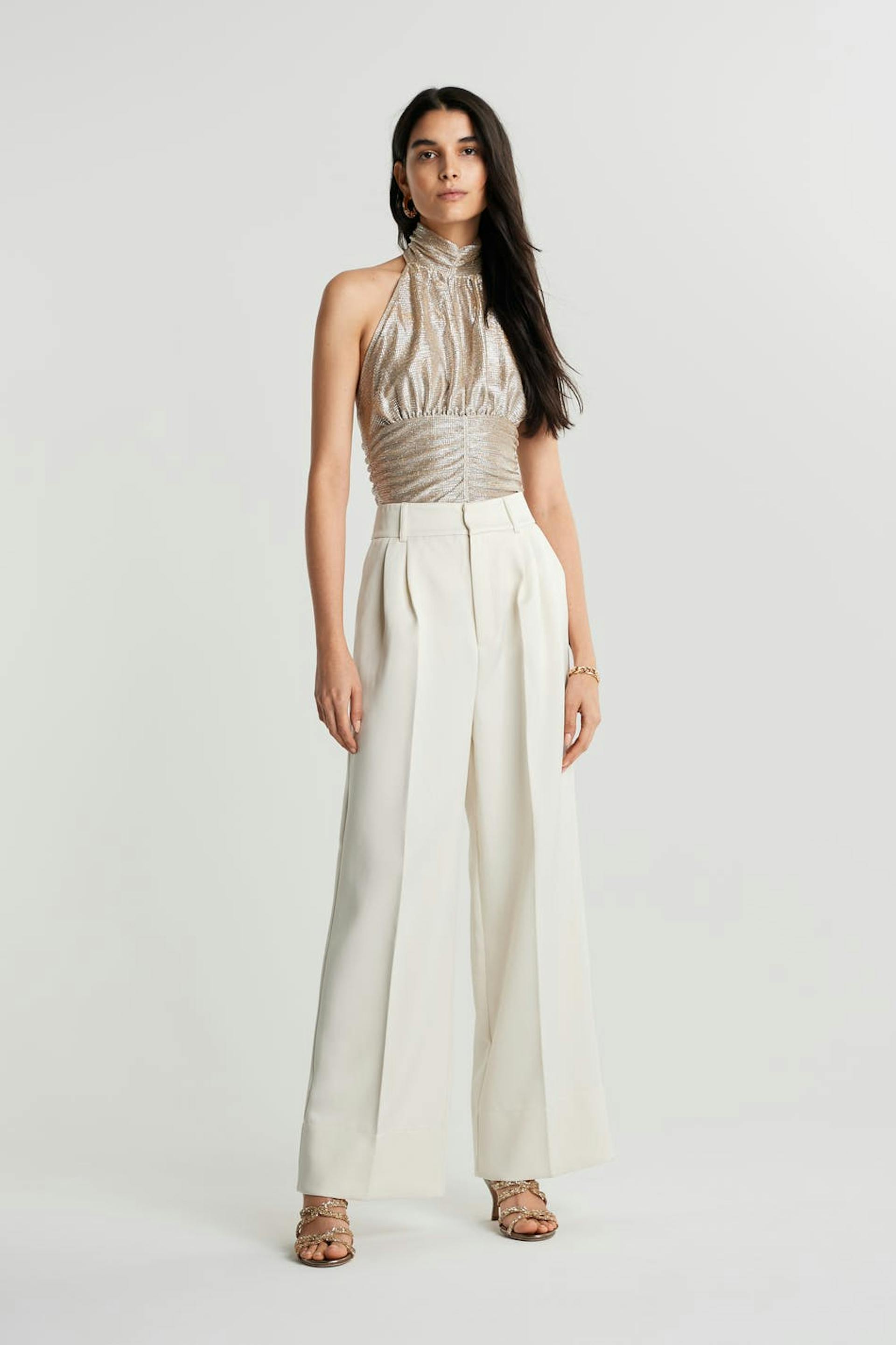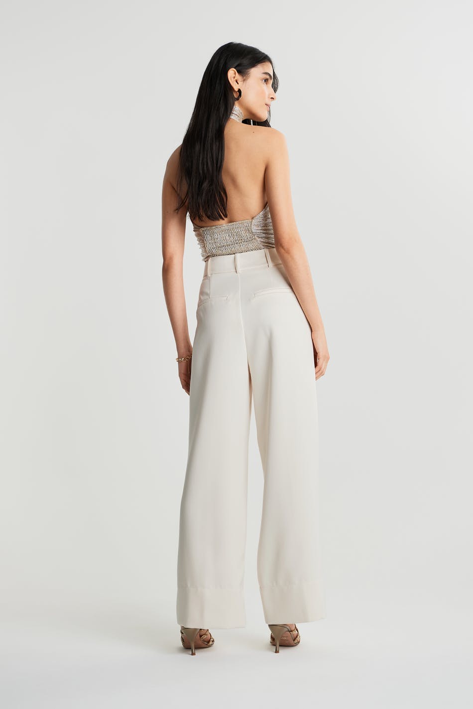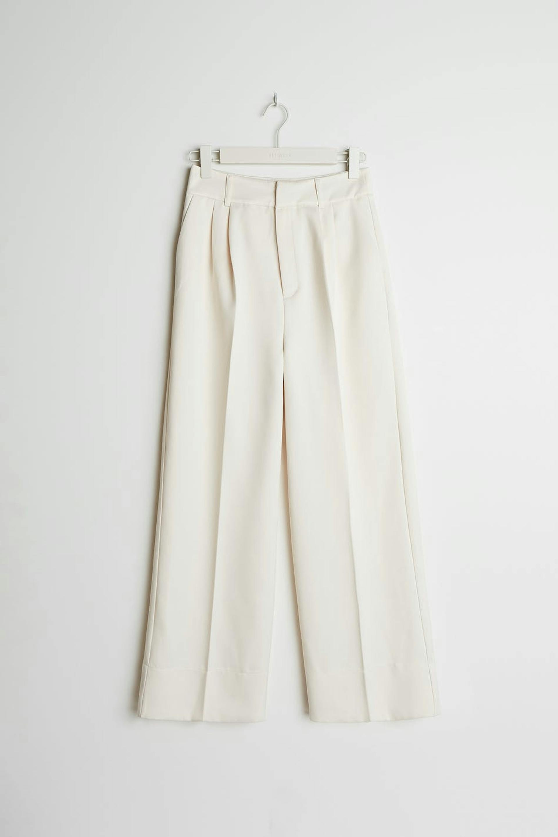 Trousers with wide, straight trouser legs with crease at the front. The trousers are white and have side pockets. They are made of satin.