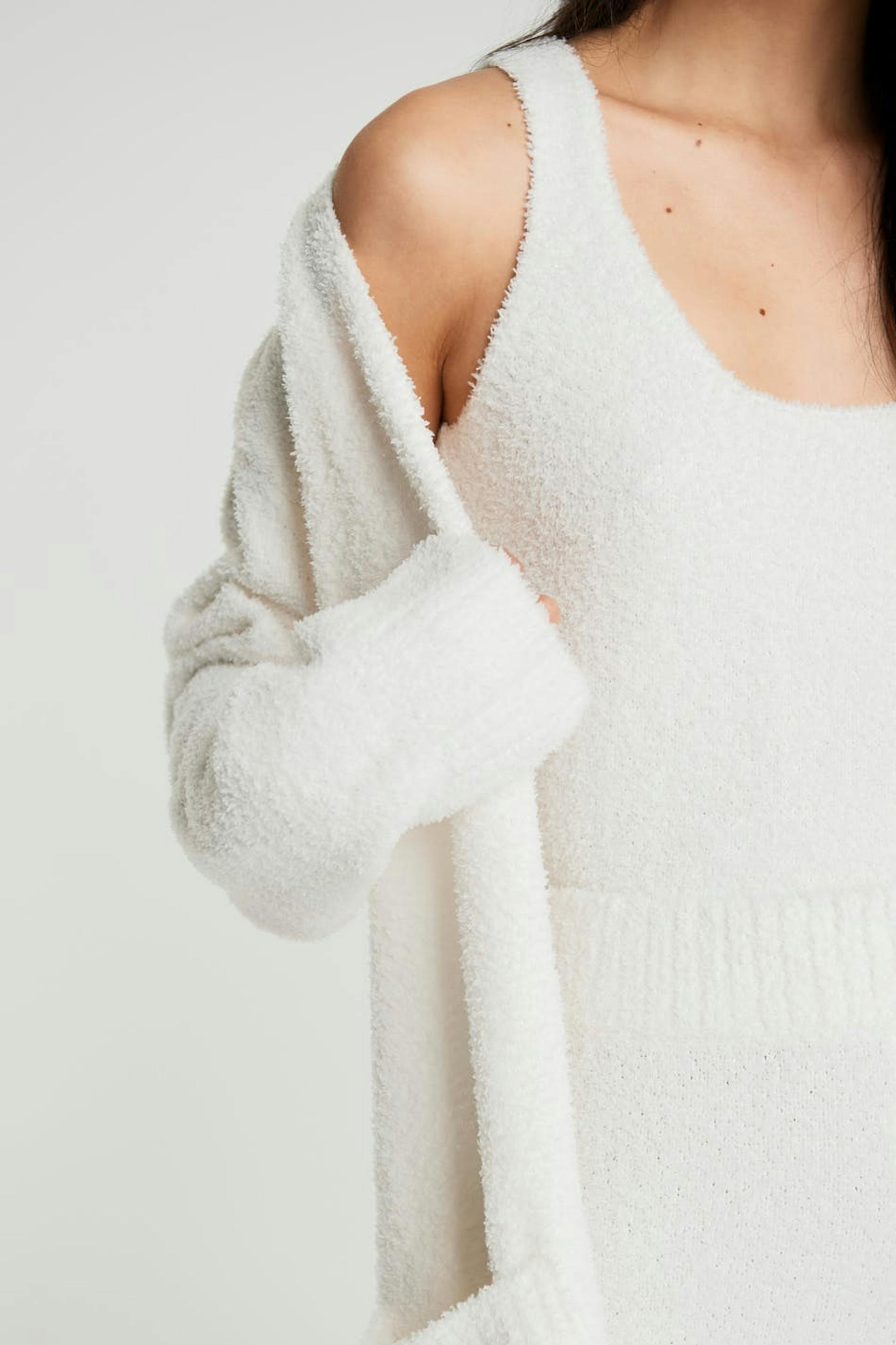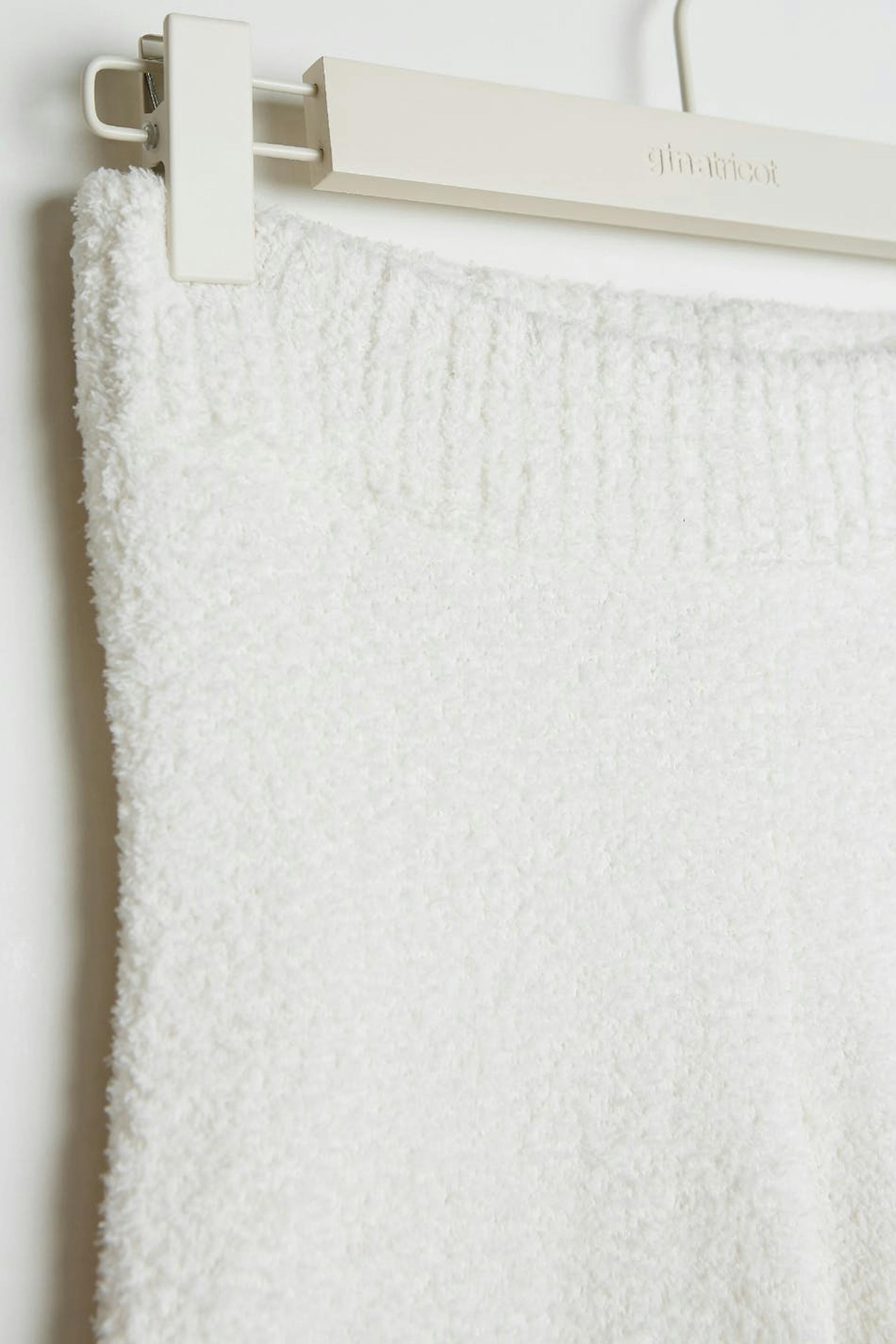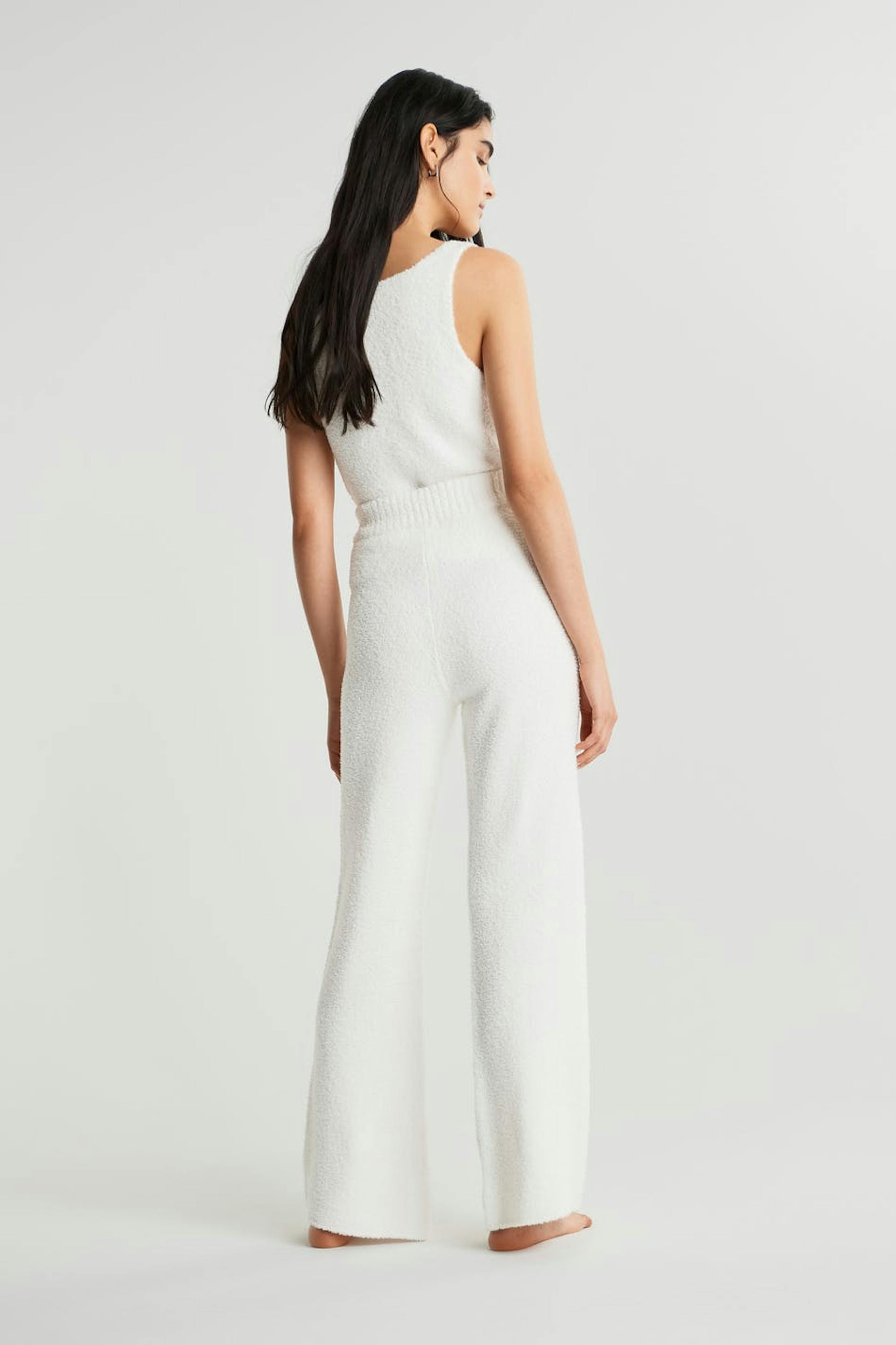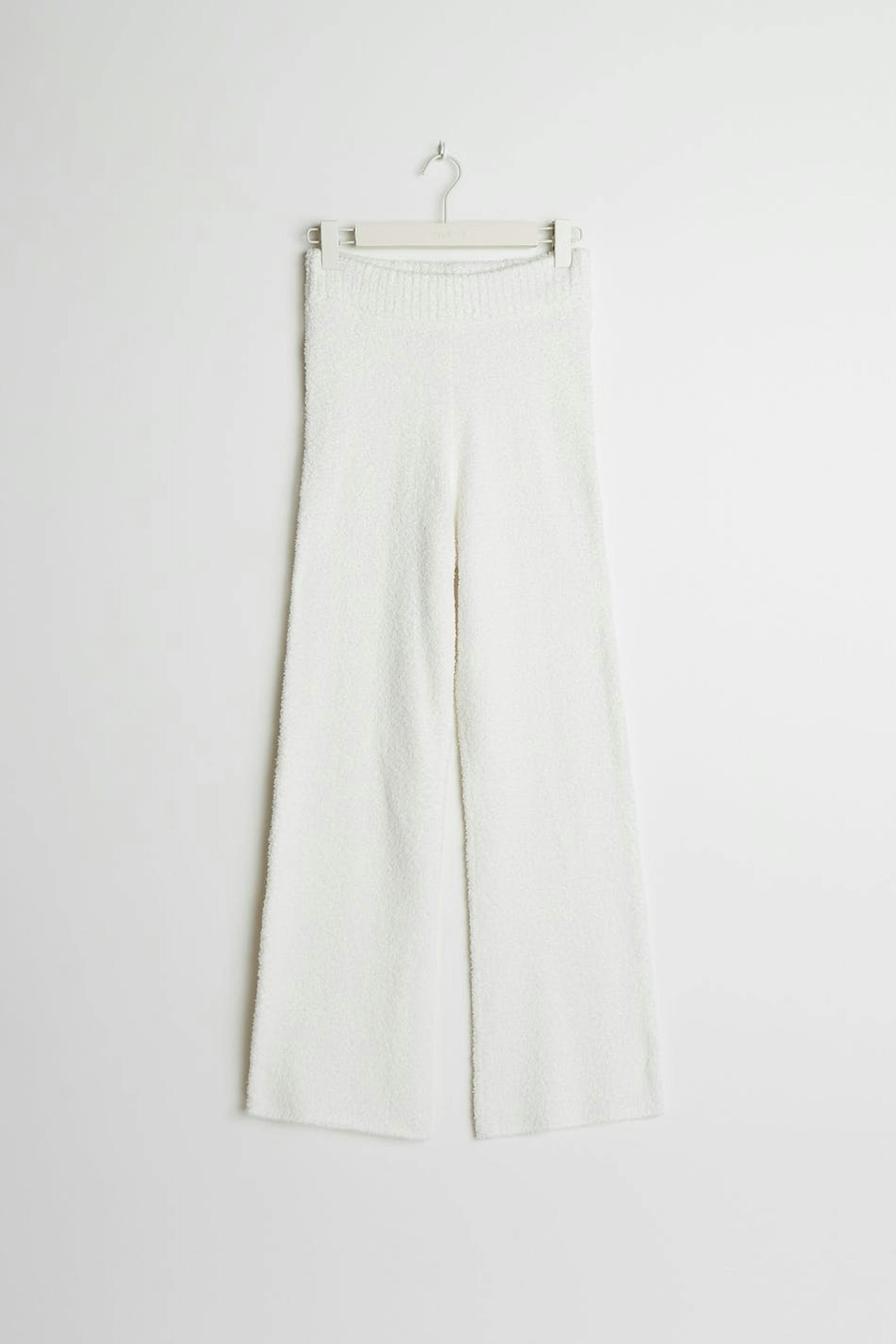 Knitted trousers with a cosy quality. The trousers are white and have wide leg trousers.