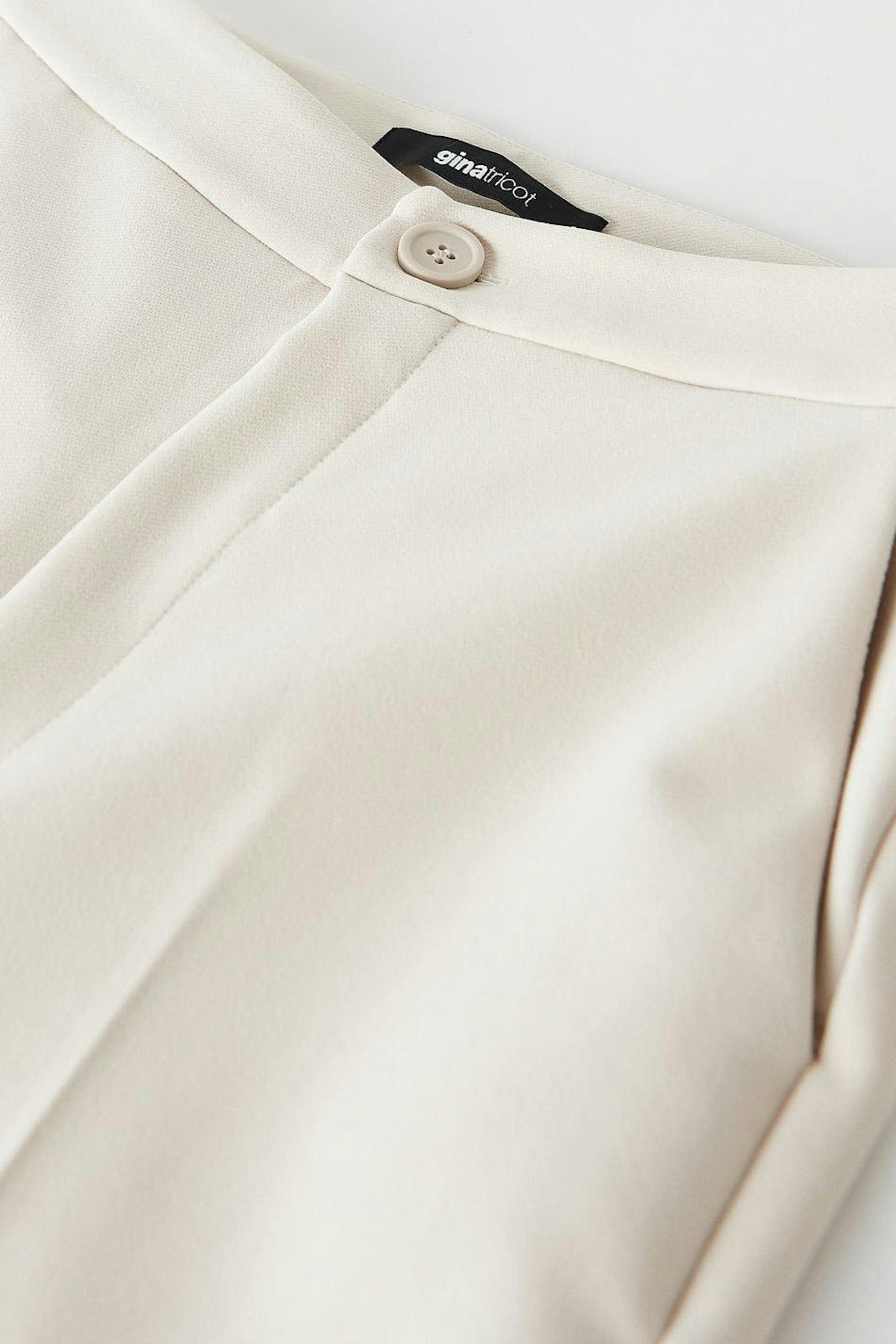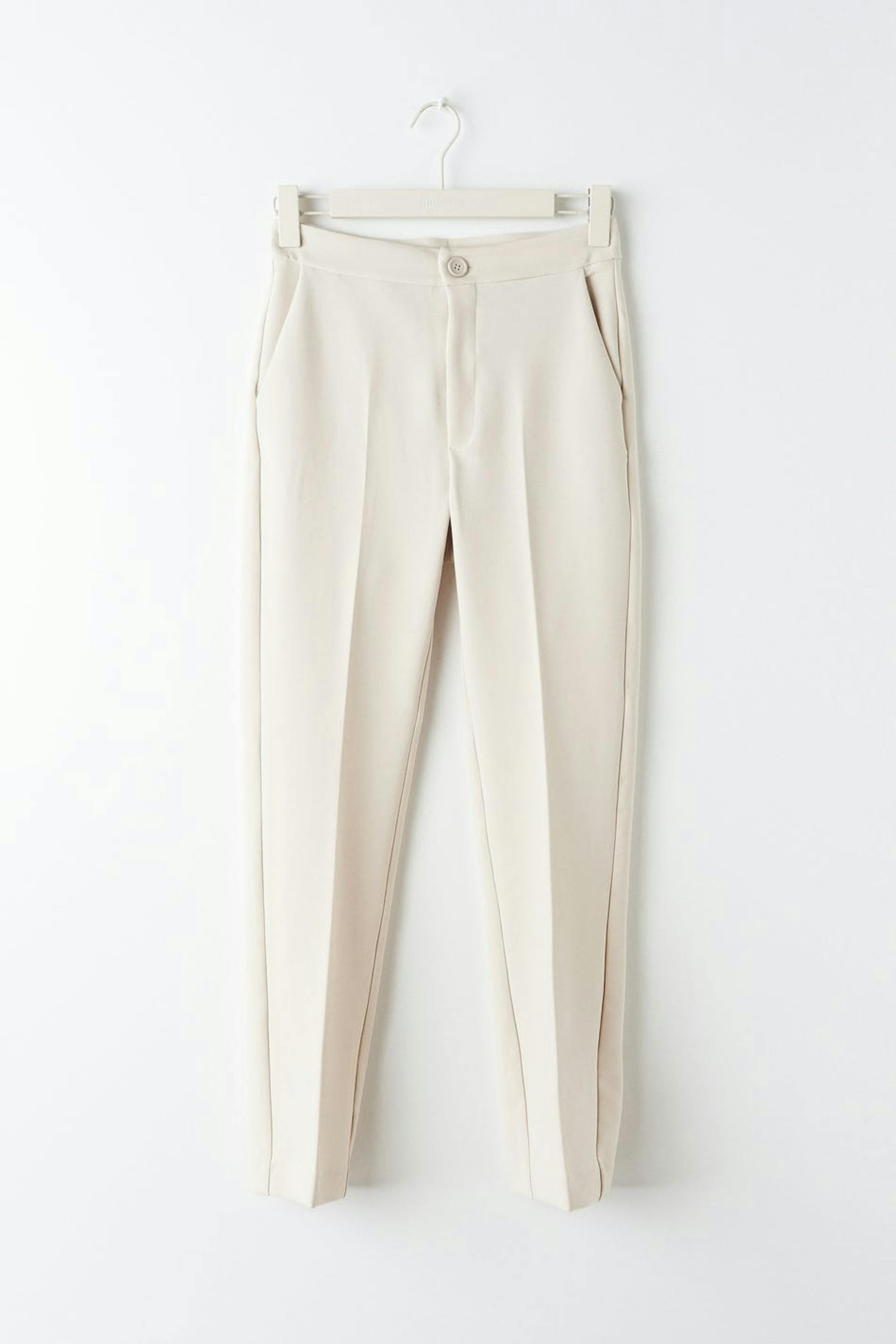 Cigarette trousers with high waist. The cigarette trousers are beige and have a stretchy slim fit. They have zip fly, pockets on the sides, slit pockets at the back and cropped gently tapered legs.