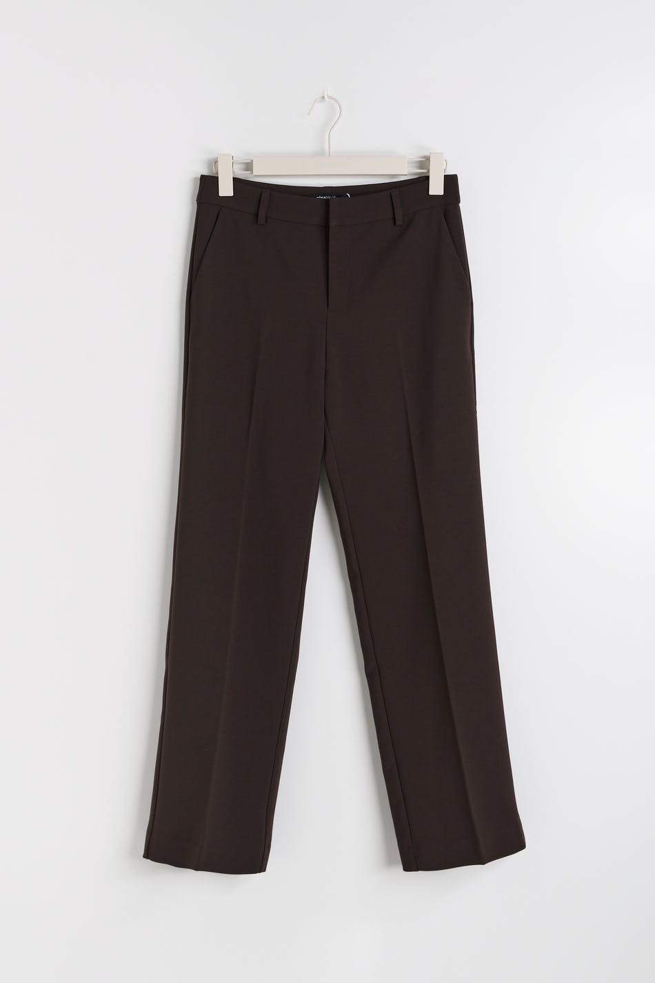 Petite suit trousers with creases in front. The trousers are brown and have straight legs with full length. They have pockets on the sides, waistband with belt loops and slit pockets at the back. Perfect for those who are 160 cm (5 ft 3 in.) or shorter.