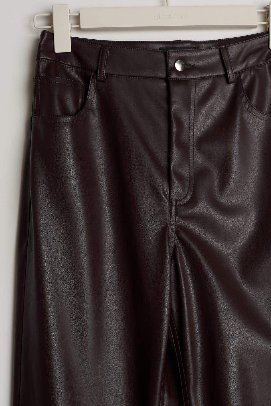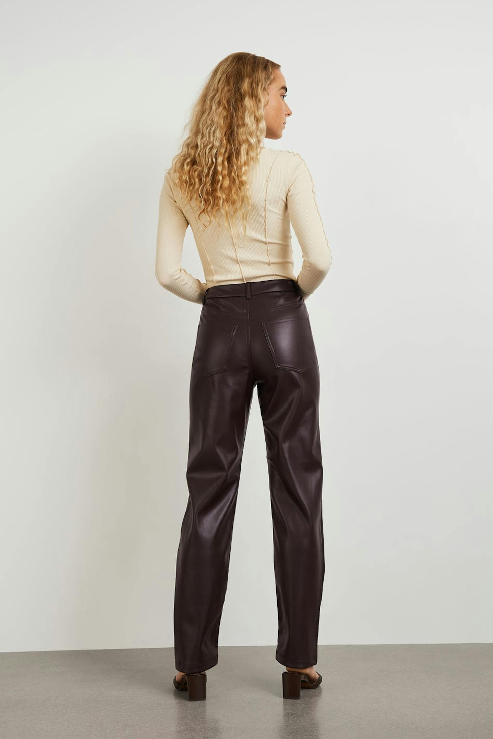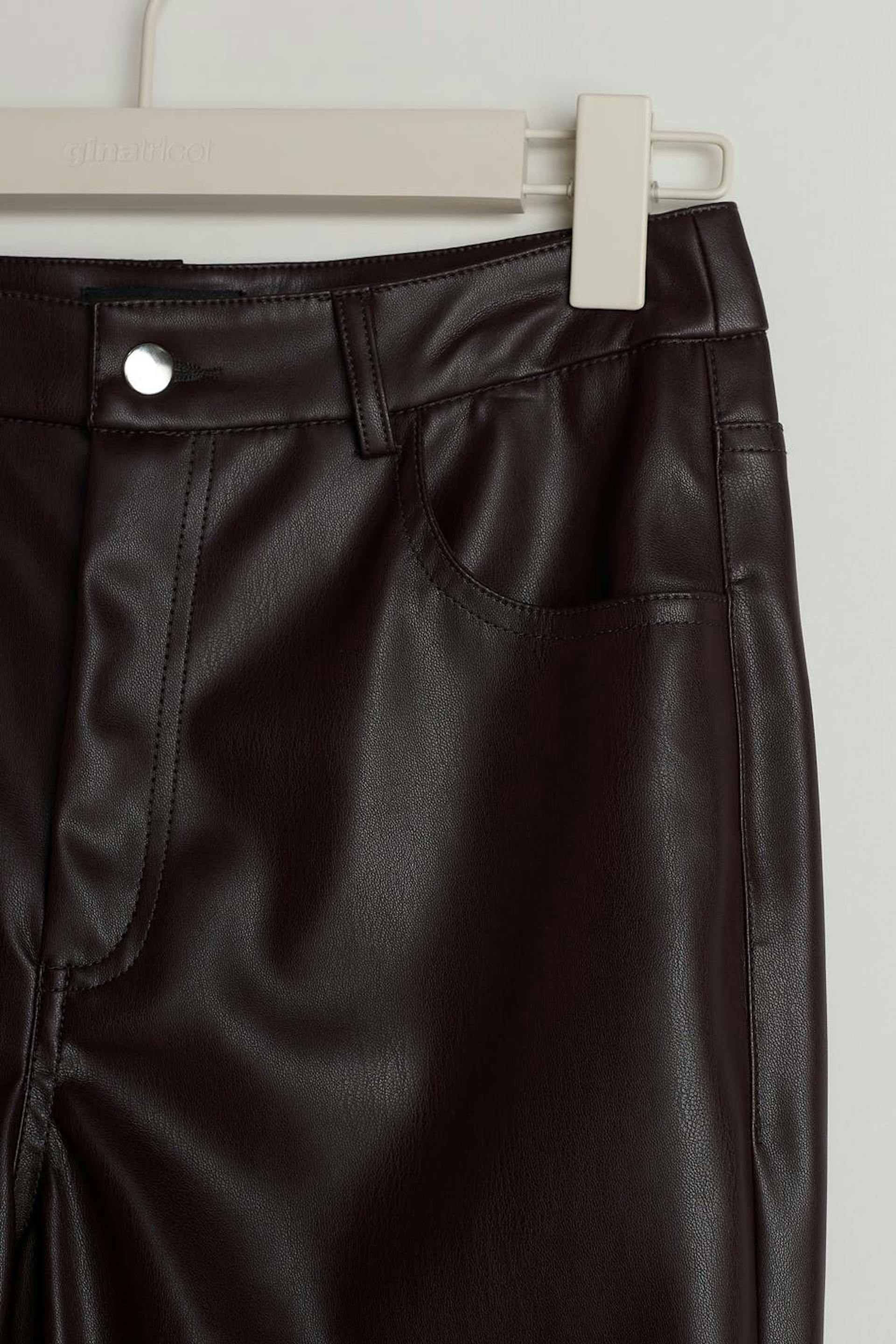 Trousers with a 90s inspired fit. The trousers are brown and have a faux-leather material. They have straight trouser legs with a full length and pockets at the front and back.
