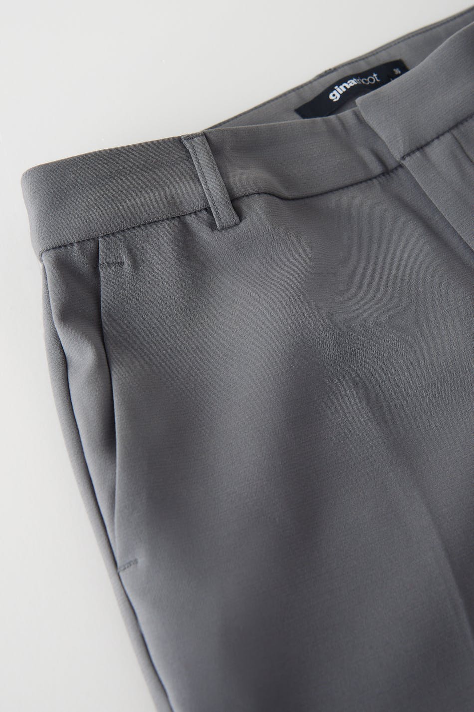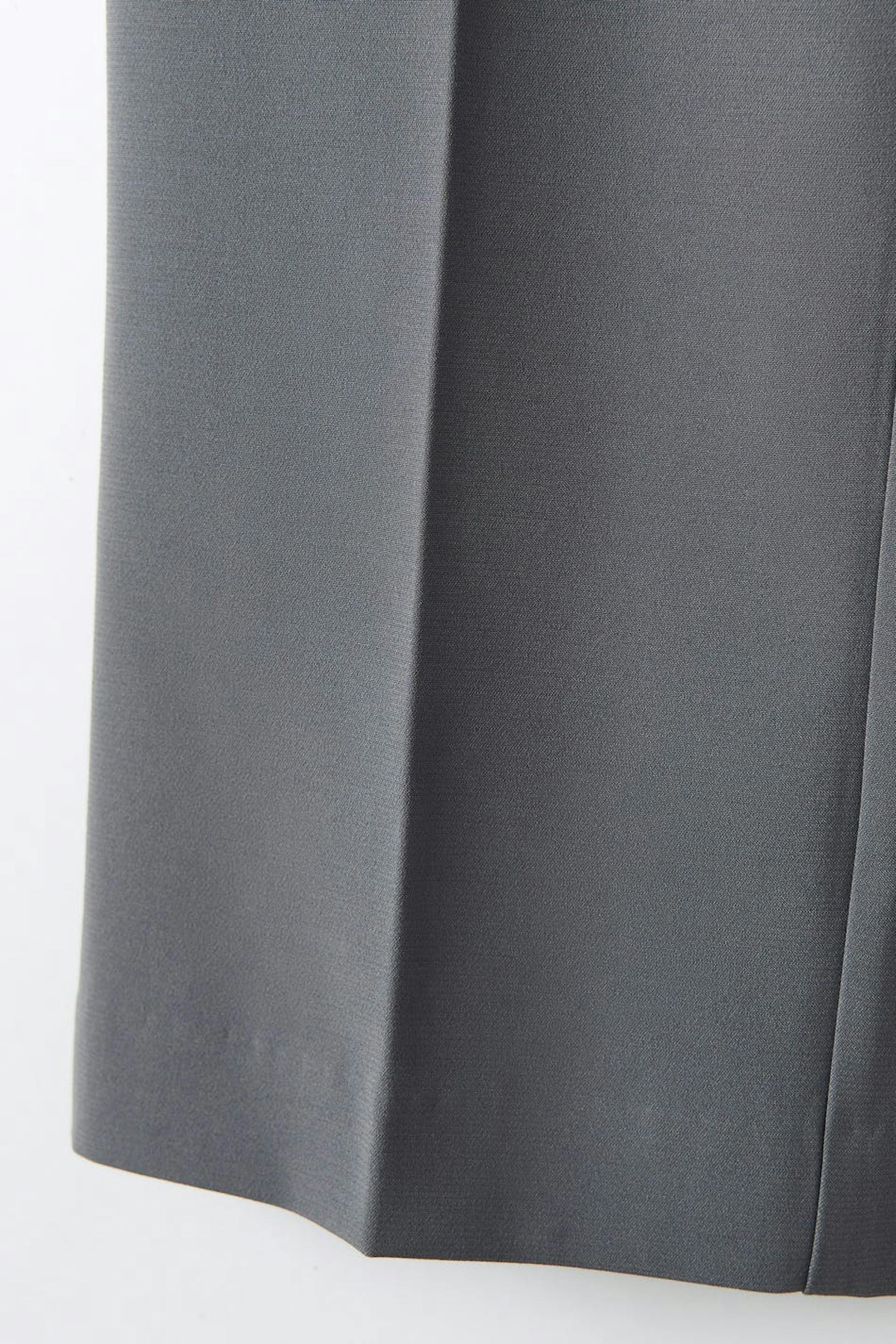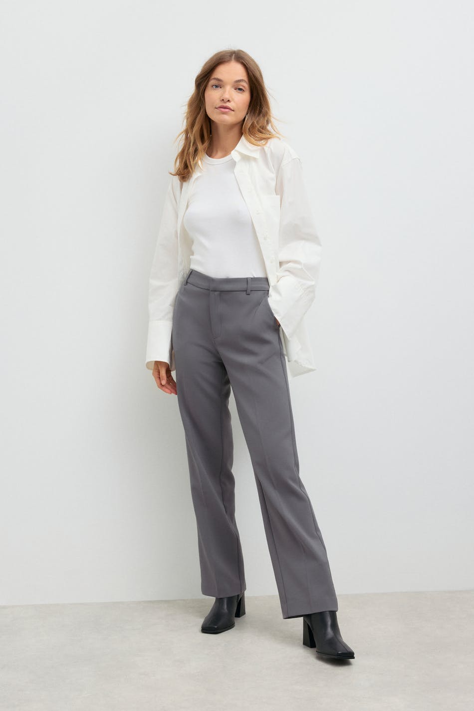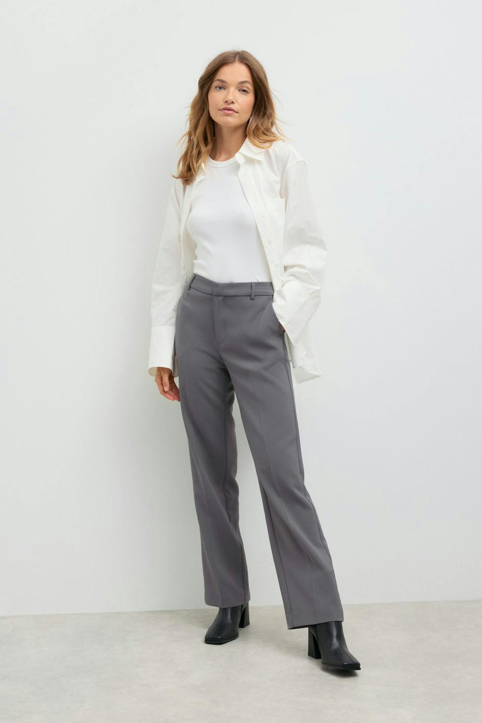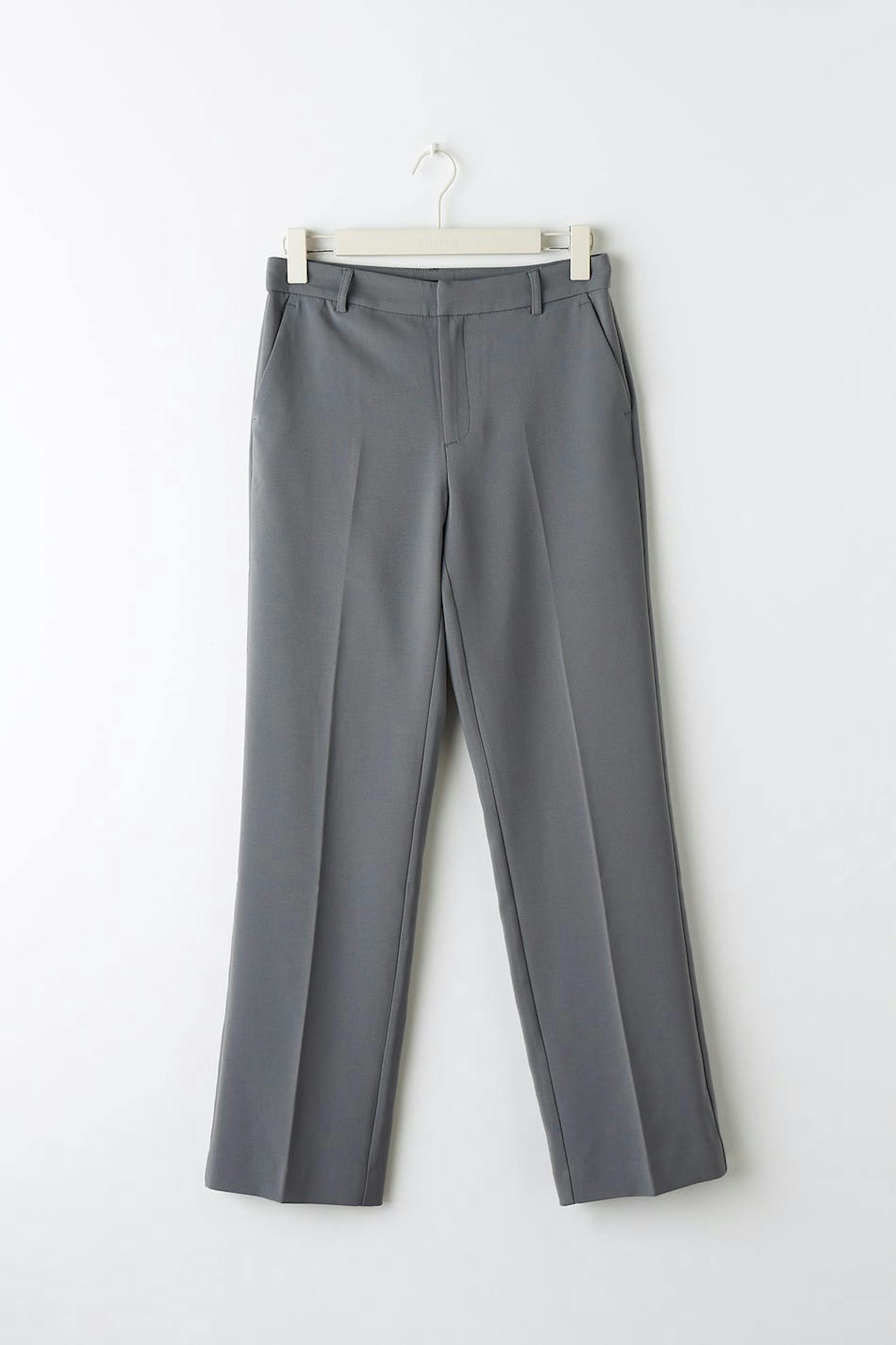 Straight suit trousers with creases. The trousers are grey and have pockets in the sides. They have straight, long trouser legs and a slit pocket at the back.