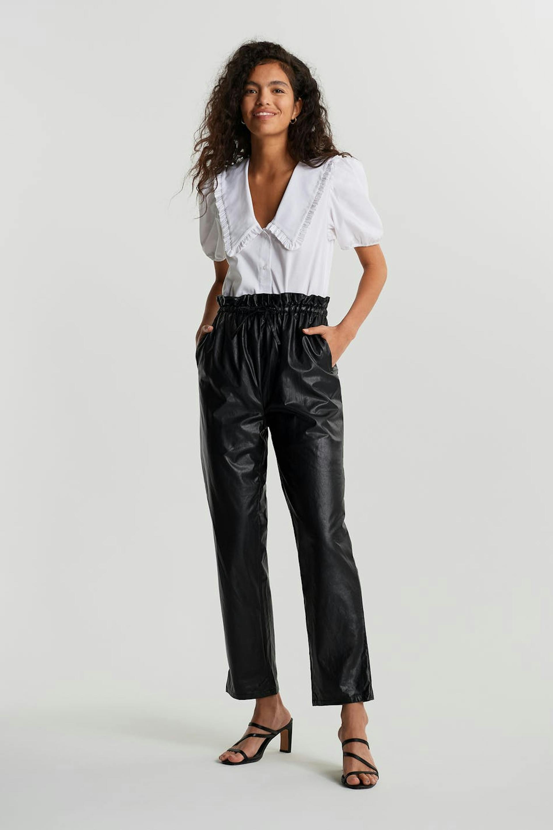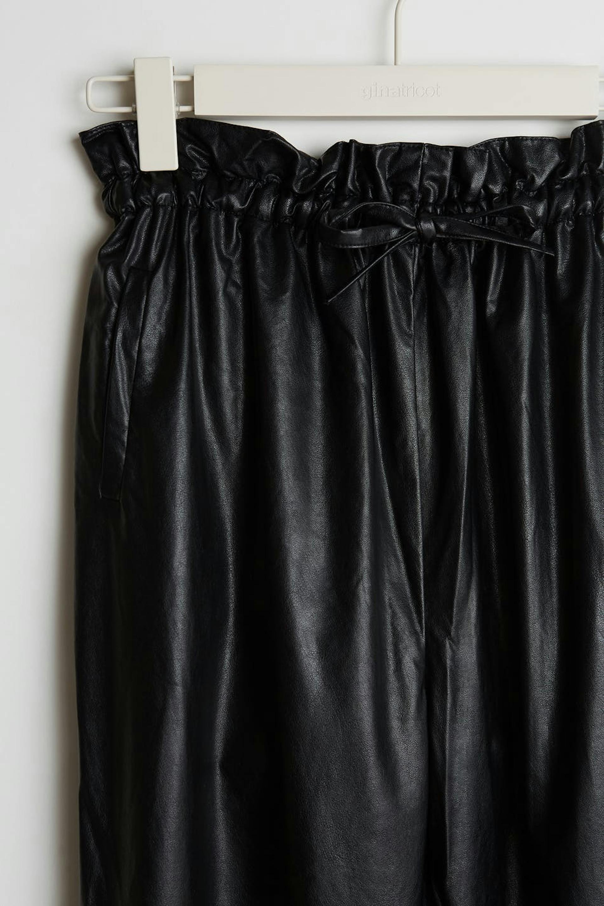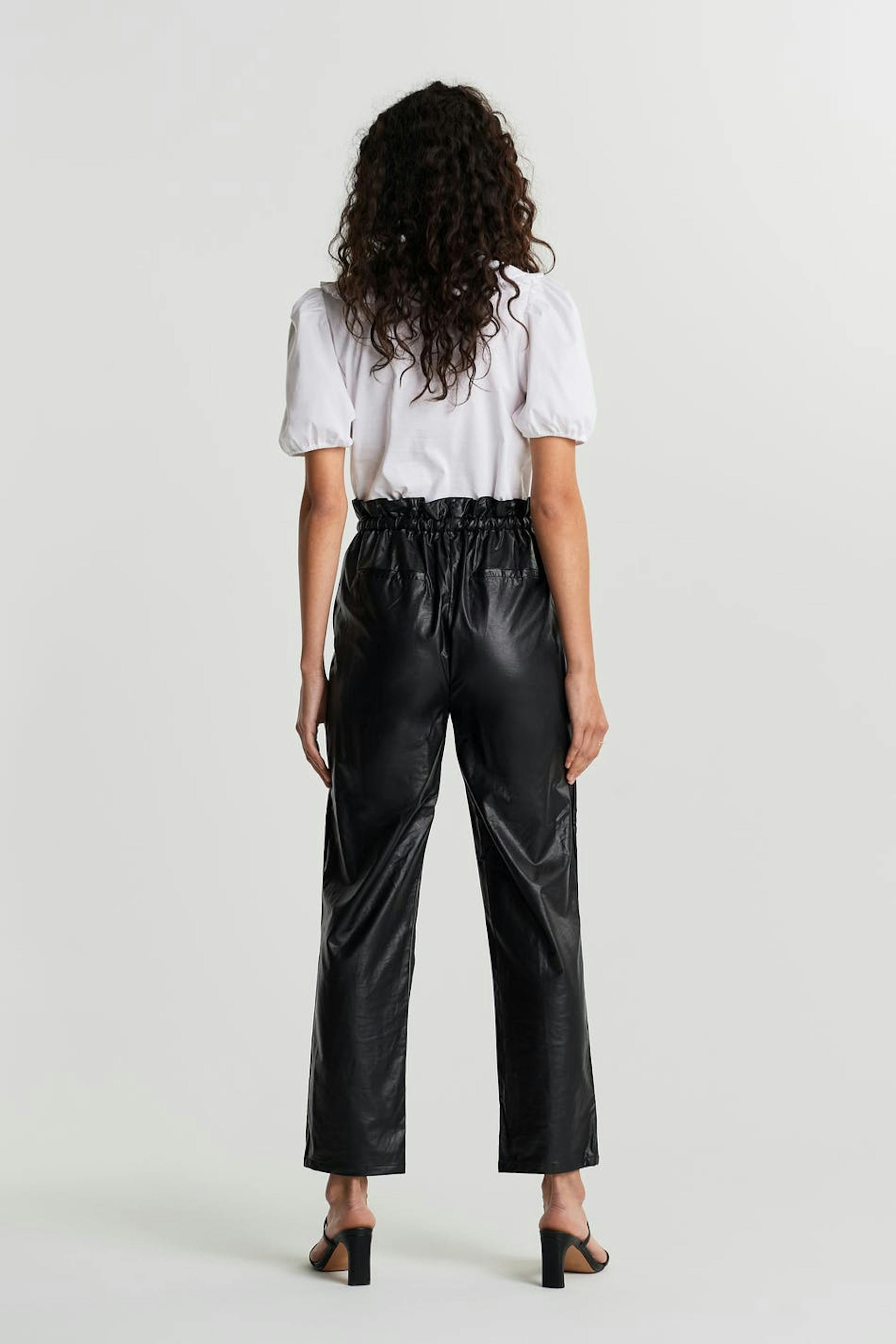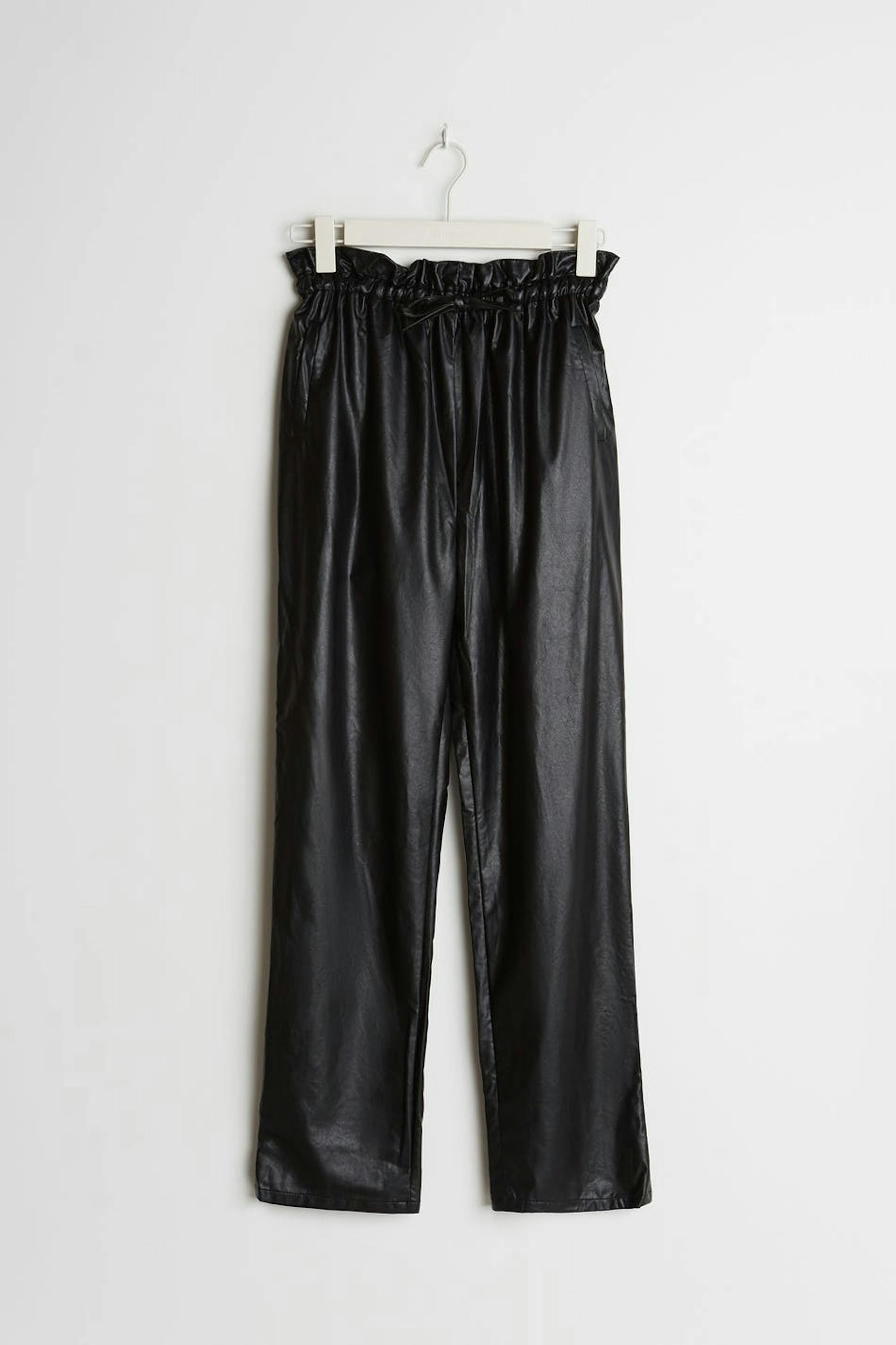 Straight trousers with side pockets. The trousers are perfect for the party and black and have an elastic strap at the waist and at the end of the legs. They are made of PU.