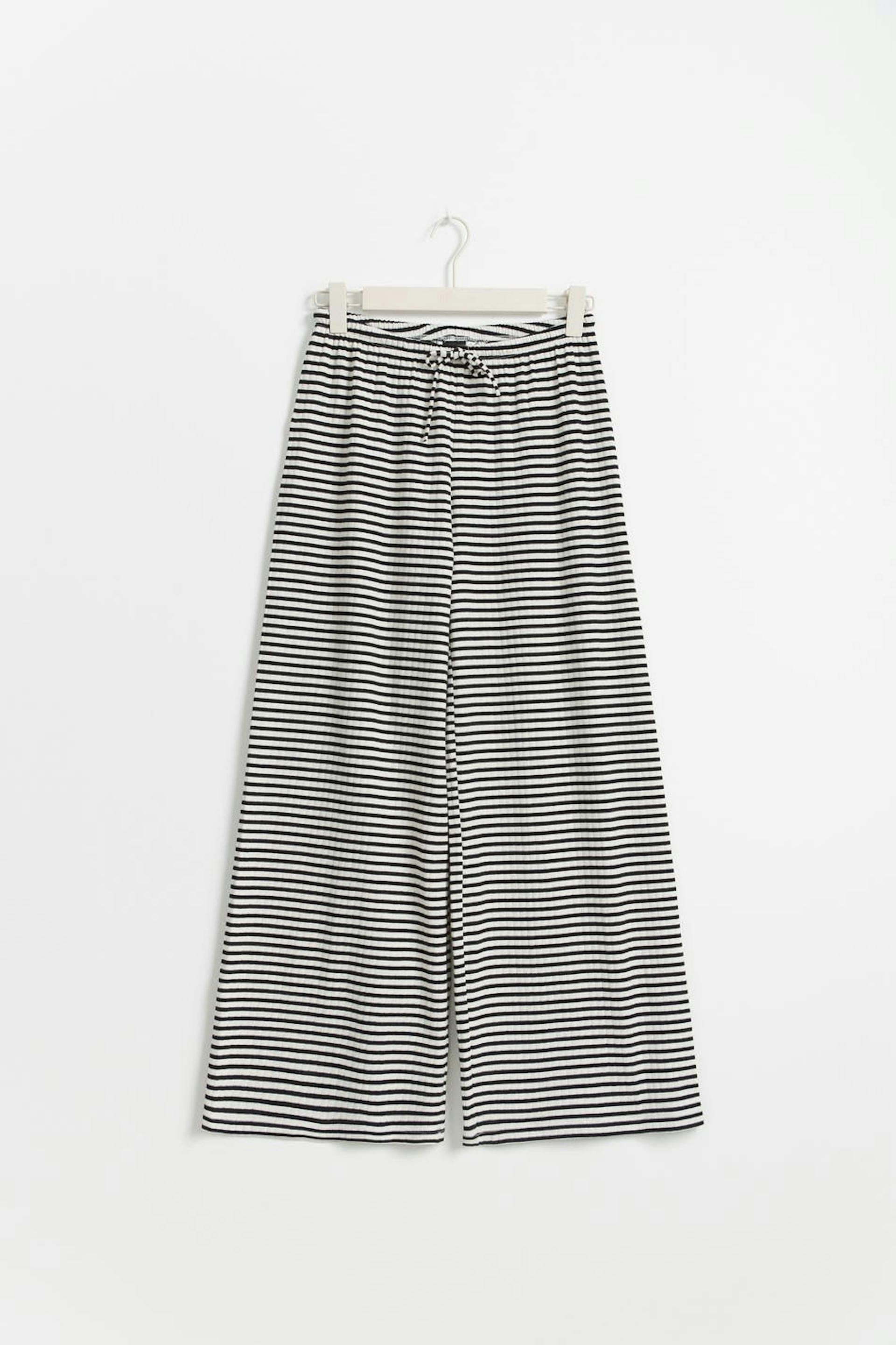 Petite trousers with low waist. The trousers are black, striped and straight. They have soft quality, self-tie drawstring at the waist and regular length. Perfect for those who are 160 cm (5 ft 3 in.) or shorter.