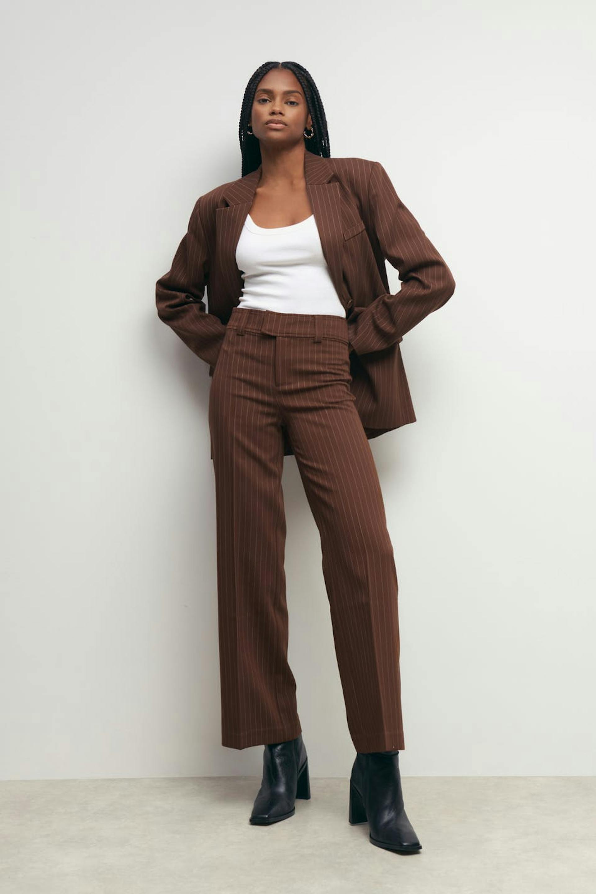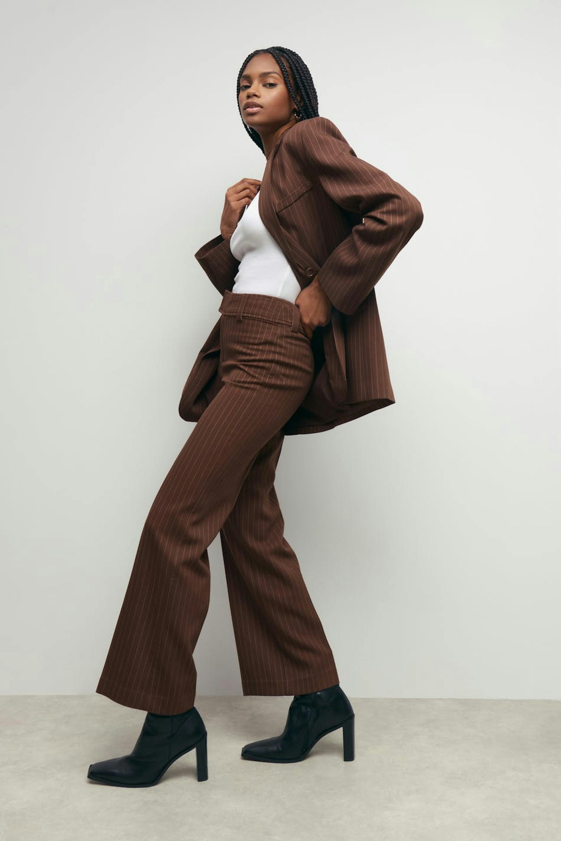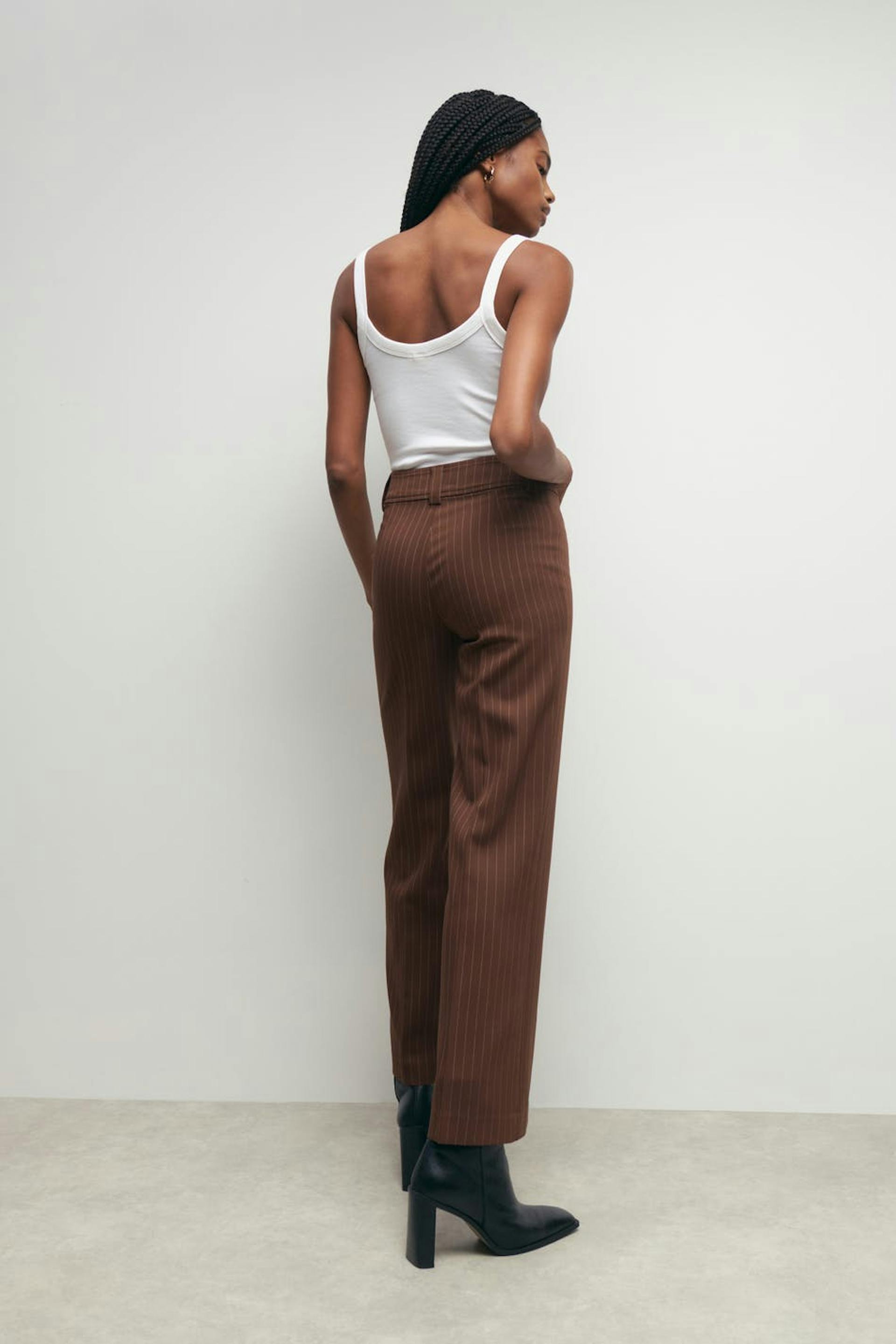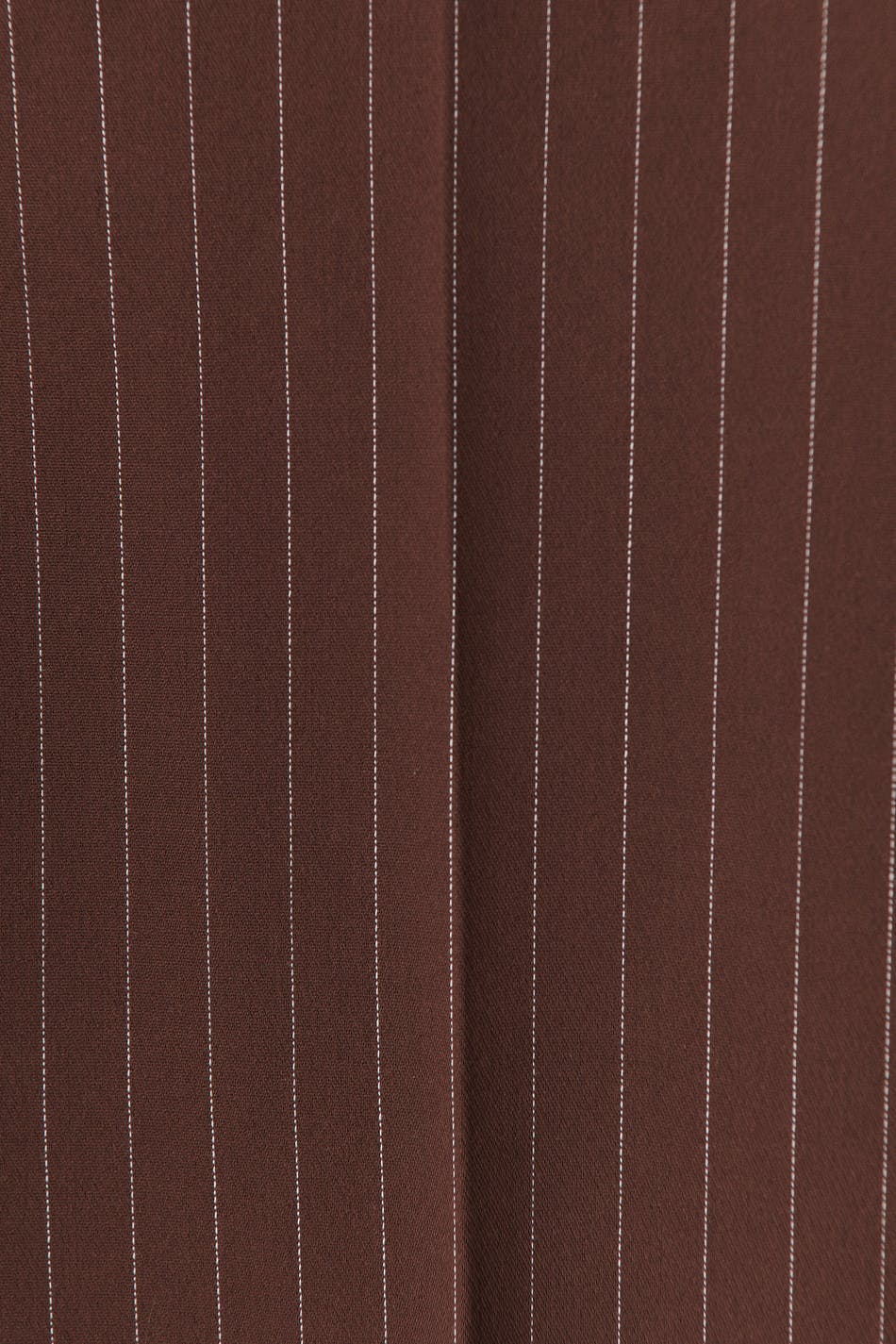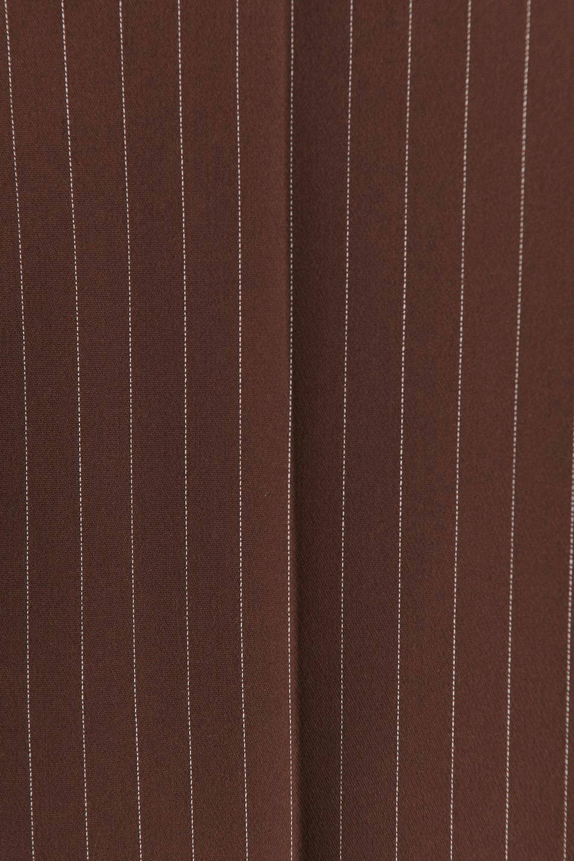 Pinstriped suit trousers with mid waist. The trousers are brown and have wide legs. They have zip fly with hook-and-eye closure and broad waist tie with belt loops.