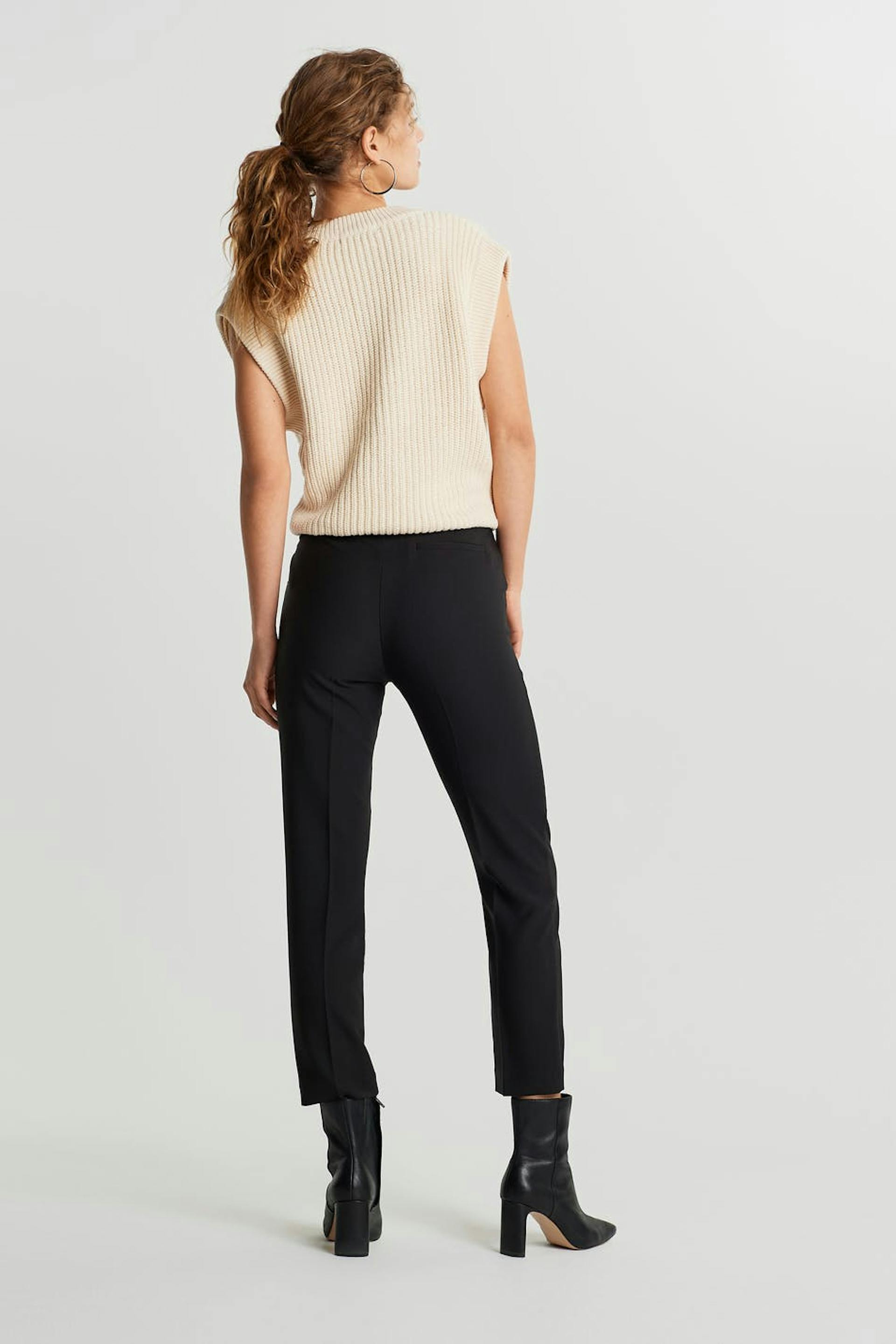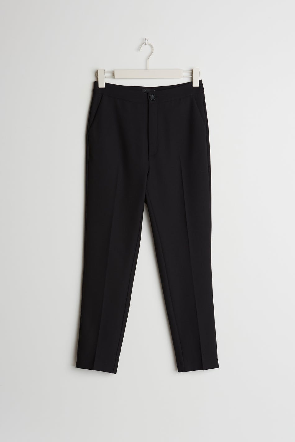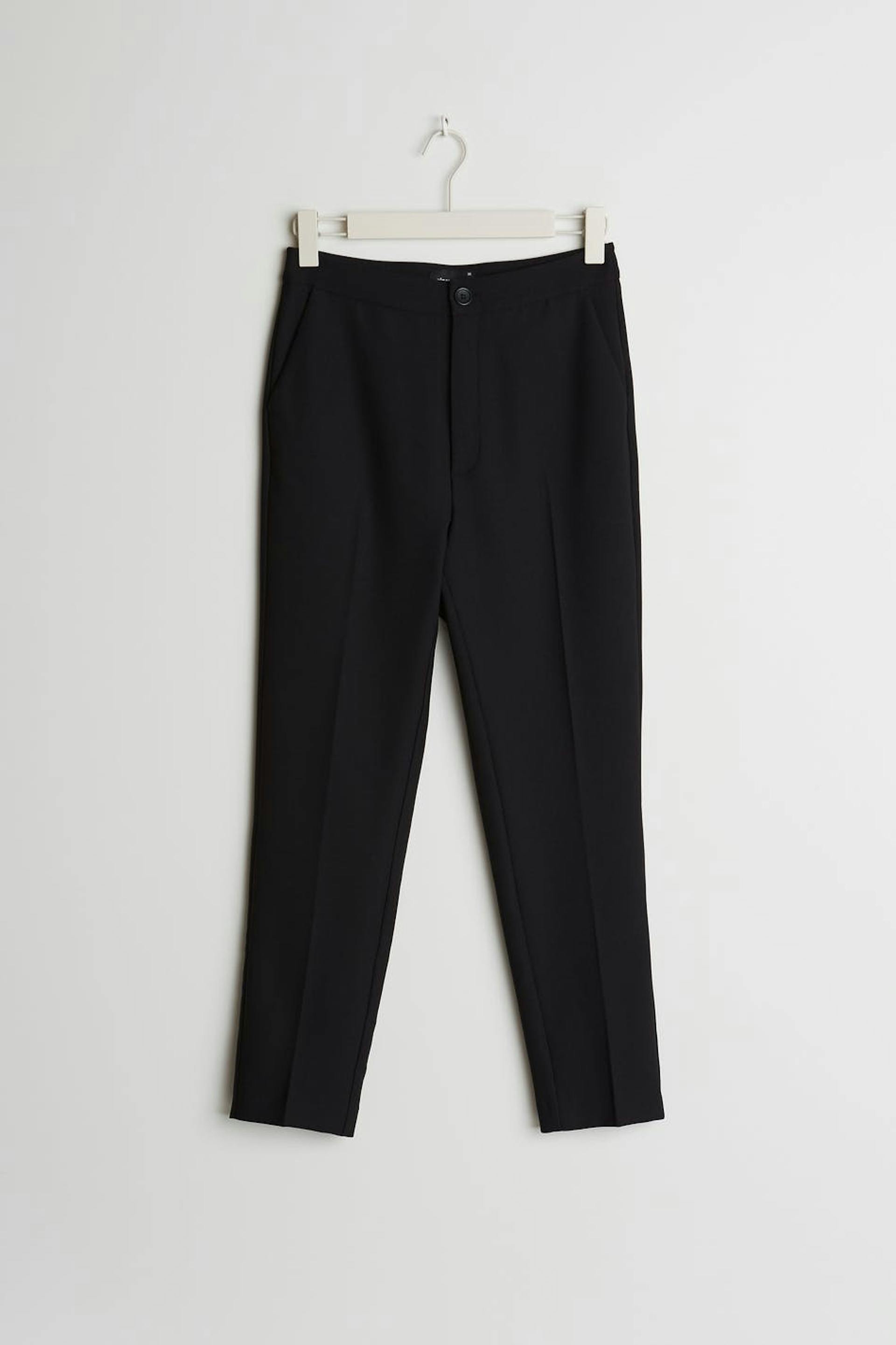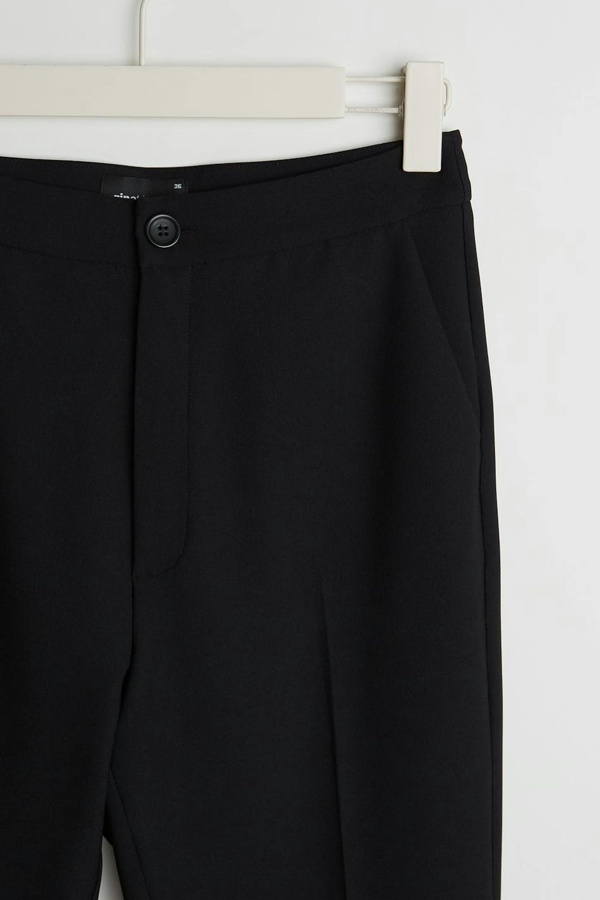 Straight suit trousers with a slim fit. The trousers are black and have a high waist. They have shorter legs.