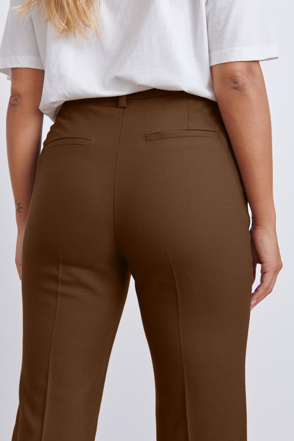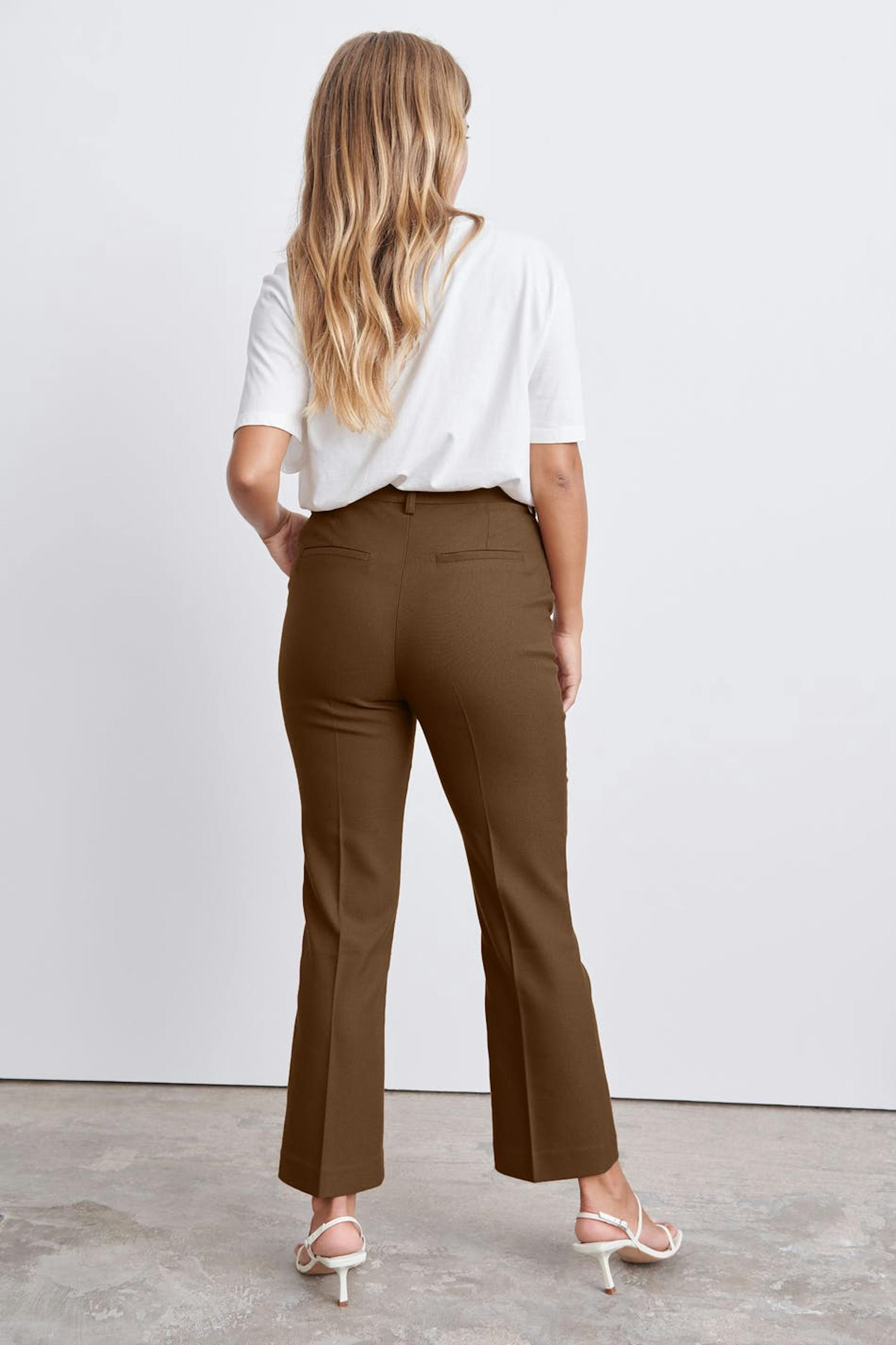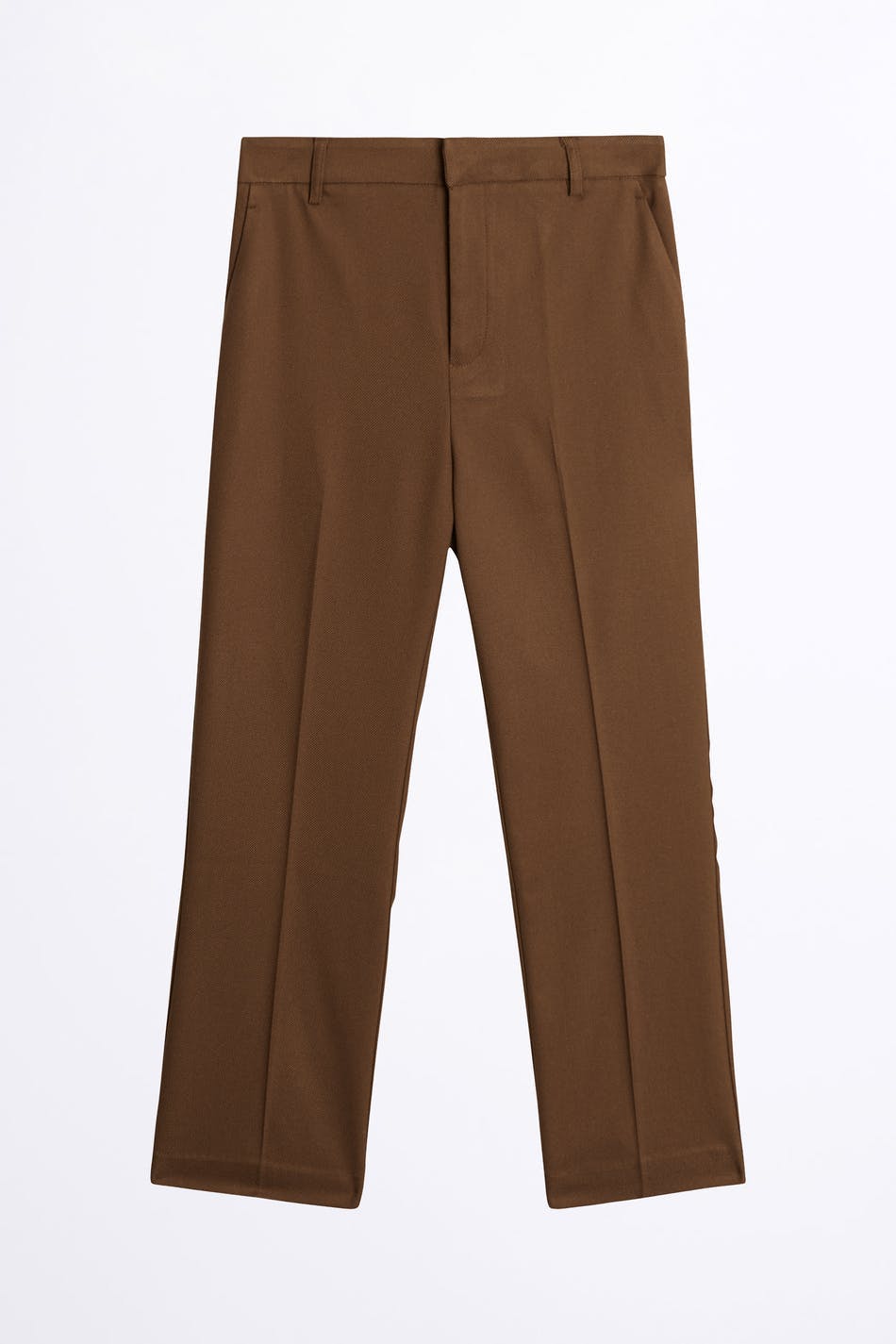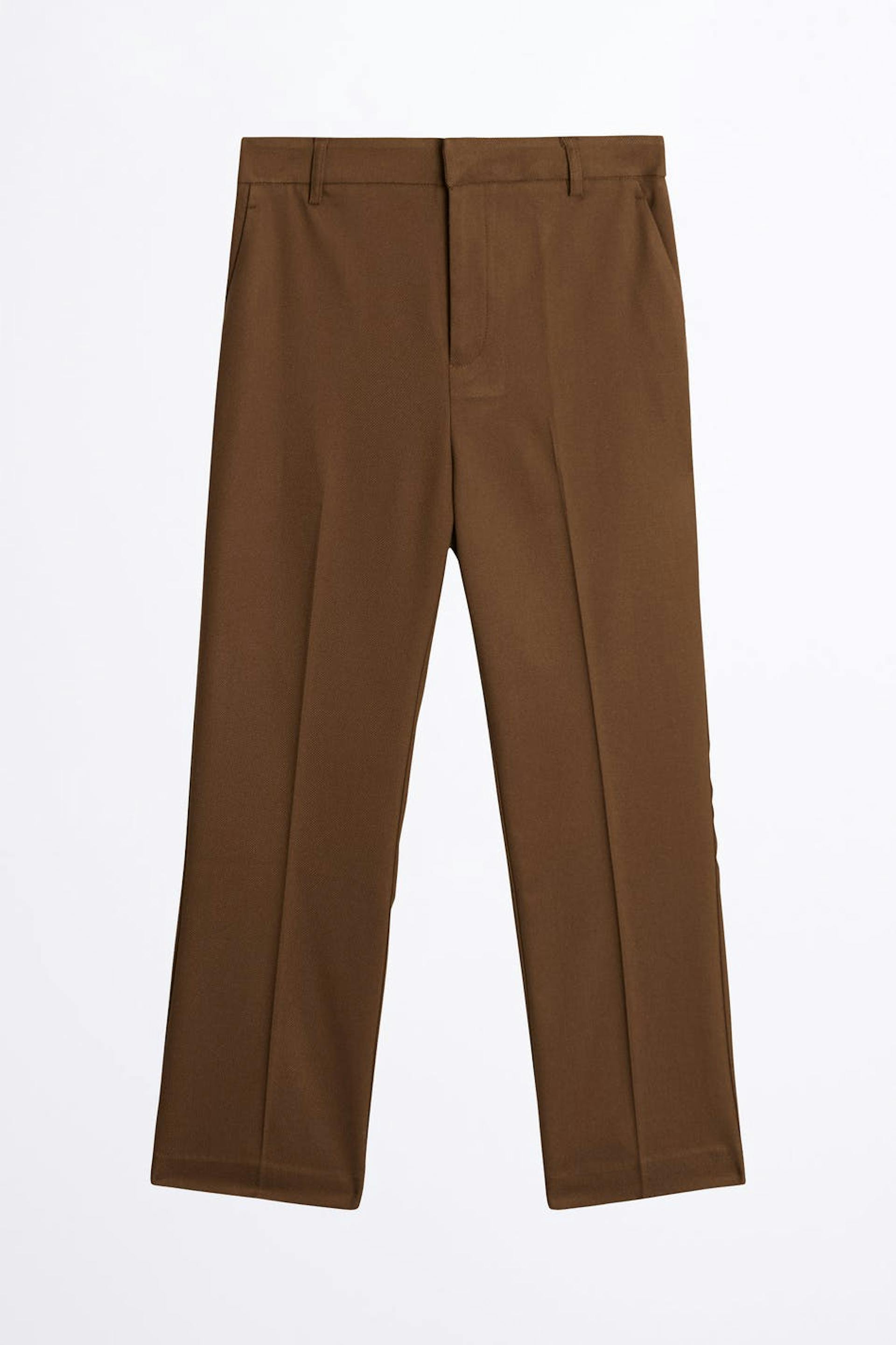 Straight suit trousers with pockets on the sides. The trousers are brown and have creases.