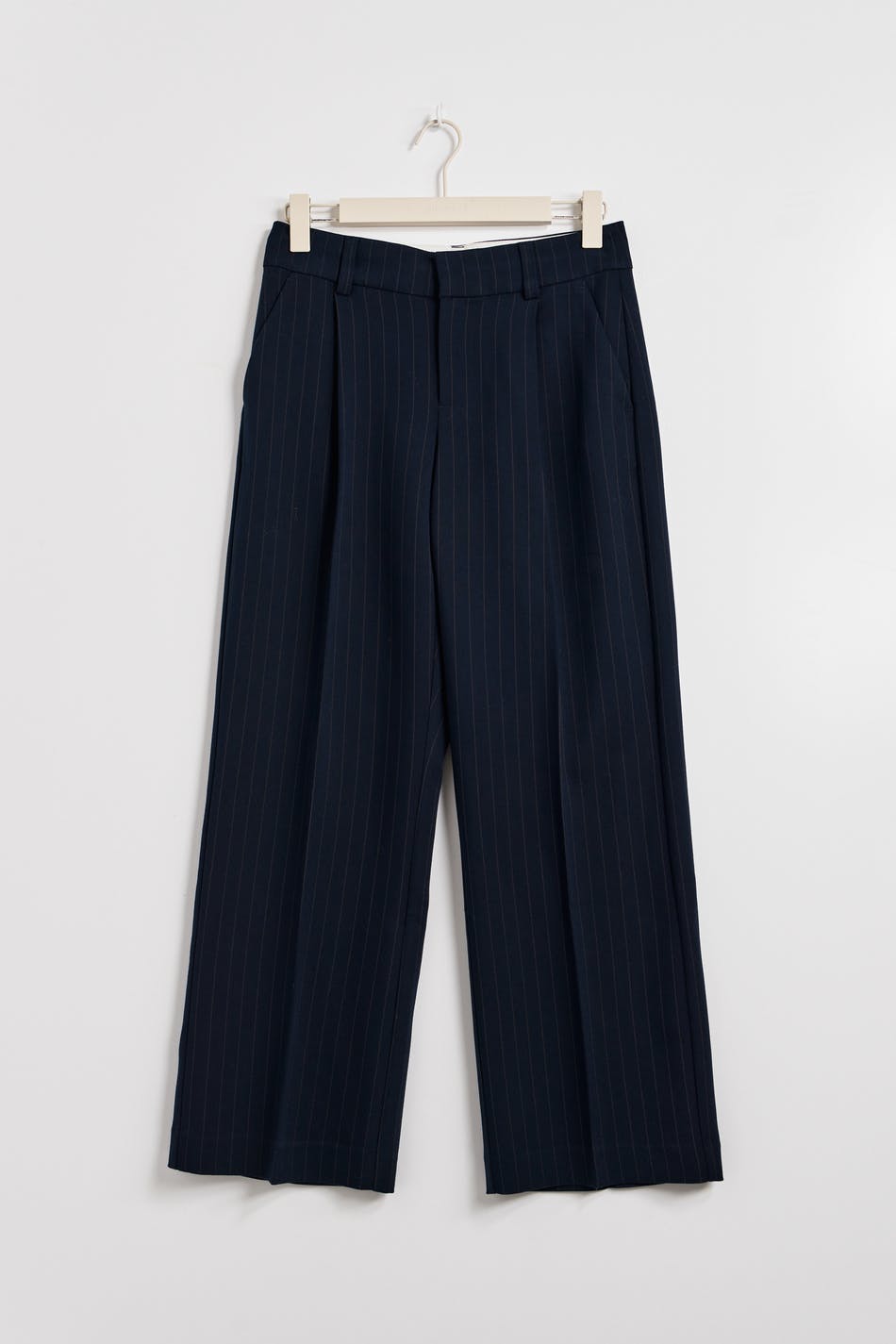 Petite suit trousers with creases at the front. The trousers are blue, pinstriped and straight. They have mid waist, straight legs, side pockets and slit pockets at the back. Perfect for those who are 160 cm (5 ft 3 in.) or shorter.