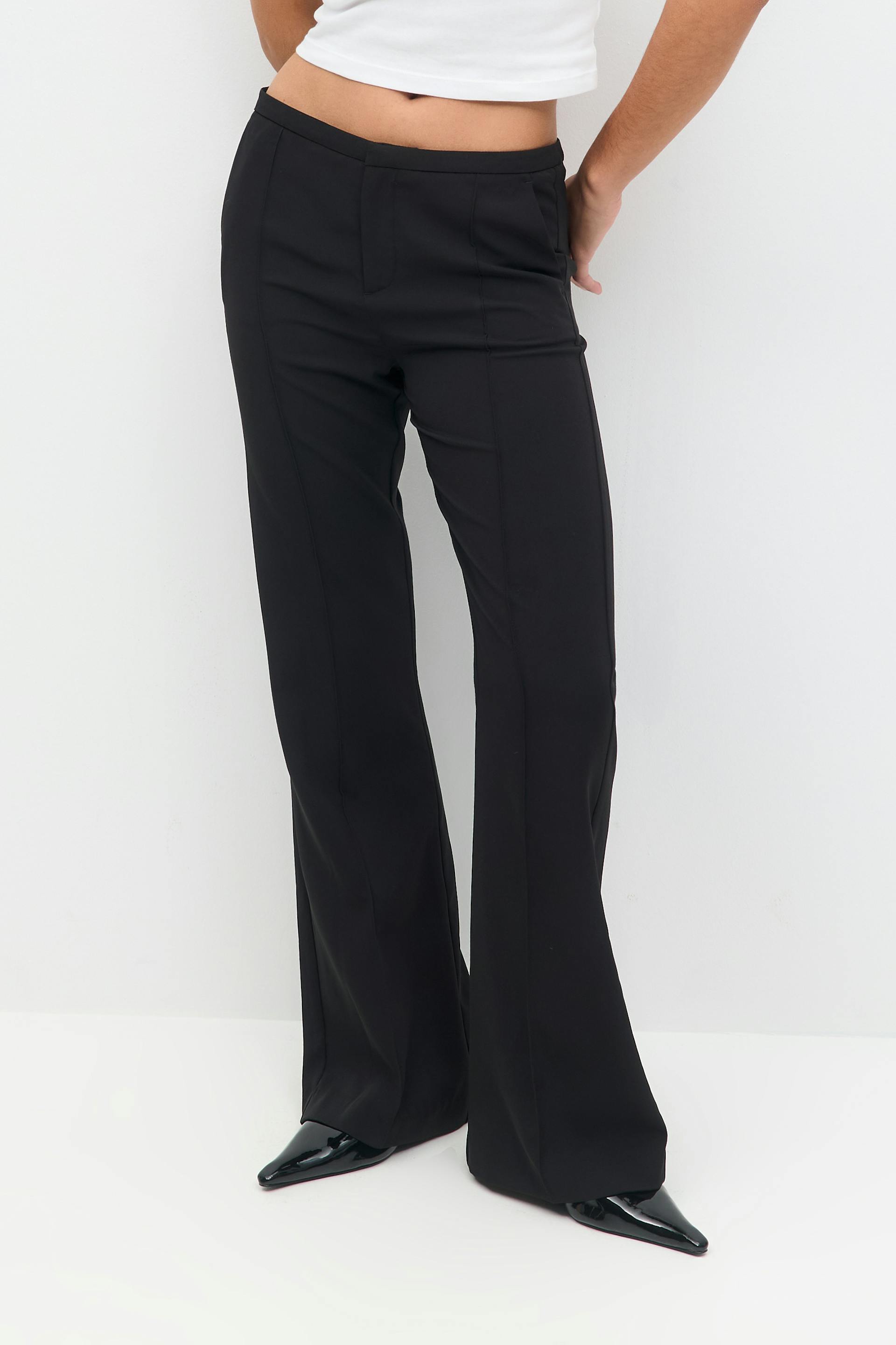 Flared suit trousers with creases at the front. The trousers are black and have pockets in the sides. They have zip fly, hook-and-eye closure and back pocket.