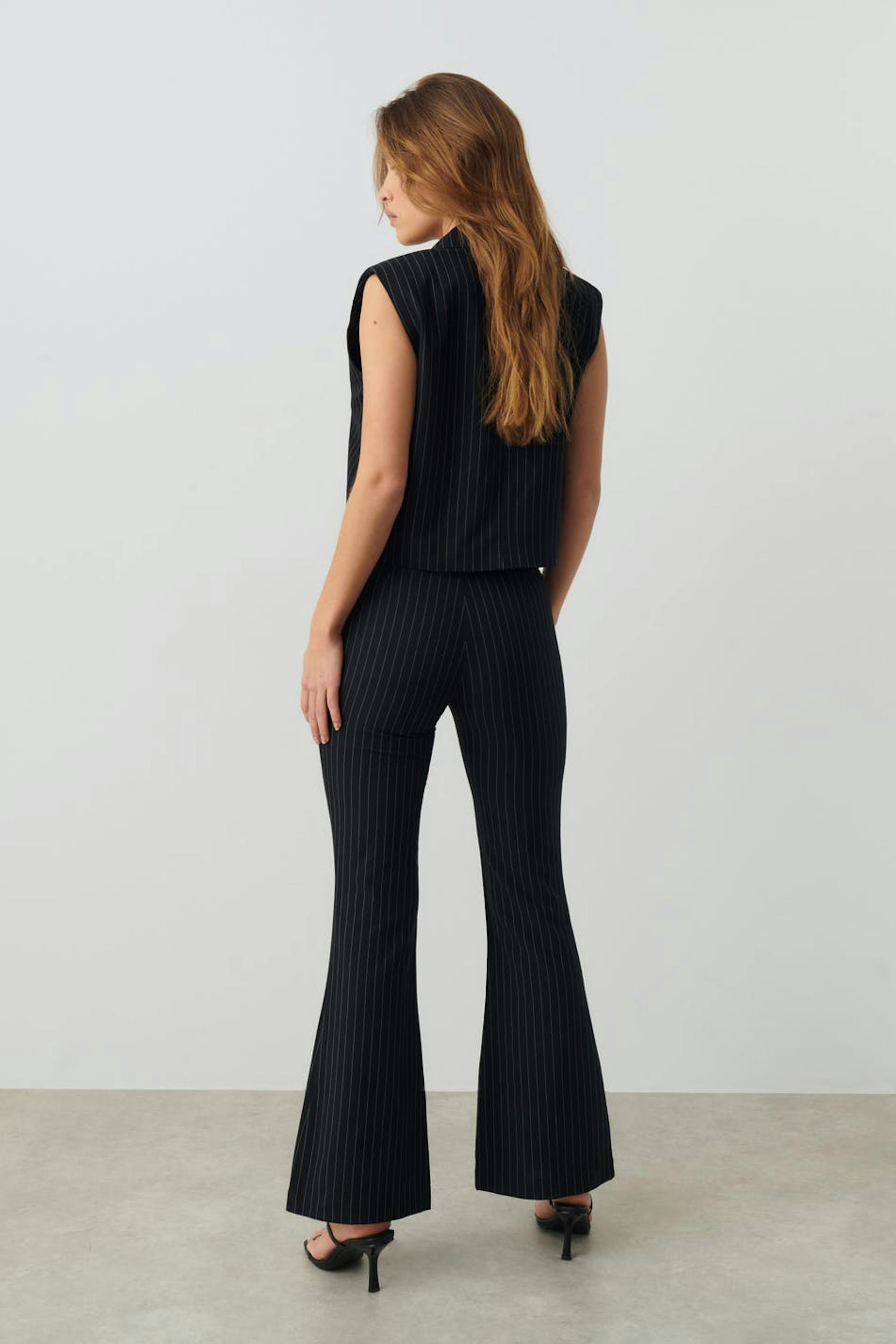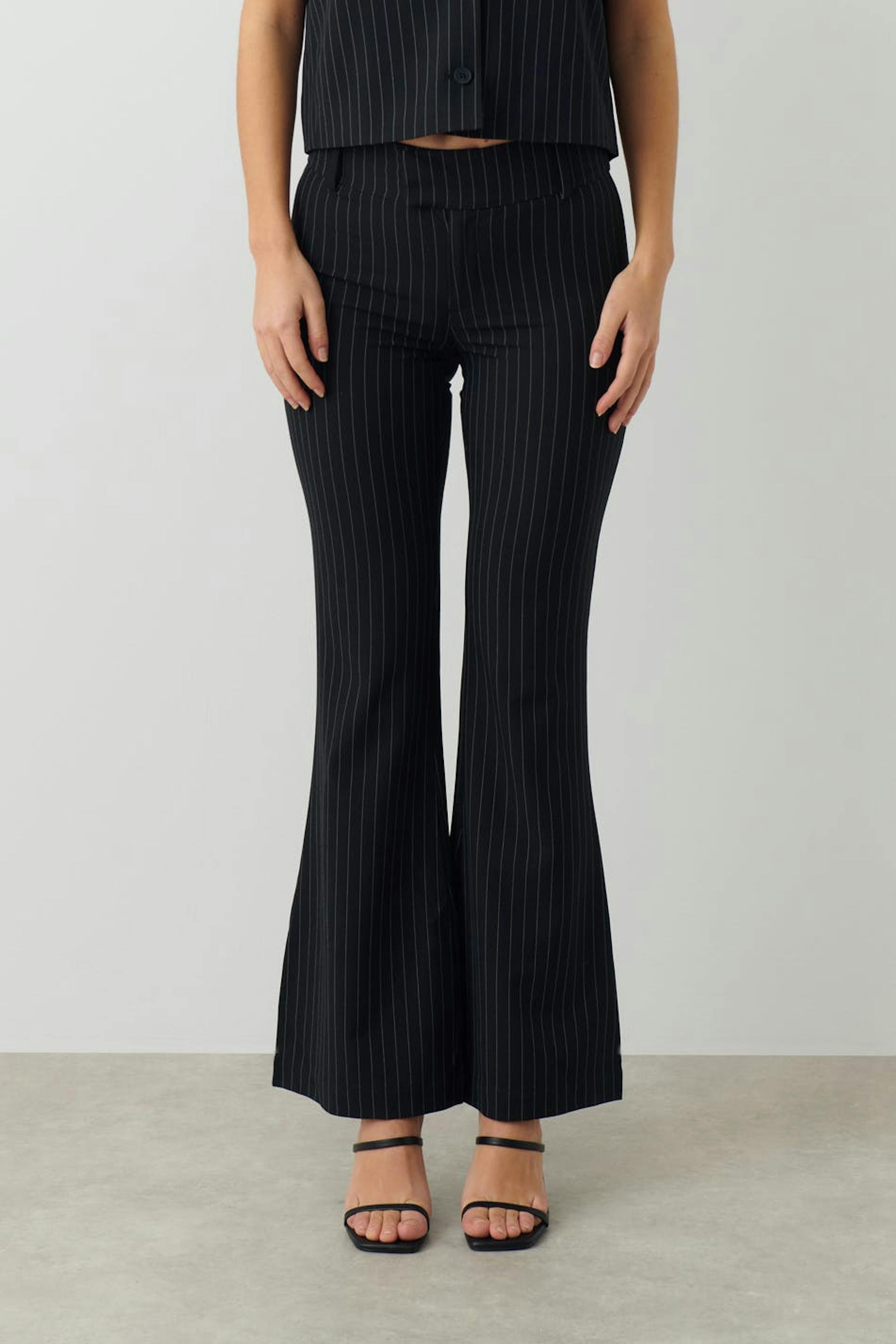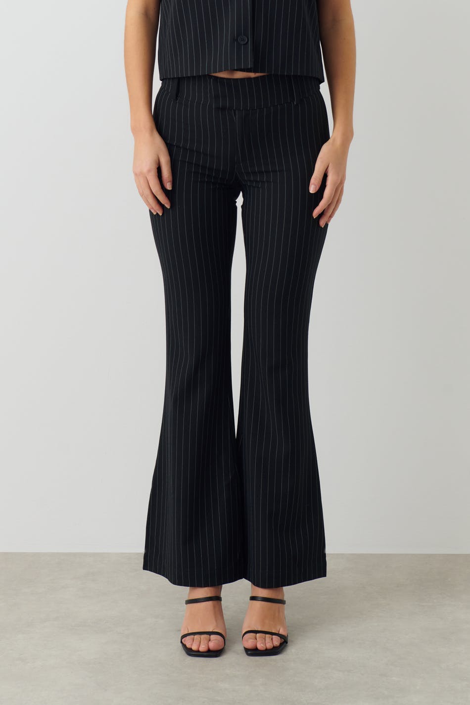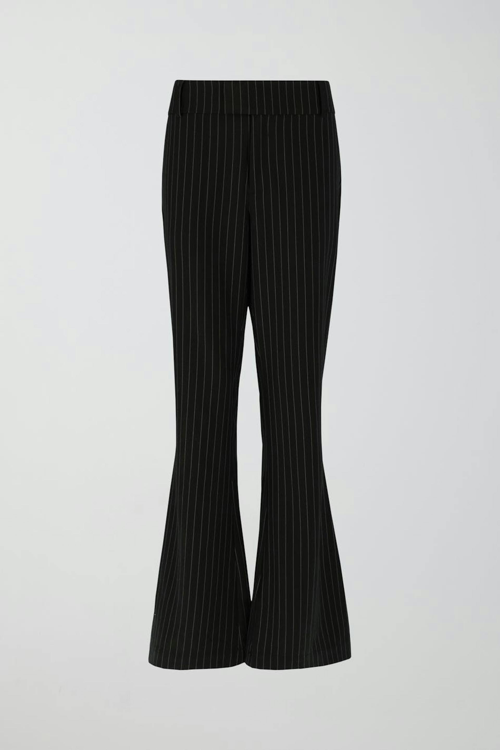 Pinstriped suit trousers with flared legs. The trousers are black and have mid waist. They have zip fly with hook-and-eye closure and broad waistband with belt loops.