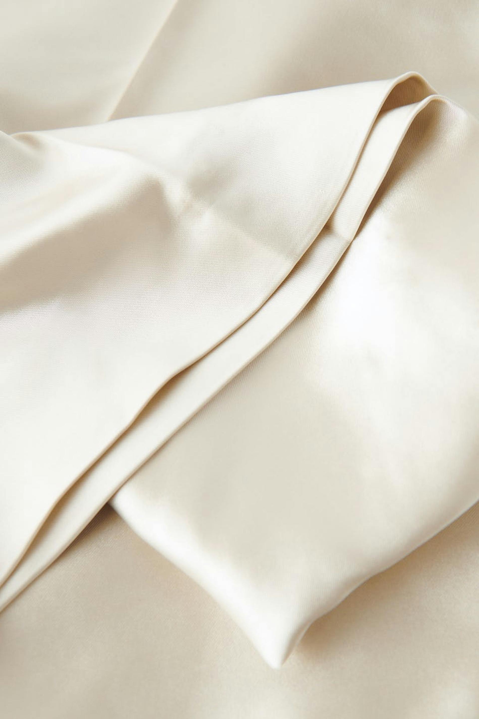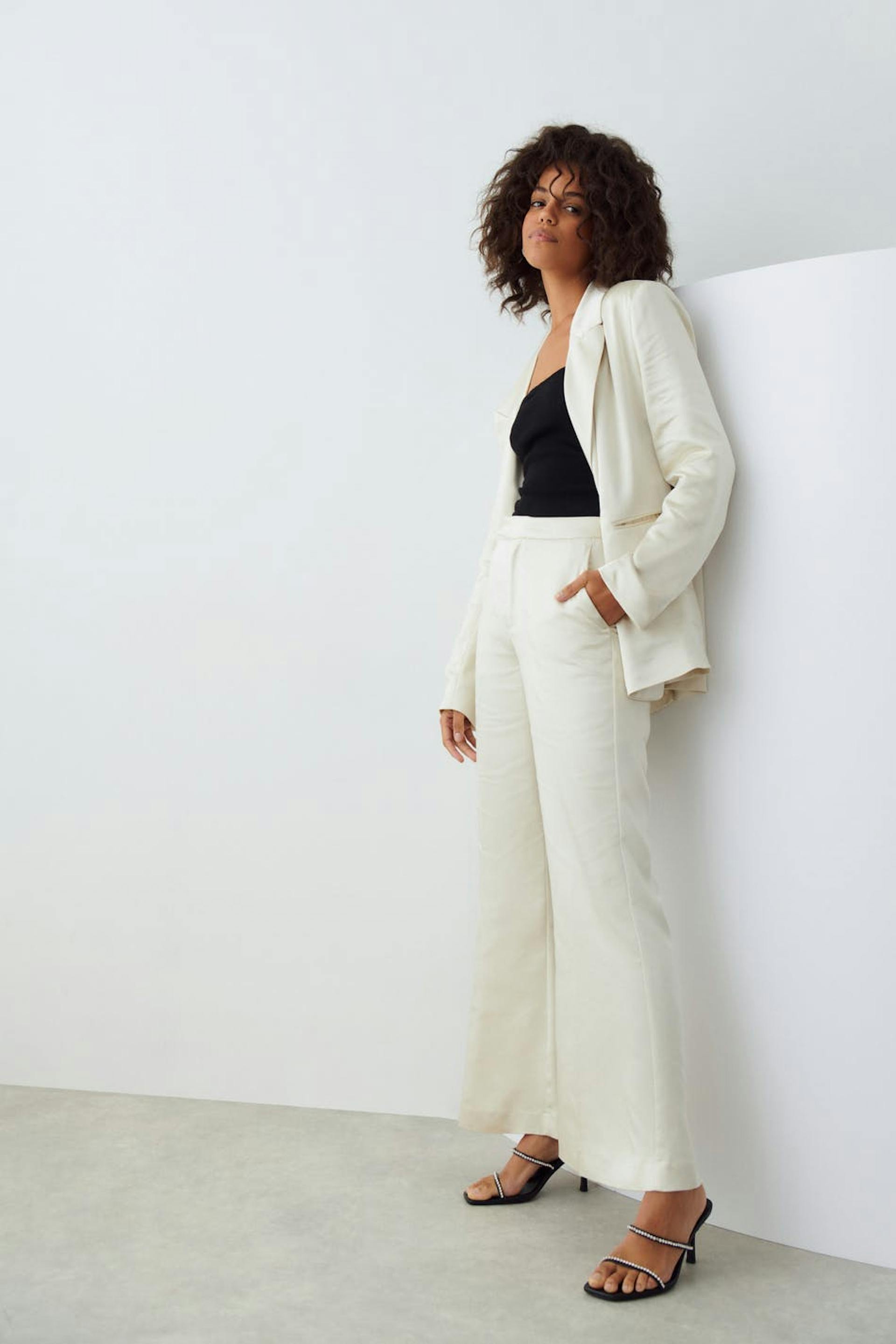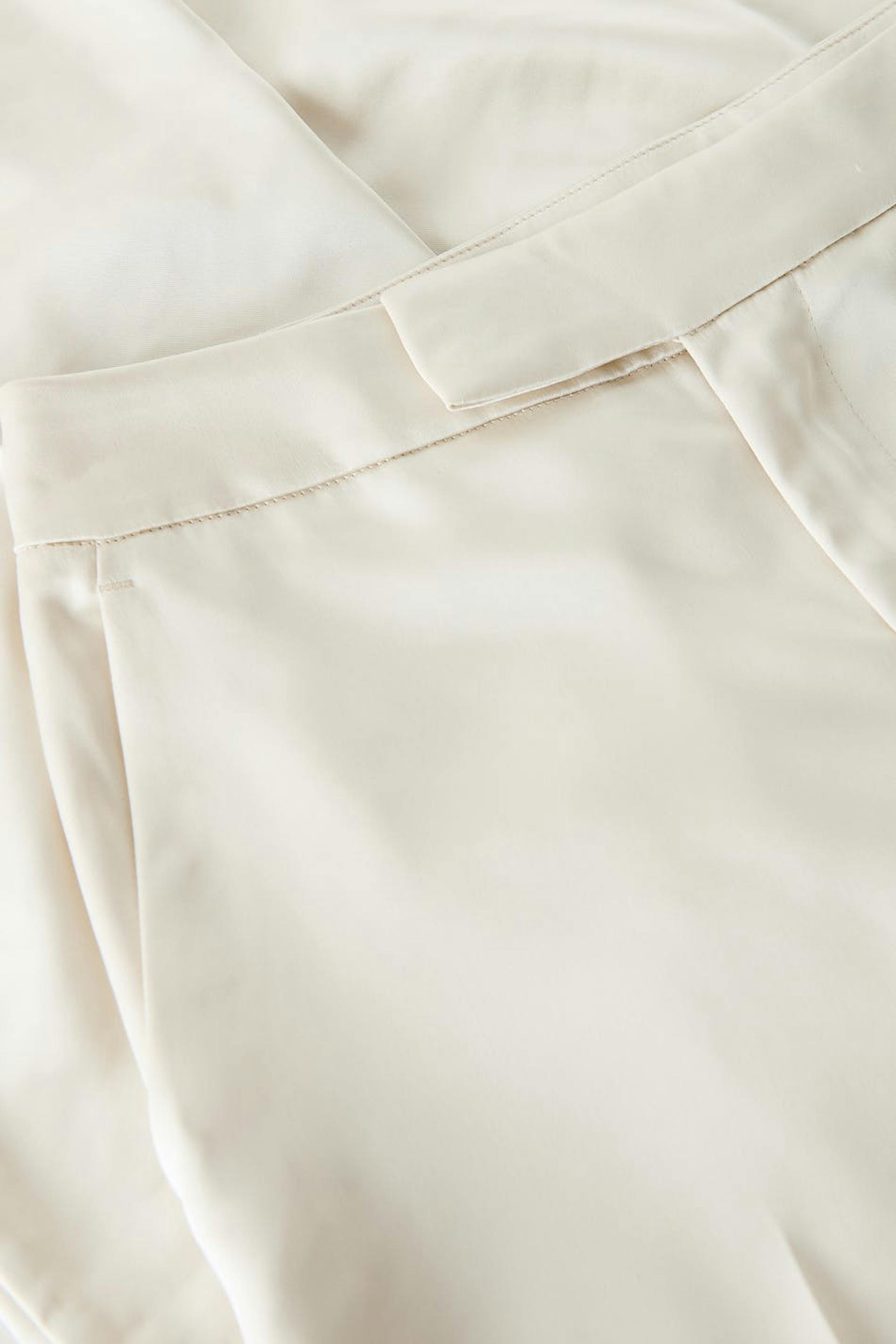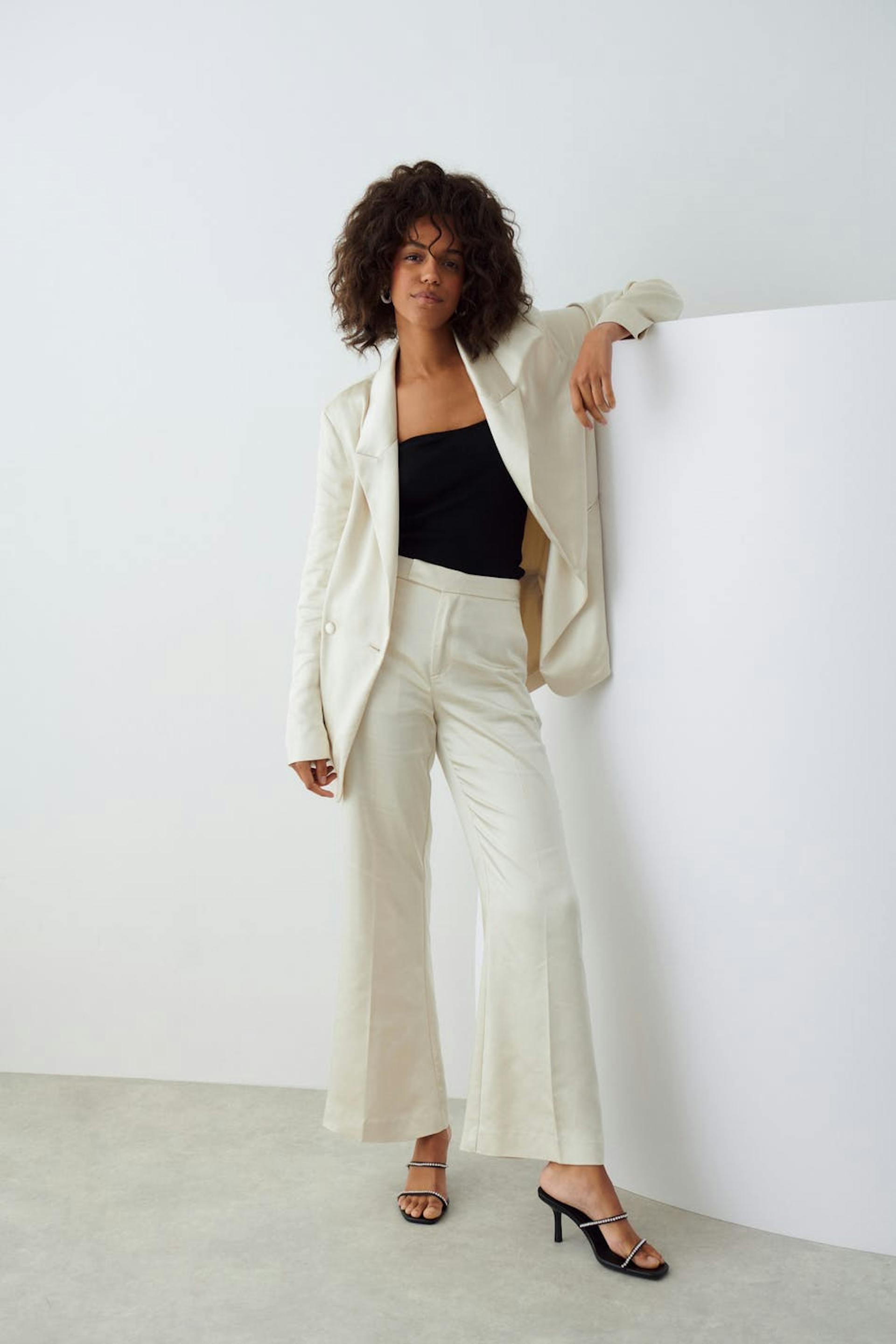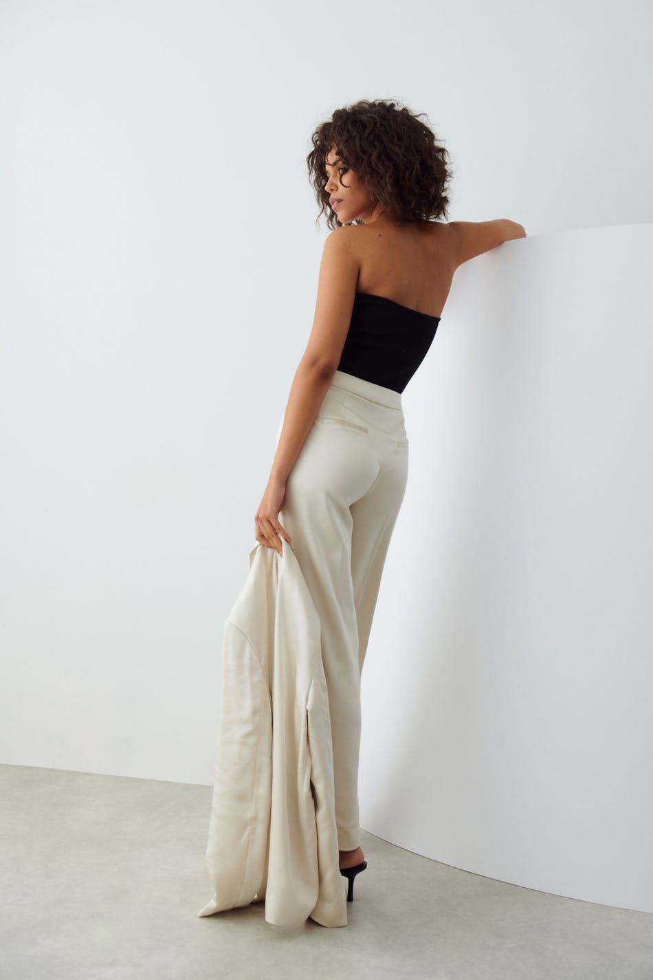 Suit trousers in satin with flared legs. The trousers are beige and have zip fly with concealed button. They have side pockets, slit pockets at the back, waistband with belt loops and long leg length.