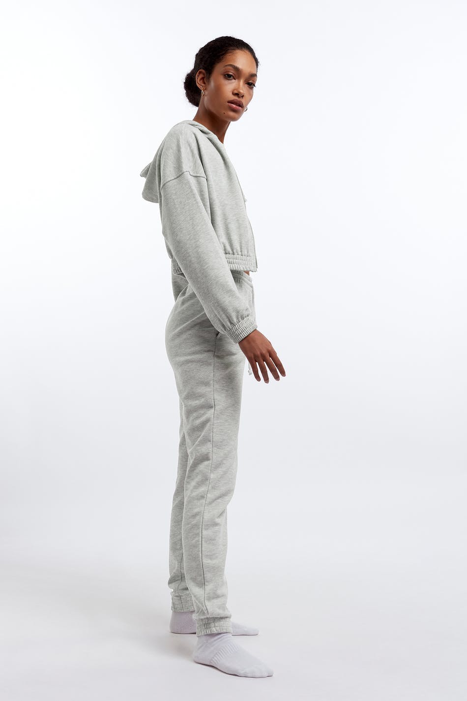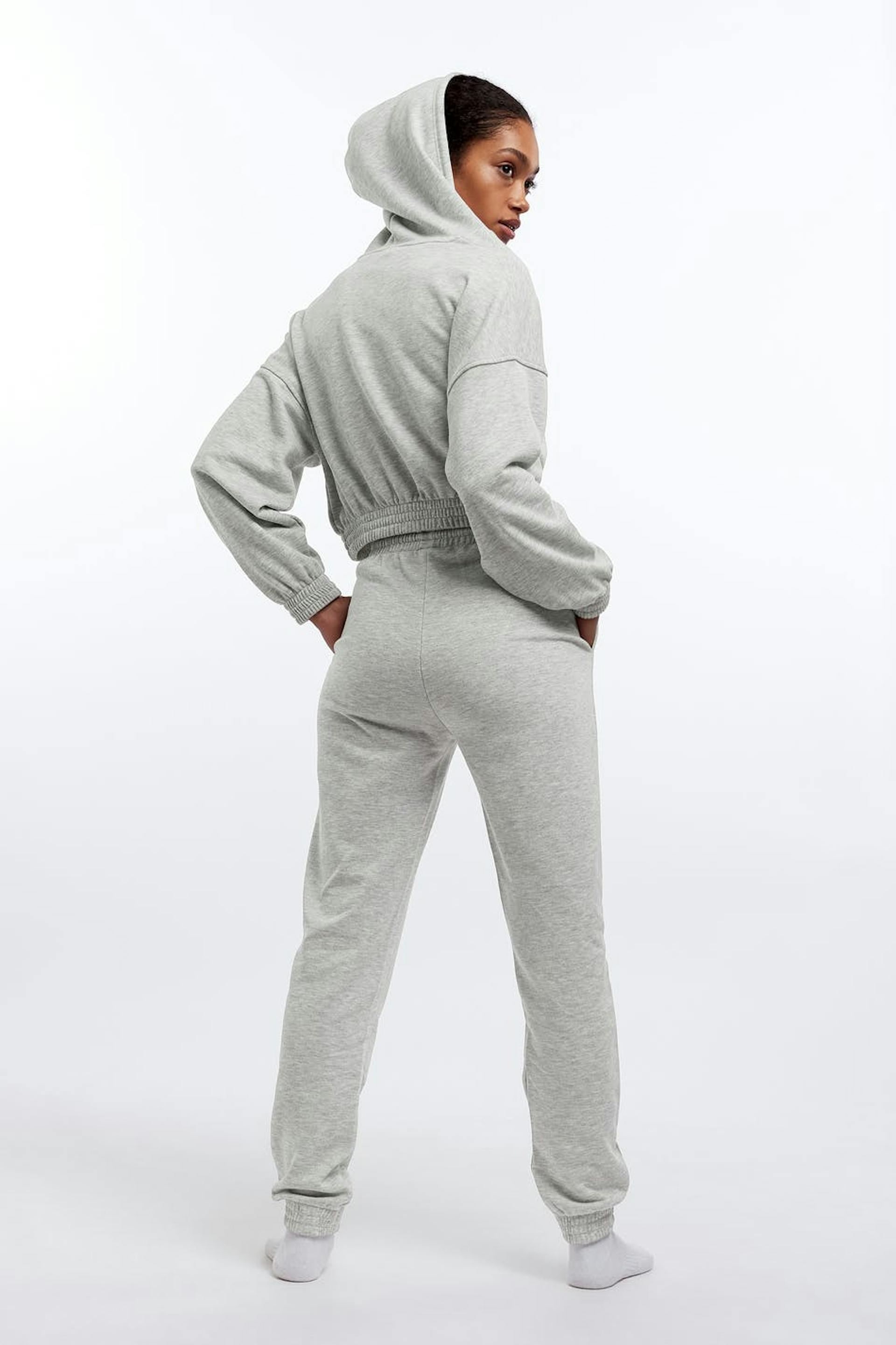 Tracksuit trousers with a regular fit. The trousers are grey and have an elastic band at the waist and at the end of the legs. They are made of jersey.
