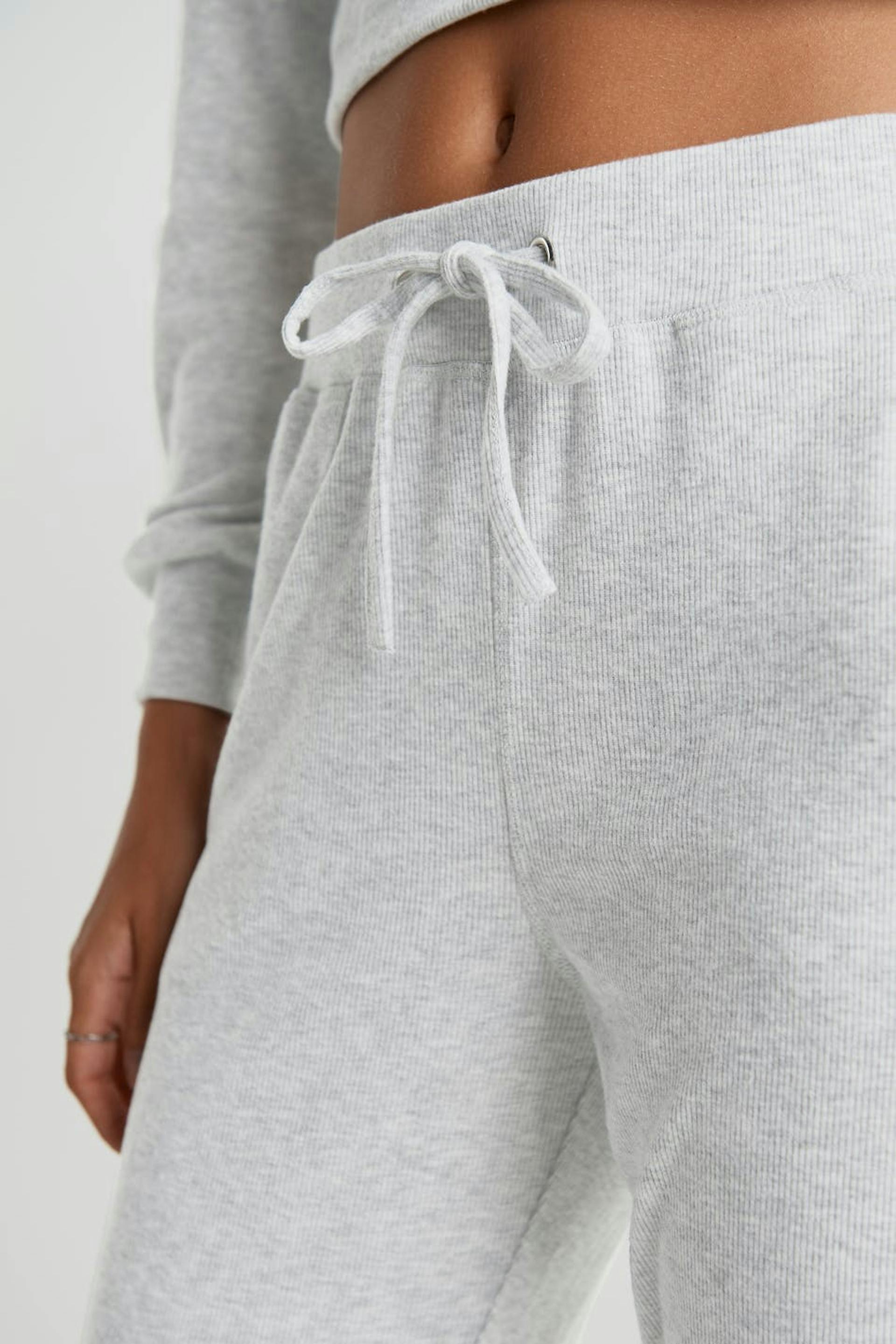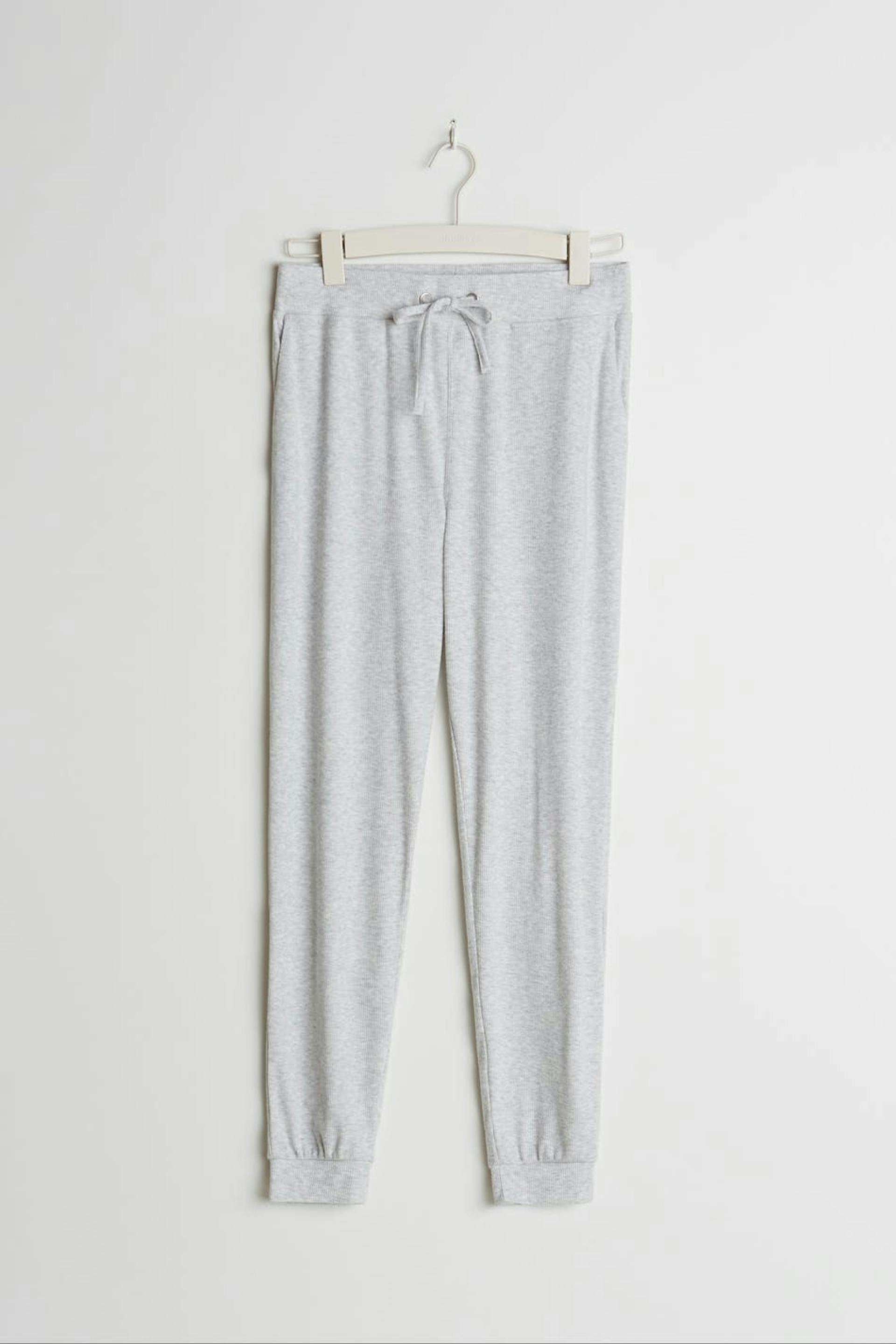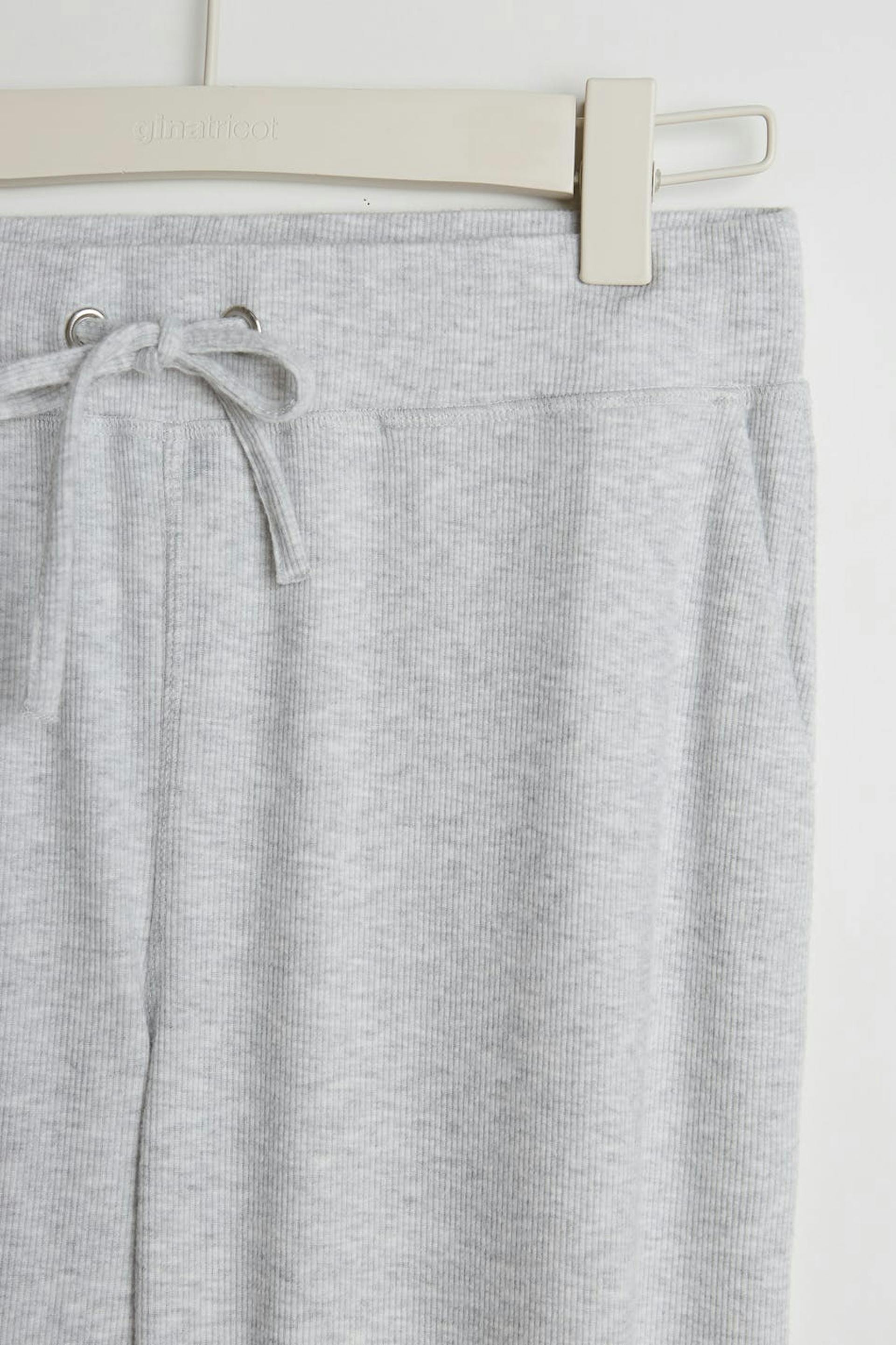 Ribbed tracksuit trousers with a regular fit. The trousers are grey and smooth and have a cuff at the end of the legs. They have a waist in elastic with a drawstring.