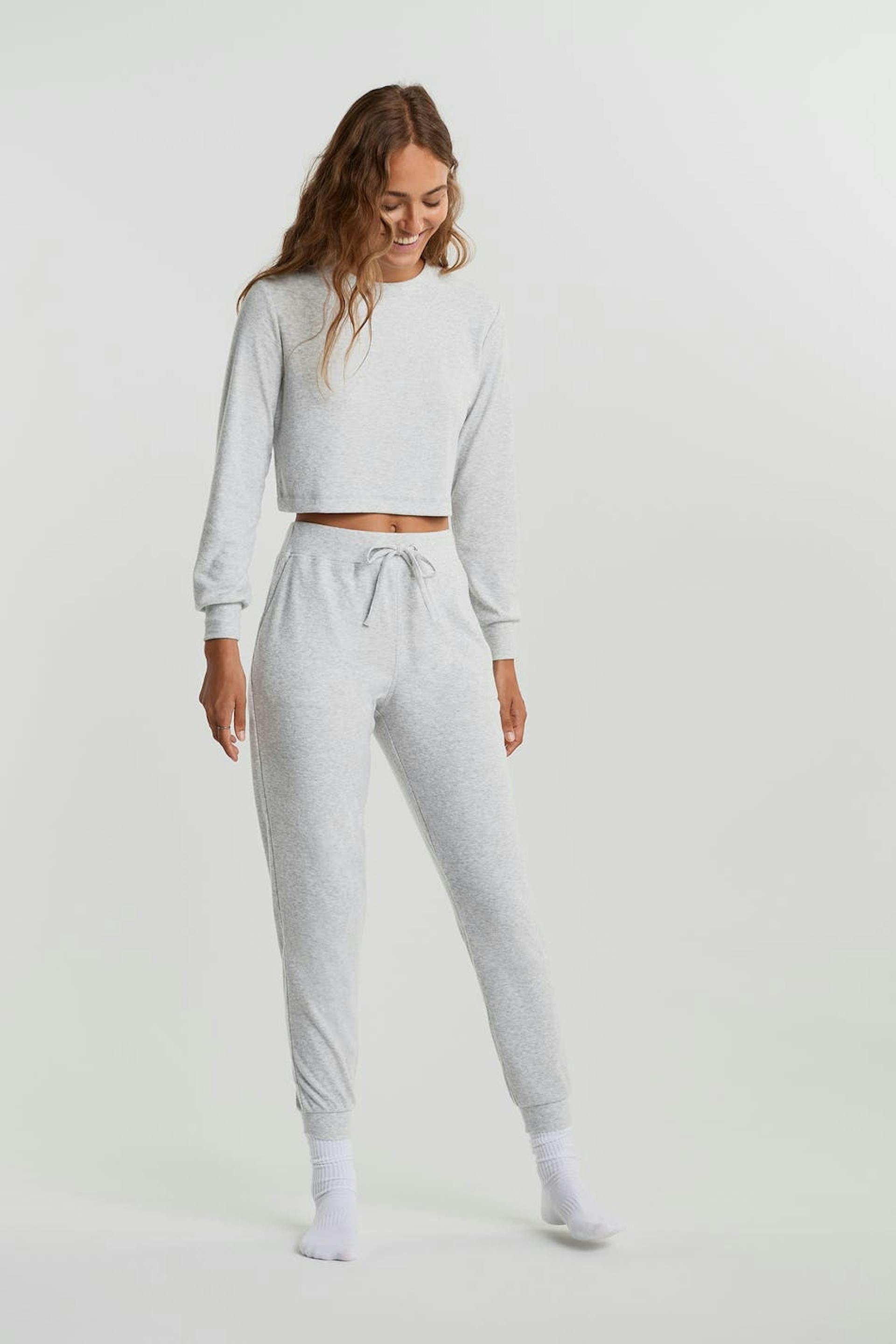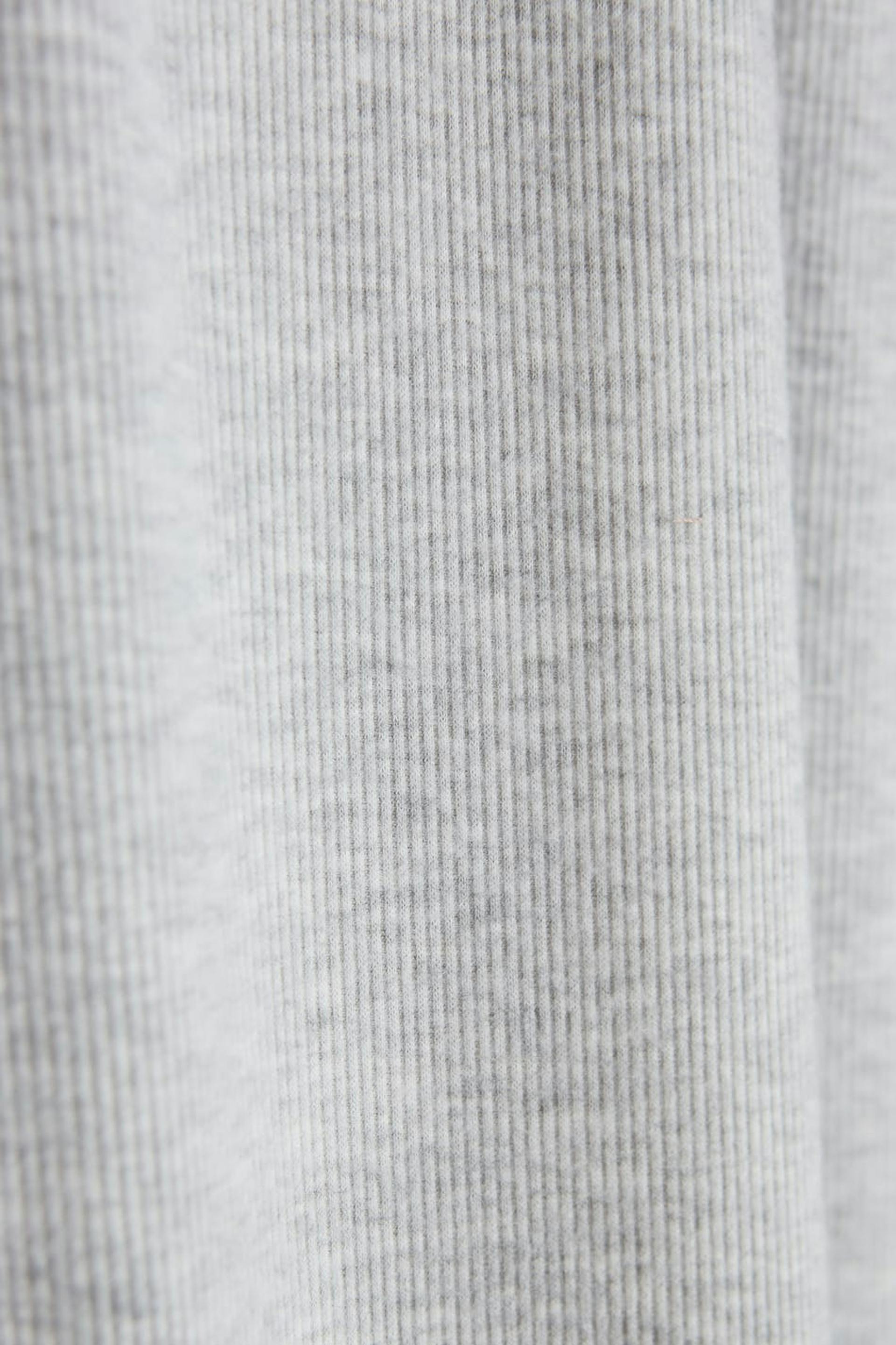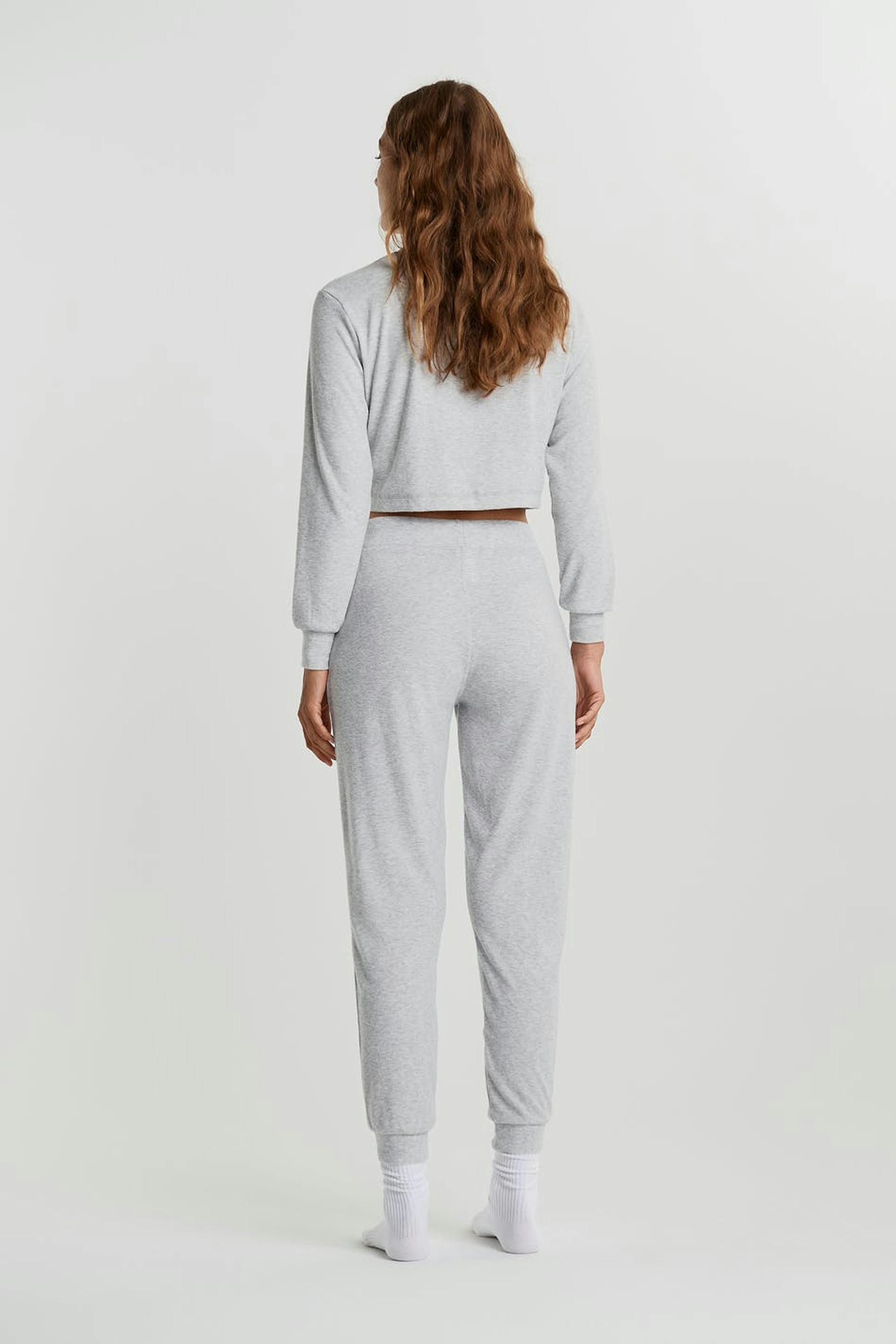 Ribbed tracksuit trousers with a regular fit. The trousers are grey and smooth and have a cuff at the end of the legs. They have a waist in elastic with a drawstring.