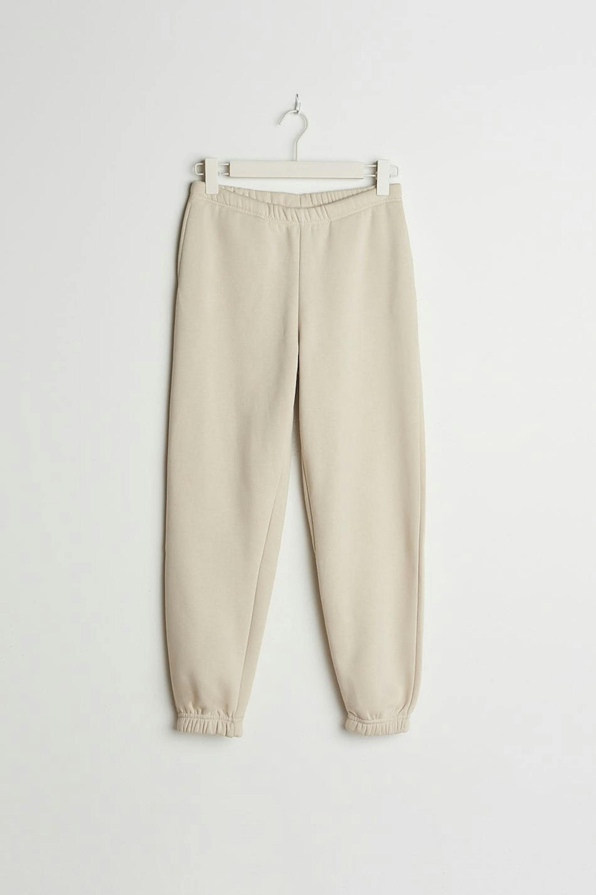 Petite tracksuit trousers with a regular fit. The trousers are beige and have elastic straps at the waist and at the end of the legs. Perfect for those who are 160 cm (5 ft 3 in.) or shorter.