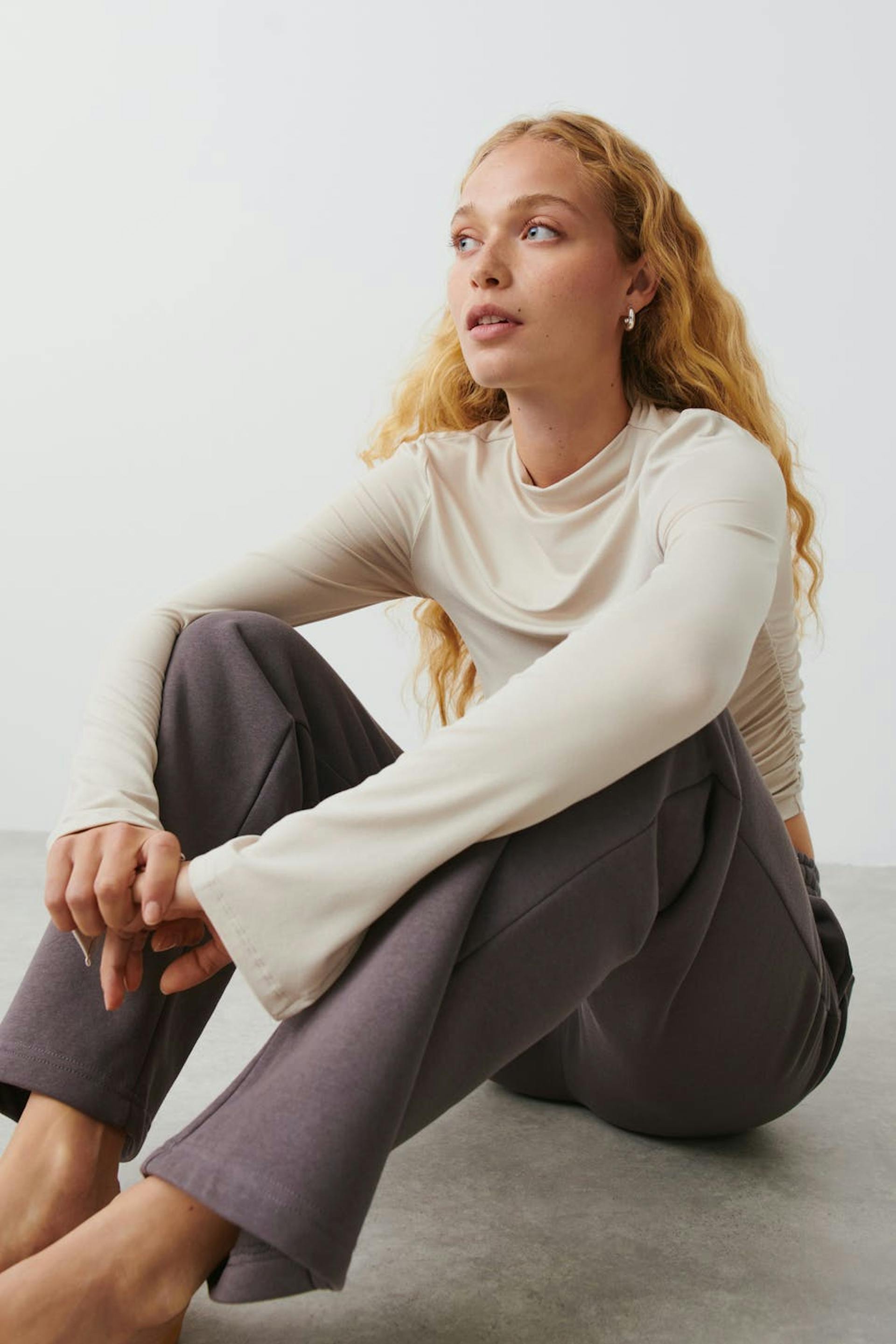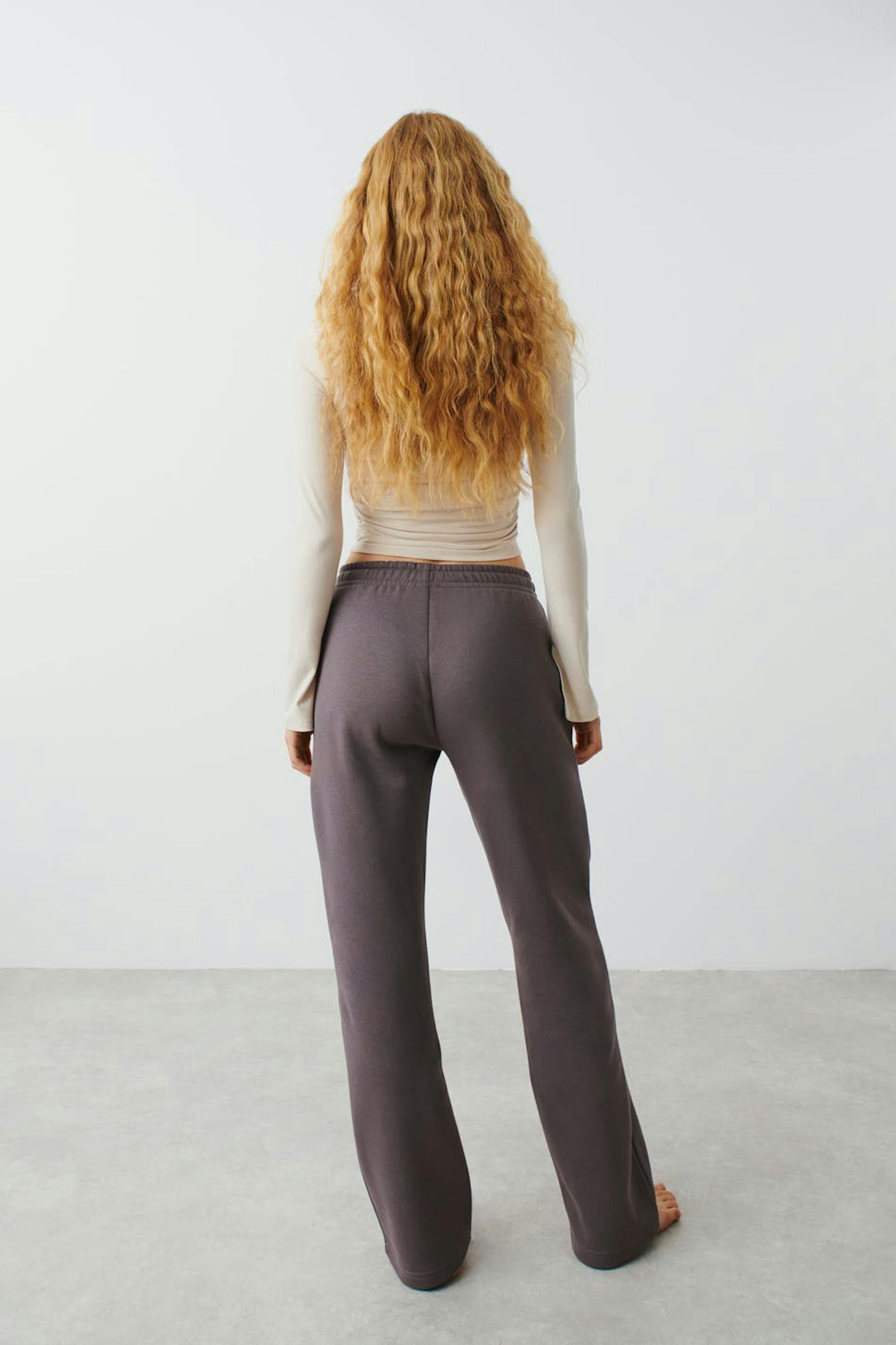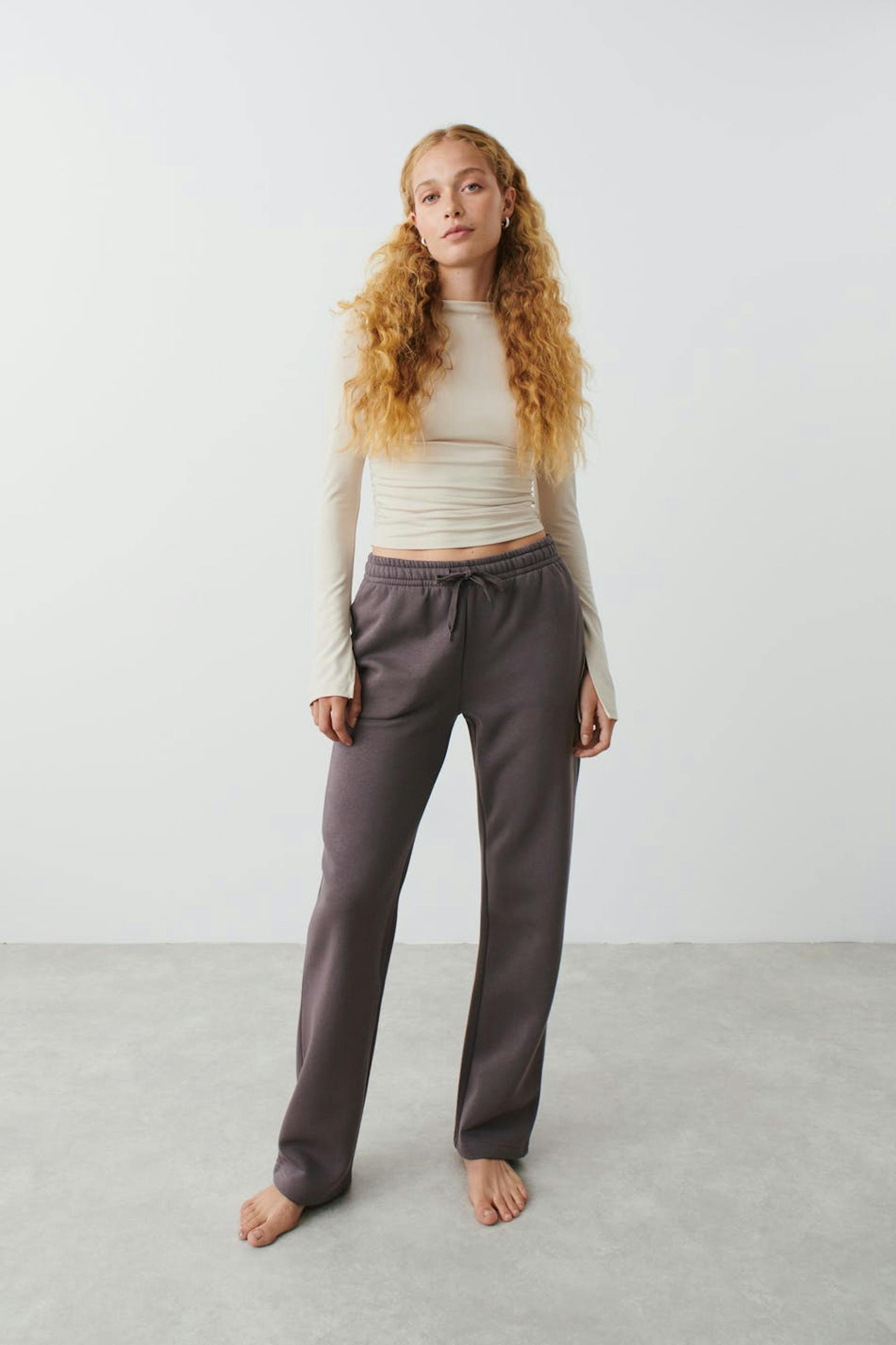 Tracksuit trousers with normal fit. The trousers are grey and have pockets in the sides. They have straight legs and elastic at the waist with self-tie at the front.