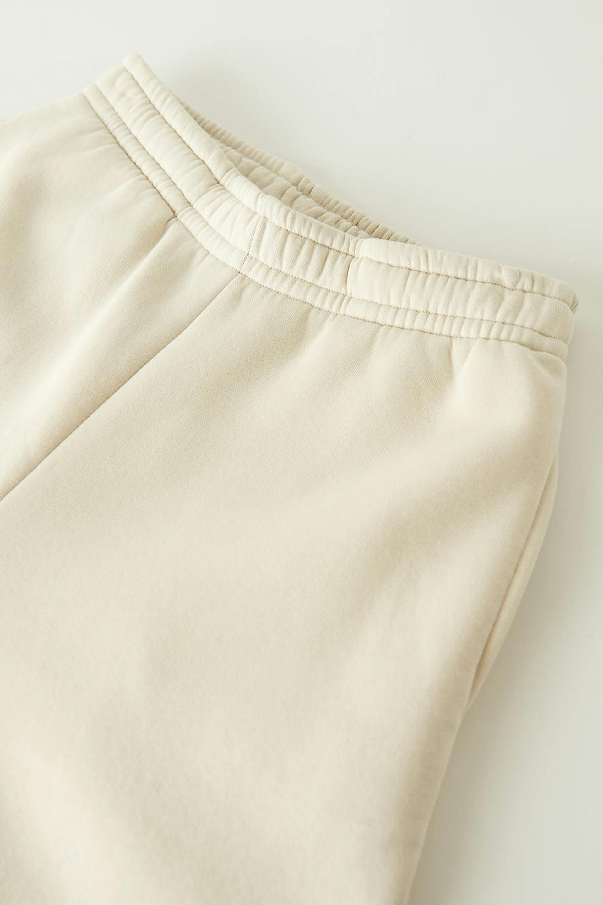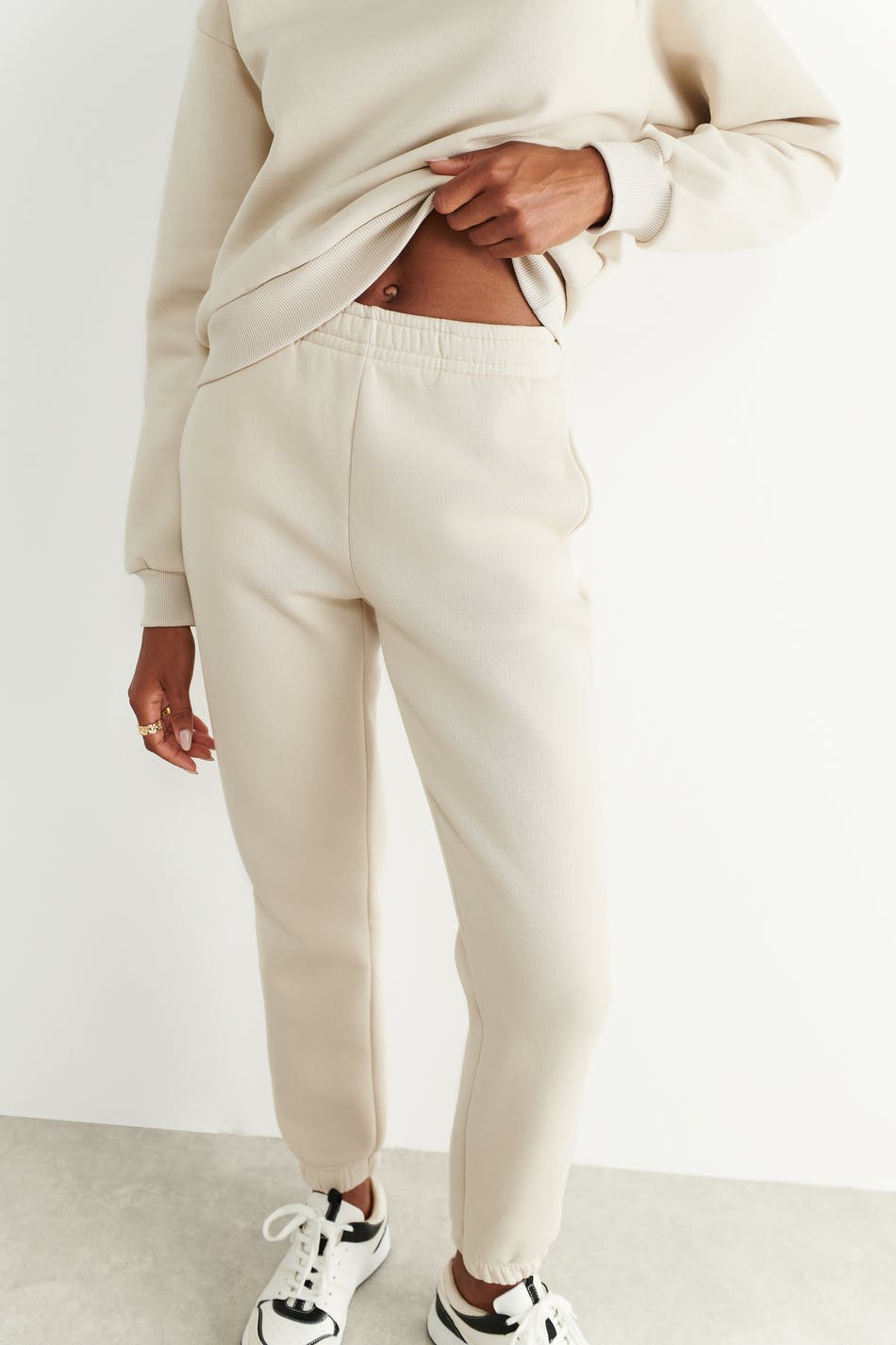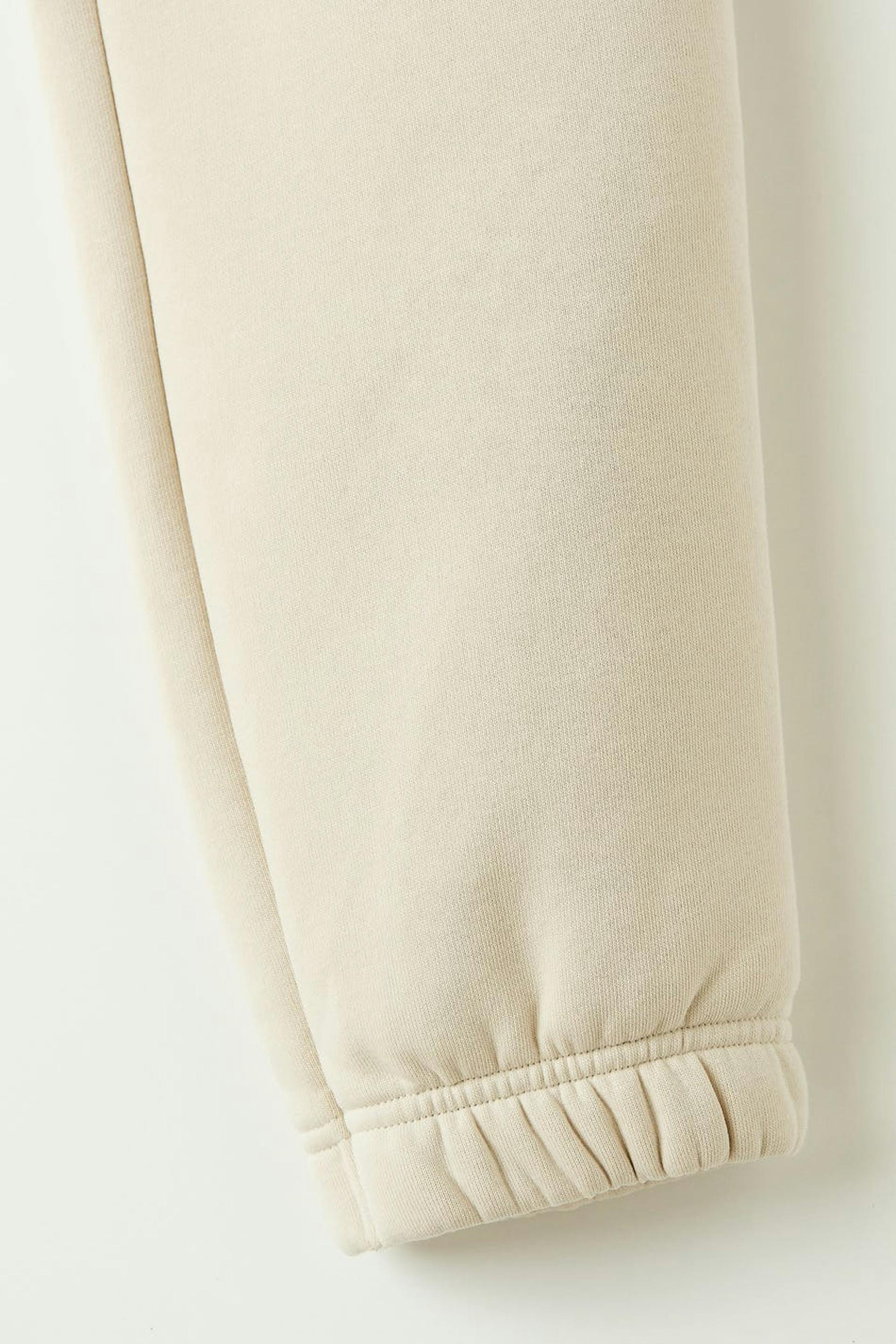 Tracksuit trousers with normal fit. The trousers are beige and have pockets on the sides. They have an elastic band at the waist and at the end of the legs.