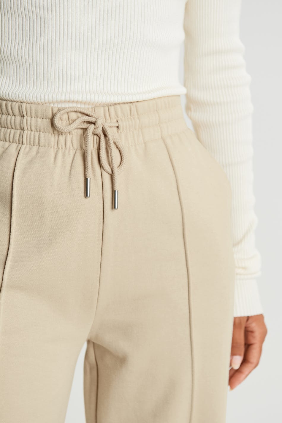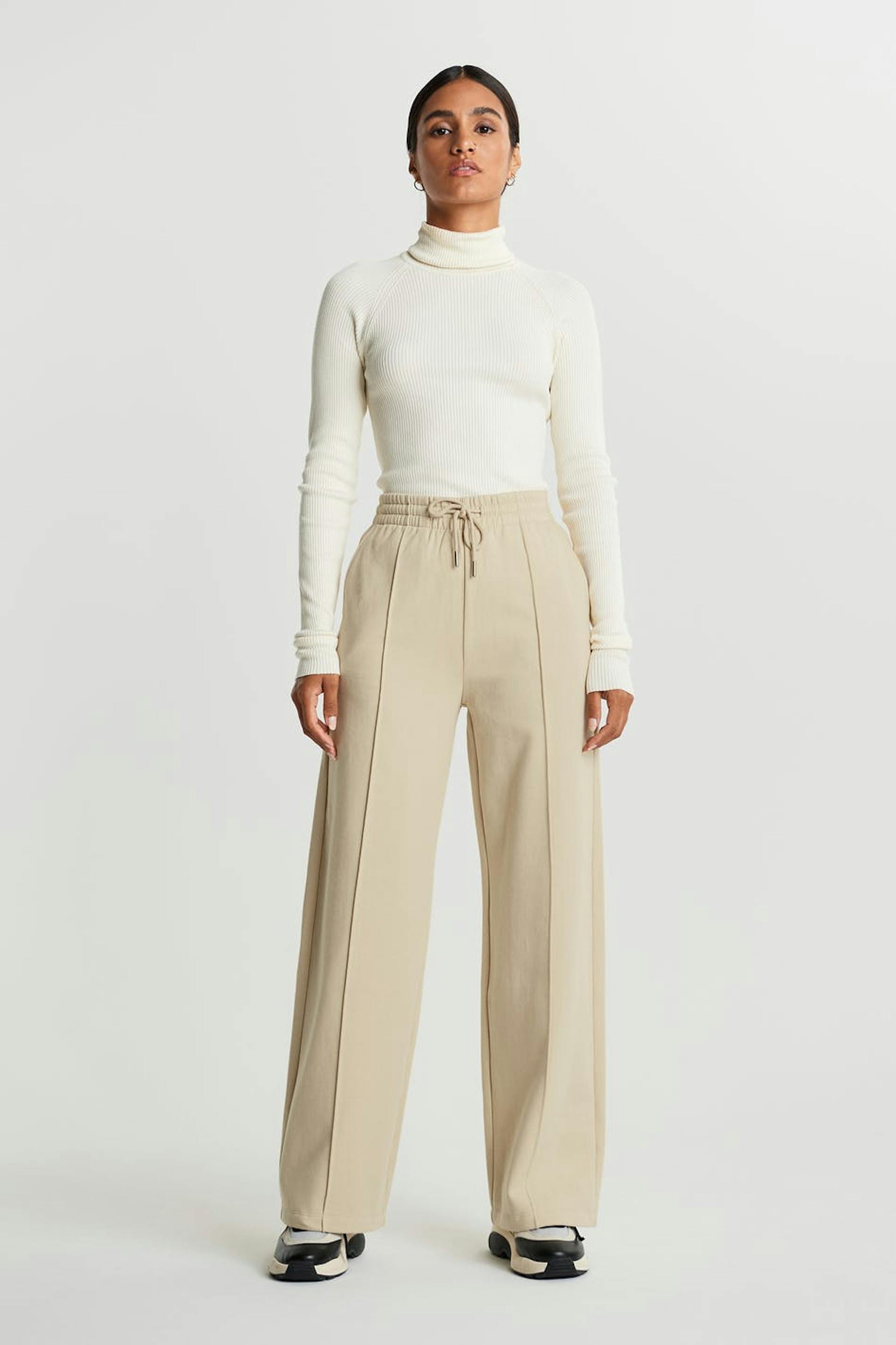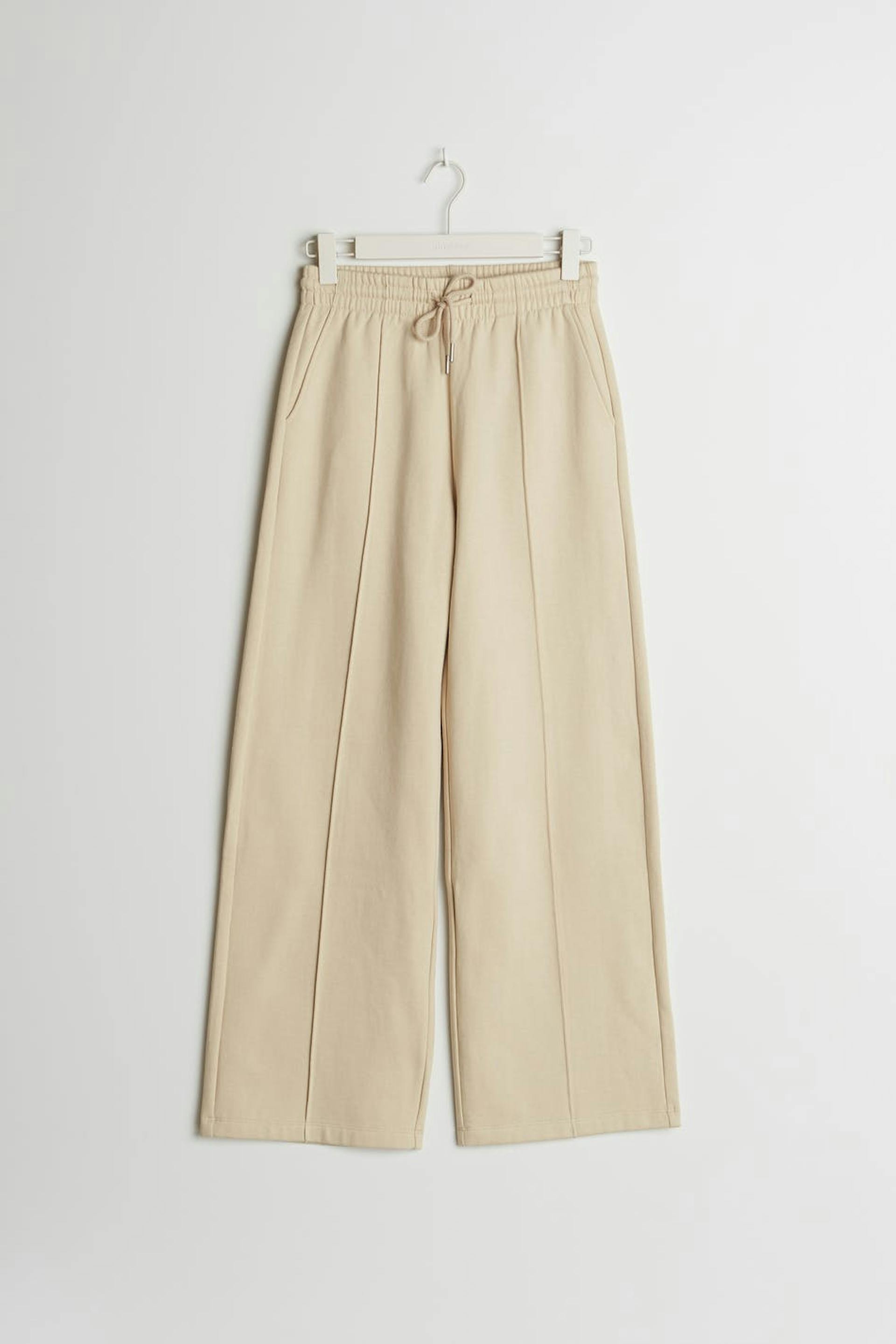 Tracksuit trousers with a regular fit. The trousers are beige and have wide legs with seam details with a pleat down the front. They have a tie strap at the waist.