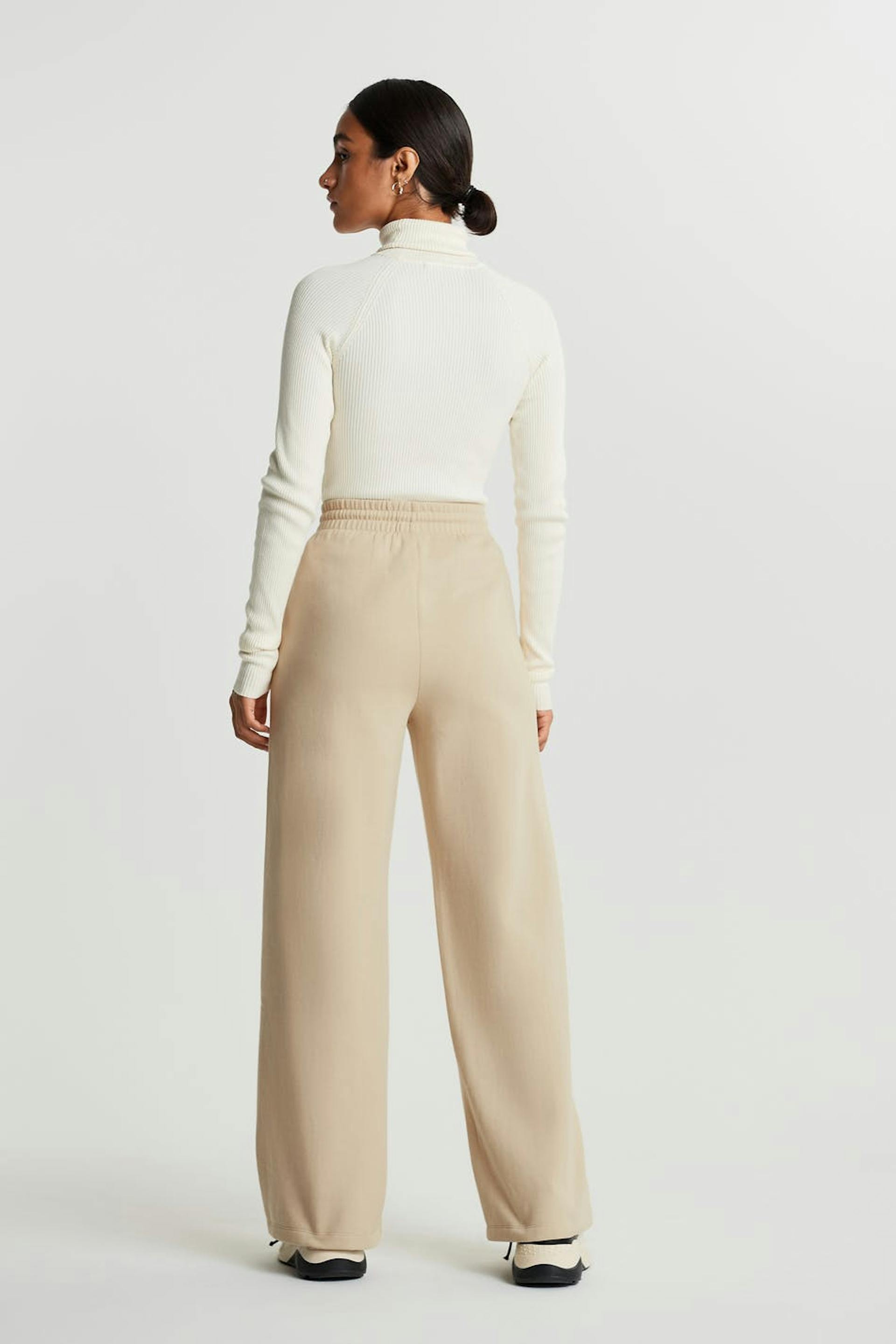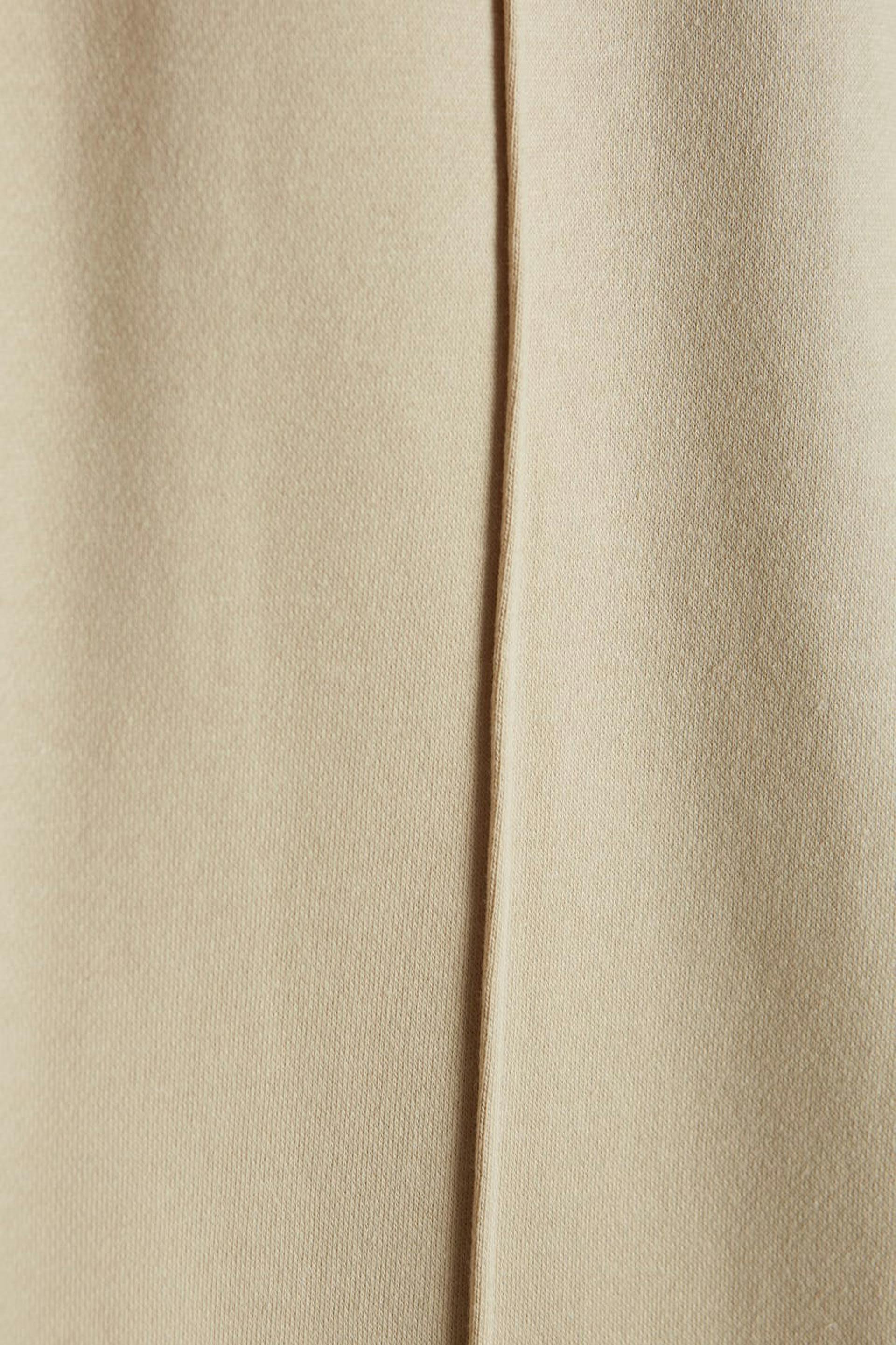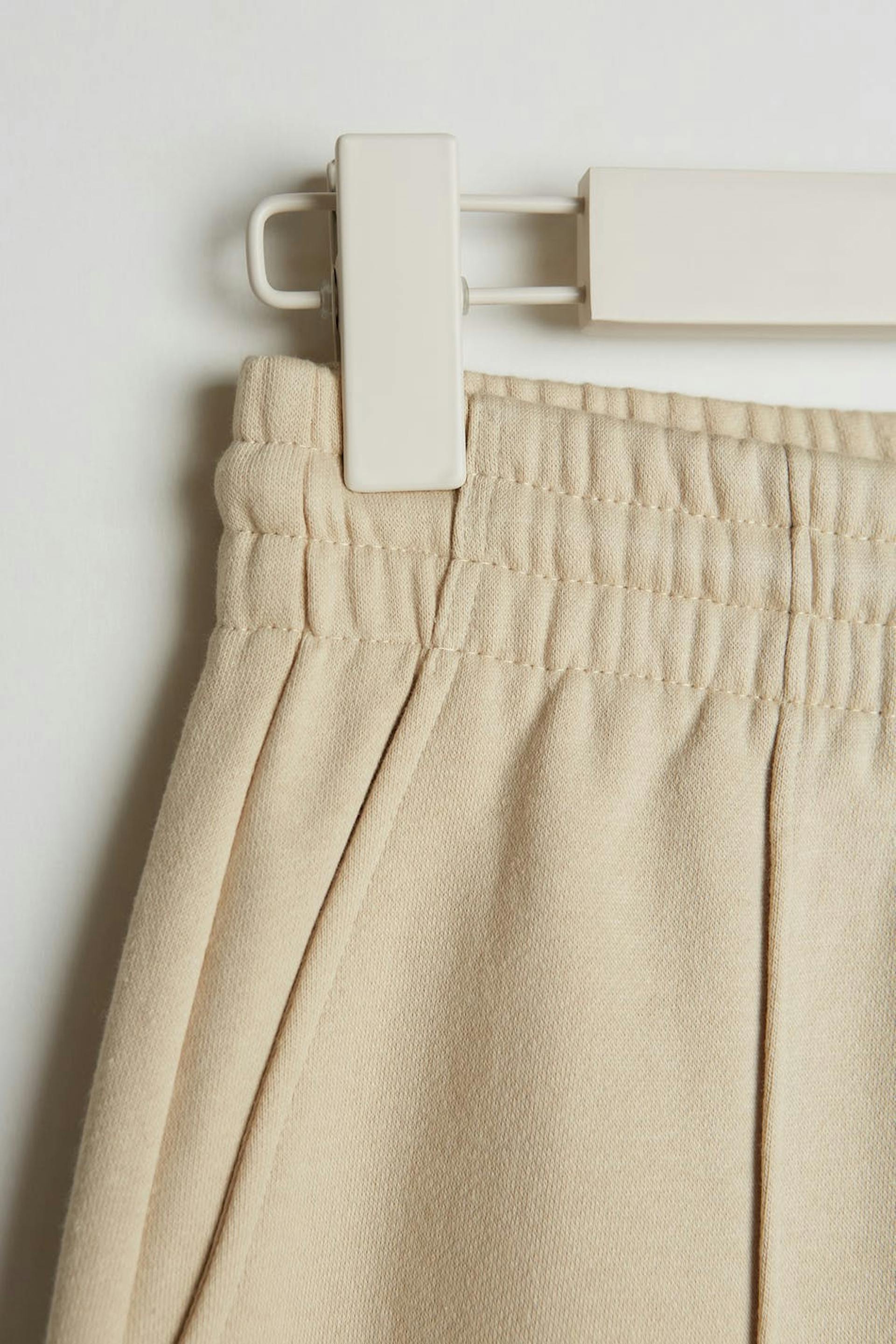 Tracksuit trousers with a regular fit. The trousers are beige and have wide legs with seam details with a pleat down the front. They have a tie strap at the waist.