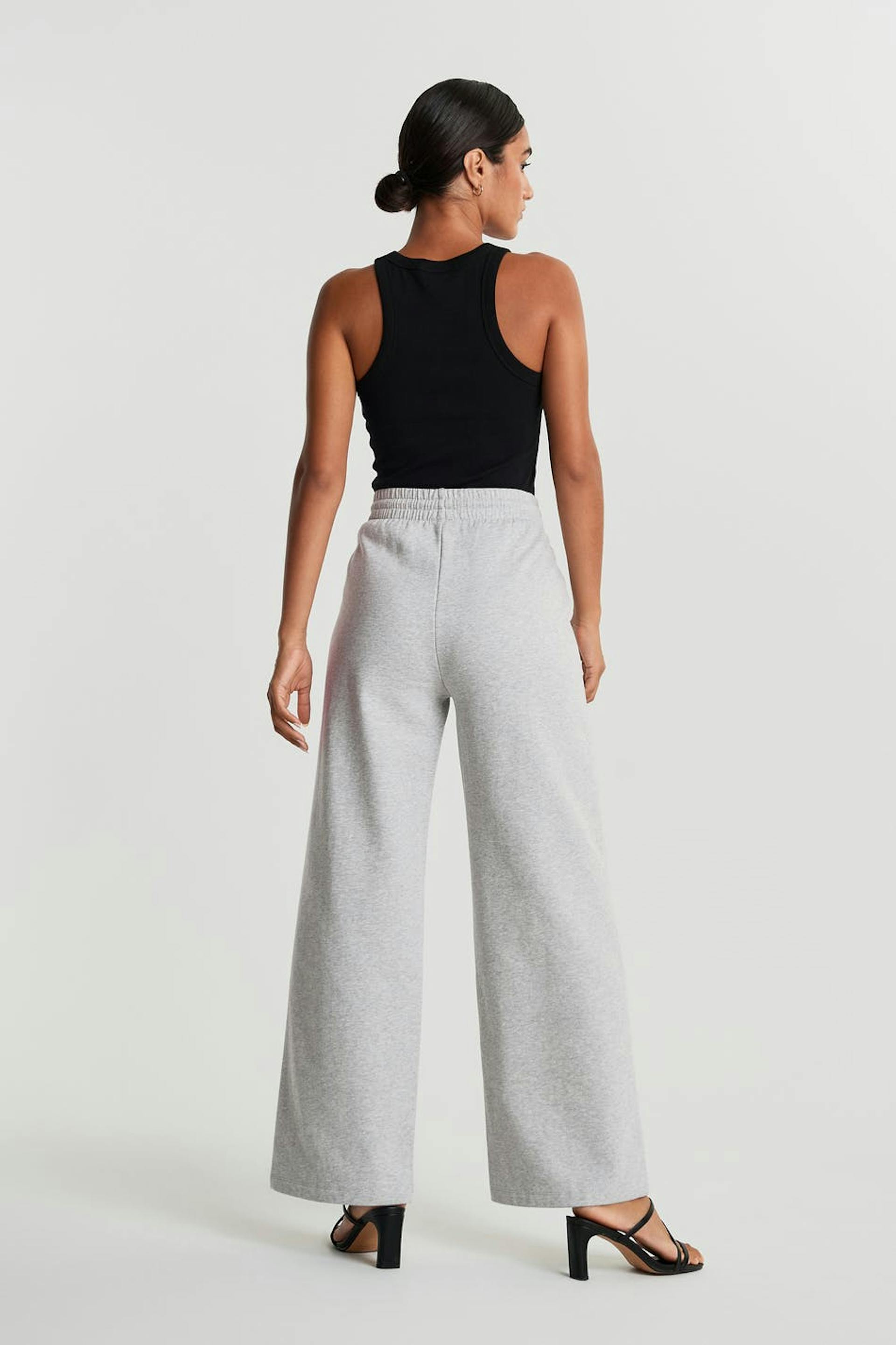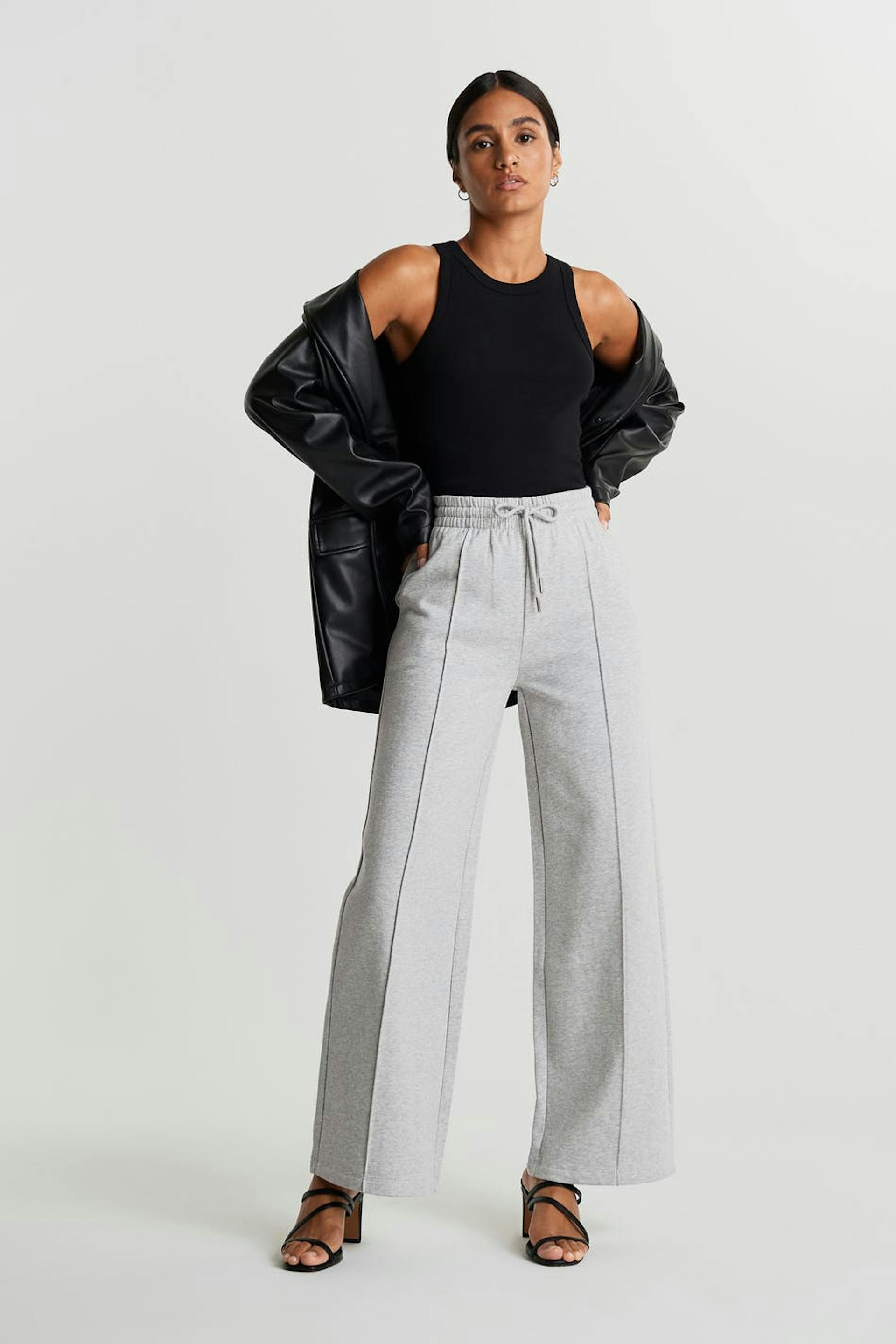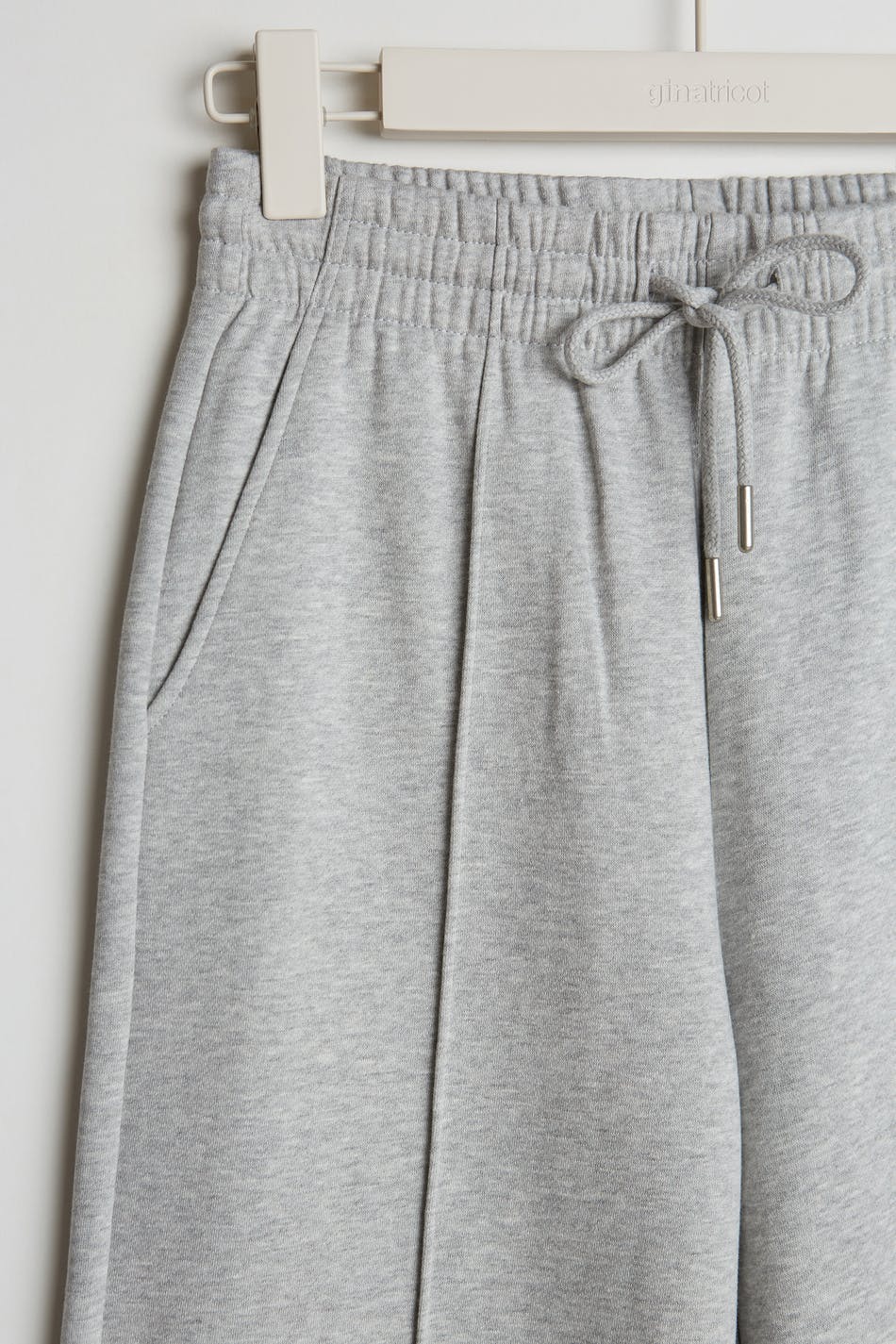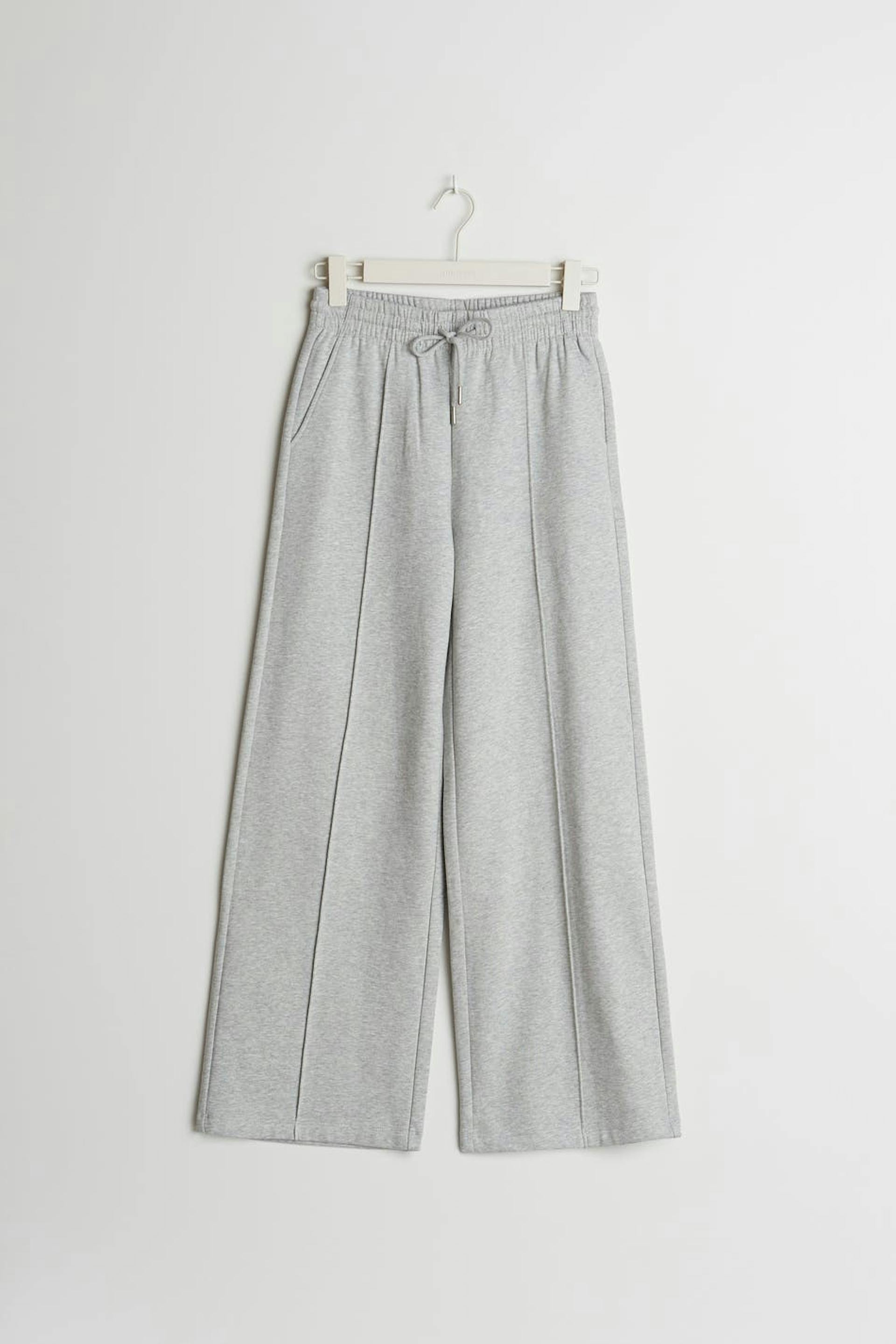 Tracksuit trousers with a regular fit. The trousers are grey and have wide legs with seam details with a pleat down the front. They have a tie strap at the waist.