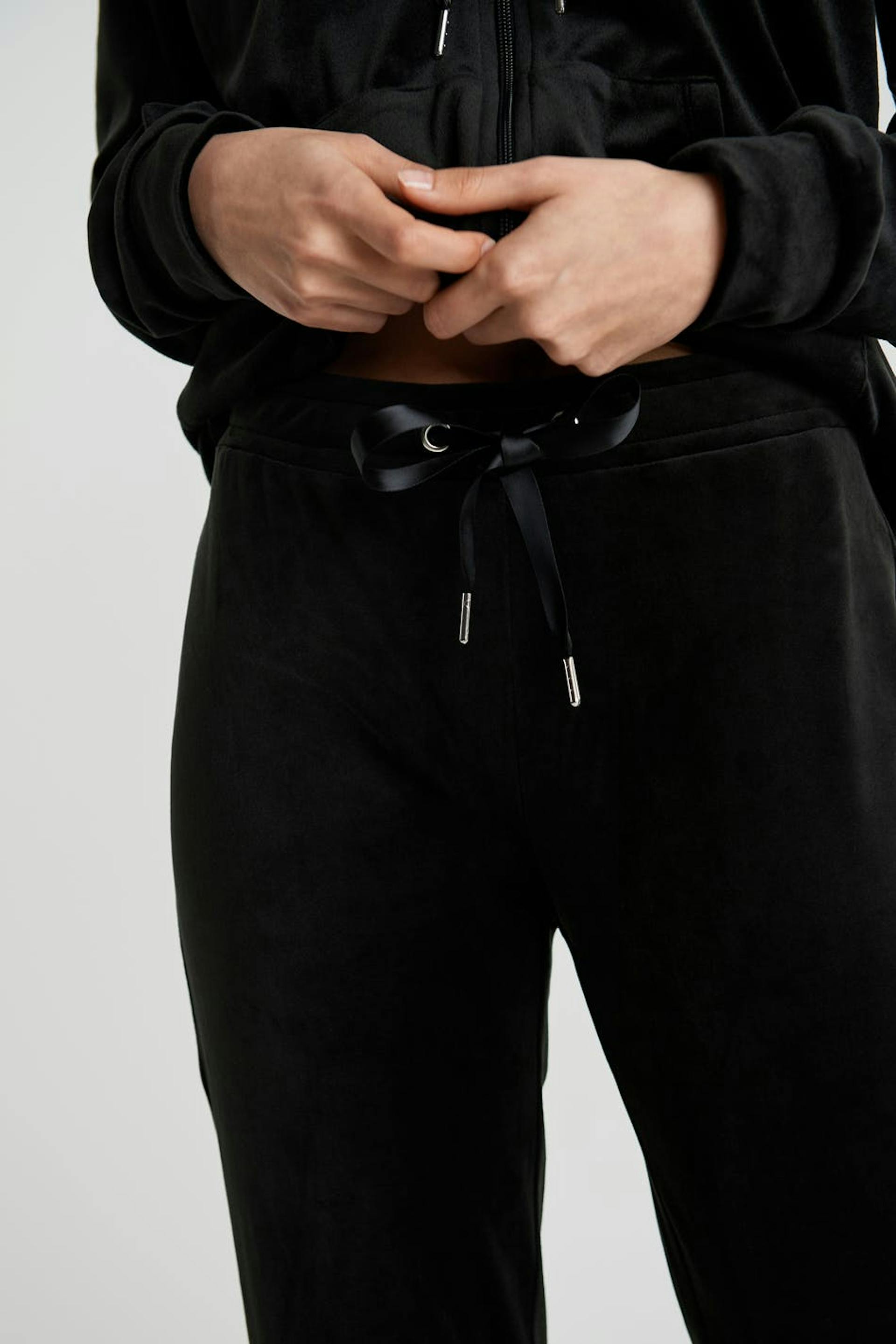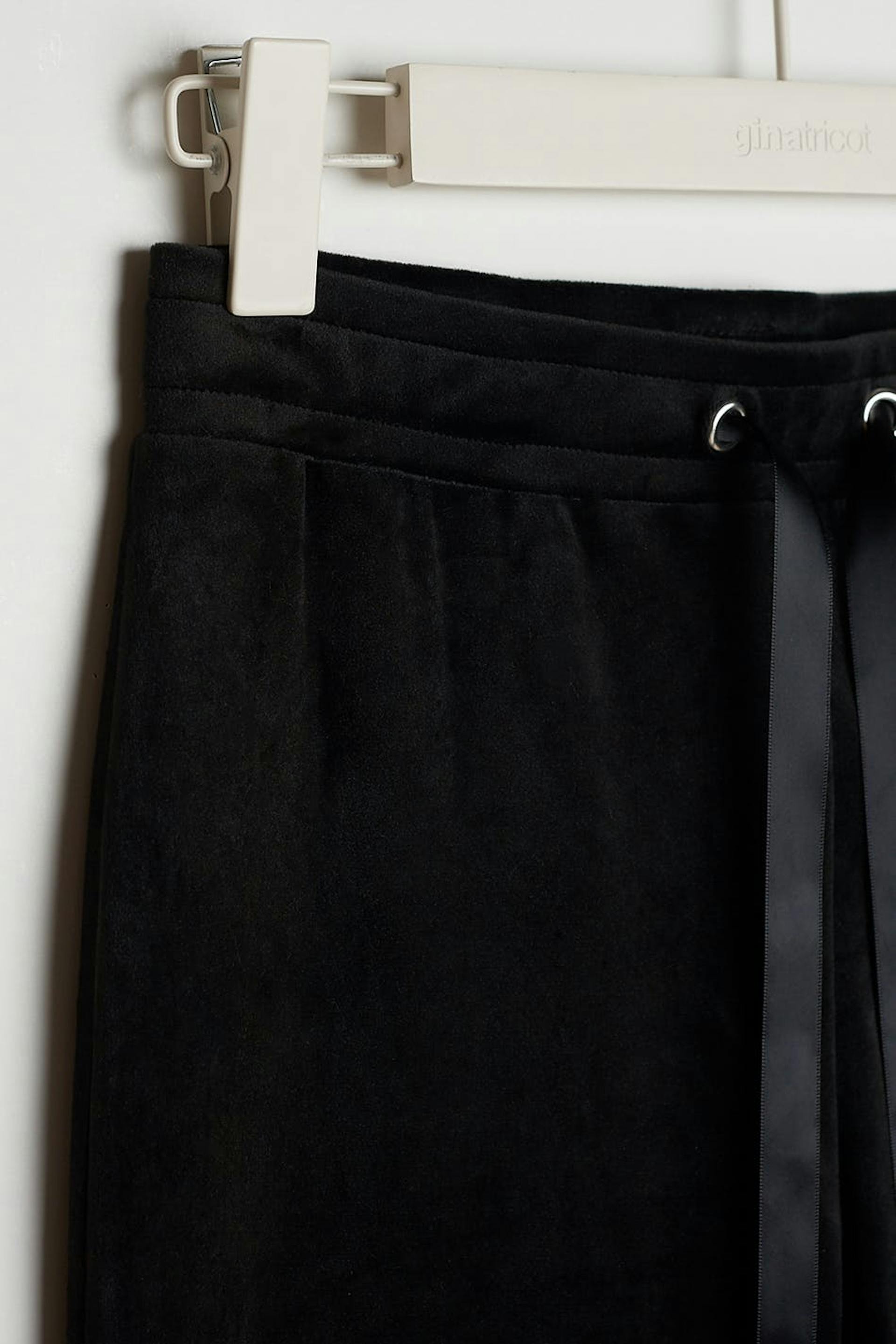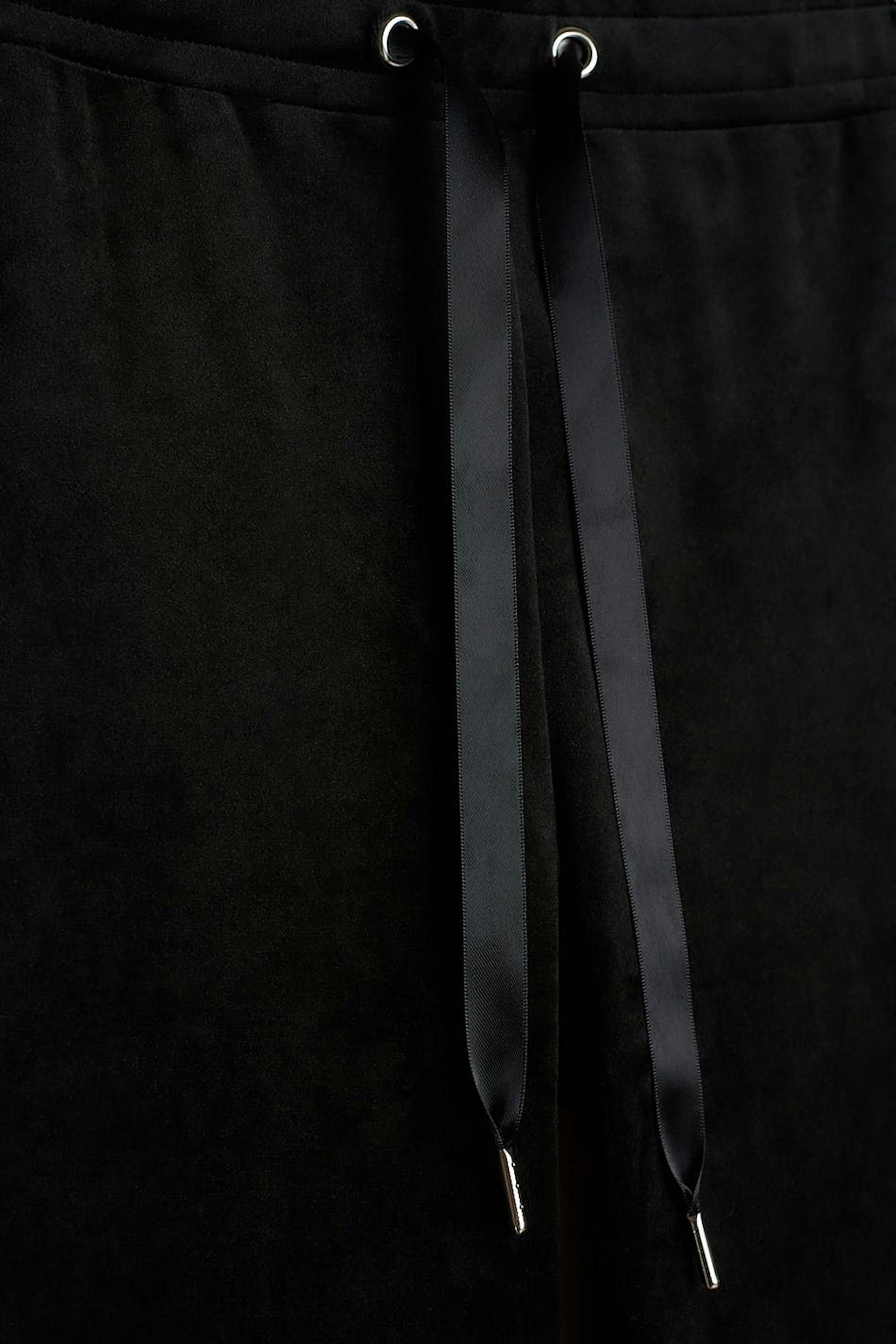 Petite trousers with straight legs with shorter leg length. The trousers are black and soft and have a waist with an elastic band and a drawstring. They are made of velour. Keep away from fire. Perfect for those who are 160 cm (5 ft 3 in.) or shorter.
