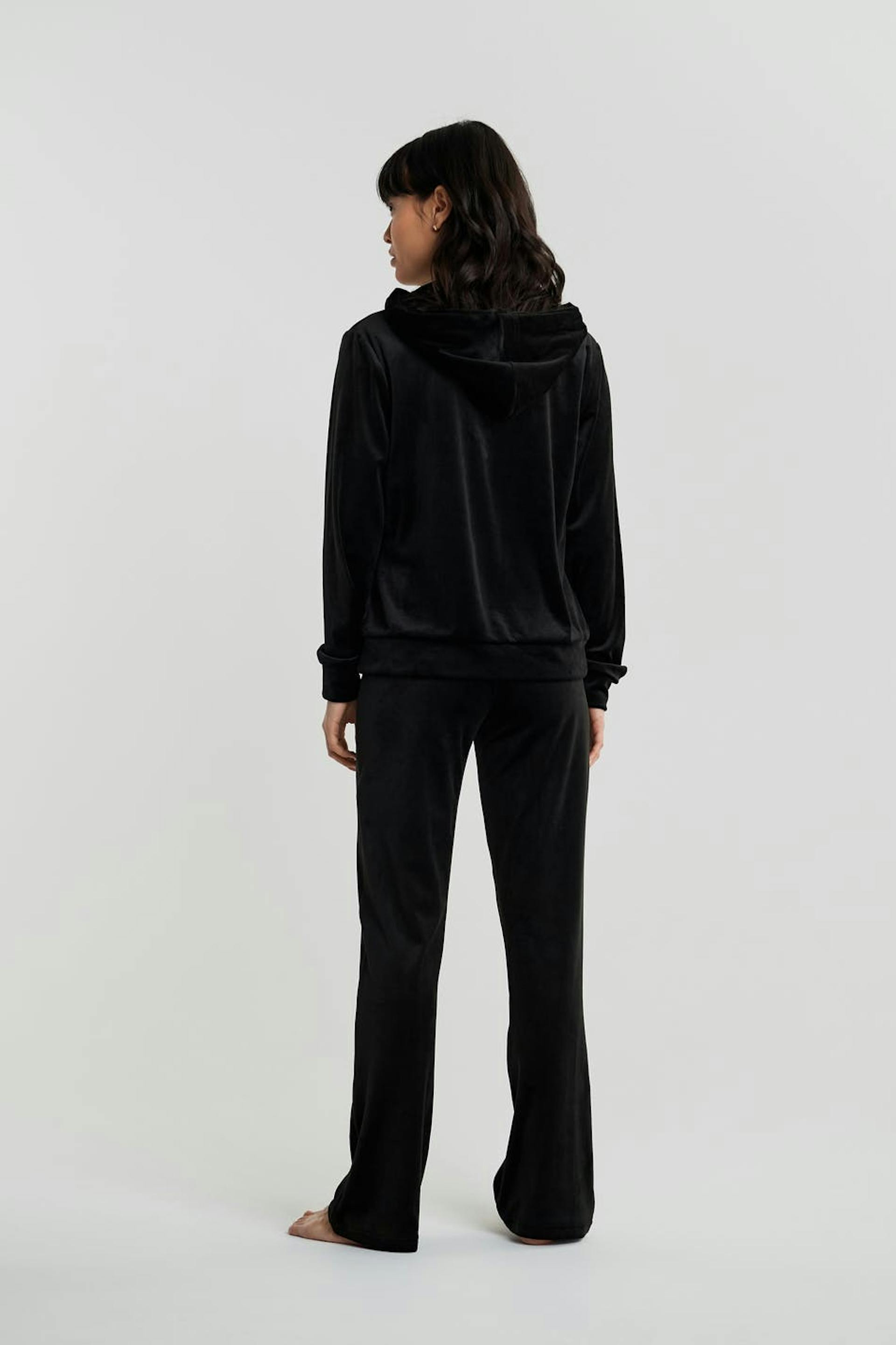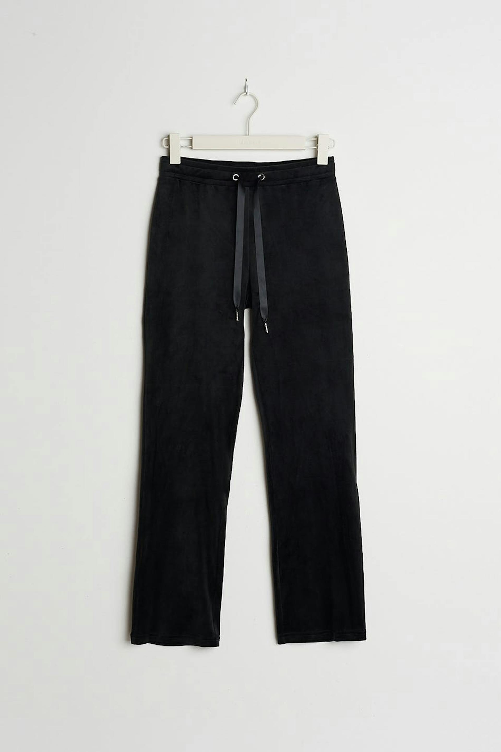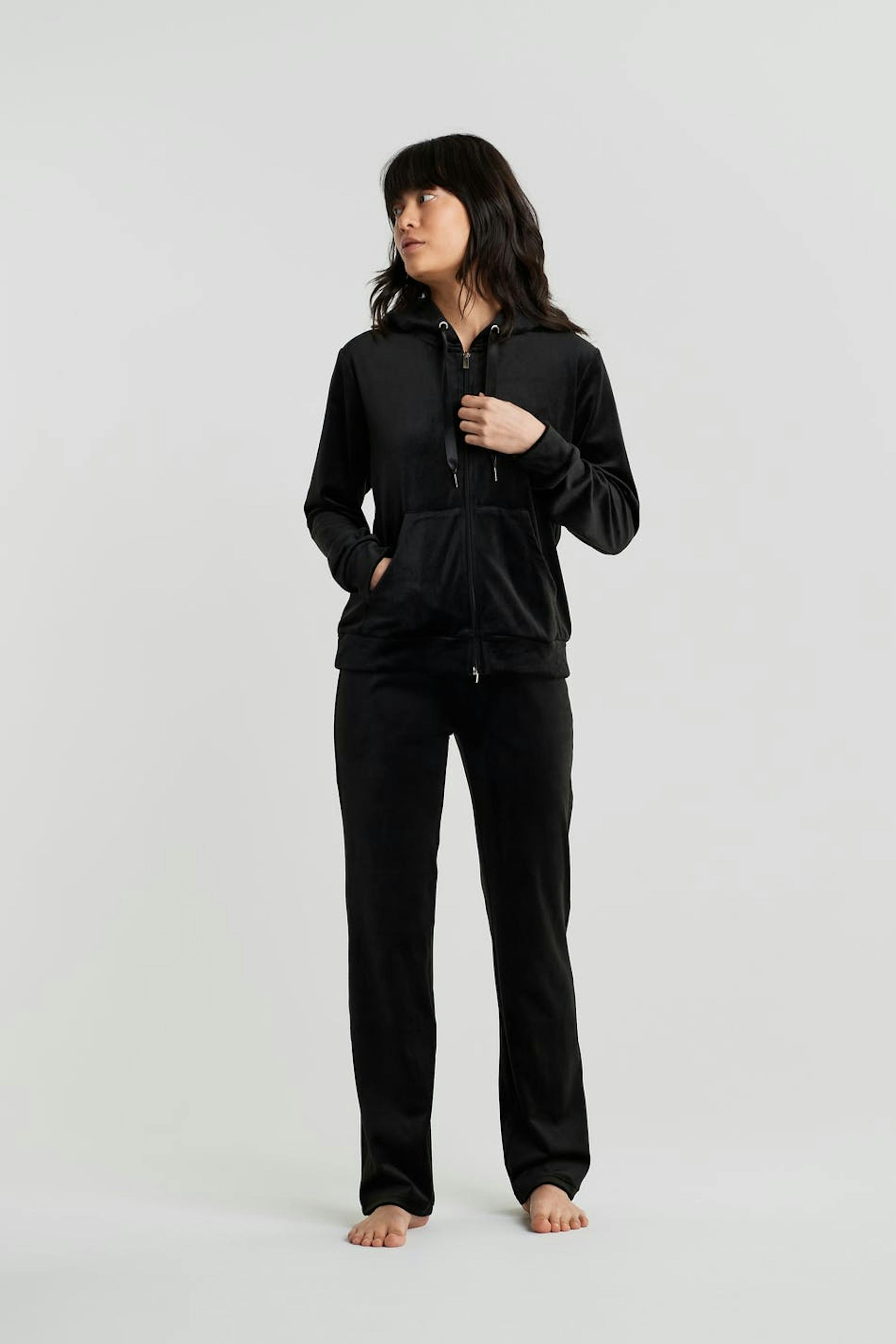 Petite trousers with straight legs with shorter leg length. The trousers are black and soft and have a waist with an elastic band and a drawstring. They are made of velour. Keep away from fire. Perfect for those who are 160 cm (5 ft 3 in.) or shorter.