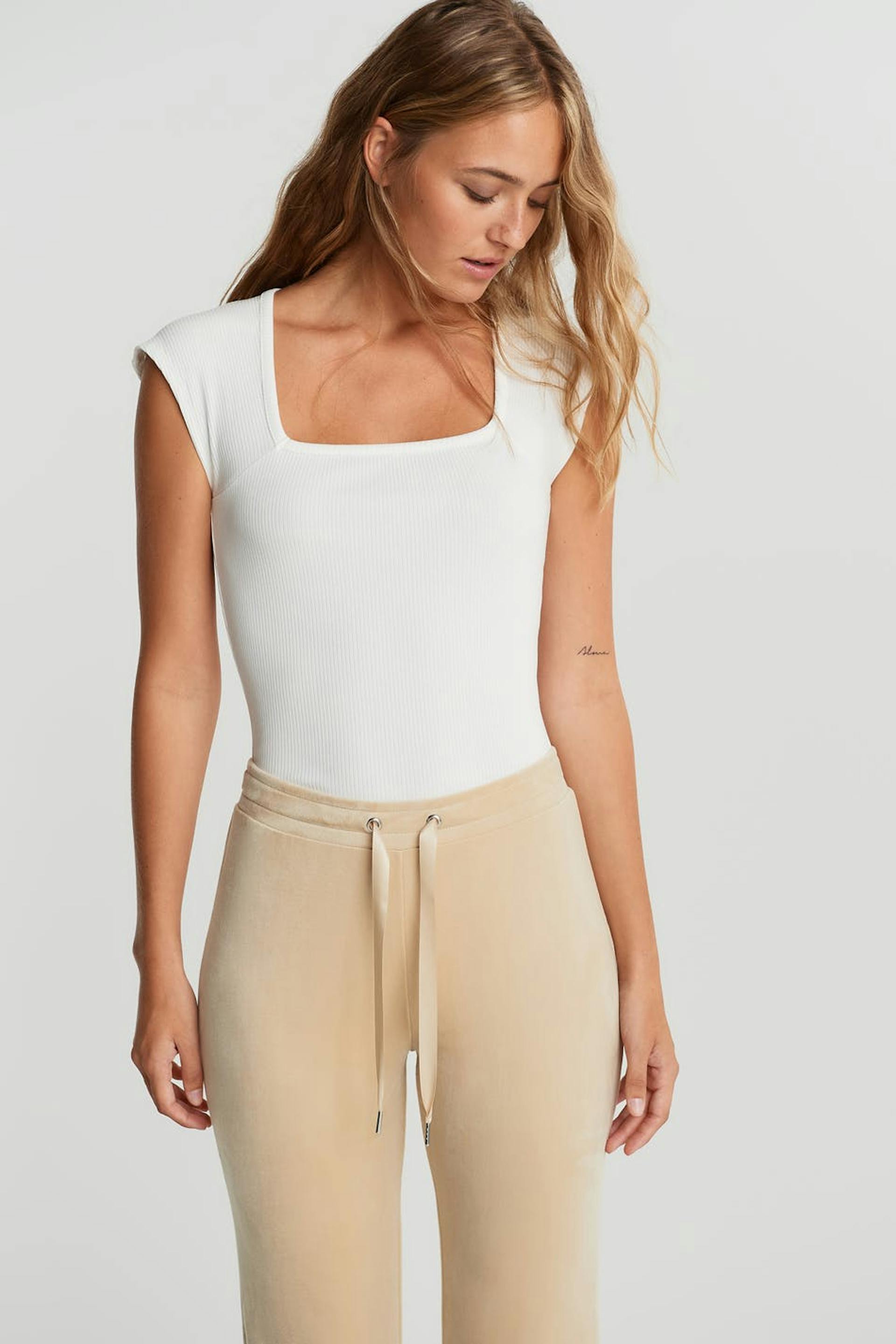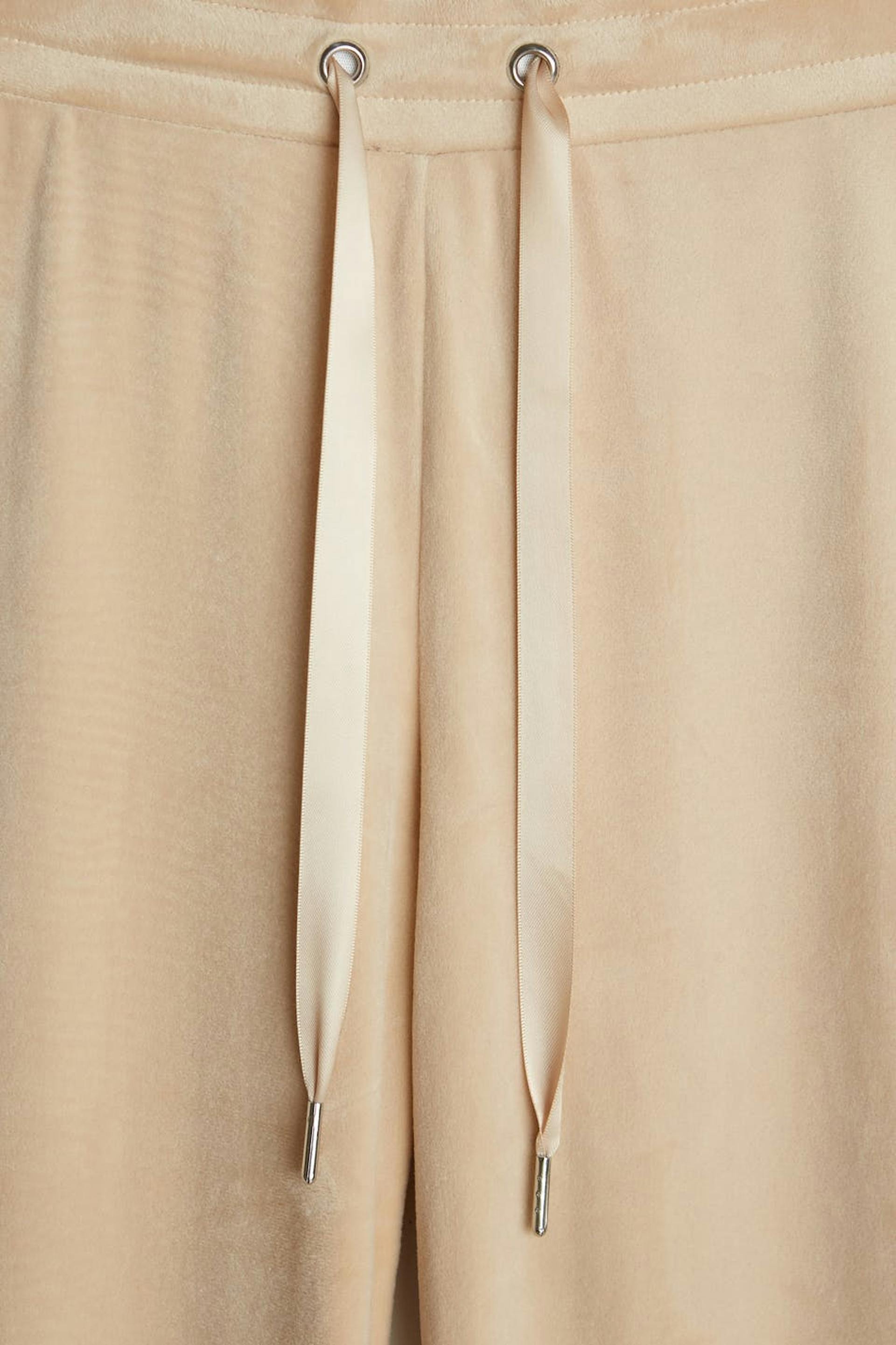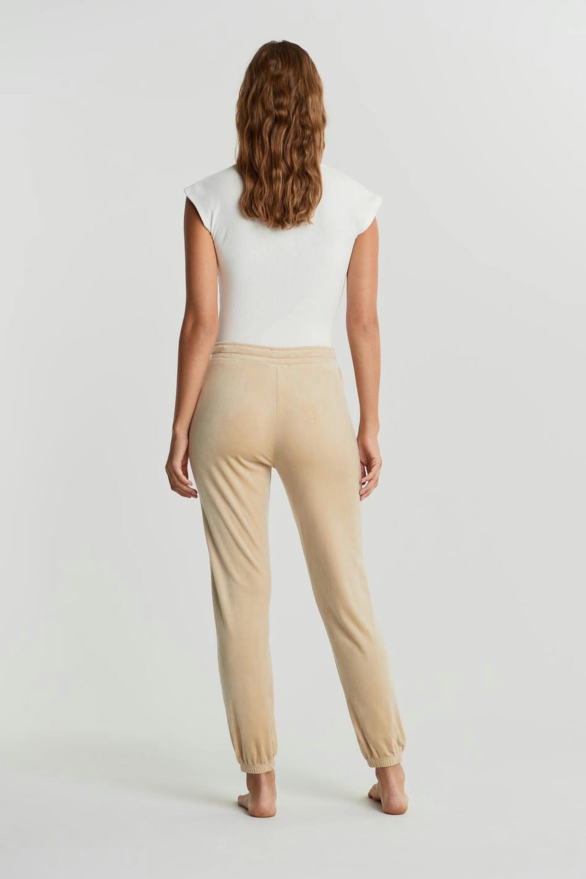 Trousers with straight legs. The trousers are beige and have a waist with a drawstring in satin. They are made of velour and have an elastic band at the end of the legs and at the waist. Keep away from fire.