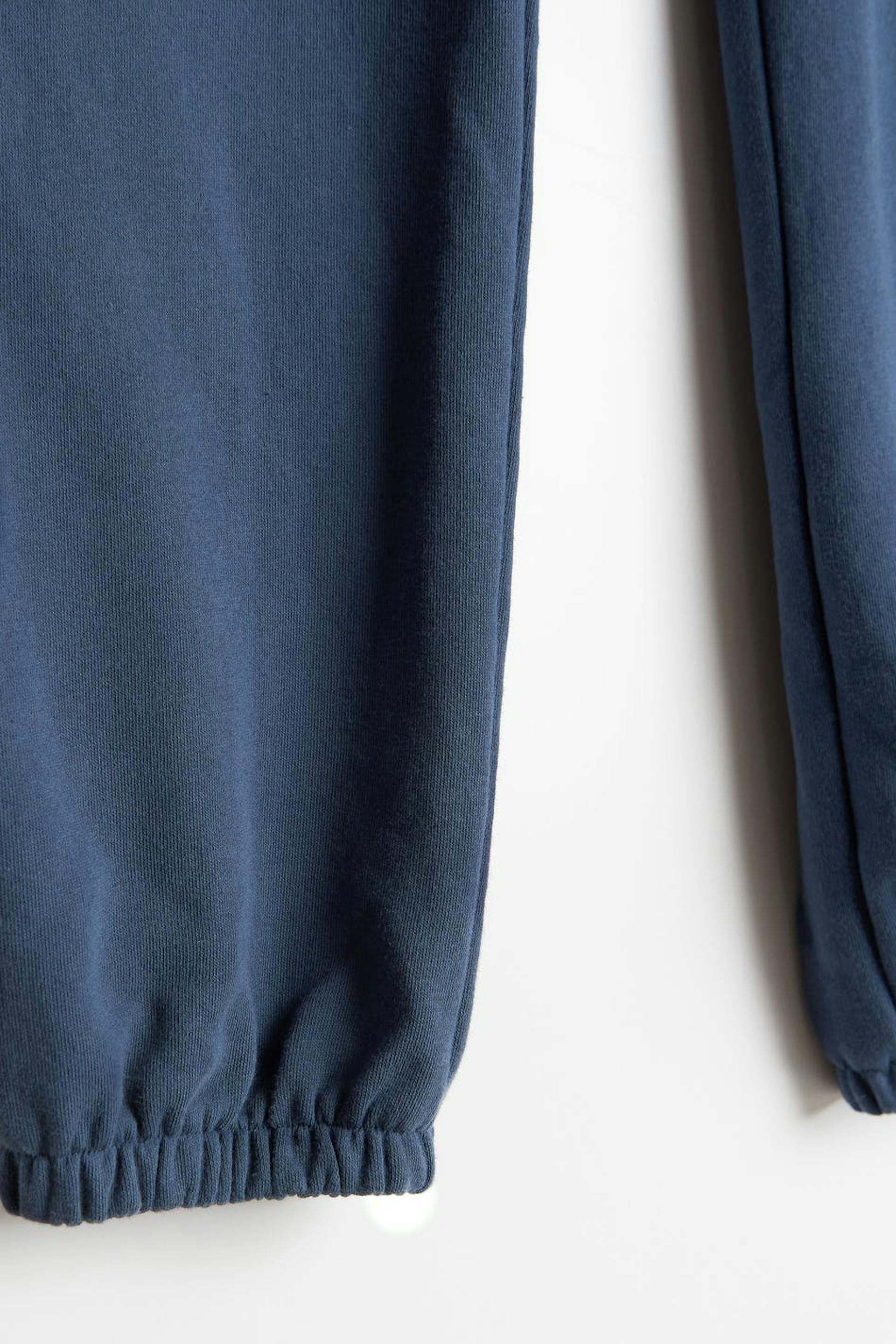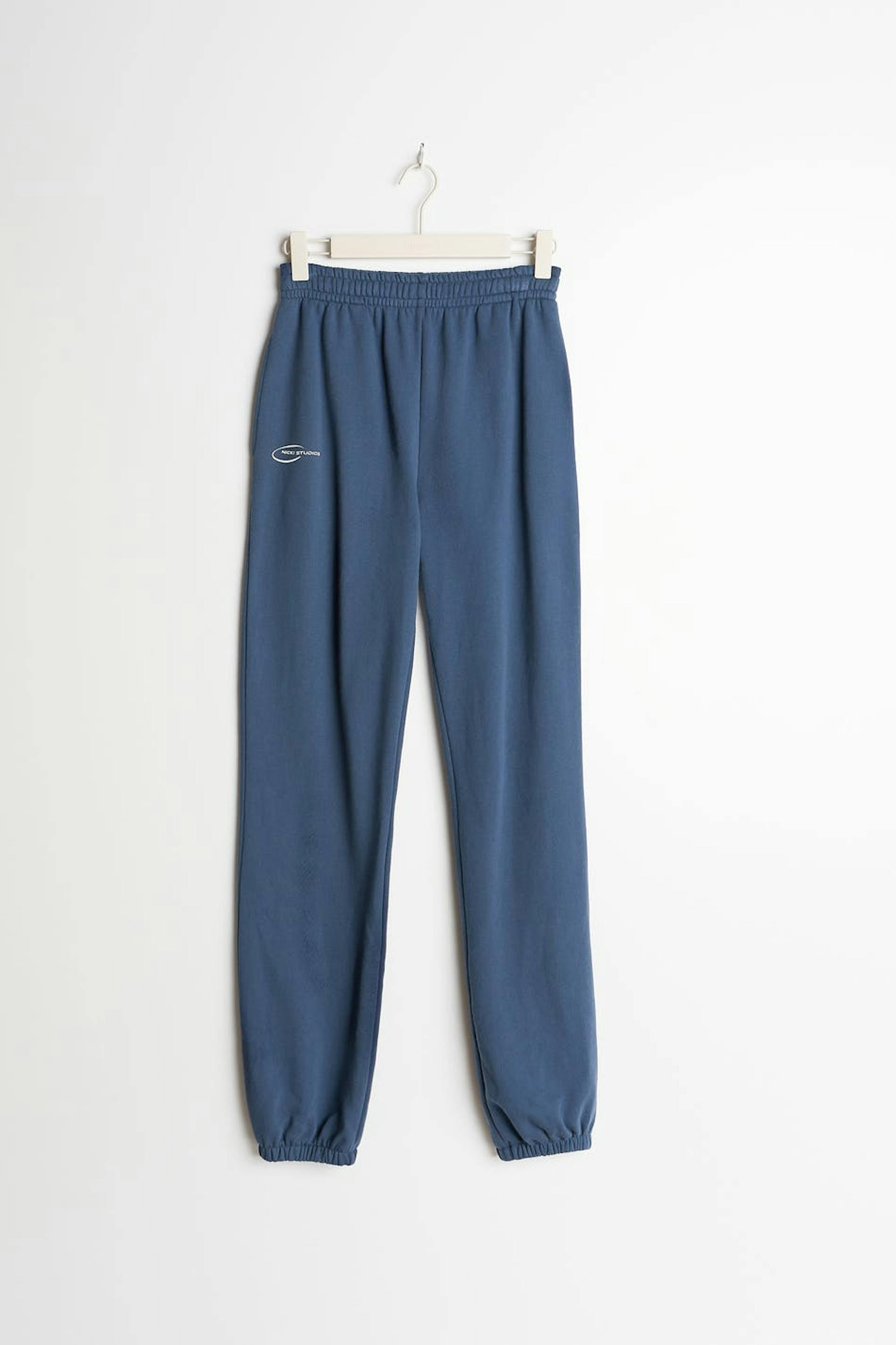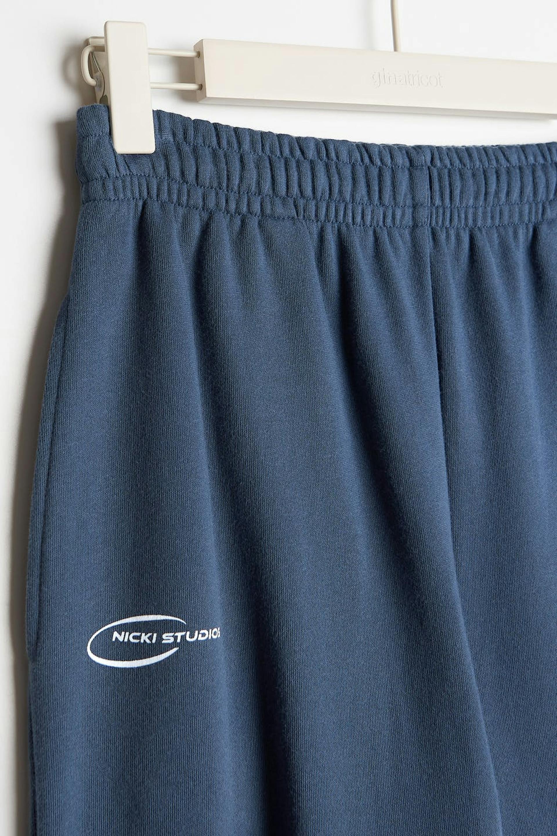 Nicki Studios X Gina Tricot. Sweatpantses with a heavy cotton quality. The trousers are blue and have side pockets. They have a logo print at the front and a soft elastic at the waist and at the end of the legs.