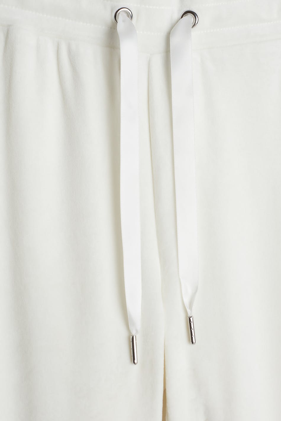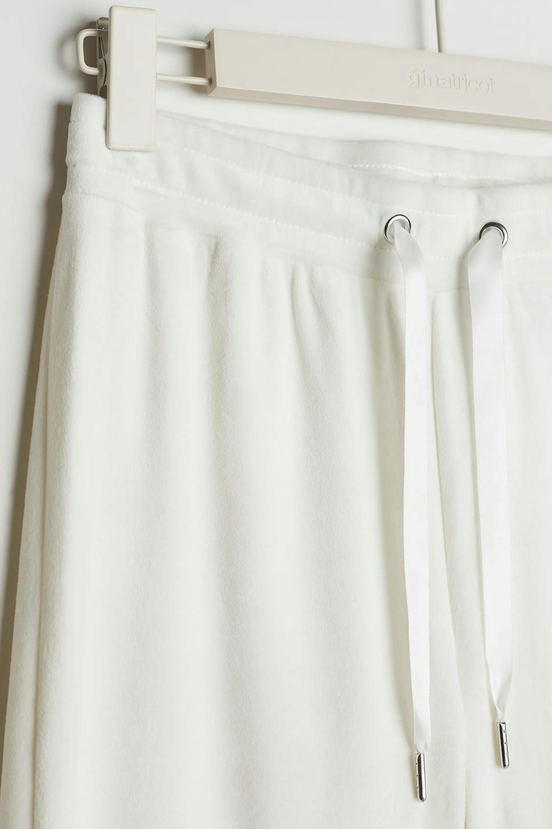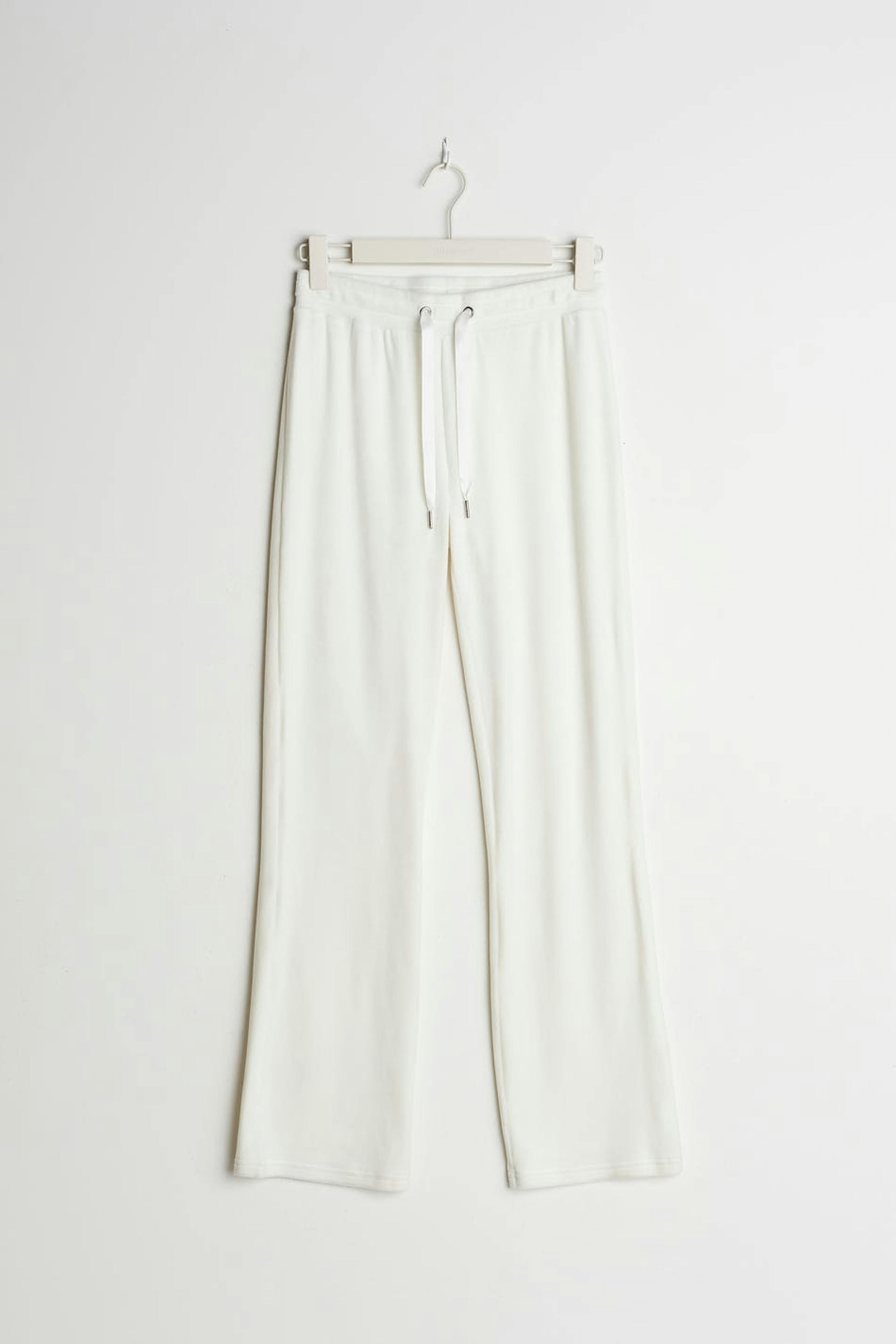 Tracksuit trousers with straight legs. The trousers are white and have a waist with an elastic strap and a drawstring. They are made of velour. Keep away from fire.