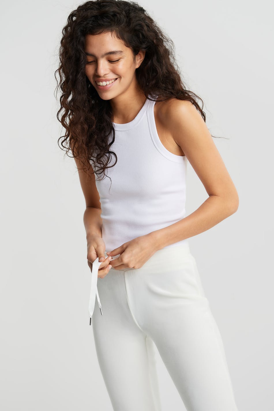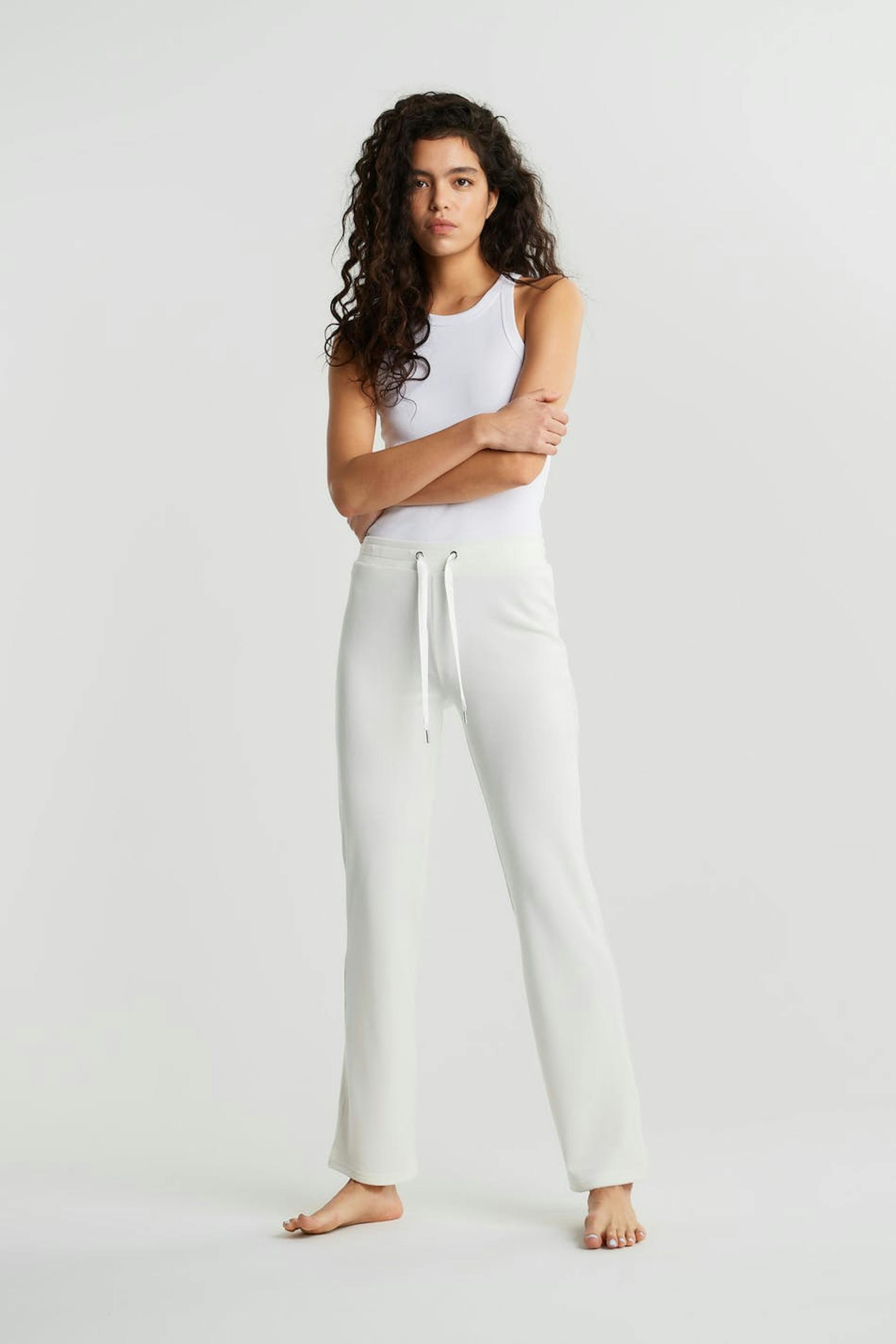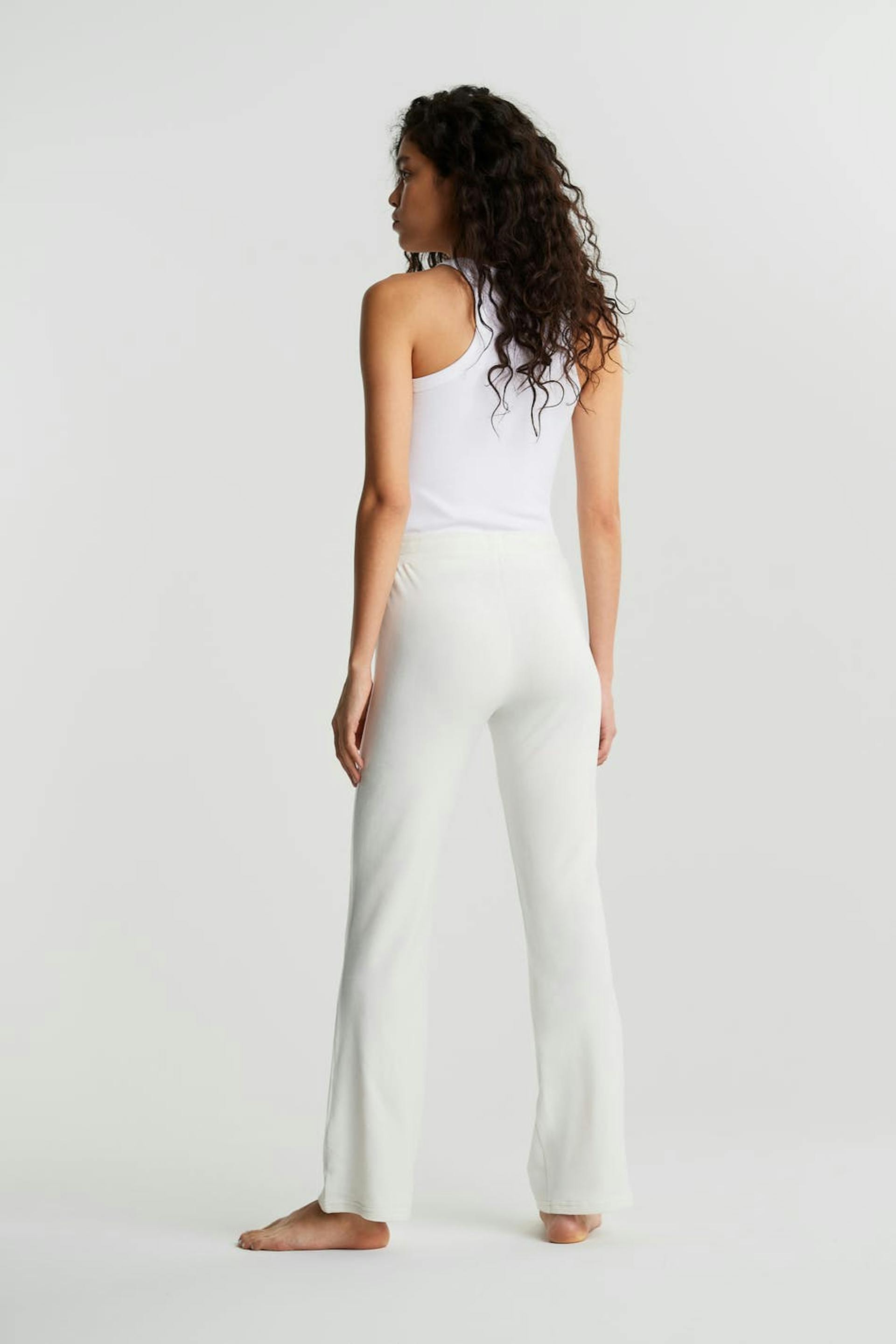 Tracksuit trousers with straight legs. The trousers are white and have a waist with an elastic strap and a drawstring. They are made of velour. Keep away from fire.