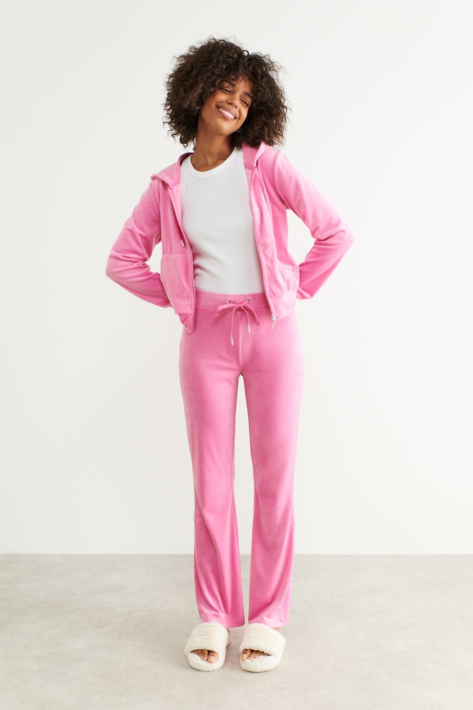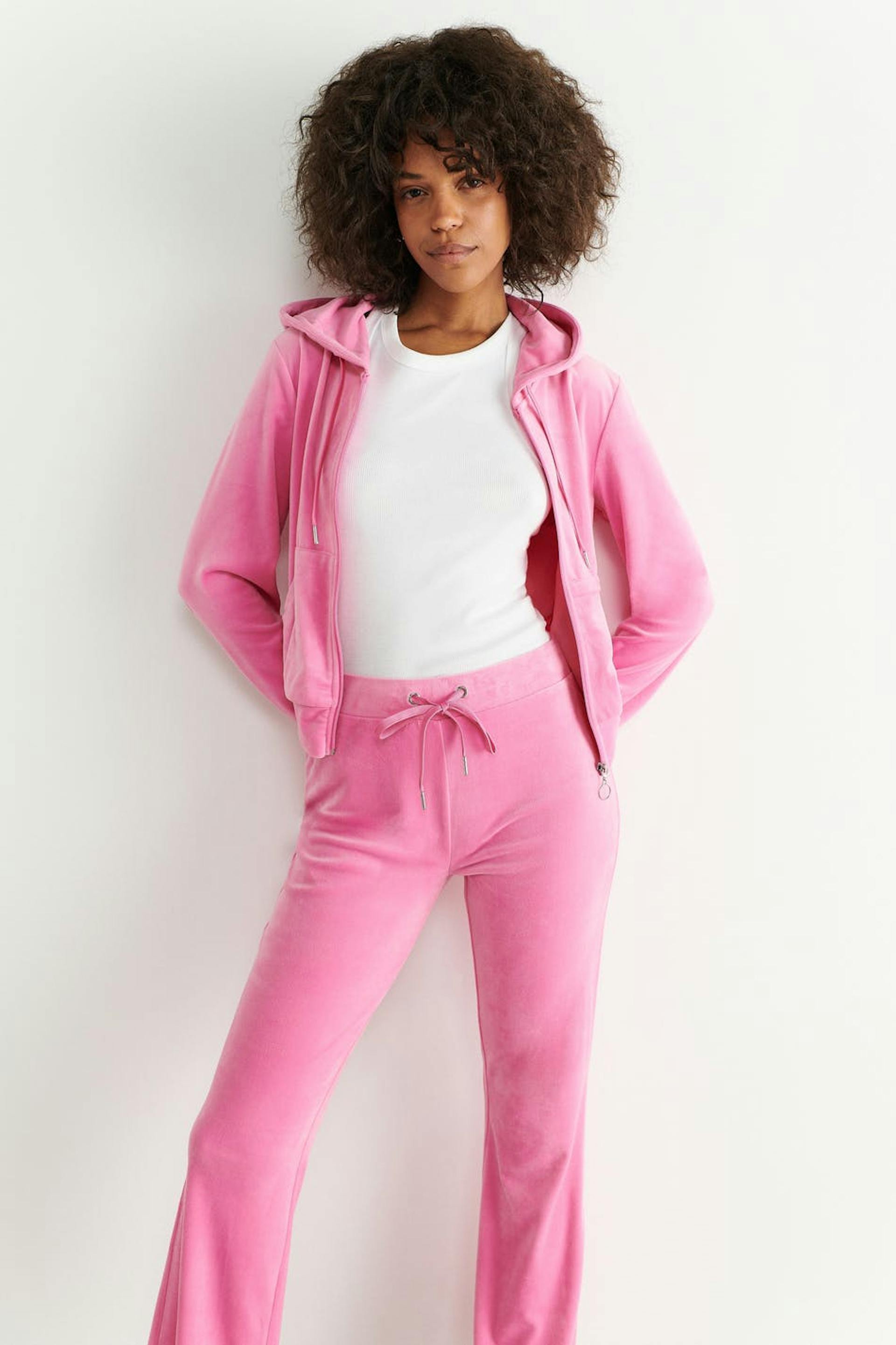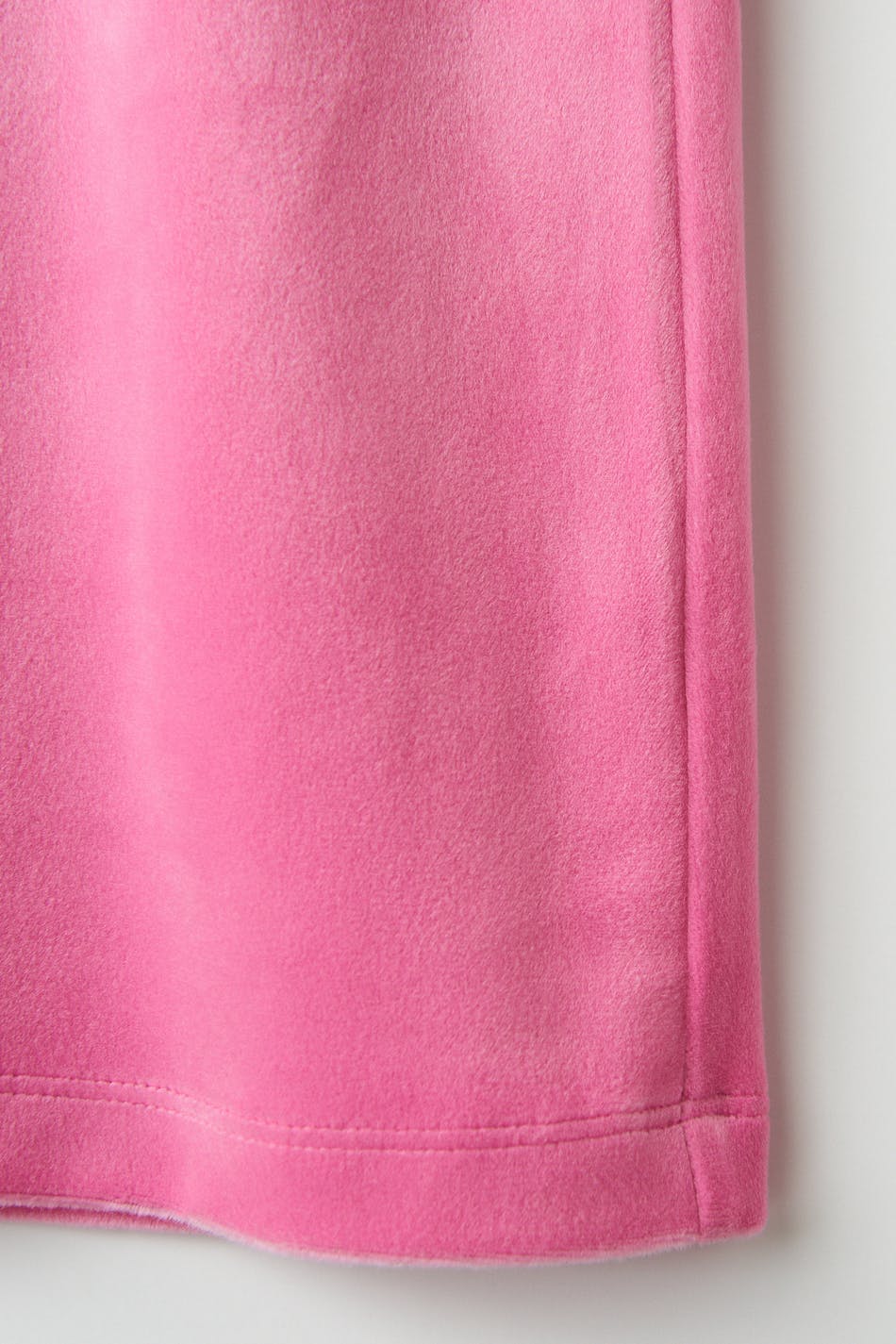 Lounge pants in velour with pockets at the back. The trousers are pink and have a soft elastic at the waist with self-tie in front.