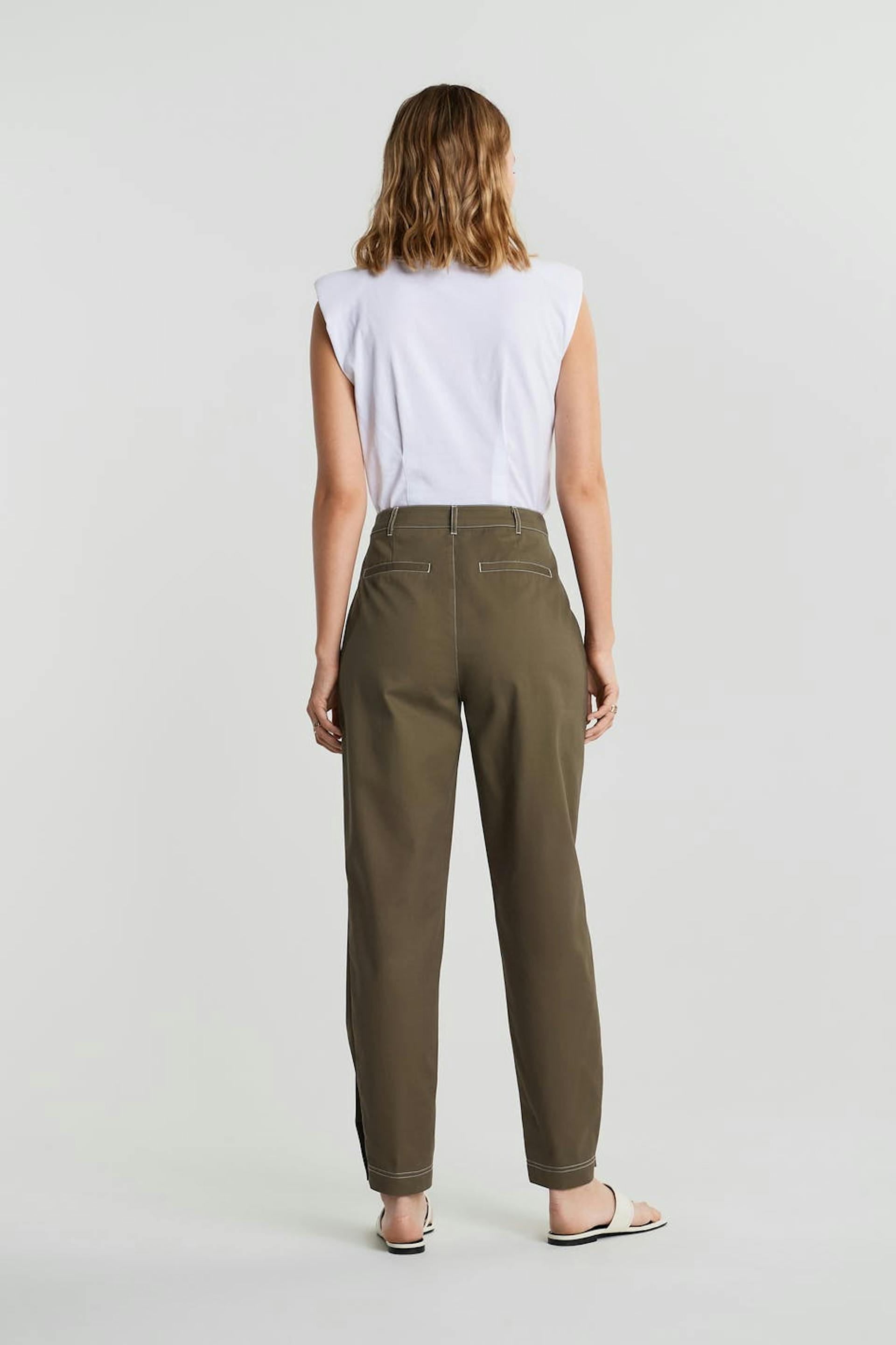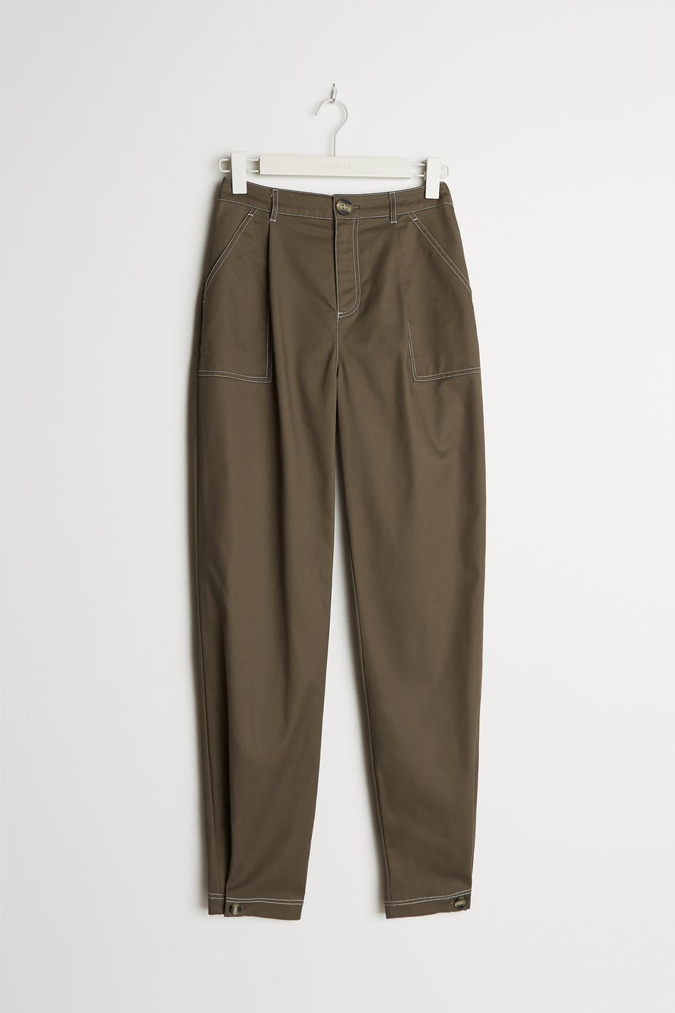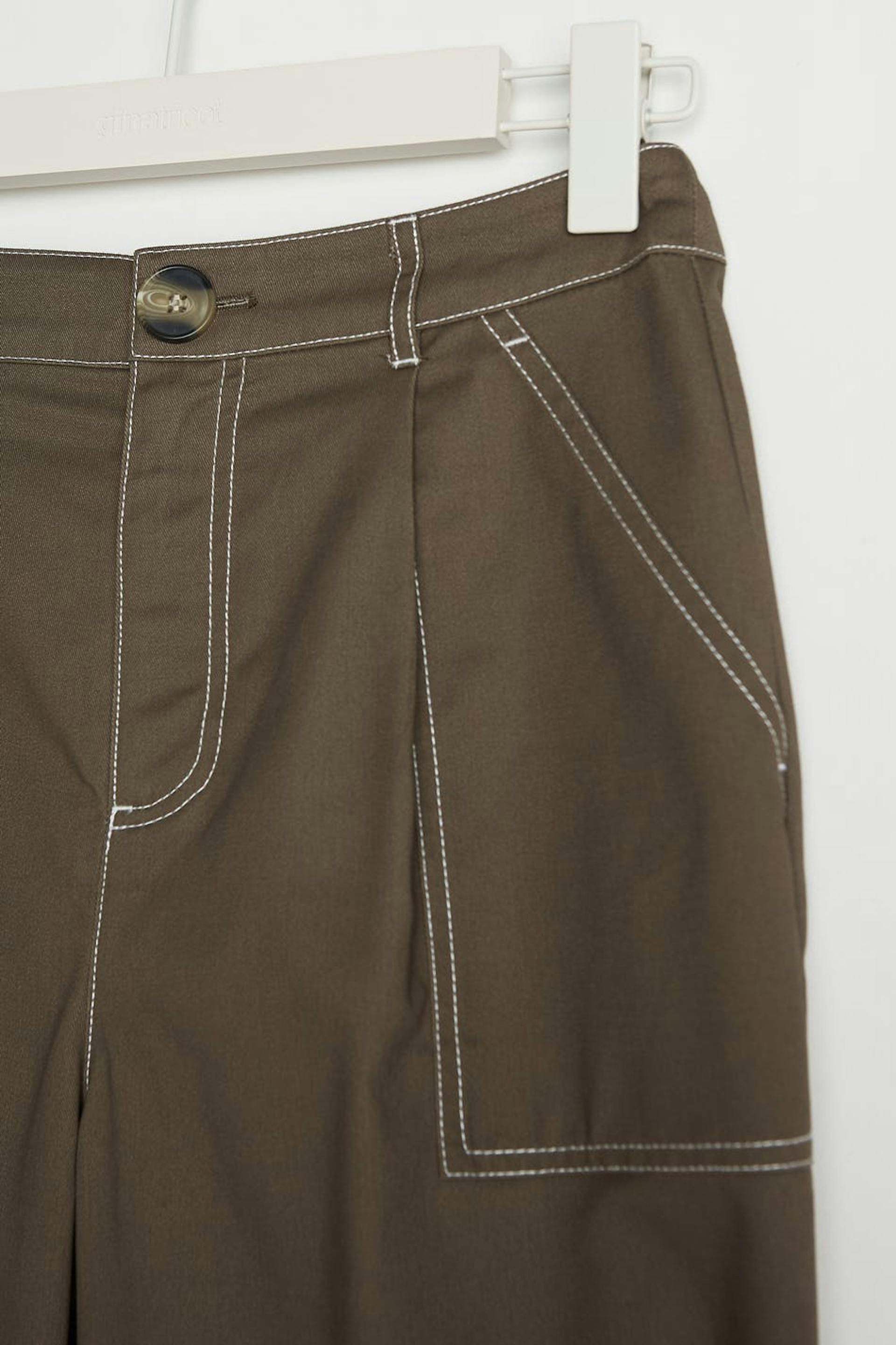 Trousers with a cargo design. The trousers are brown and have a high waist. They have a tapered leg, defined side pockets, a button at the end of the legs and longer leg length. Perfect for those who are 175 cm (5 ft 9 in.) or taller.