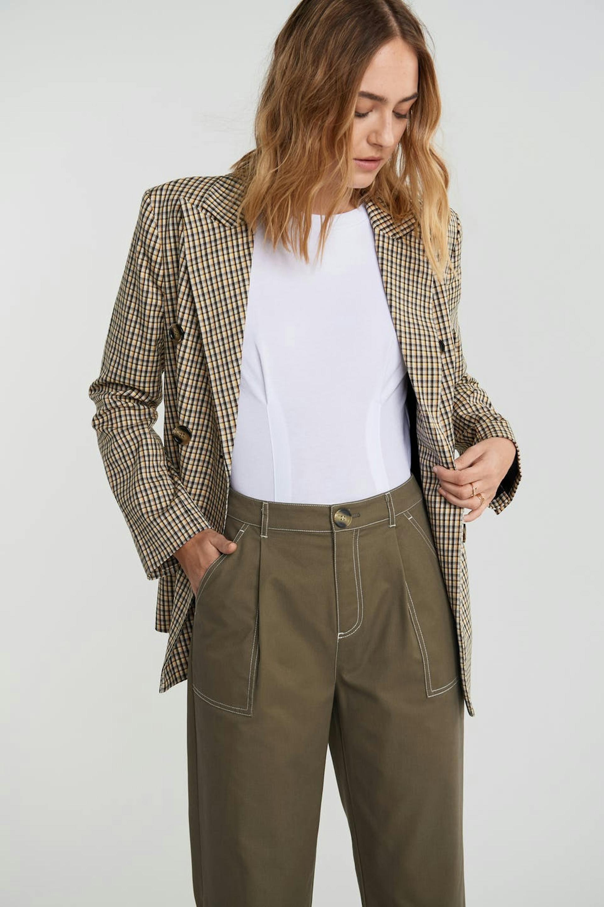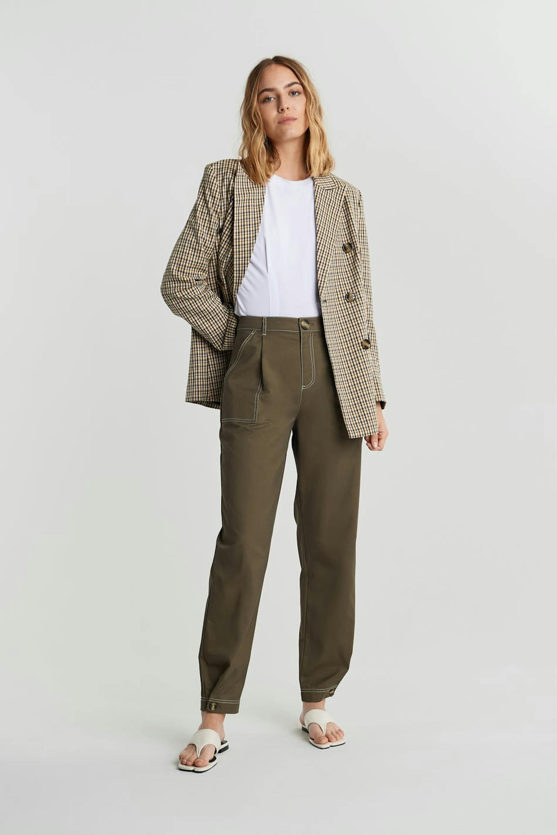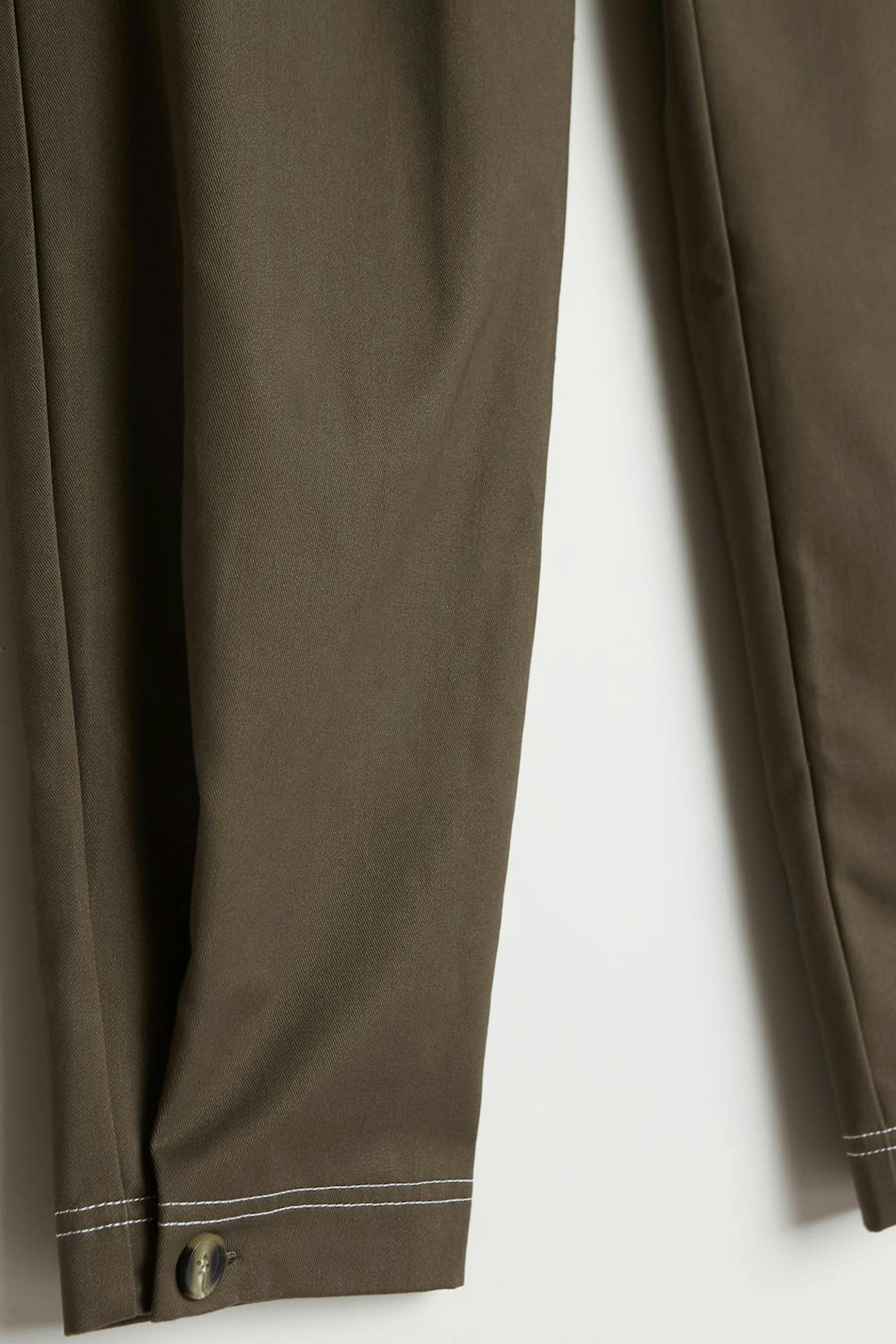 Trousers with a cargo design. The trousers are brown and have a high waist. They have a tapered leg, defined side pockets, a button at the end of the legs and longer leg length. Perfect for those who are 175 cm (5 ft 9 in.) or taller.