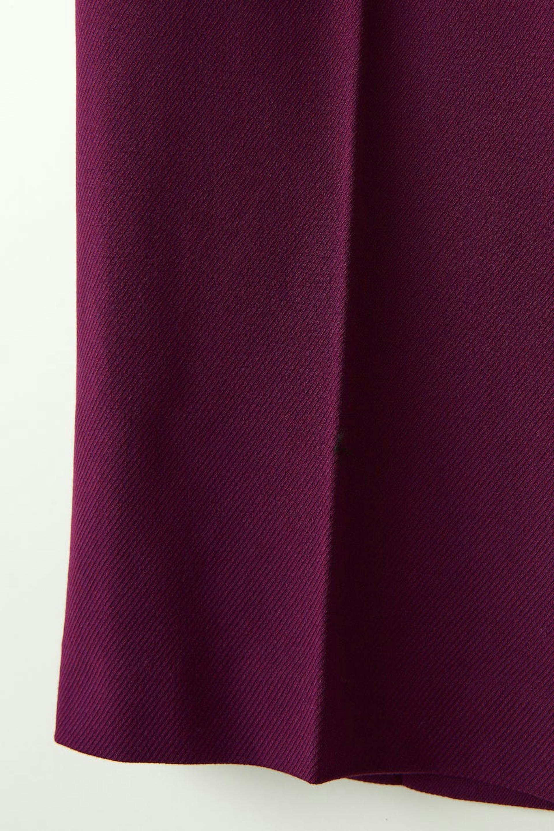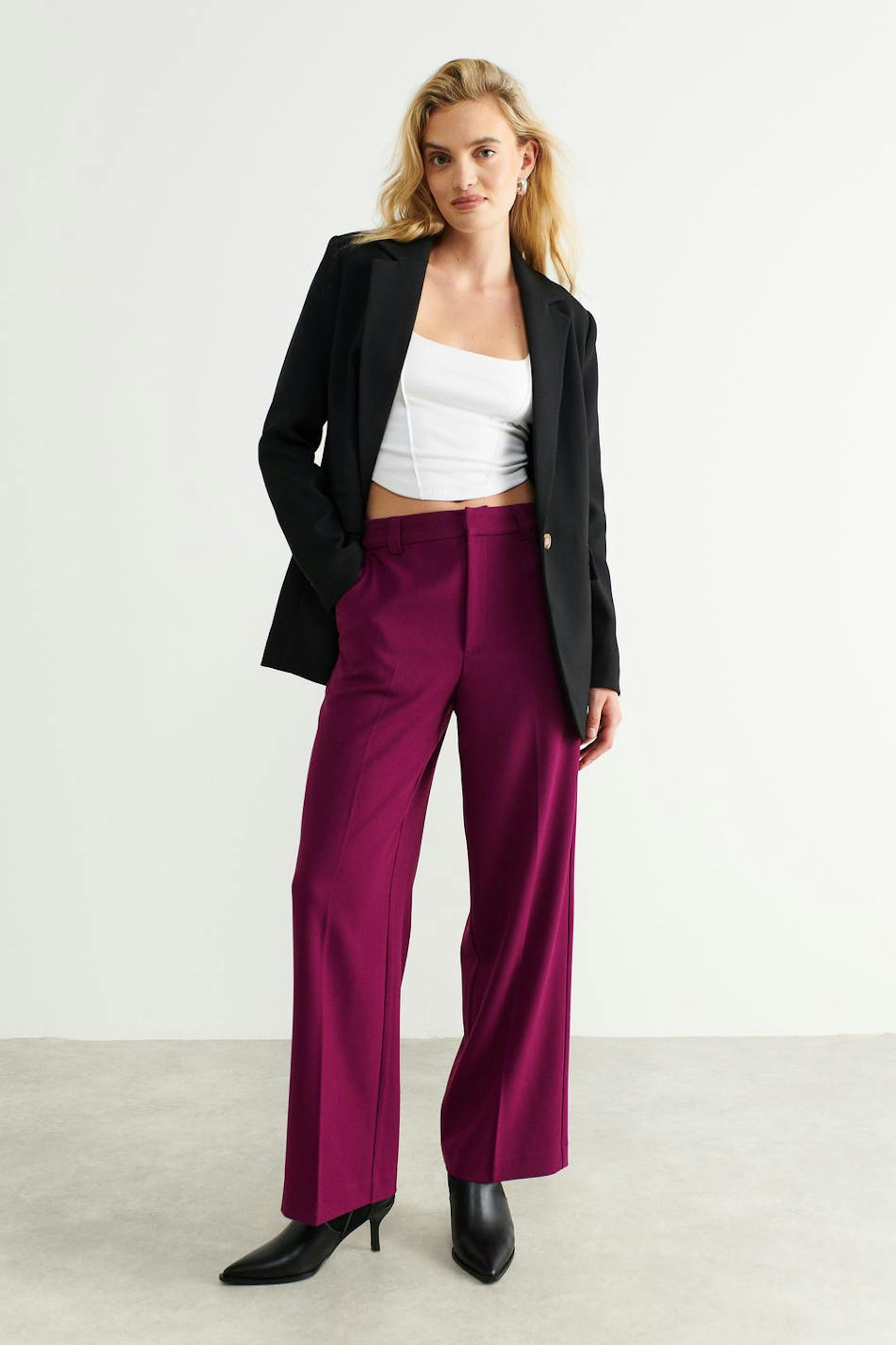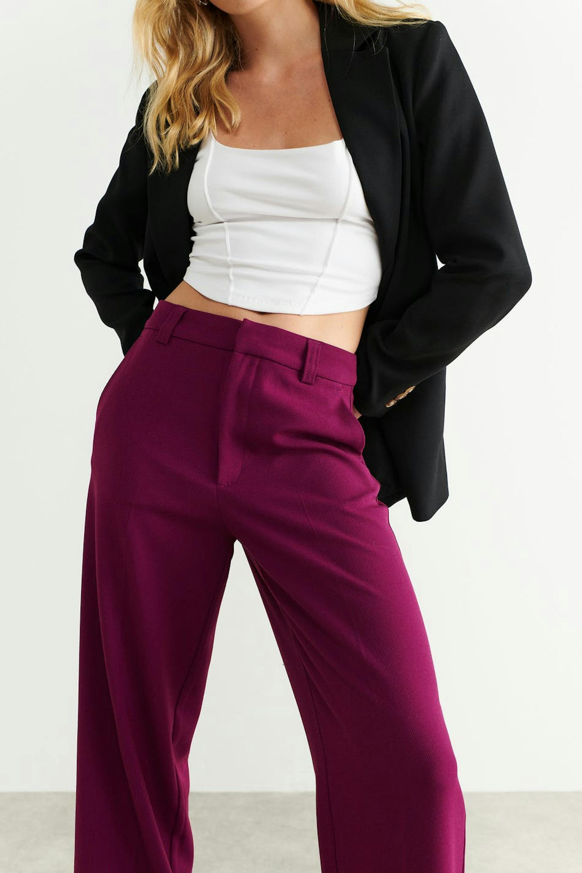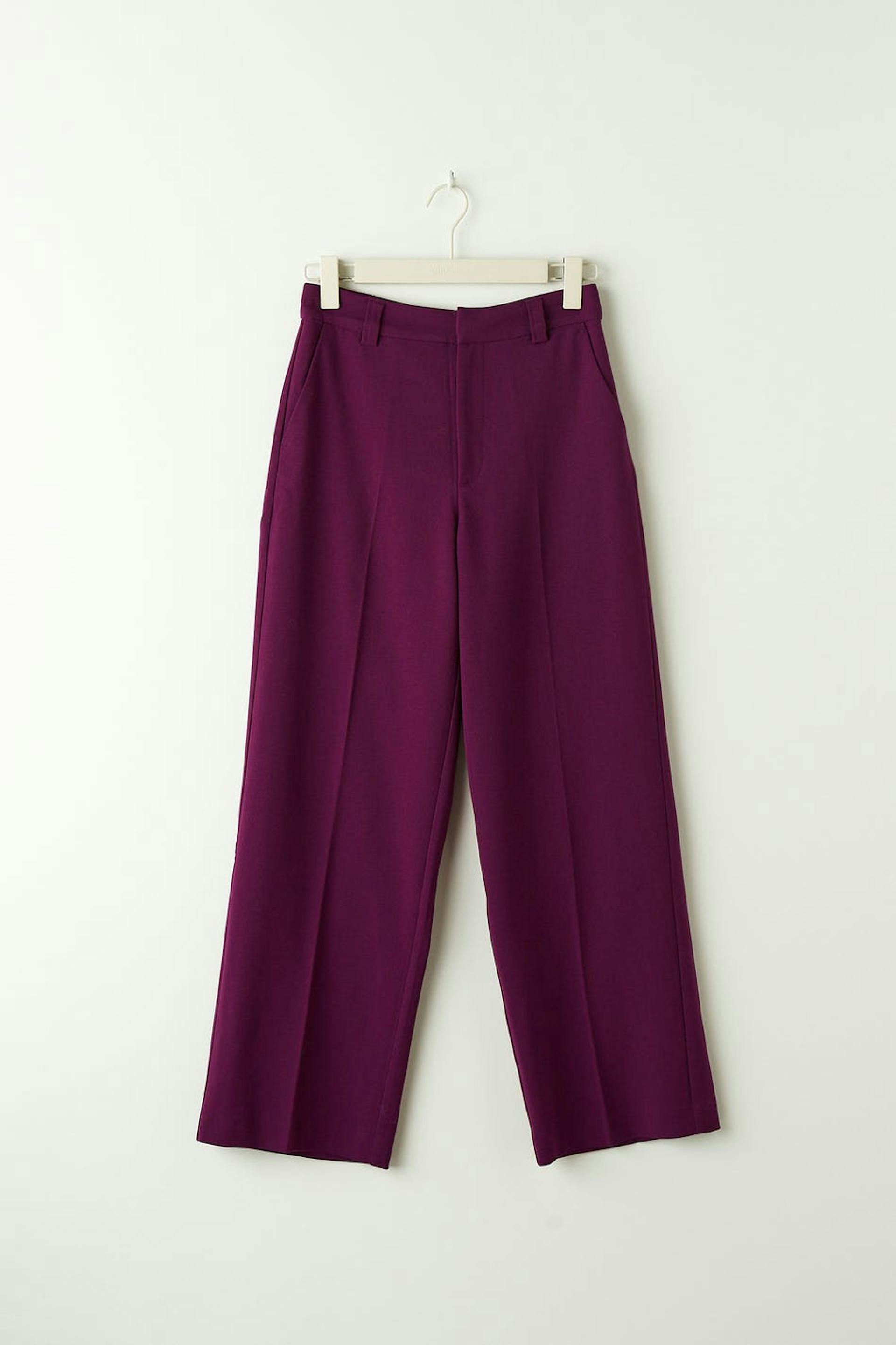 Wide suit trousers with crease. The trousers are purple and have a woven quality. They have side pockets, waistband with belt loops, fly with zipper and slit pockets at the back.