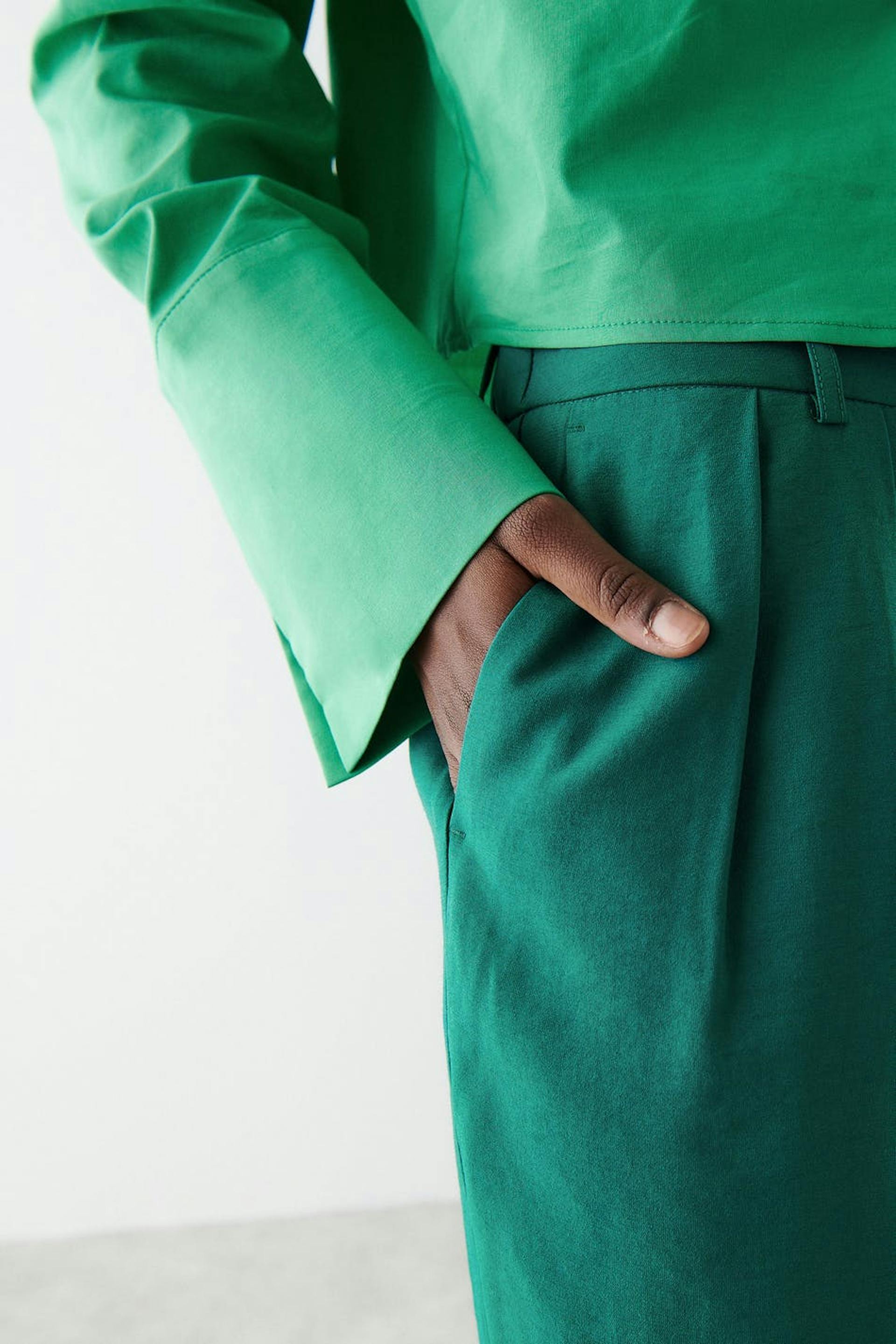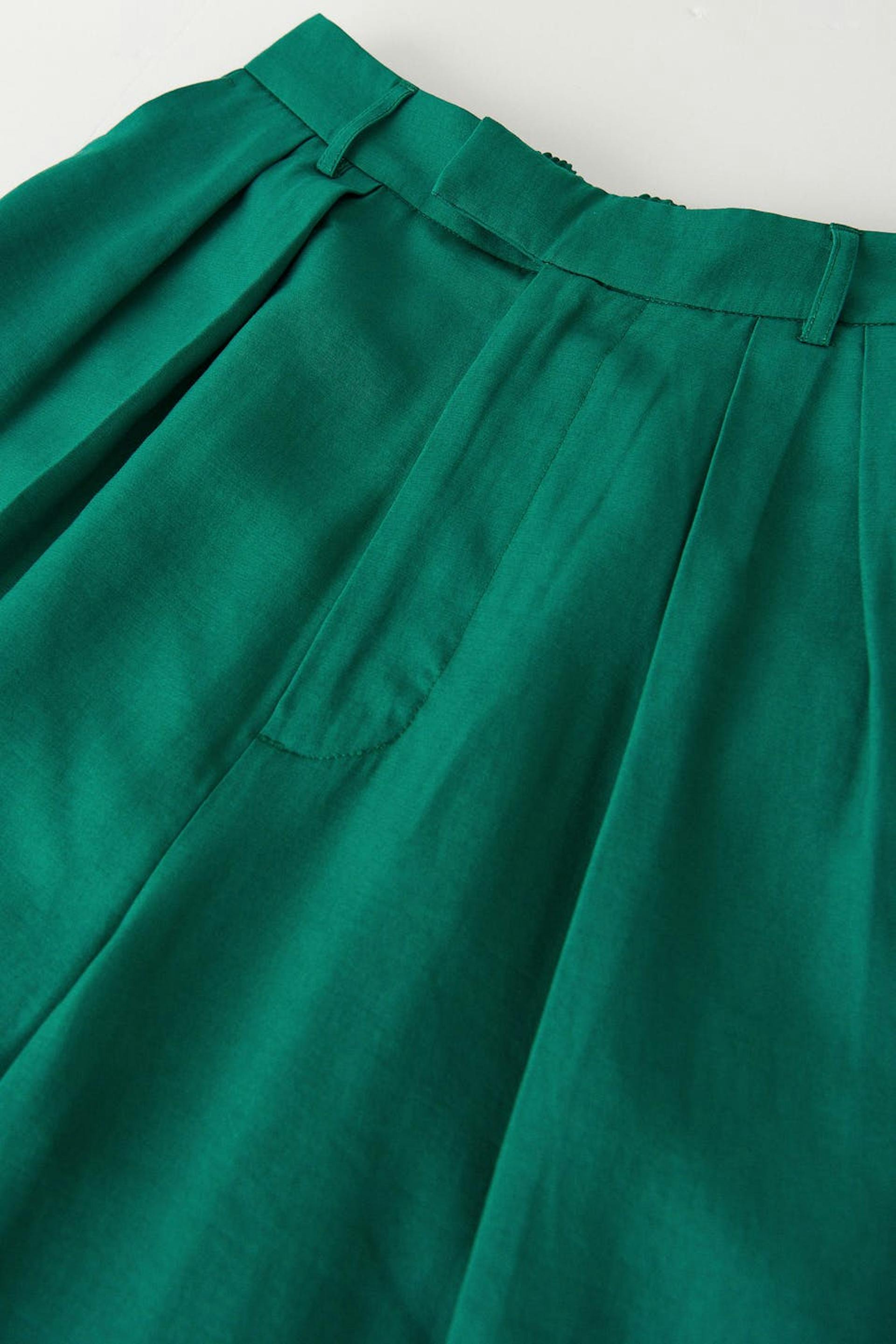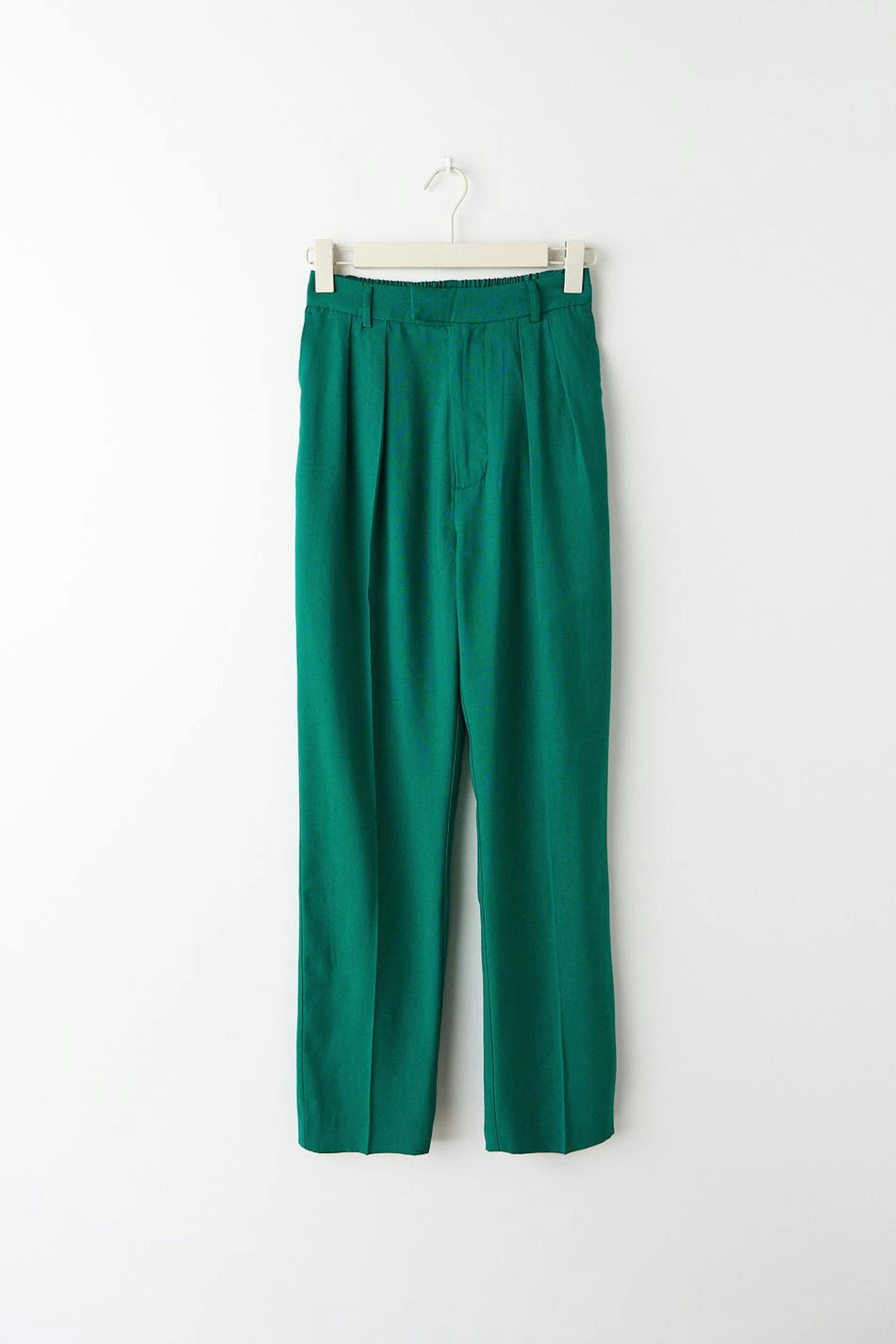 Suit trousers with double pleats in front. The trousers are green and have high waist. They have pockets on the sides, a slit pocket at the back, waistband with belt loops and shaped legs with normal length.