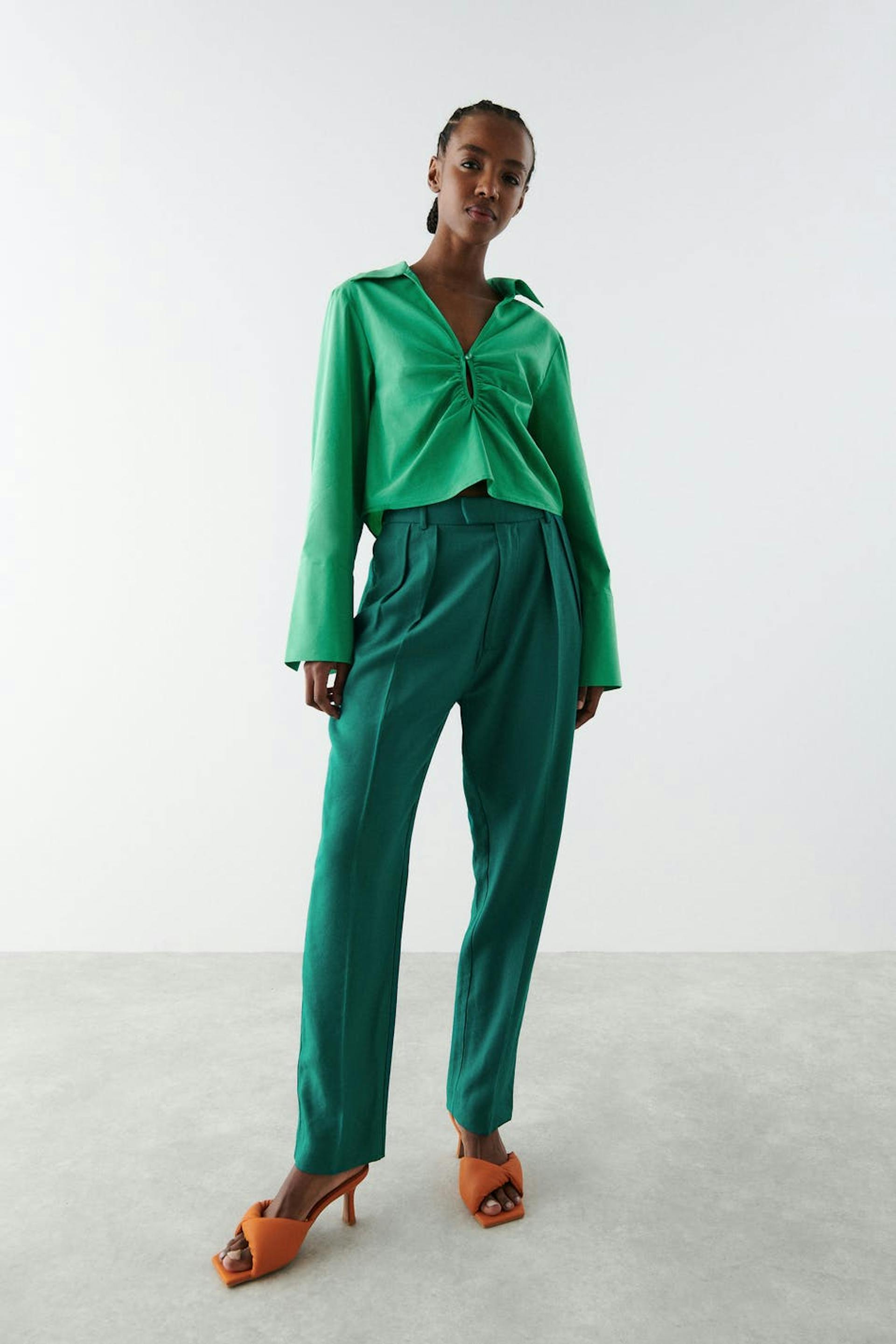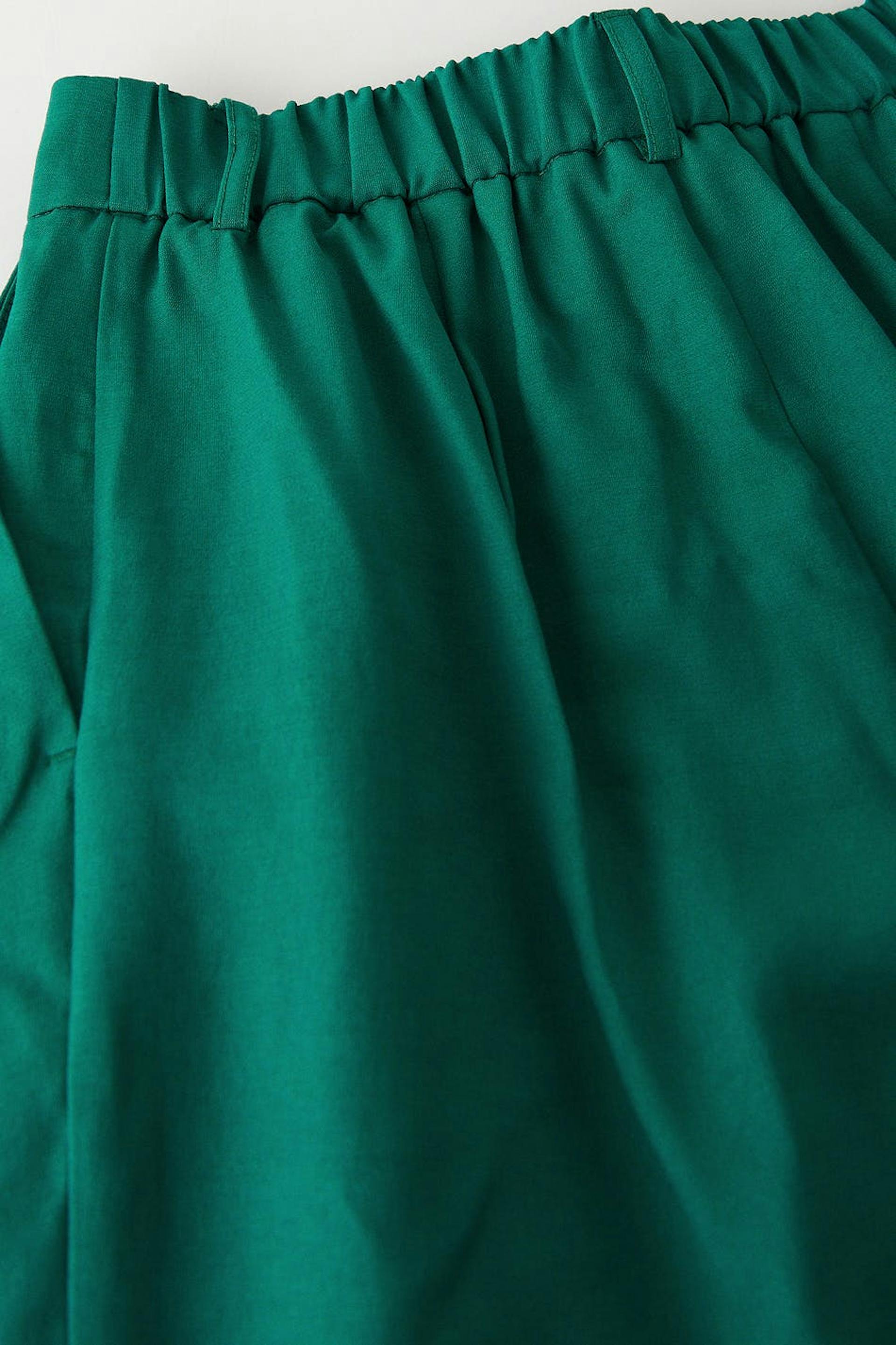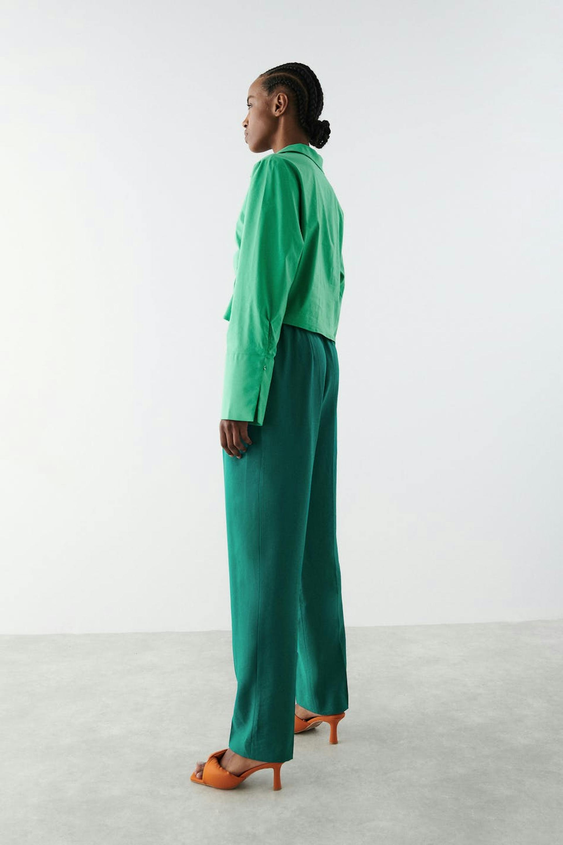 Suit trousers with double pleats in front. The trousers are green and have high waist. They have pockets on the sides, a slit pocket at the back, waistband with belt loops and shaped legs with normal length.