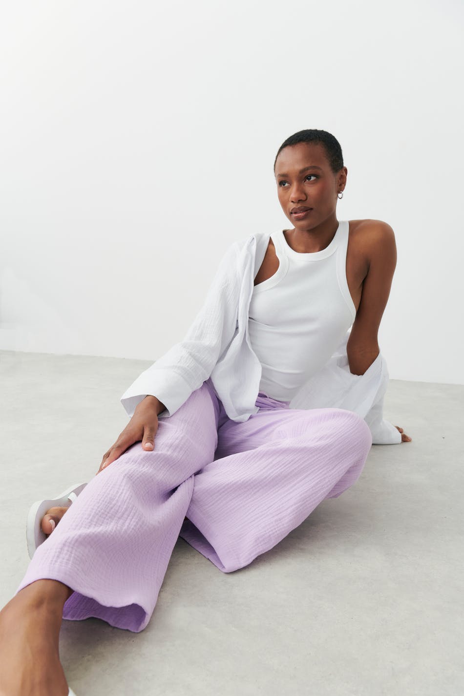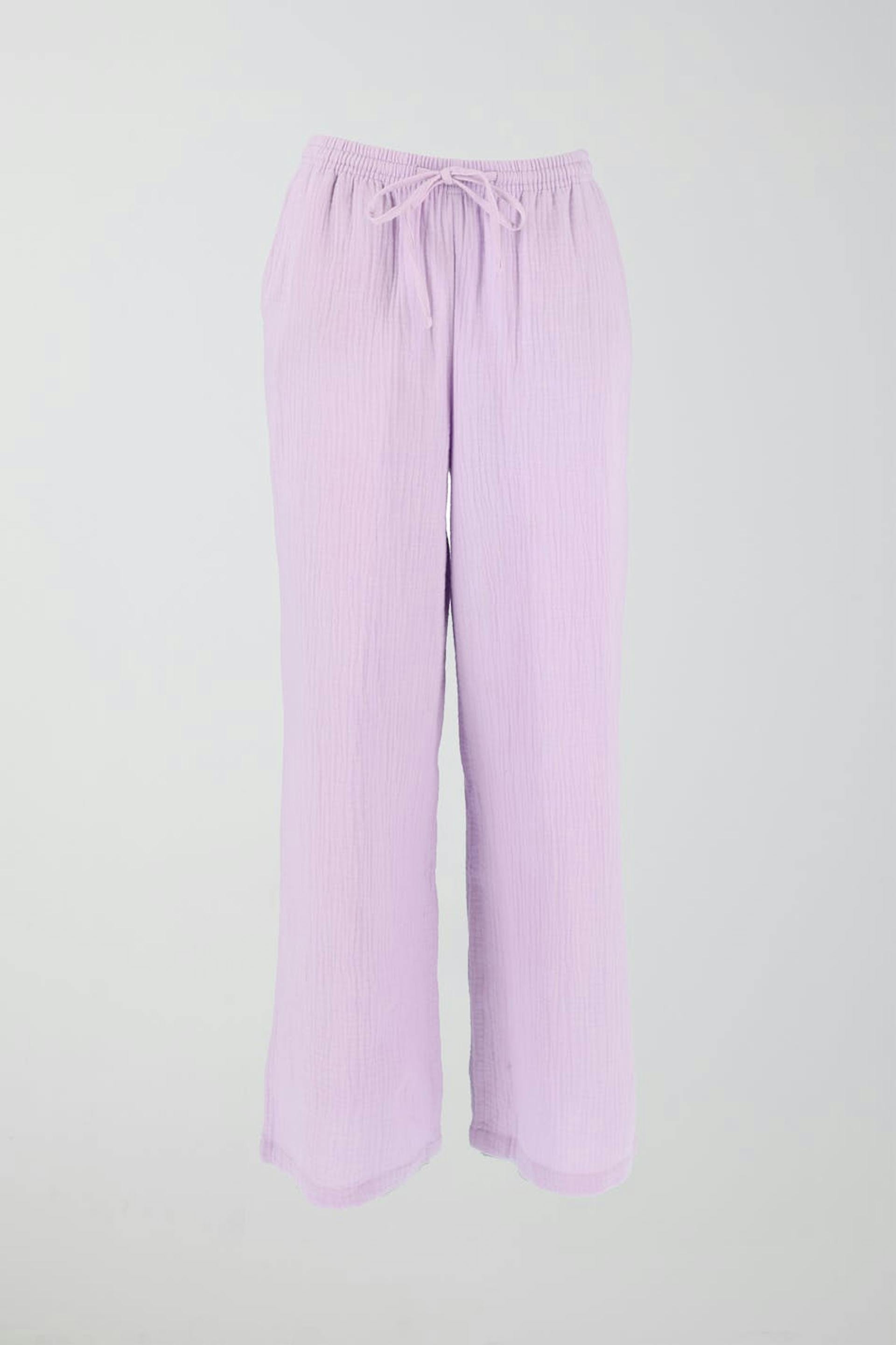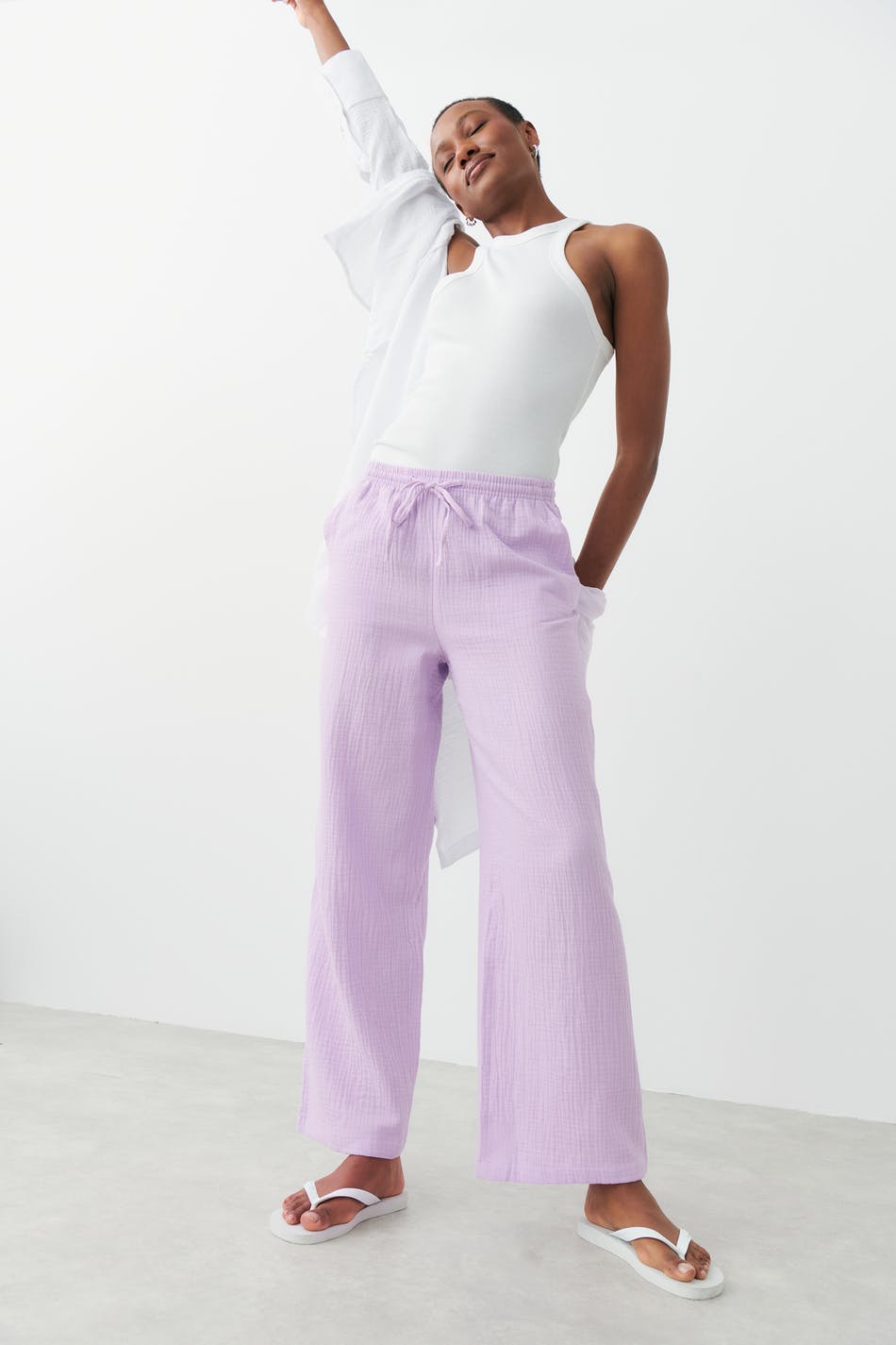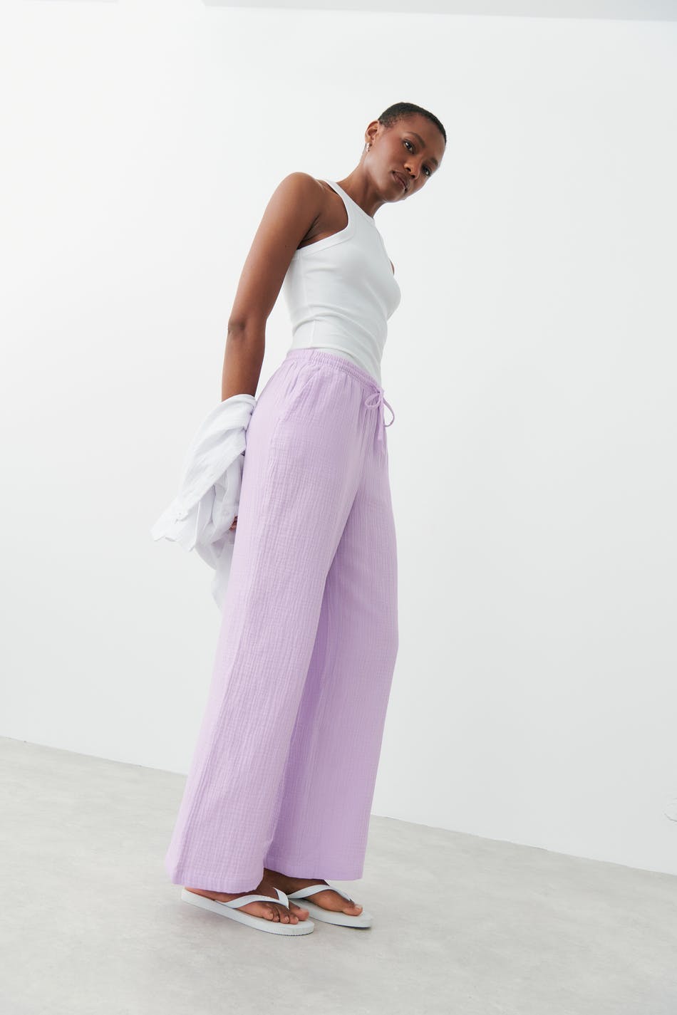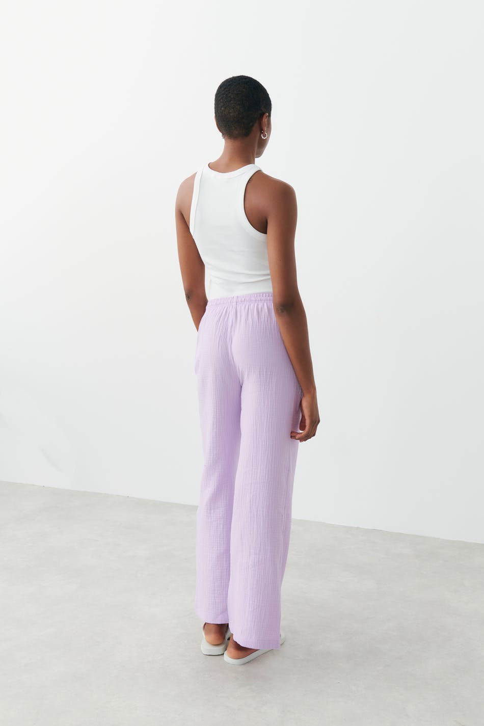 Woven trousers in soft cotton with high waist. The trousers are purple and have wide legs. They have side pockets and elastic at the waist with self-tie at the front.