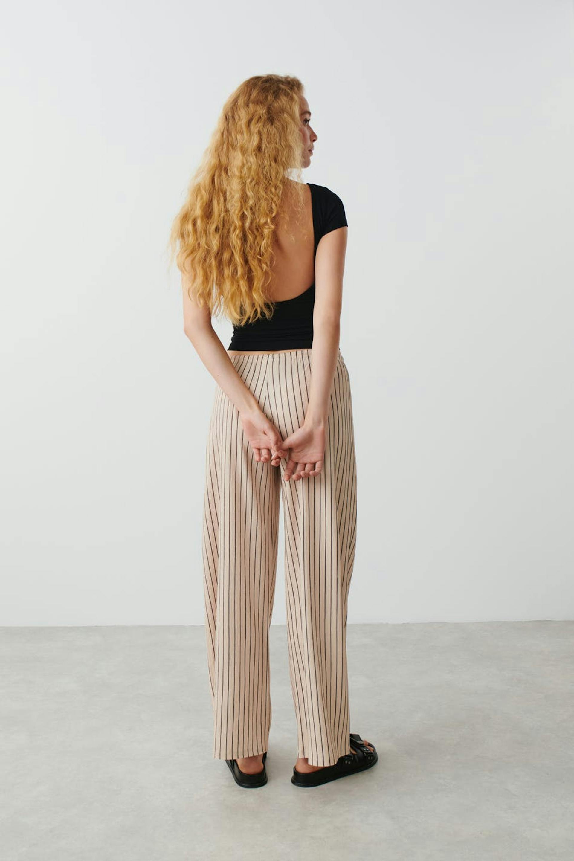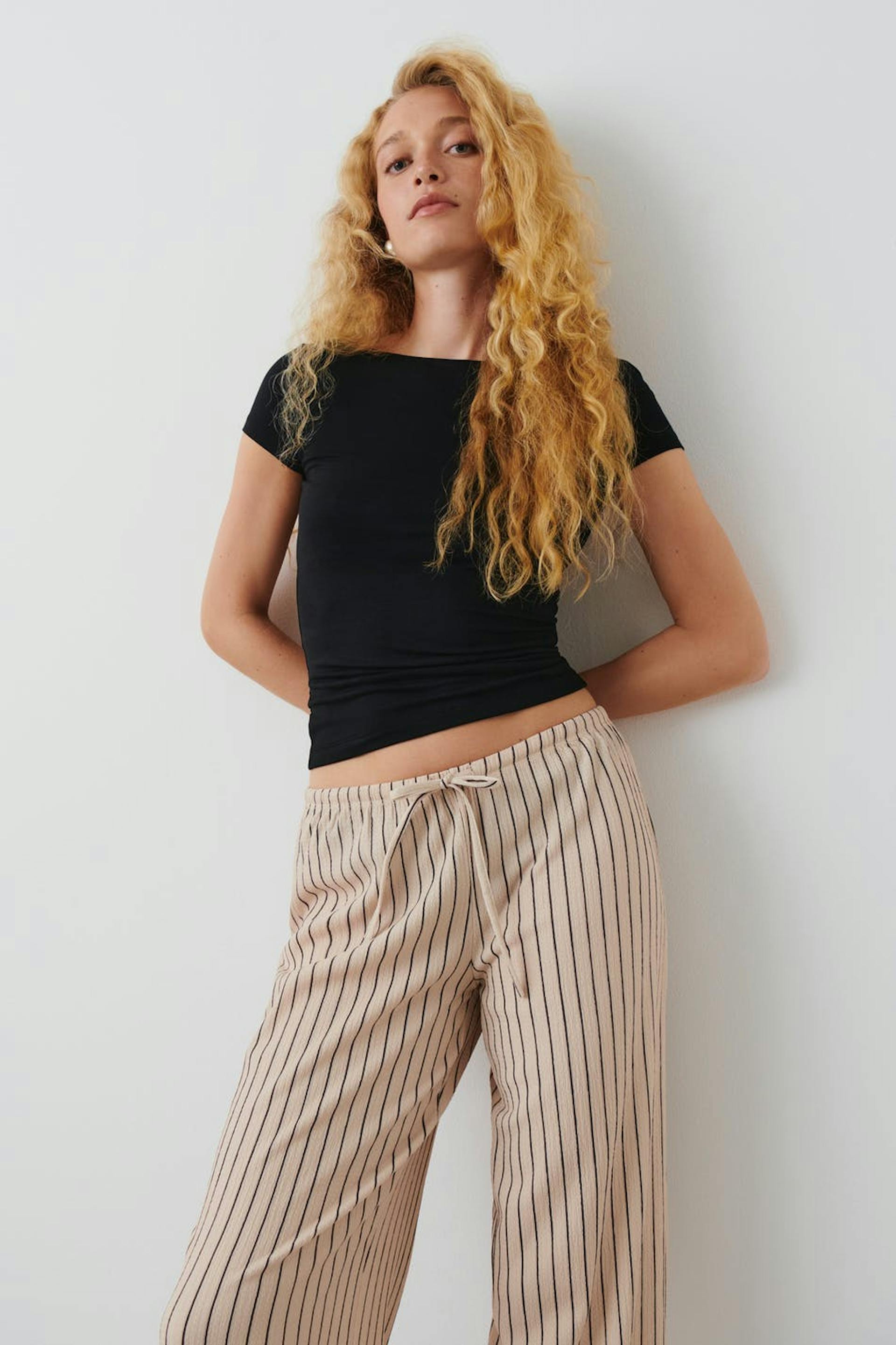 Striped trousers in jersey with low waist. The trousers are beige, black and wide. They have elastic at the waist with self-tie drawstring at the front.